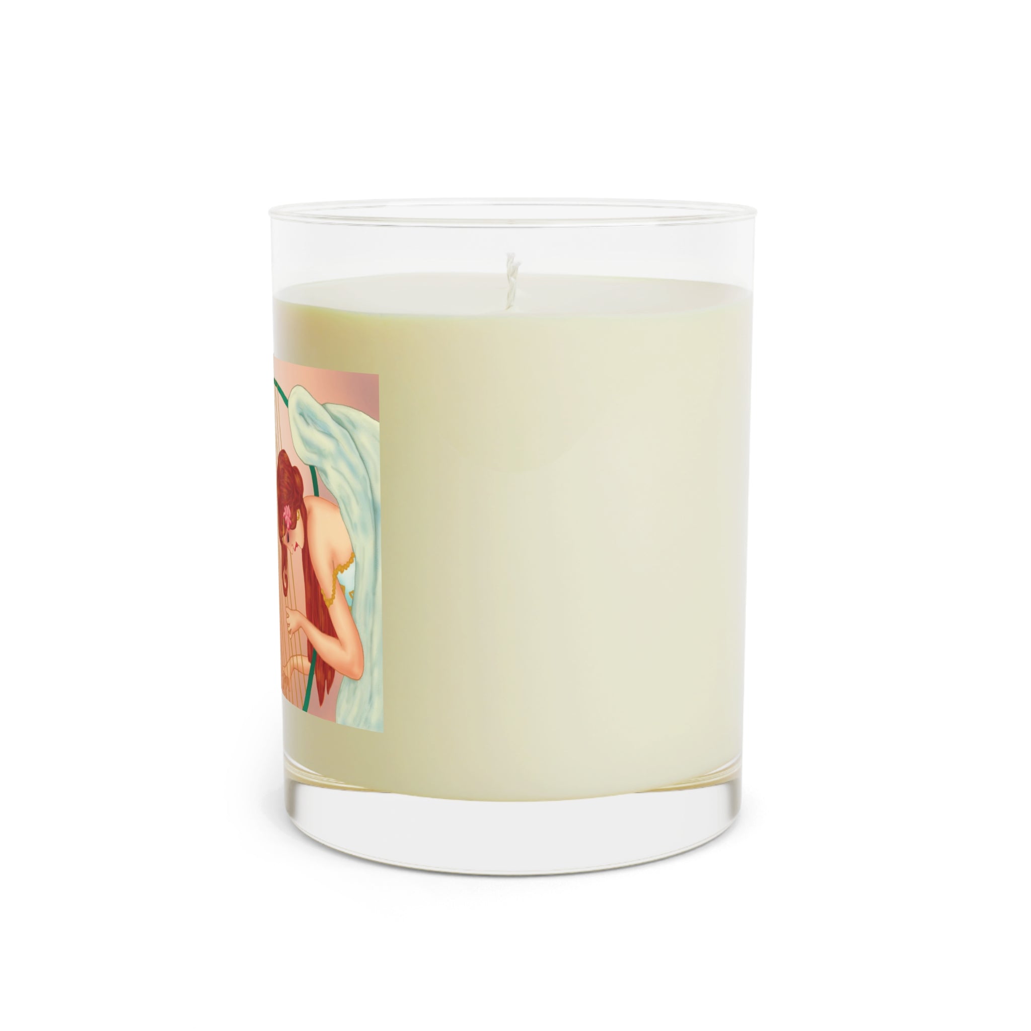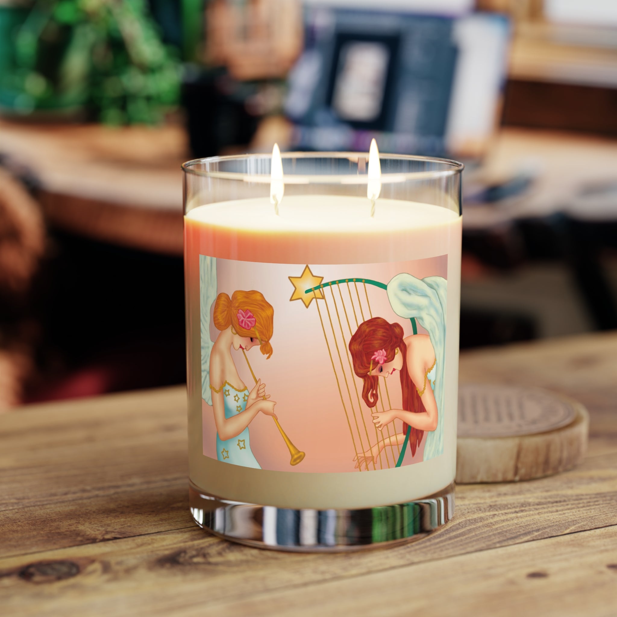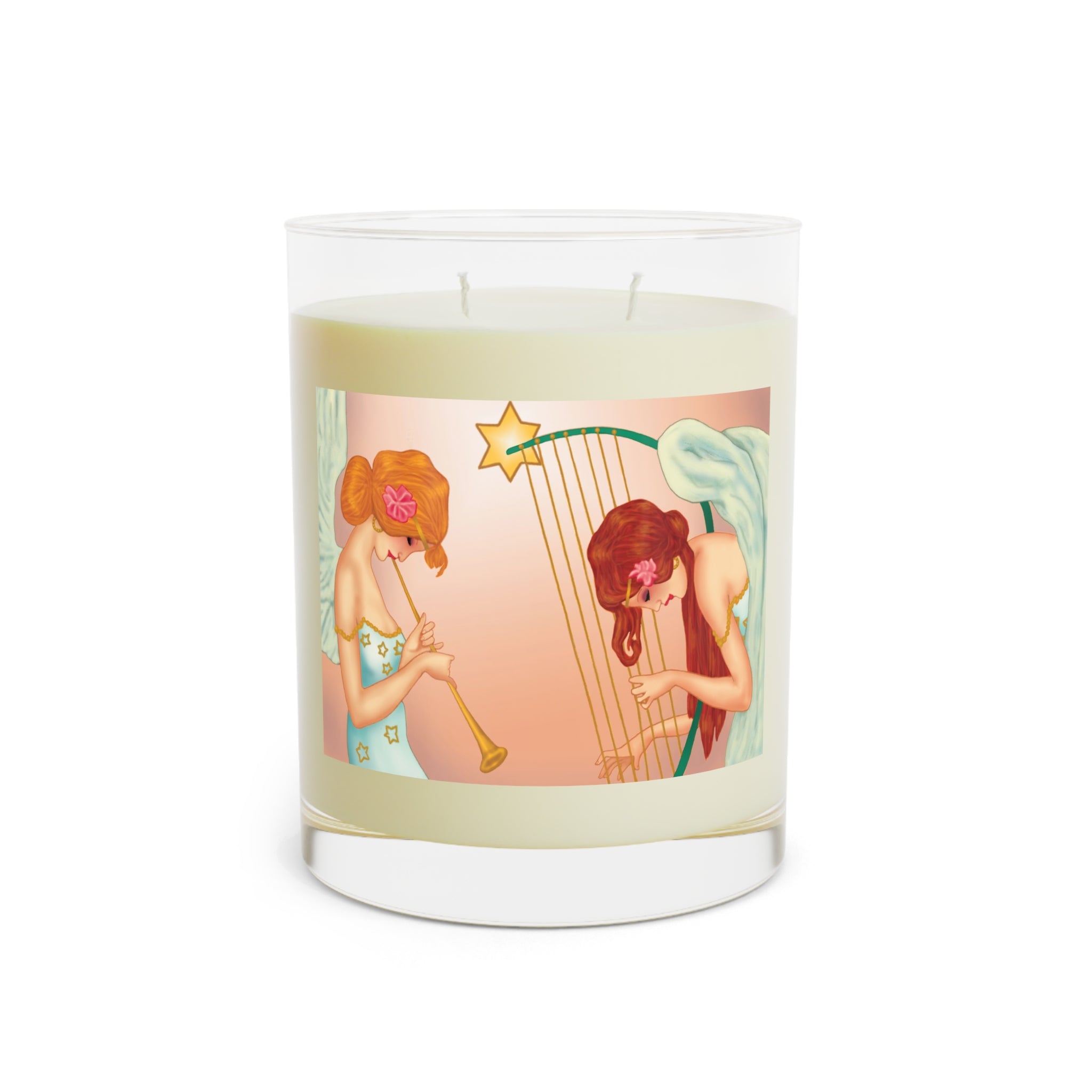 Behind them, a glowing peach-toned background radiates festive warmth, filling the scene with serenity and light. The composition blends spiritual elegance with holiday artistry, making this candle not just a source of fragrance and glow, but also a timeless centerpiece that uplifts both heart and home.