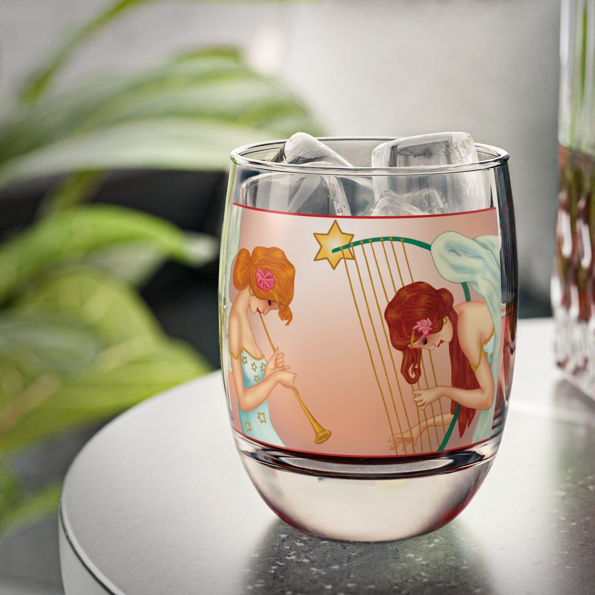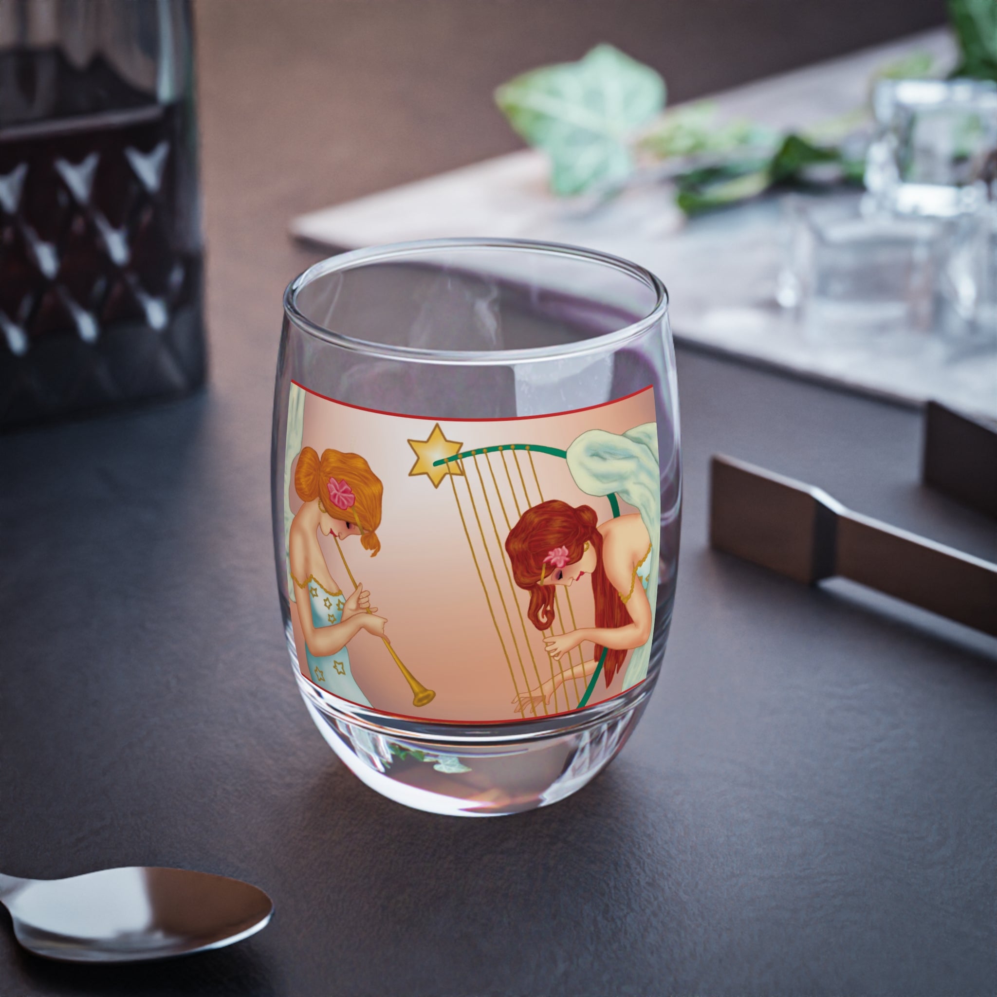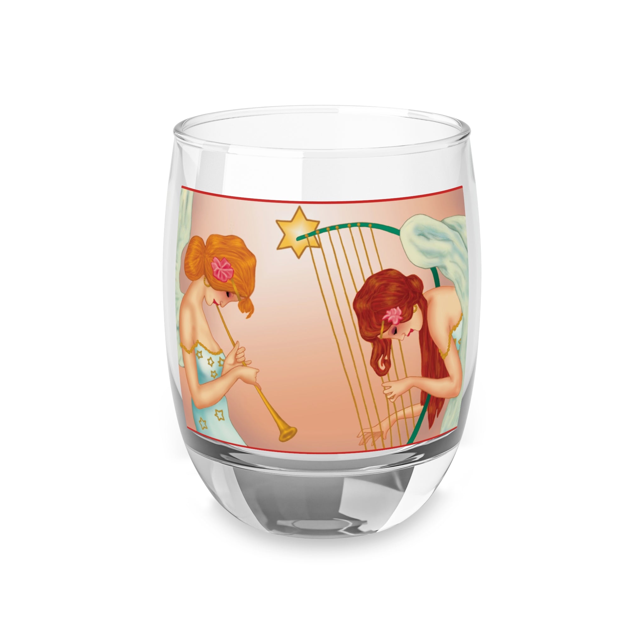 Heavenly Angel Duet Whiskey Glass, 6oz, is a timeless piece that merges festive elegance with practical charm. Crafted from 100% clear glass, this glossy-finished whiskey glass offers both durability and sophistication, perfect for savoring your favorite spirits during the holiday season. Wrapped around its surface is the Heavenly Angel Duet – Christmas Harp & Trumpet Artwork, where two graceful angels are immersed in celestial music. One plays a golden trumpet while the other gently strums a star-crowned harp, their flowing gowns adorned with golden stars and delicate pink flowers in their hair. Soft white wings add an ethereal touch, while the glowing peach-toned background radiates warmth and holiday spirit. This glass is not just barware—it’s a keepsake of art and celebration, blending functionality with a heavenly touch.