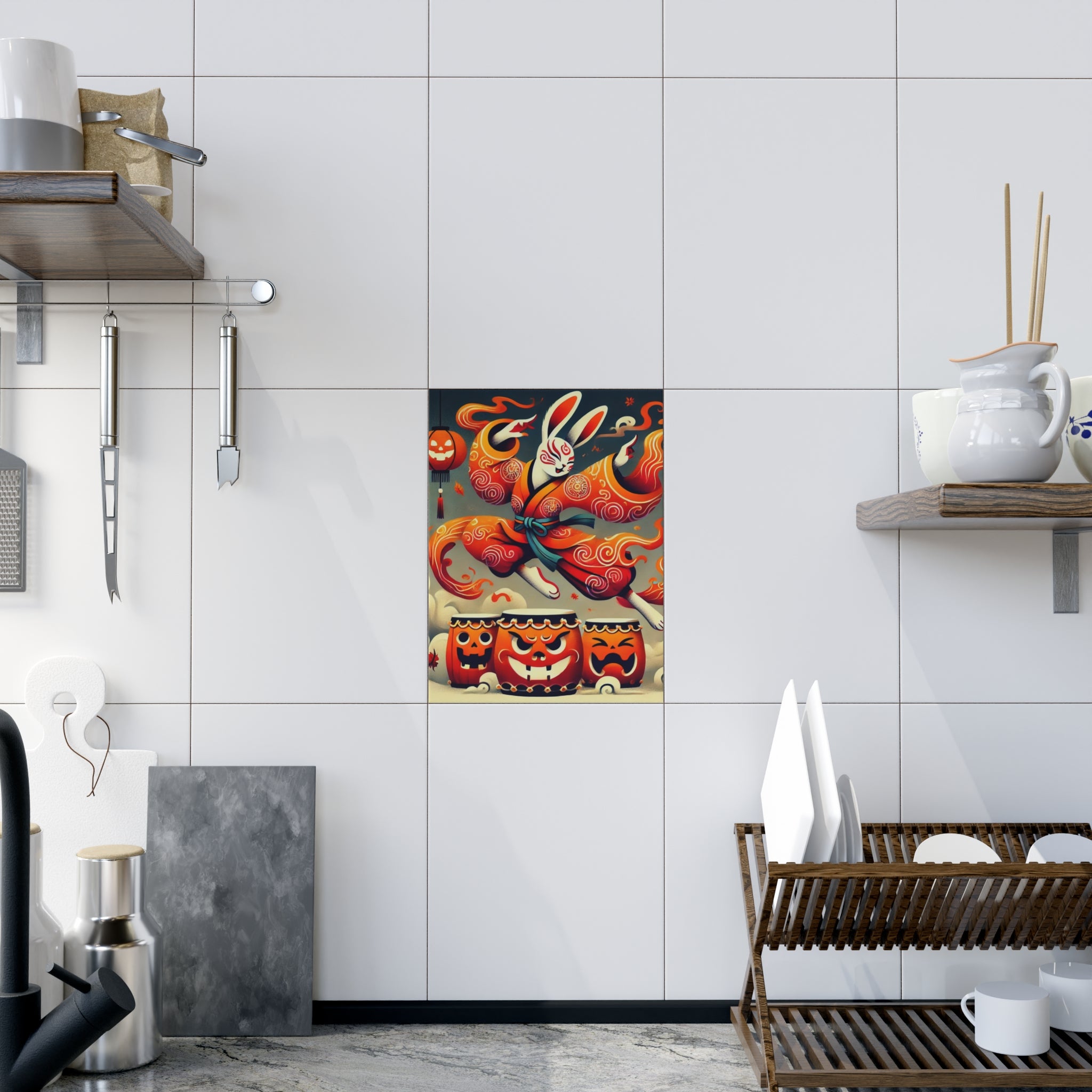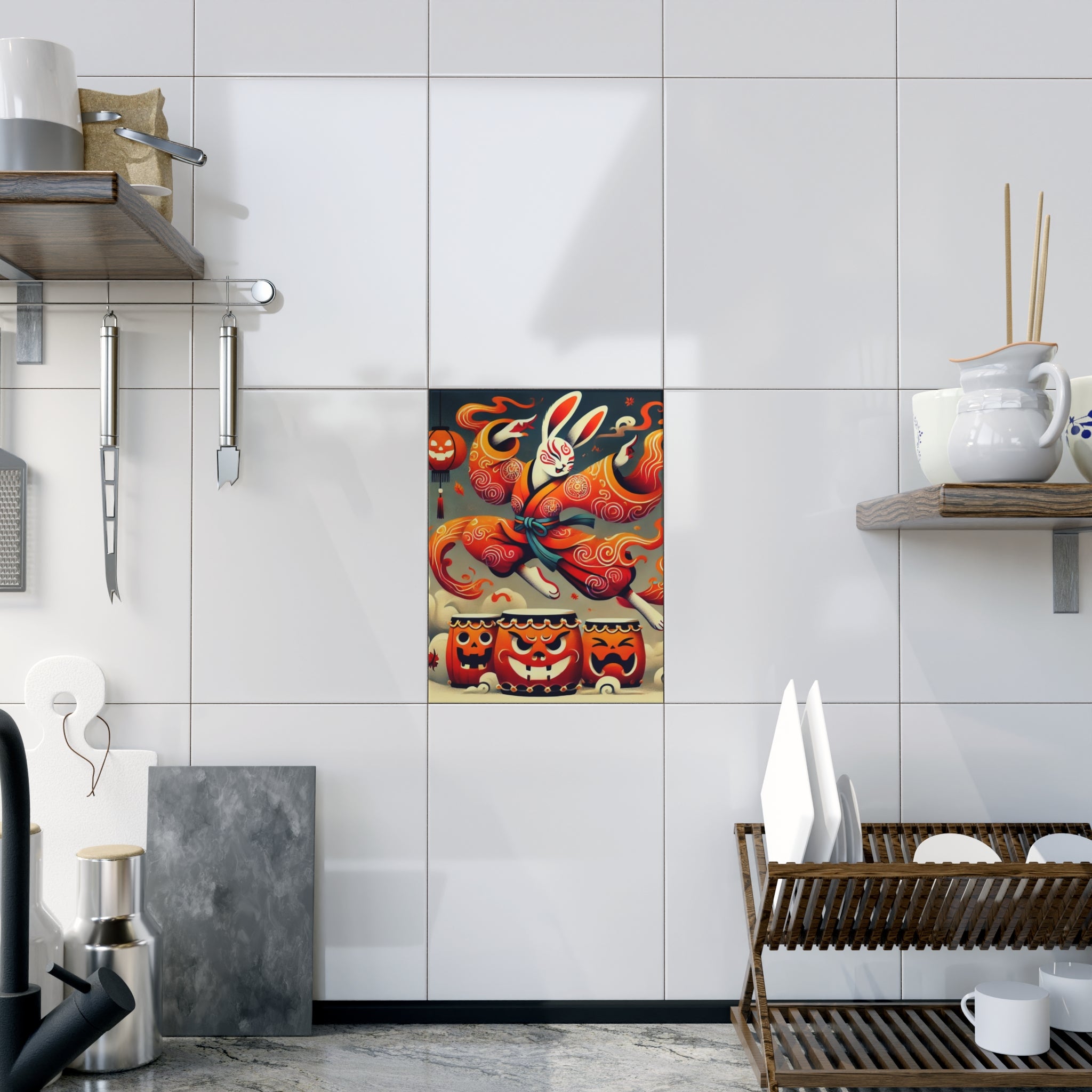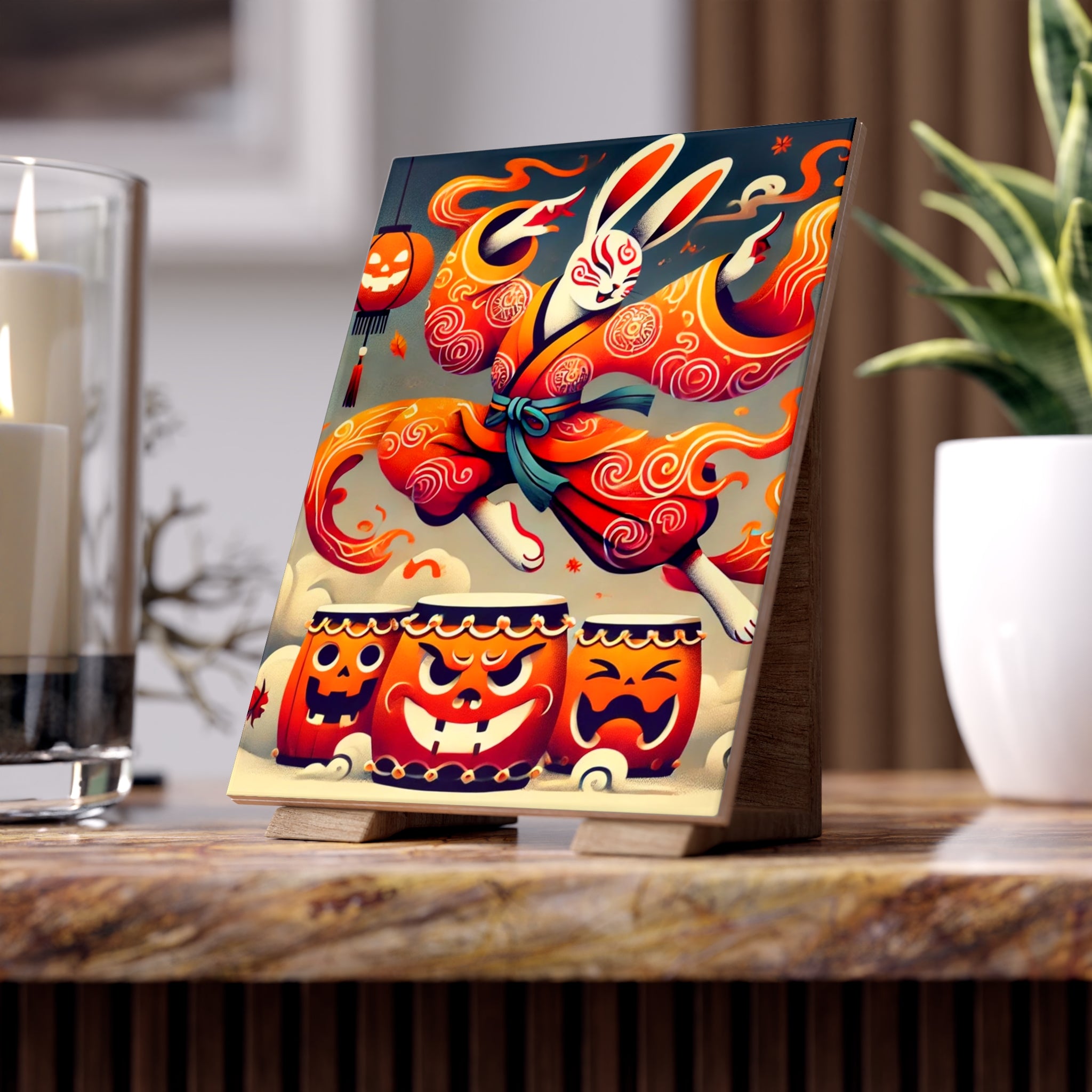 Bring bold artistry to your space with this Halloween-themed ceramic tile, available in your choice of glossy or matte finish. The design features a Kabuki-inspired rabbit dressed in flame-patterned robes, leaping dynamically over glowing jack-o’-lantern drums. The vibrant flat-style colors and theatrical motion capture the spirit of festivity and mischief, blending Japanese performance tradition with the spooky charm of Halloween. Perfect as a decorative accent, trivet, or display piece, this durable ceramic tile transforms any room with its mix of culture, color, and seasonal magic.