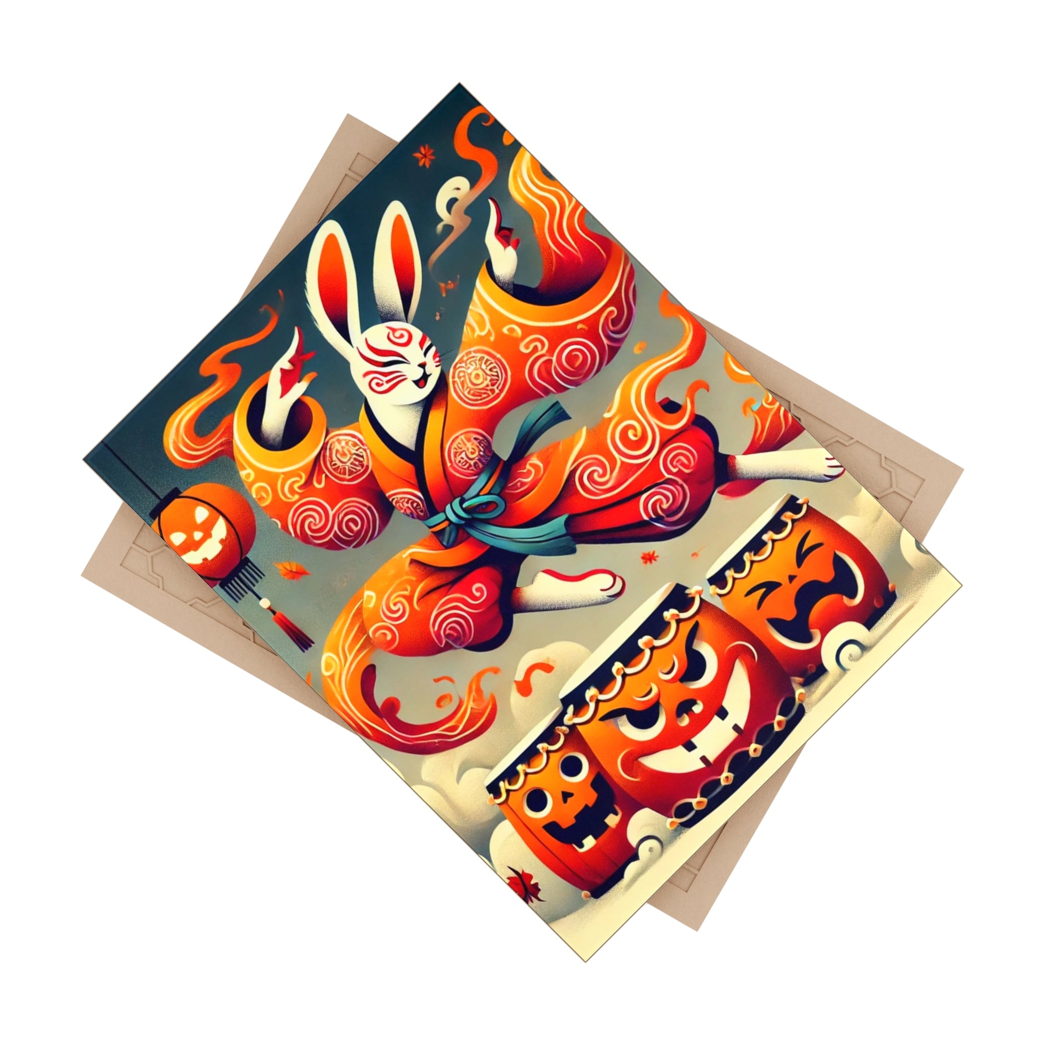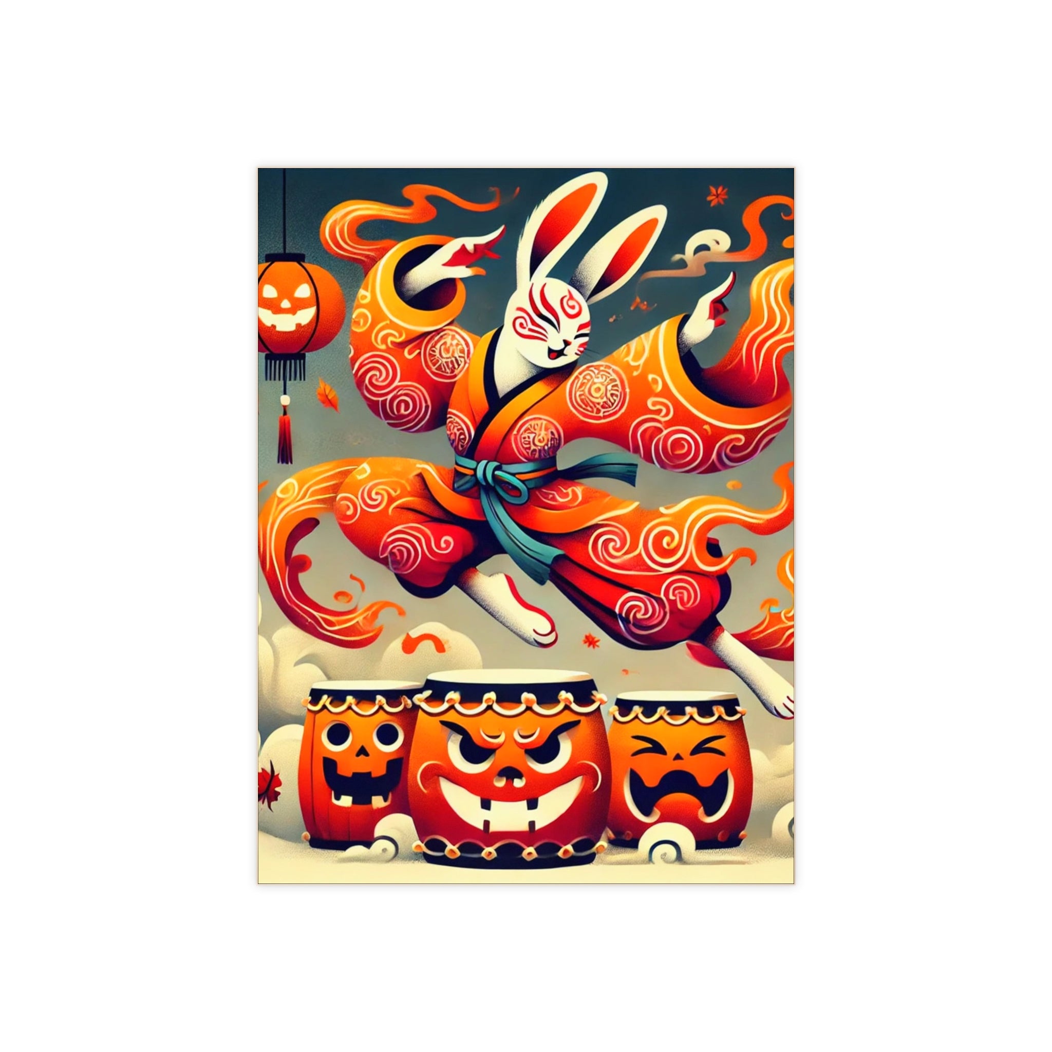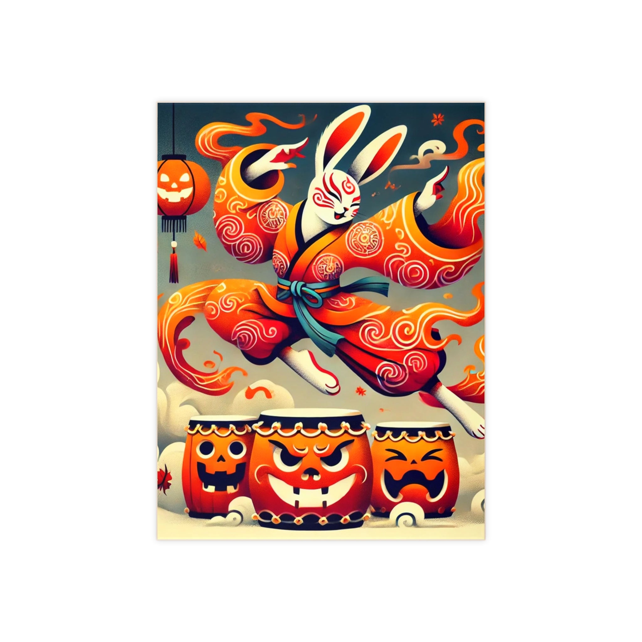 Bring bold artistry to your space with this Halloween-themed ceramic tile, available in your choice of glossy or matte finish. The design features a Kabuki-inspired rabbit dressed in flame-patterned robes, leaping dynamically over glowing jack-o’-lantern drums. The vibrant flat-style colors and theatrical motion capture the spirit of festivity and mischief, blending Japanese performance tradition with the spooky charm of Halloween. Perfect as a decorative accent, trivet, or display piece, this durable ceramic tile transforms any room with its mix of culture, color, and seasonal magic.