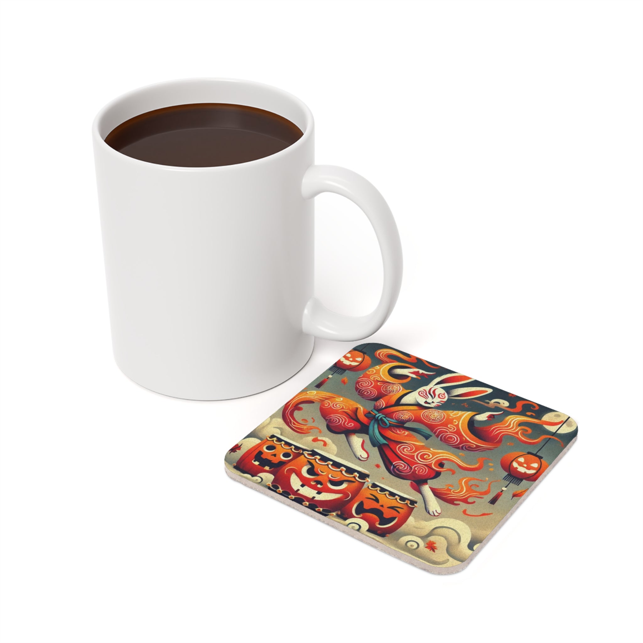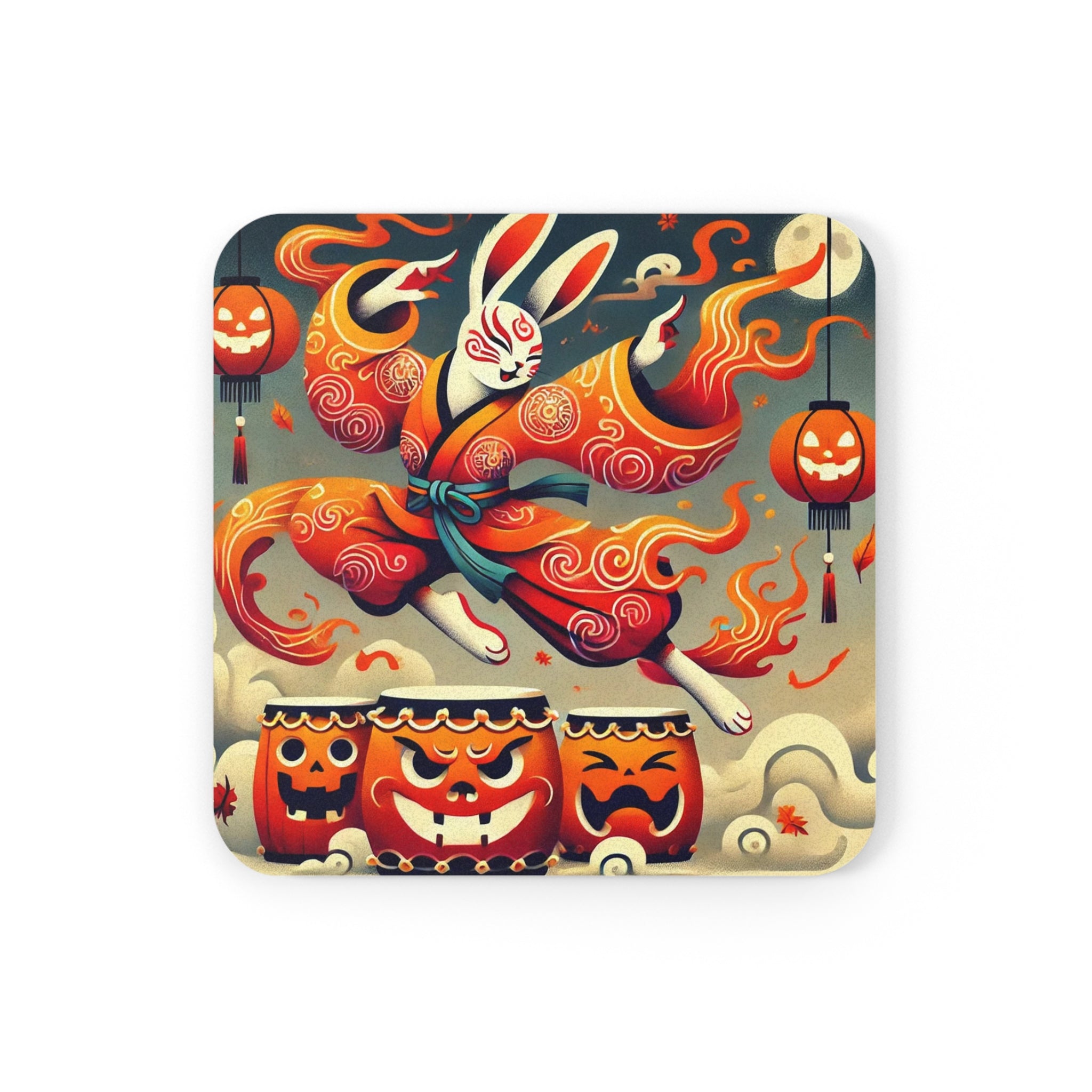 Across its glossy surface, a Kabuki-inspired rabbit in flame-patterned robes leaps energetically over glowing jack-o’-lantern drums. The bold flat-style colors and lively motion capture the joy of festivity and the spark of mischief, blending Japanese theatrical flair with the playful spirit of Halloween. More than just a coaster, this piece transforms everyday moments into a celebration of culture, artistry, and seasonal magic.