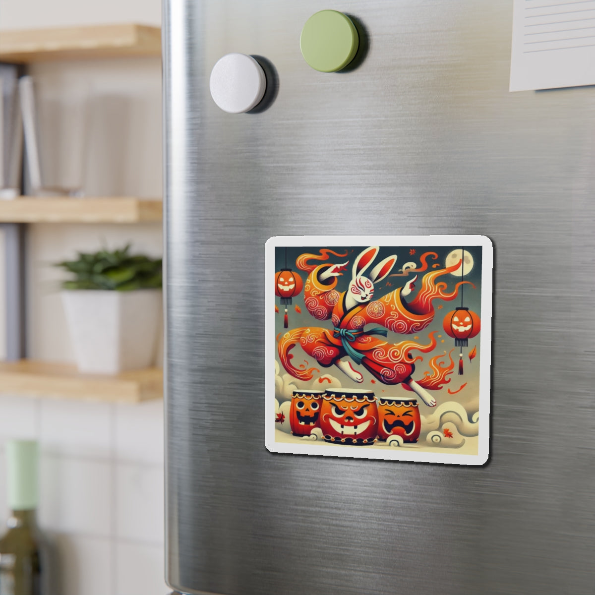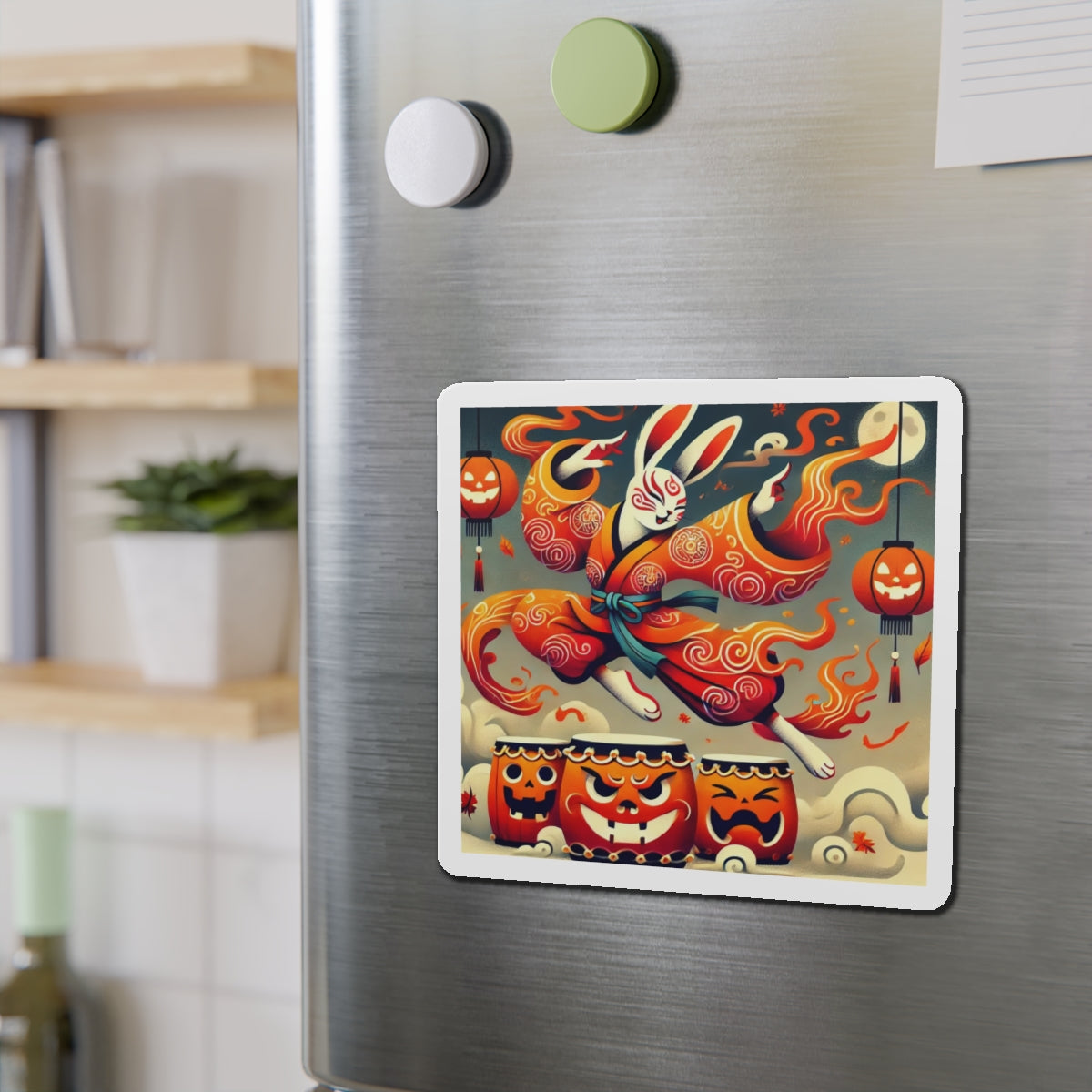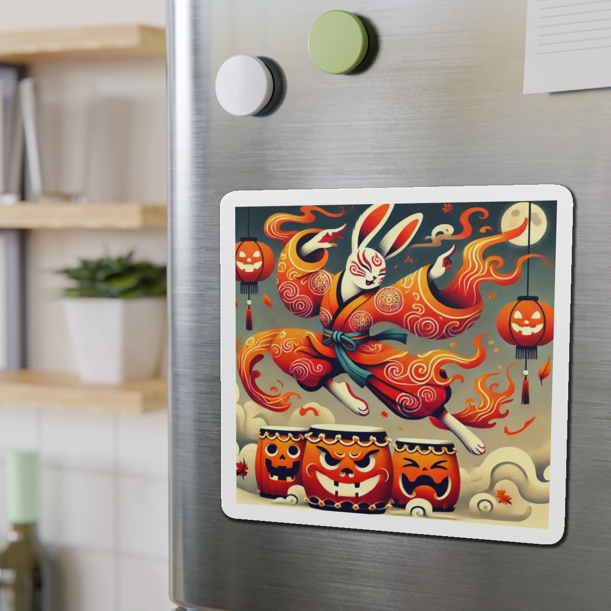 Across their surface, a vibrant Halloween scene comes alive: a Kabuki-inspired rabbit dressed in flame-patterned robes leaps with boundless energy over glowing jack-o’-lantern drums. The bold flat-style colors and dynamic motion capture both the mischief of the season and the elegance of Japanese theatrical tradition. More than a simple decoration, these magnets transform any fridge, board, or metal surface into a stage of culture, creativity, and festive spirit.