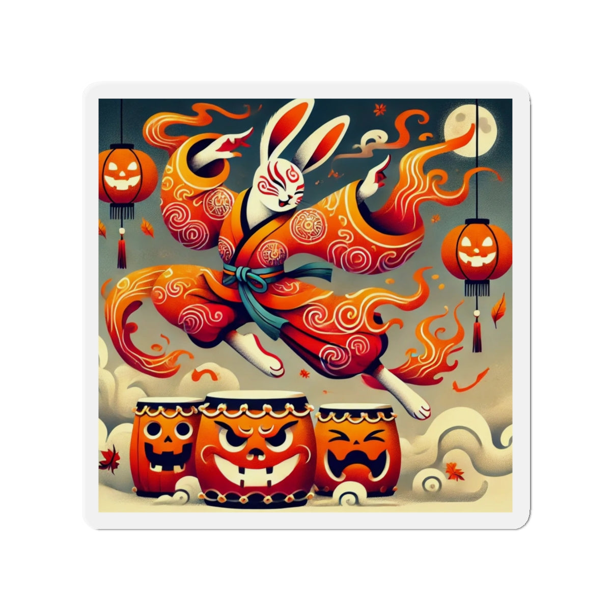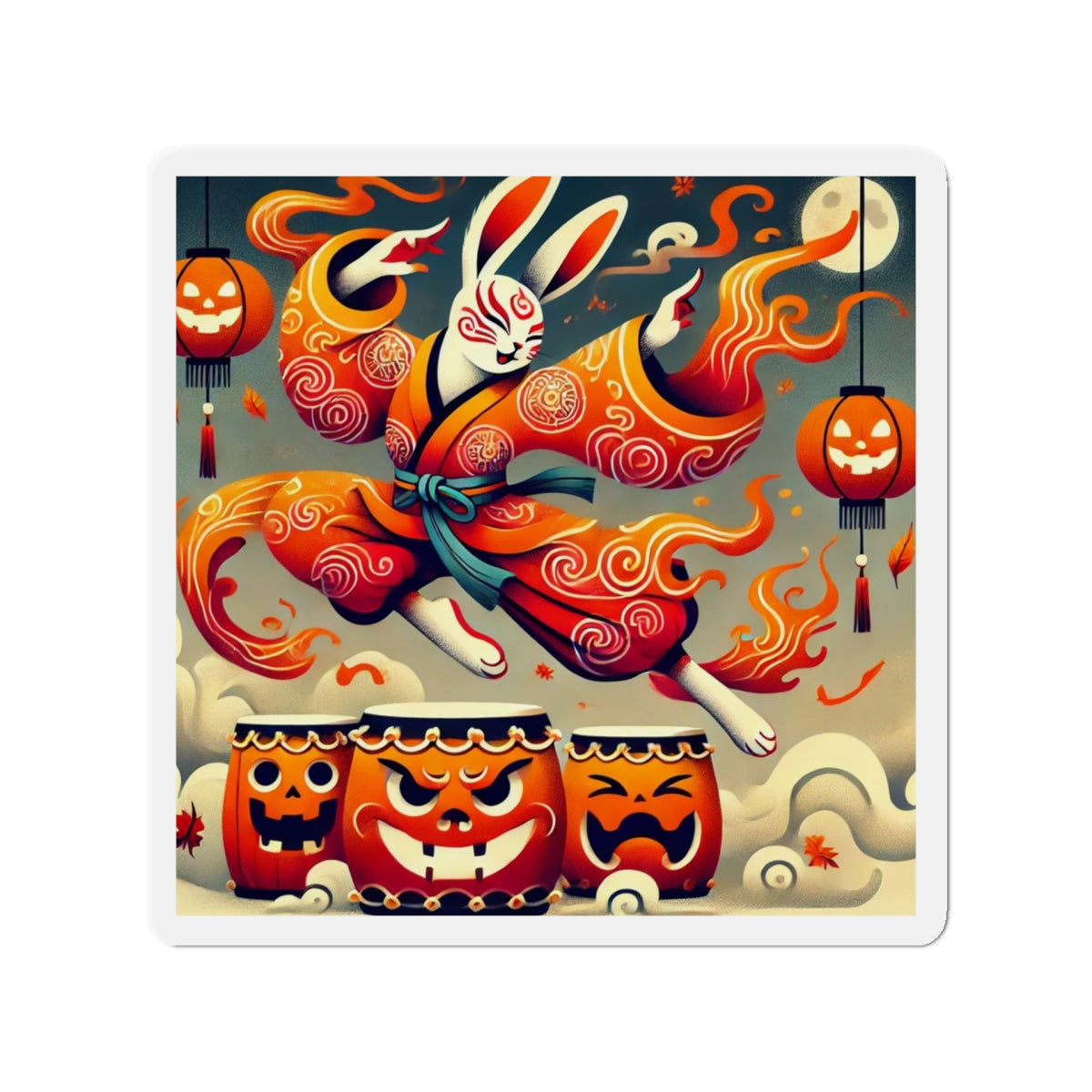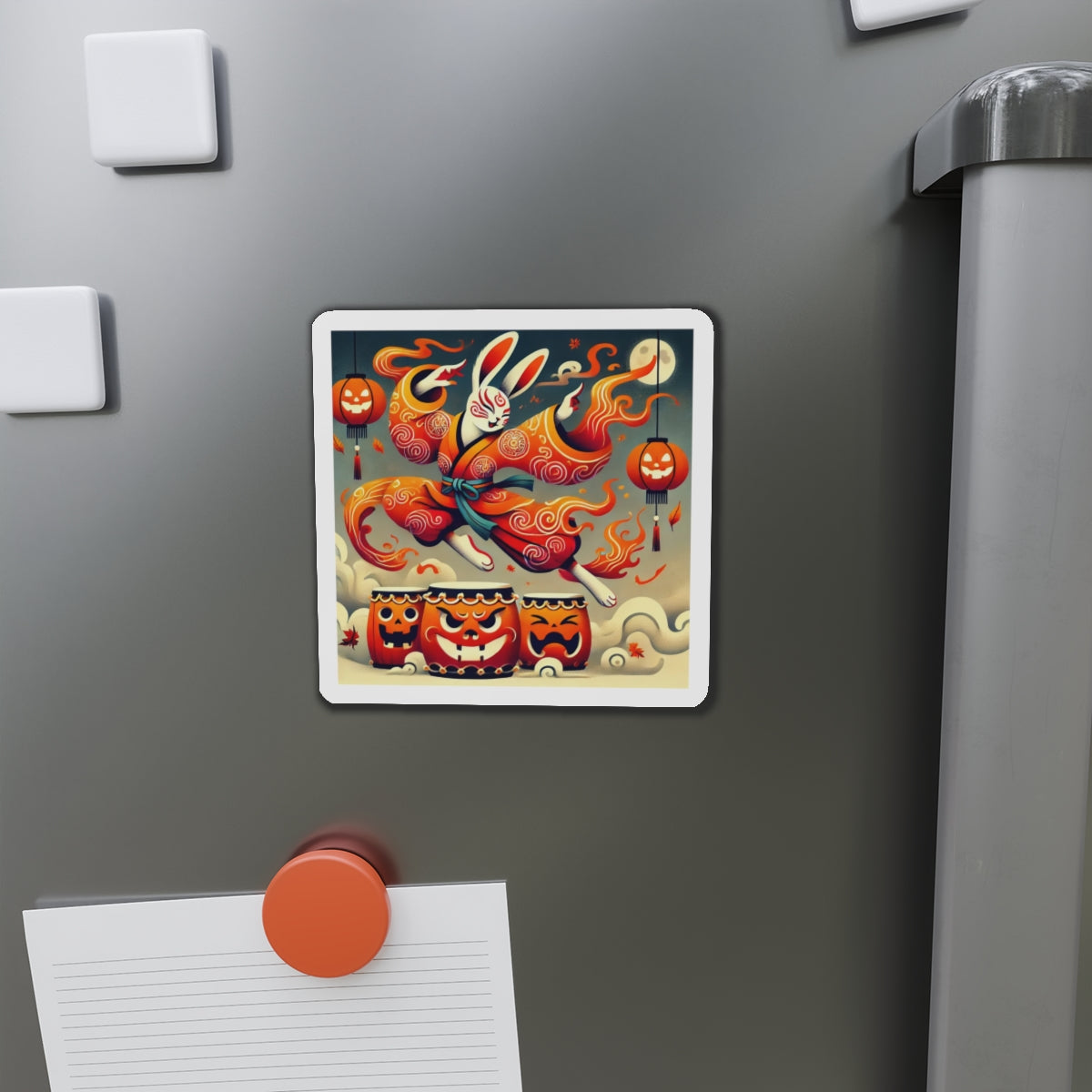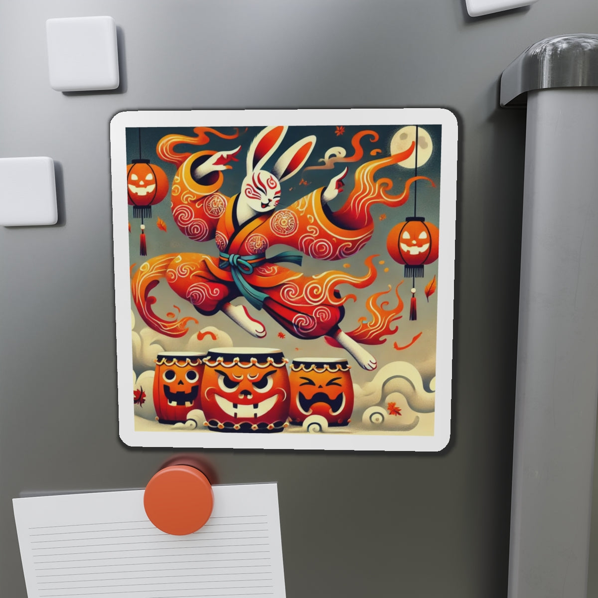 Across their surface, a vibrant Halloween scene comes alive: a Kabuki-inspired rabbit dressed in flame-patterned robes leaps with boundless energy over glowing jack-o’-lantern drums. The bold flat-style colors and dynamic motion capture both the mischief of the season and the elegance of Japanese theatrical tradition. More than a simple decoration, these magnets transform any fridge, board, or metal surface into a stage of culture, creativity, and festive spirit.