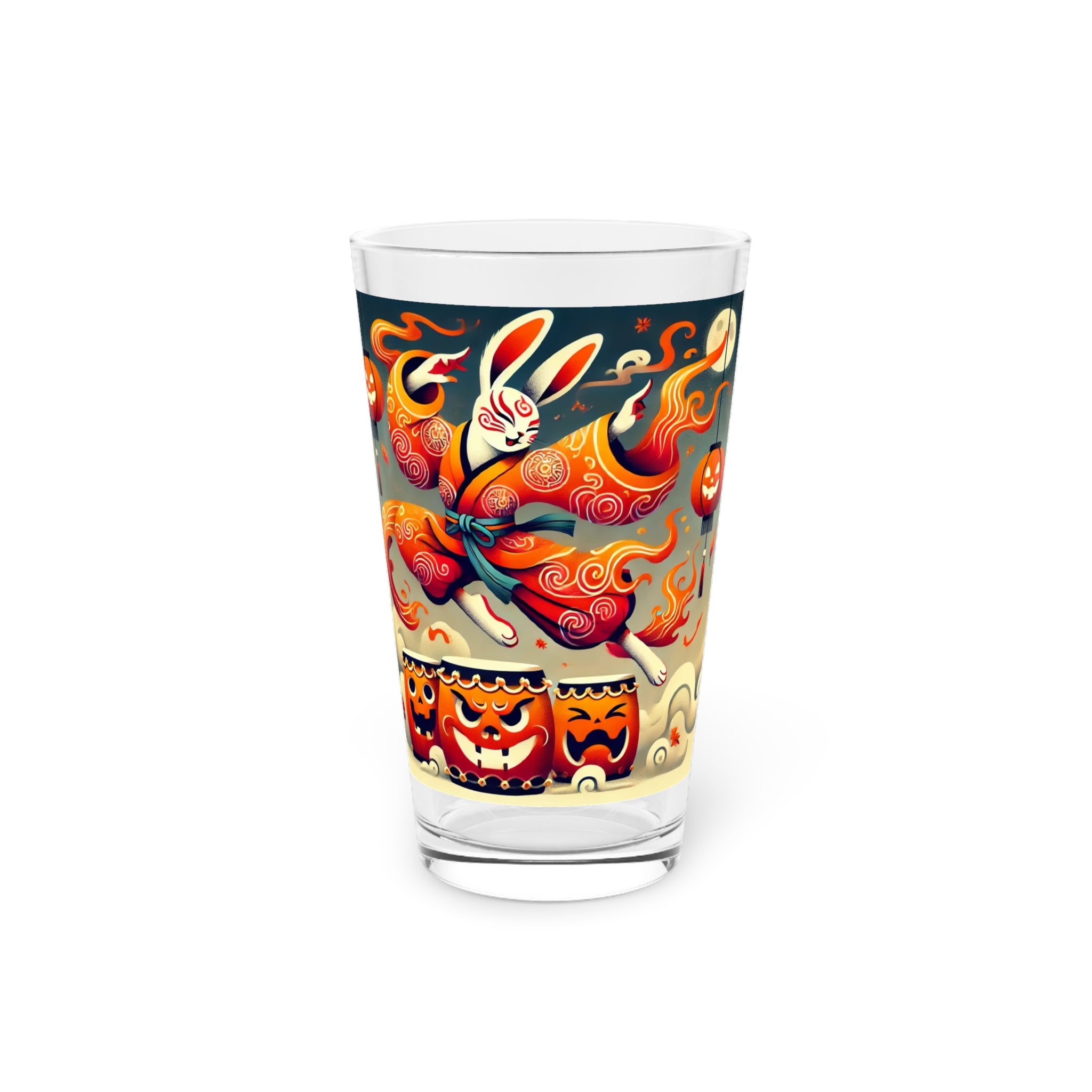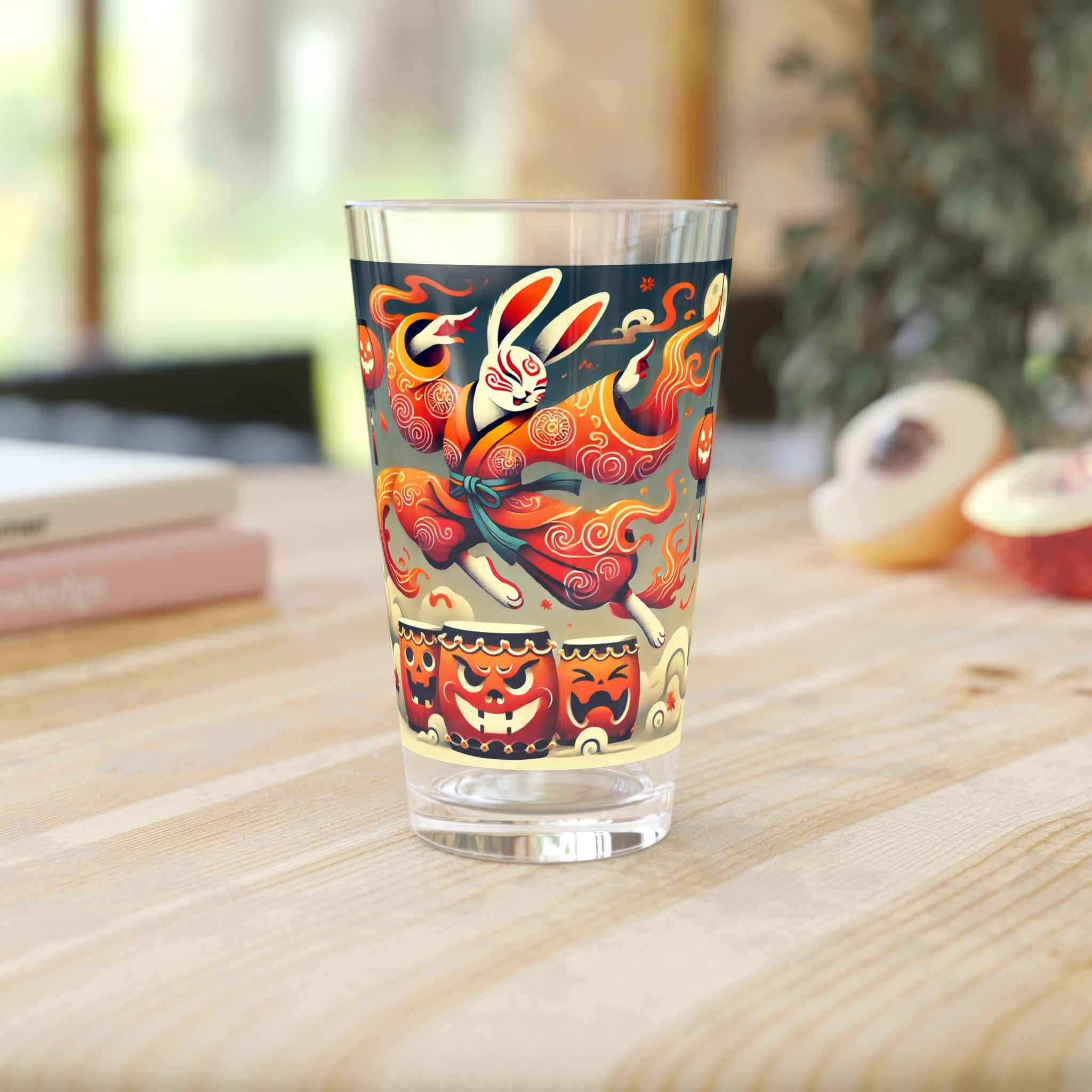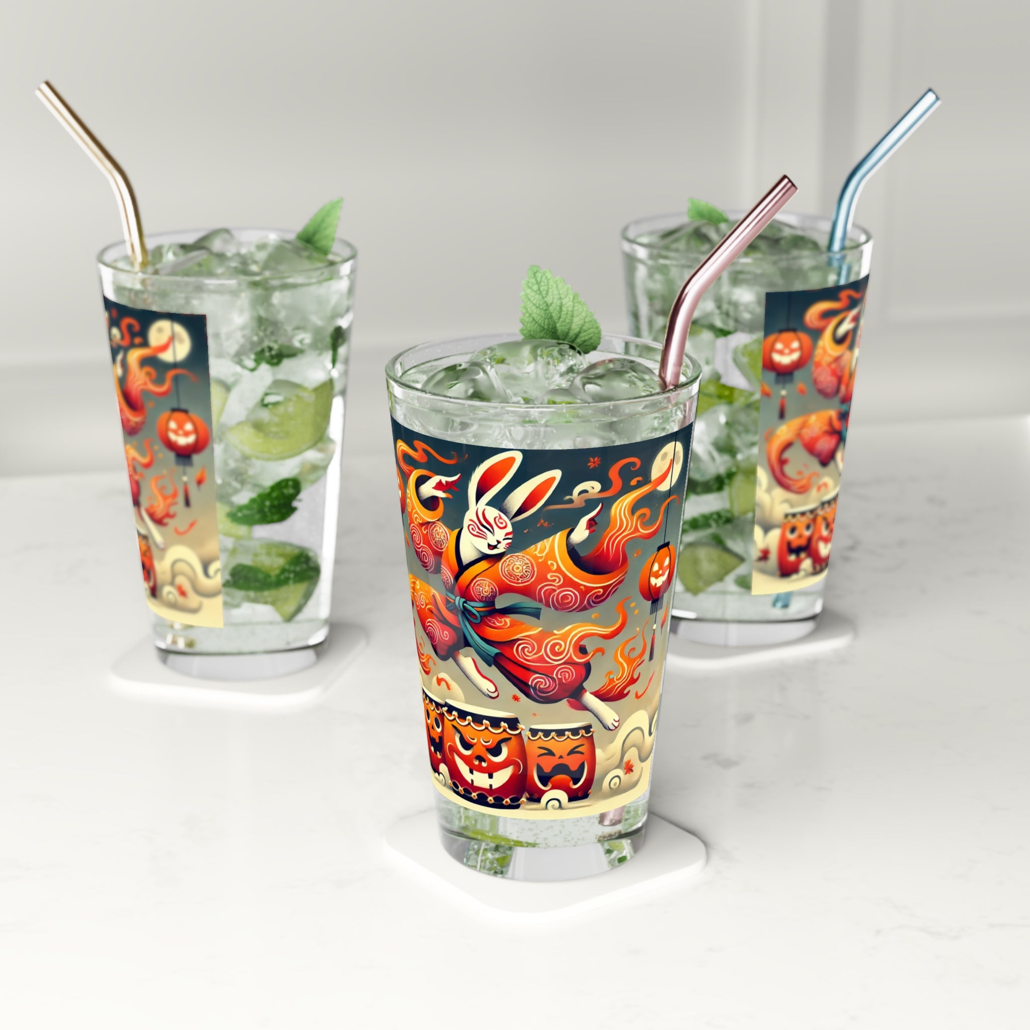 Bring energy and artistry to your table with this 16oz pint glass, perfect for everyday use or festive gatherings. Its tall, transparent design is versatile for any beverage and makes a thoughtful housewarming gift. The glass showcases a bold Halloween scene where a Kabuki-inspired rabbit, draped in flame-patterned robes, leaps dynamically over glowing jack-o’-lantern drums. The vibrant flat-style colors and theatrical motion merge Japanese drama with spooky seasonal fun, transforming a simple pint glass into a striking celebration of culture, mischief, and Halloween magic.