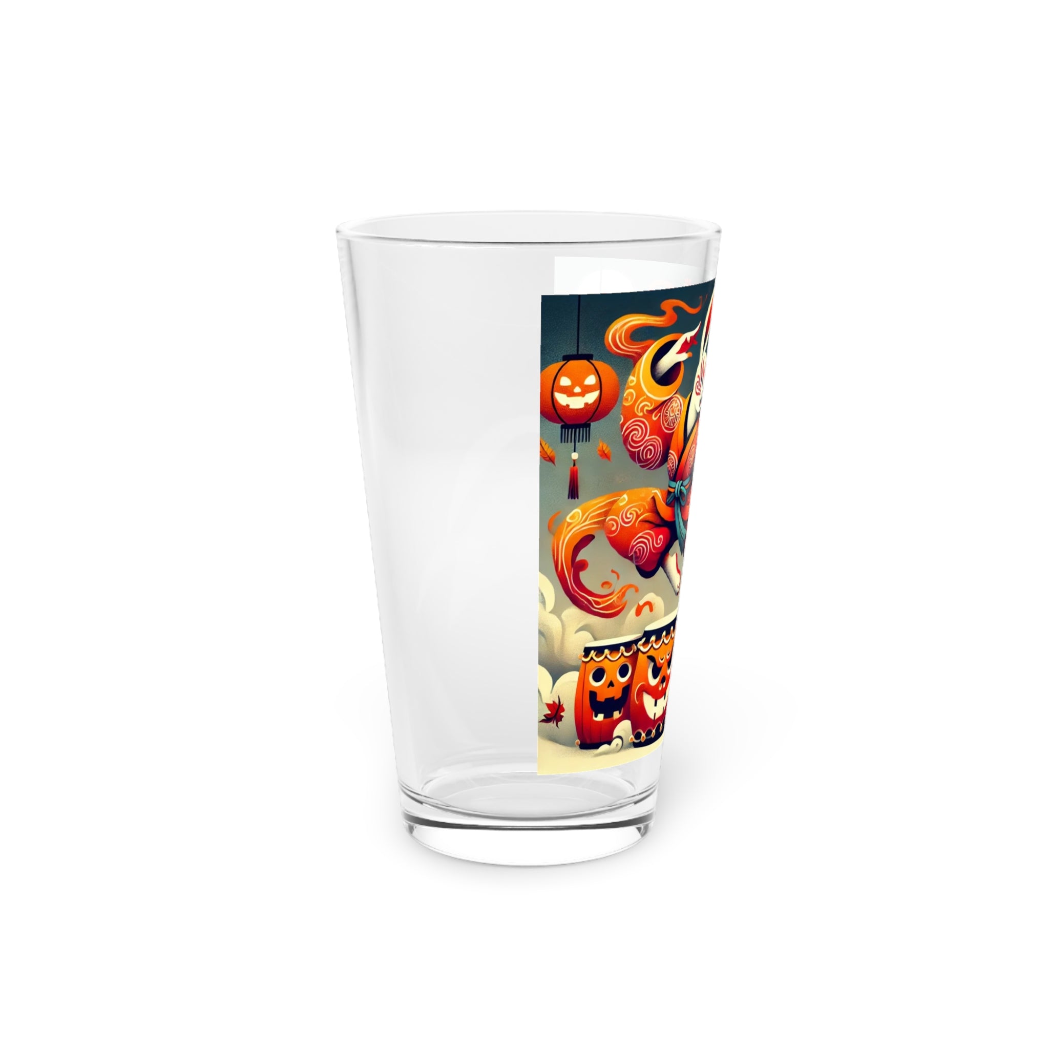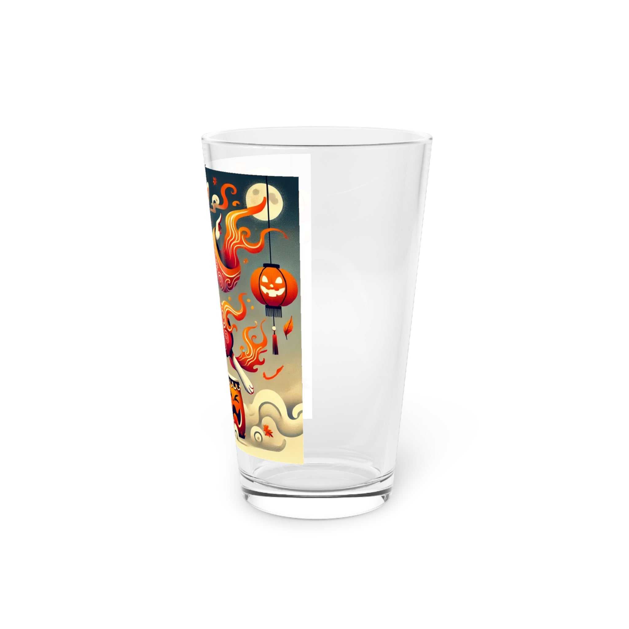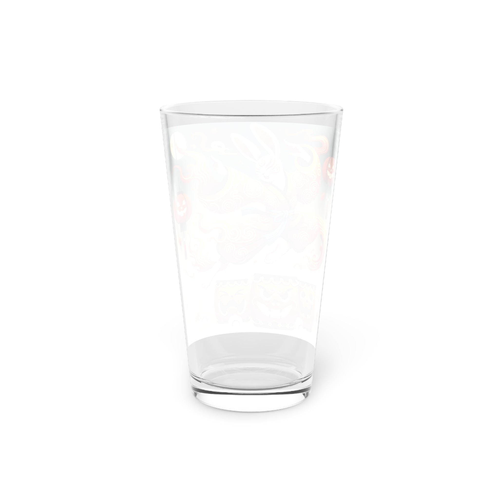 Bring energy and artistry to your table with this 16oz pint glass, perfect for everyday use or festive gatherings. Its tall, transparent design is versatile for any beverage and makes a thoughtful housewarming gift. The glass showcases a bold Halloween scene where a Kabuki-inspired rabbit, draped in flame-patterned robes, leaps dynamically over glowing jack-o’-lantern drums. The vibrant flat-style colors and theatrical motion merge Japanese drama with spooky seasonal fun, transforming a simple pint glass into a striking celebration of culture, mischief, and Halloween magic.