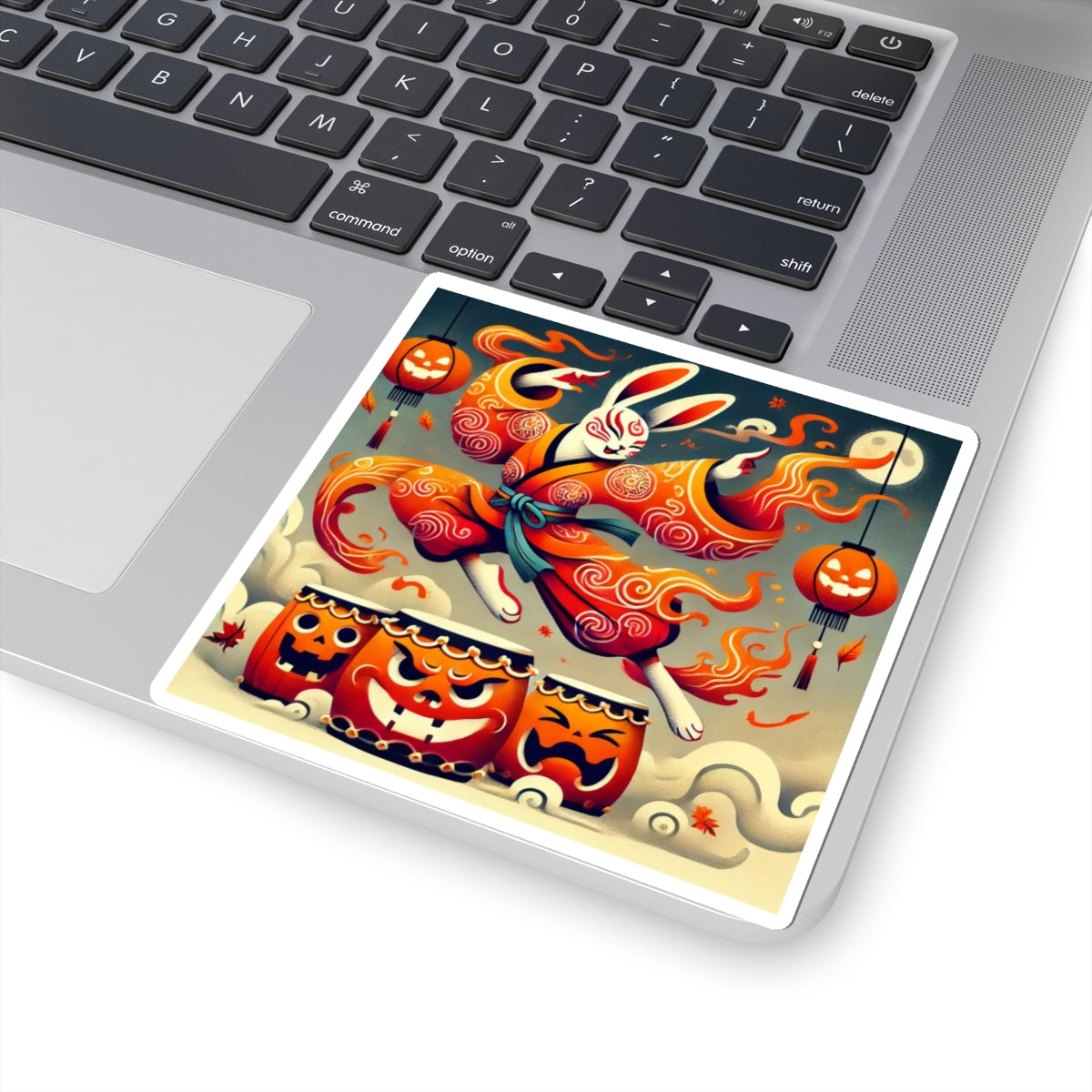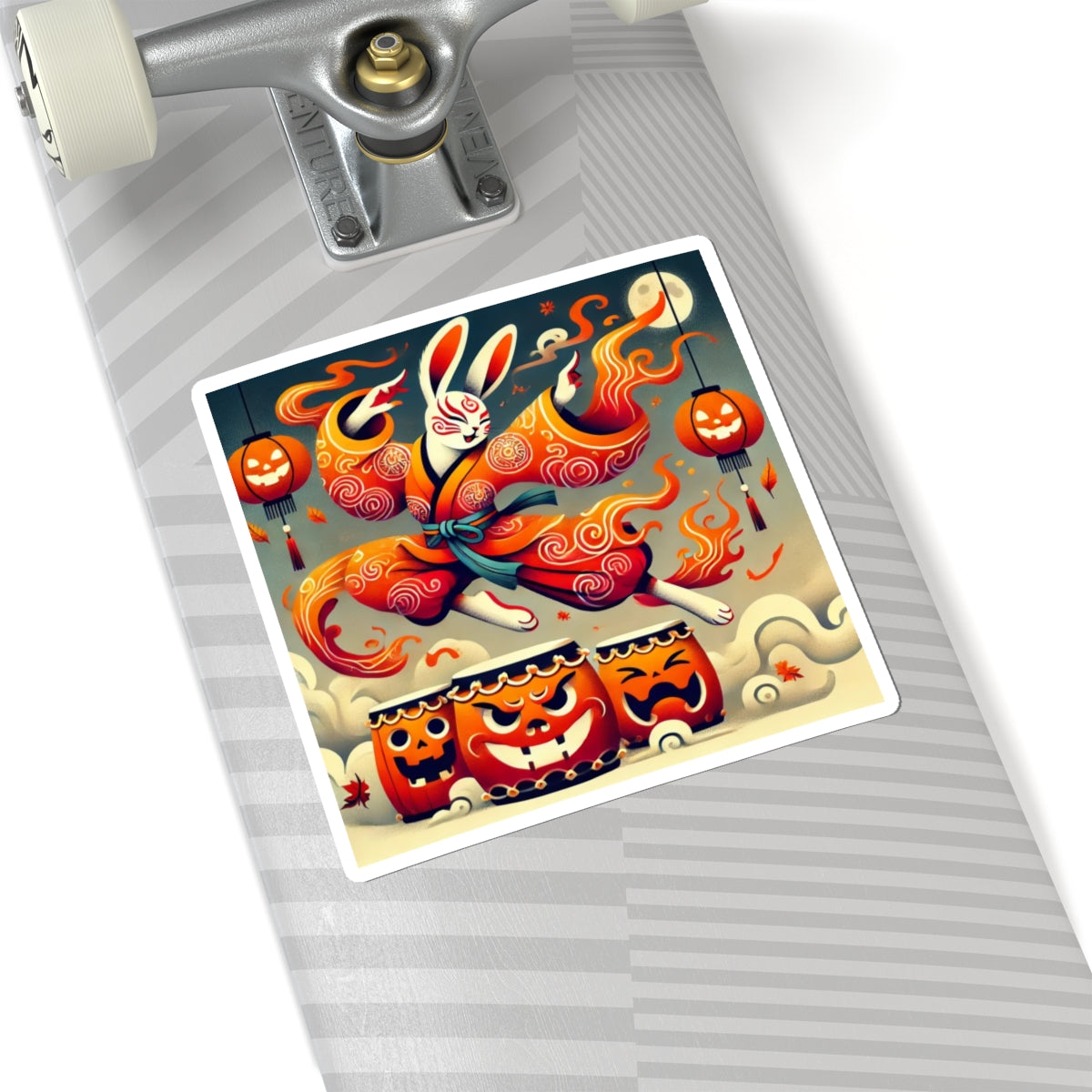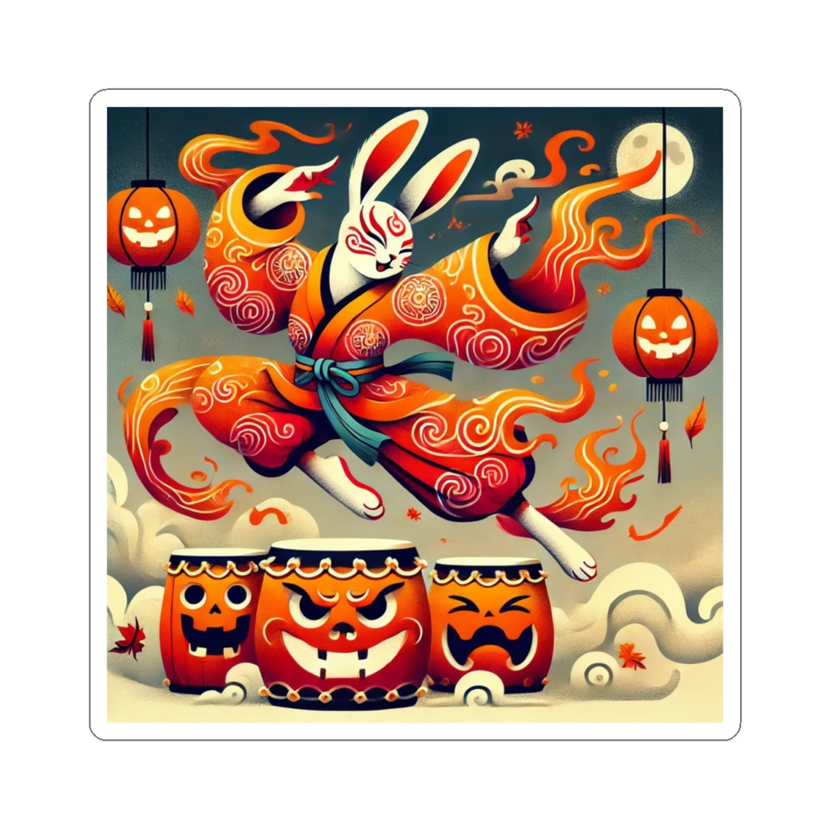 These kiss-cut stickers bring art and personality to any surface, crafted to peel smoothly from the page while keeping their backing intact. Available in four sizes with a glossy finish, they’re as durable as they are eye-catching. Across their surface leaps a Kabuki-inspired rabbit in flame-patterned robes, soaring dynamically over glowing jack-o’-lantern drums. The bold flat-style colors radiate mischief and festivity, capturing the energy of Japanese theatrical tradition while celebrating the playful spirit of Halloween. More than just a sticker, it’s a miniature stage of magic and culture that transforms everyday items into vibrant expressions of creativity.