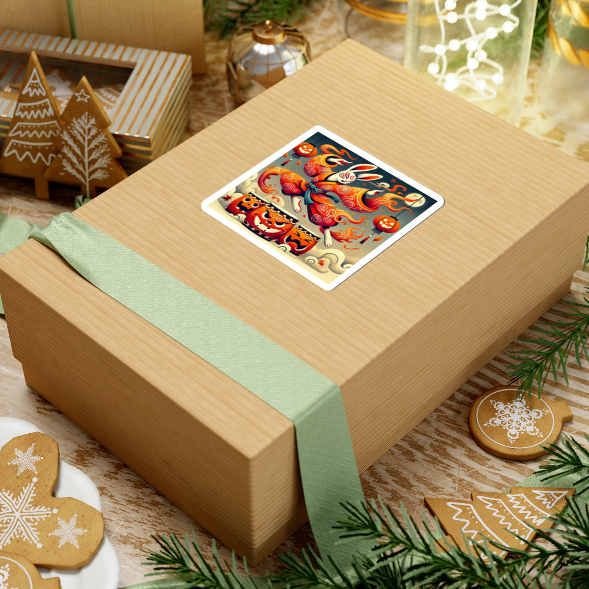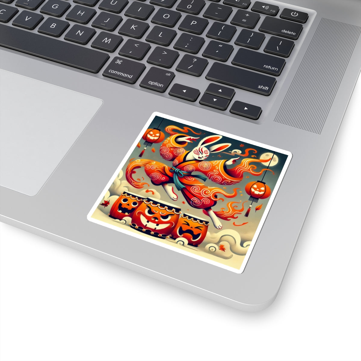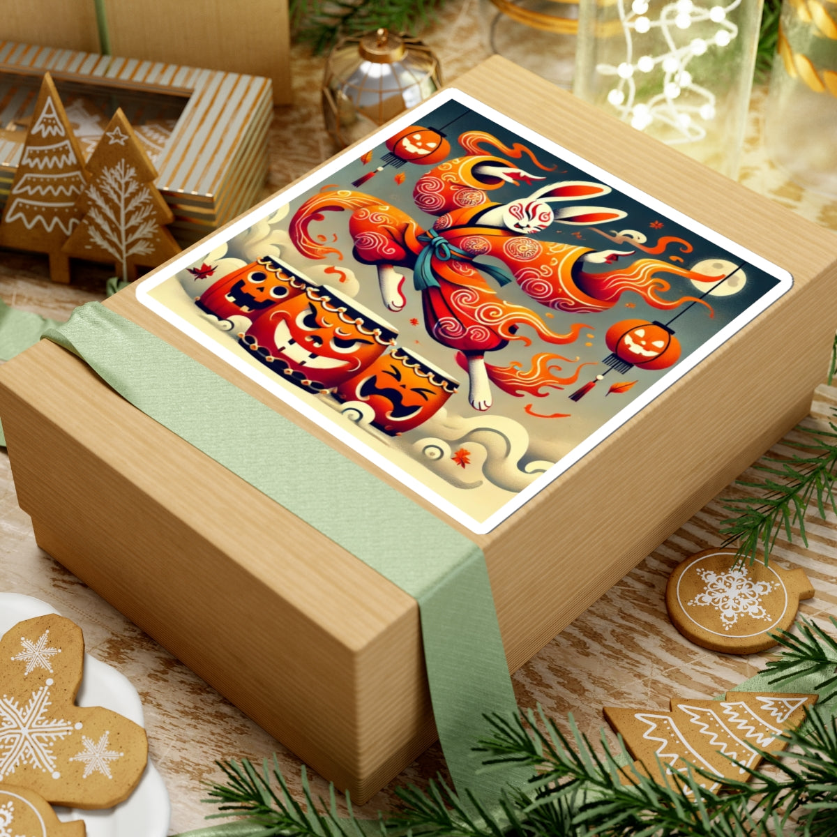 These kiss-cut stickers bring art and personality to any surface, crafted to peel smoothly from the page while keeping their backing intact. Available in four sizes with a glossy finish, they’re as durable as they are eye-catching. Across their surface leaps a Kabuki-inspired rabbit in flame-patterned robes, soaring dynamically over glowing jack-o’-lantern drums. The bold flat-style colors radiate mischief and festivity, capturing the energy of Japanese theatrical tradition while celebrating the playful spirit of Halloween. More than just a sticker, it’s a miniature stage of magic and culture that transforms everyday items into vibrant expressions of creativity.