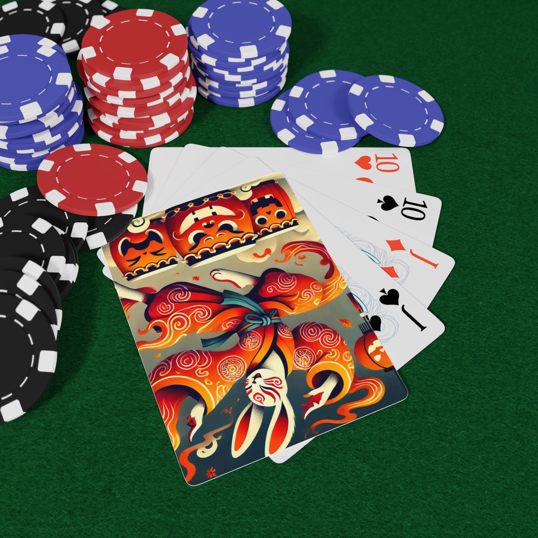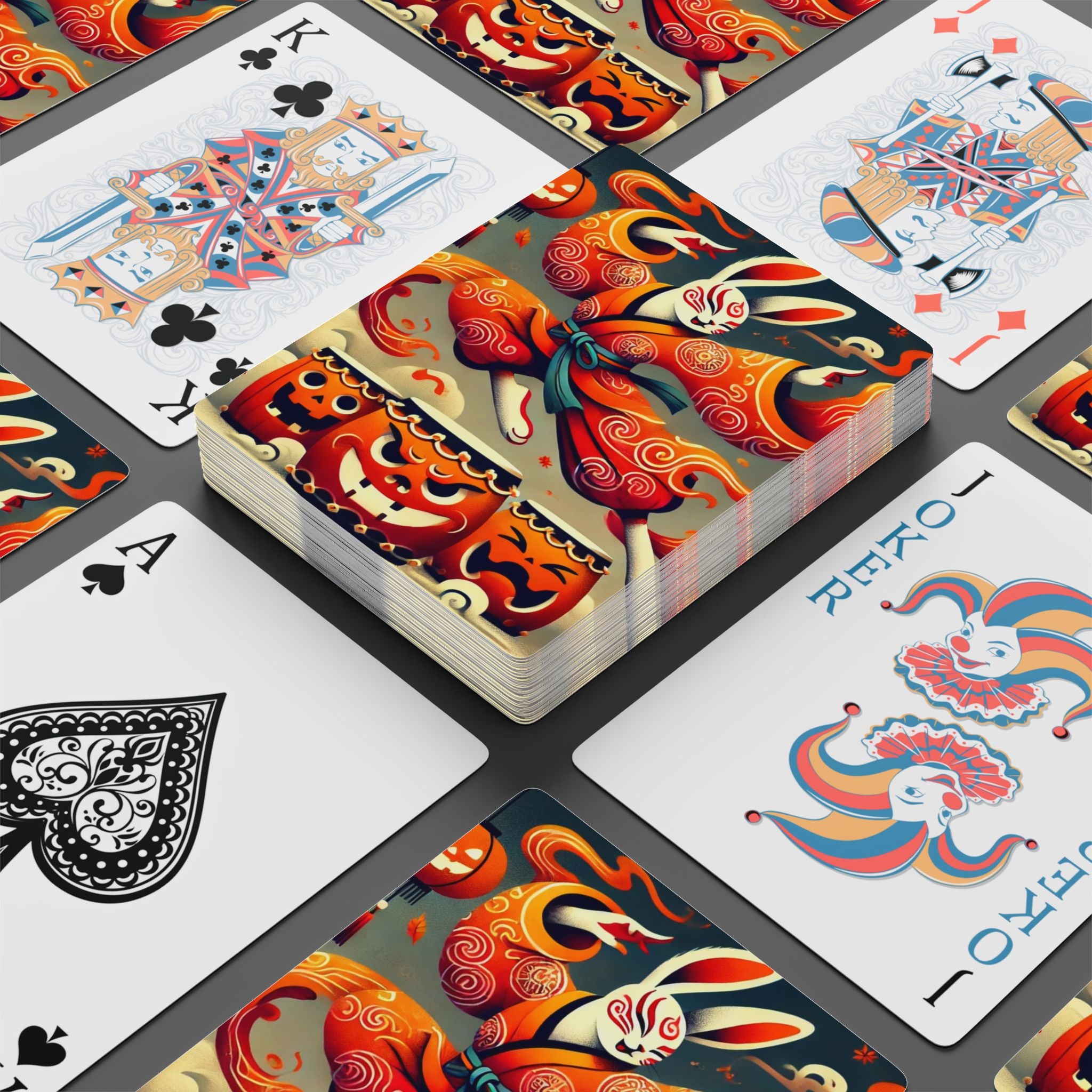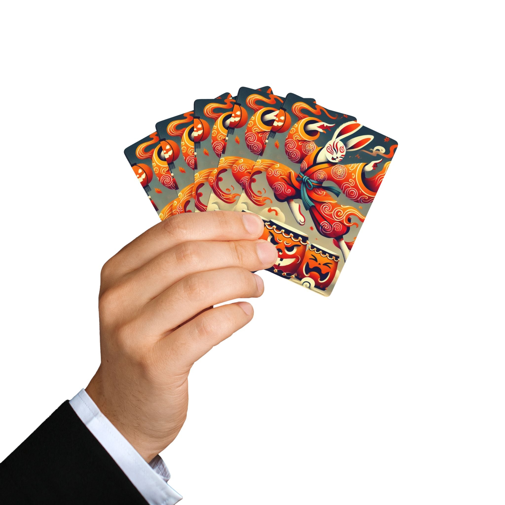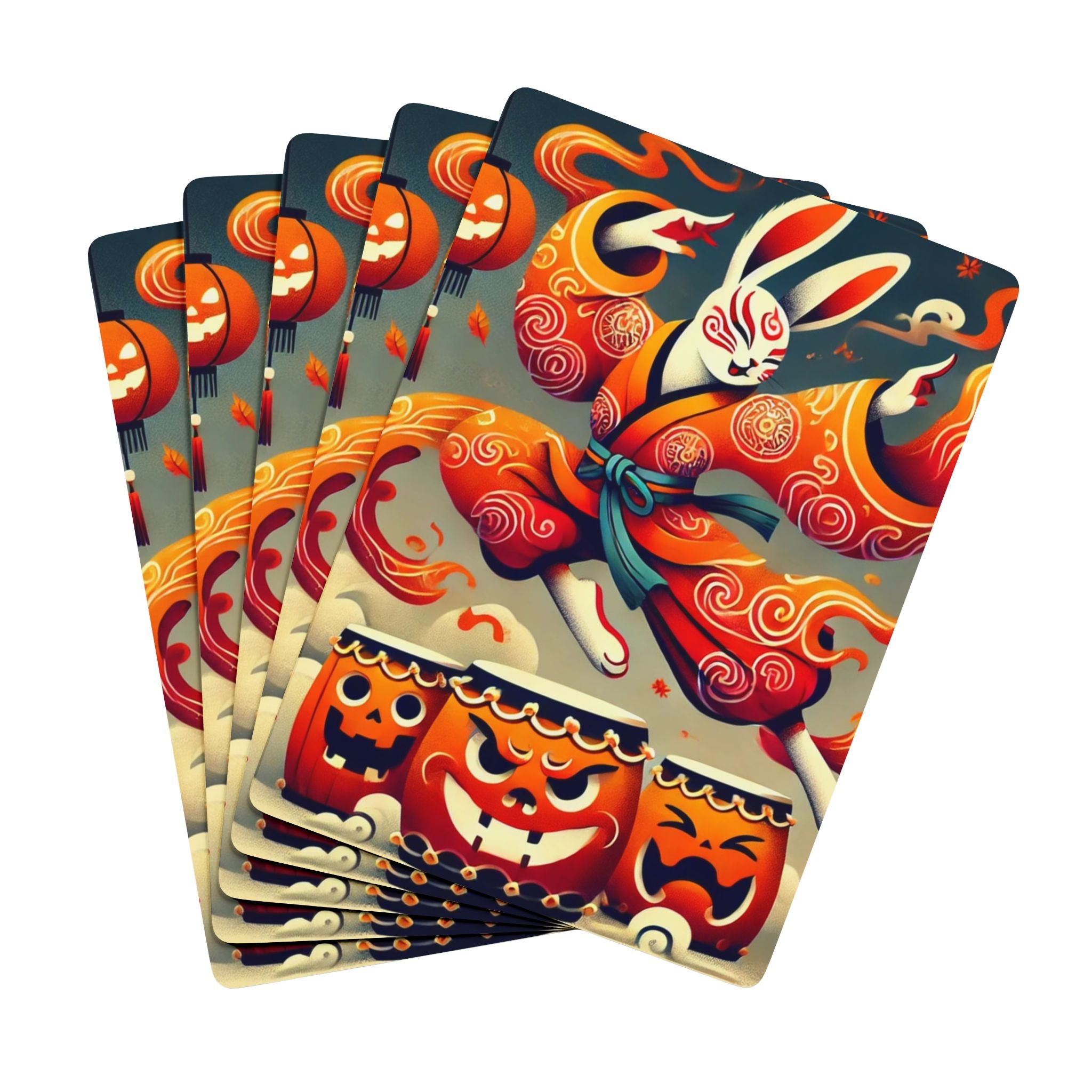 Poker nights are fun, but a deck of Jack-O’-Lantern Drums & The Kabuki Rabbit cards makes them unforgettable. Printed on smooth 300gsm premium stock (2.5" x 3.5"), each deck includes 52 playing cards plus 2 Jokers. The back design showcases a vibrant Halloween scene of a Kabuki-inspired rabbit in flame-patterned robes leaping over glowing jack-o’-lantern drums. Bold colors and festive energy blend Japanese flair with spooky seasonal fun.