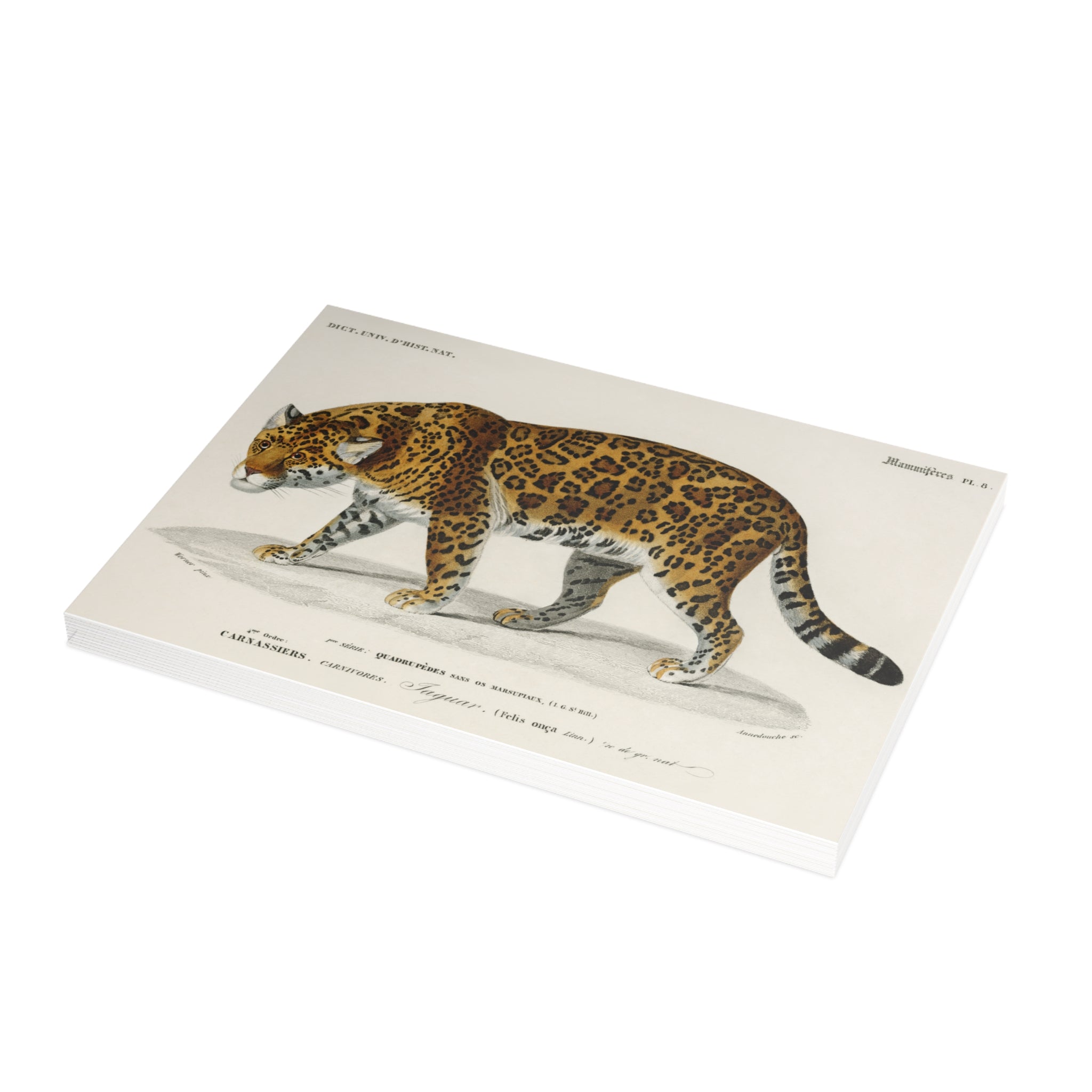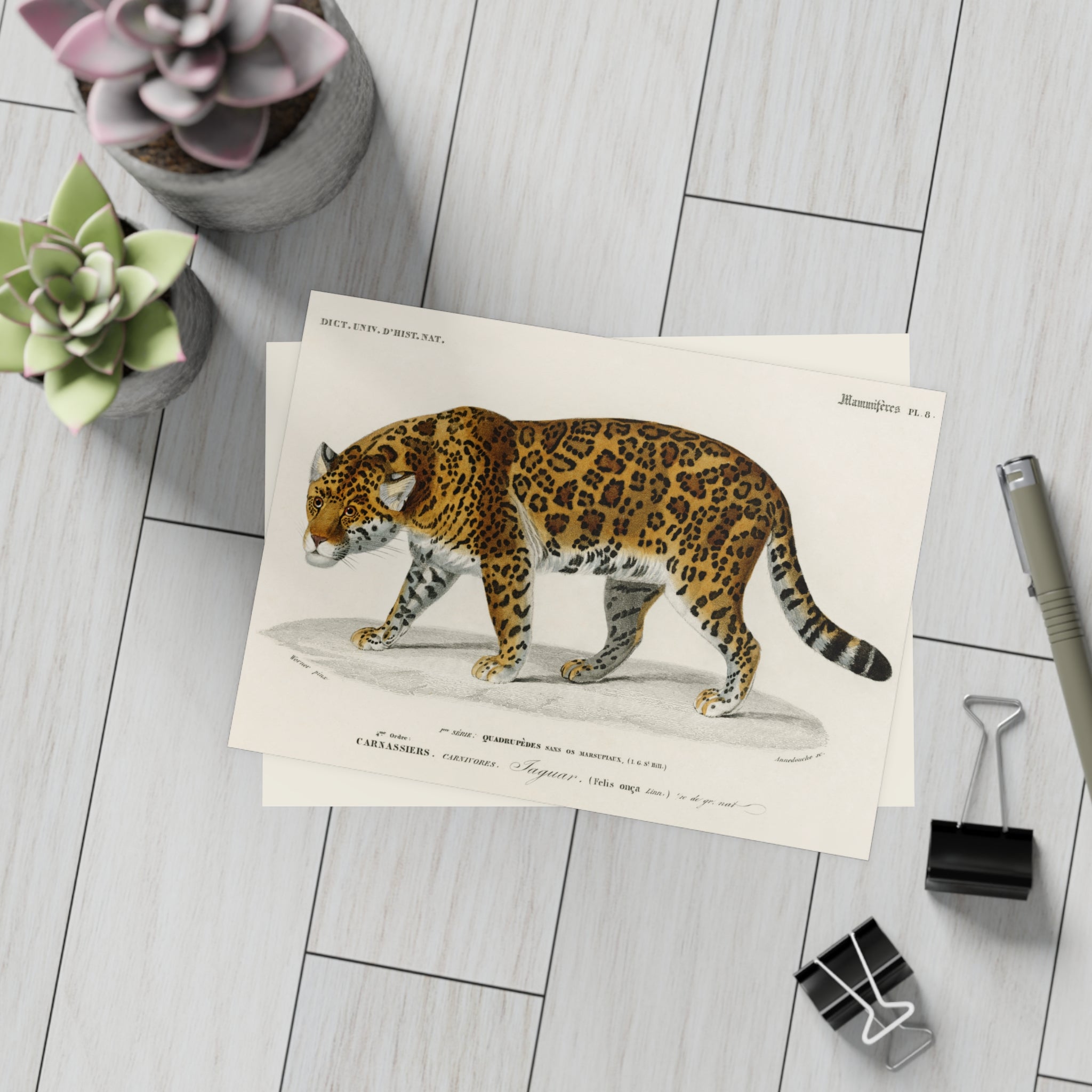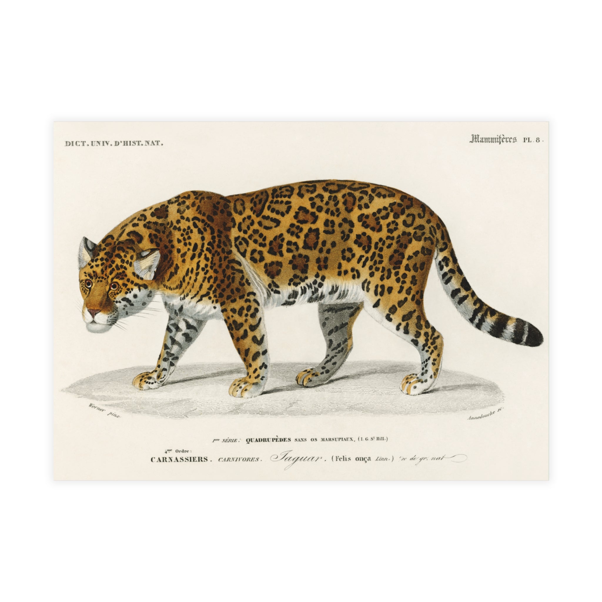 Artwork designed and digitally remastered by Sarasvati Designs. Jaguar (Panthera onca) is an illustration by Charles Dessalines D' Orbigny from the 1892 edition of Dictionnaire Universel D'histoire Naturelle. In this illustration, D' Orbigny carefully portrayed the distinctive features of the Jaguar, including its robust build, distinctive coat pattern, and powerful presence. Charles Dessalines D' Orbigny, a French naturalist and illustrator, was known for his meticulous and accurate scientific illustrations.
