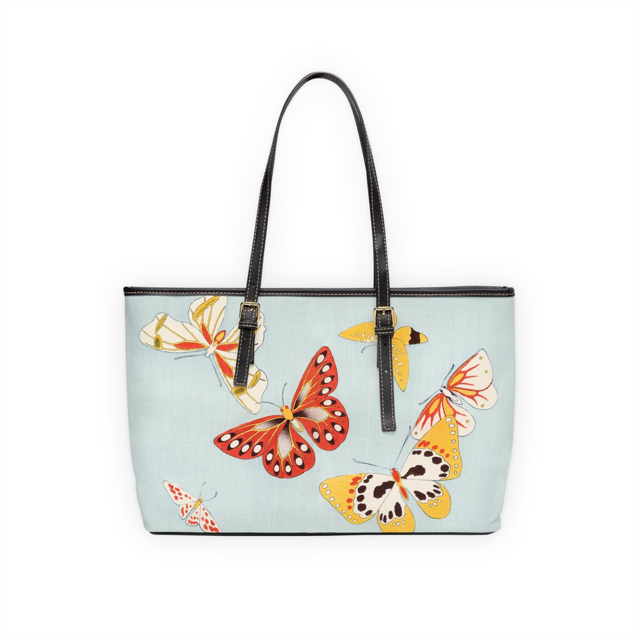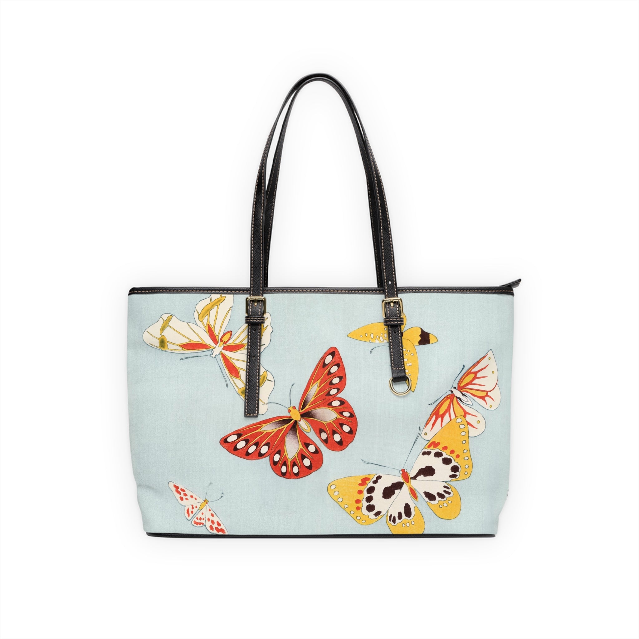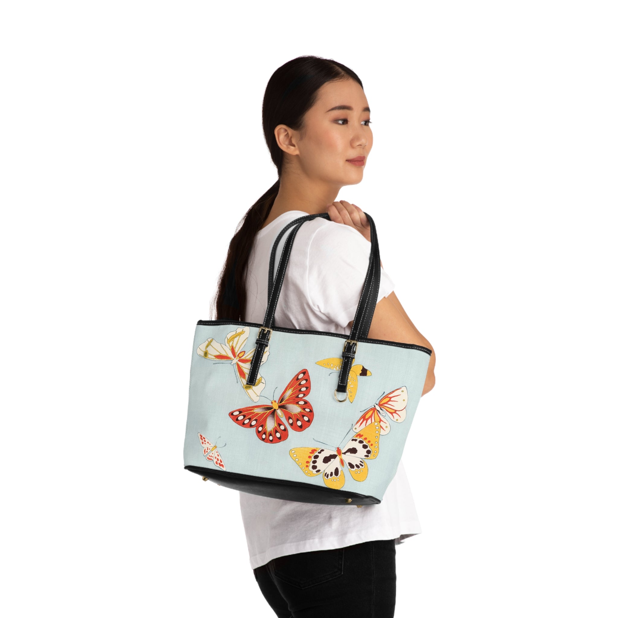 This shoulder bag features a delicate and vibrant Japanese butterfly illustration that captures the grace and whimsy of butterflies through stylized forms and bold color contrasts. Made of 100% PU leather with adjustable handles, it offers additional space inside with pockets for convenience. Perfect for those who appreciate Japanese aesthetics and design, this bag is ideal for everyday use or as a statement piece for special occasions.