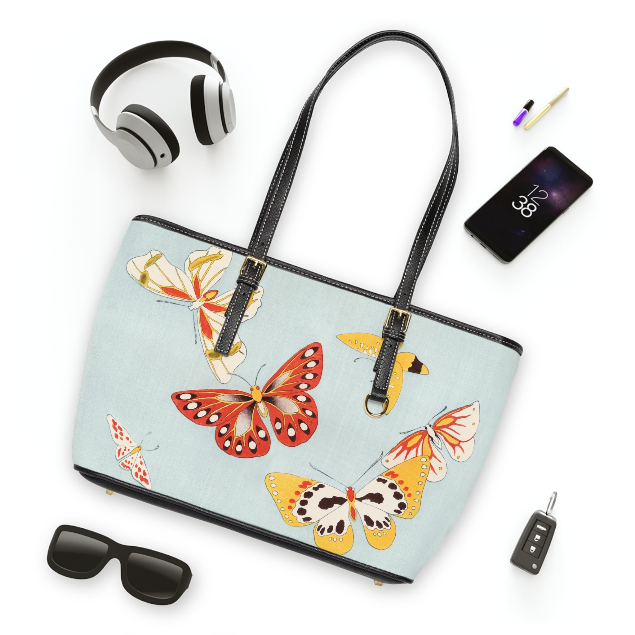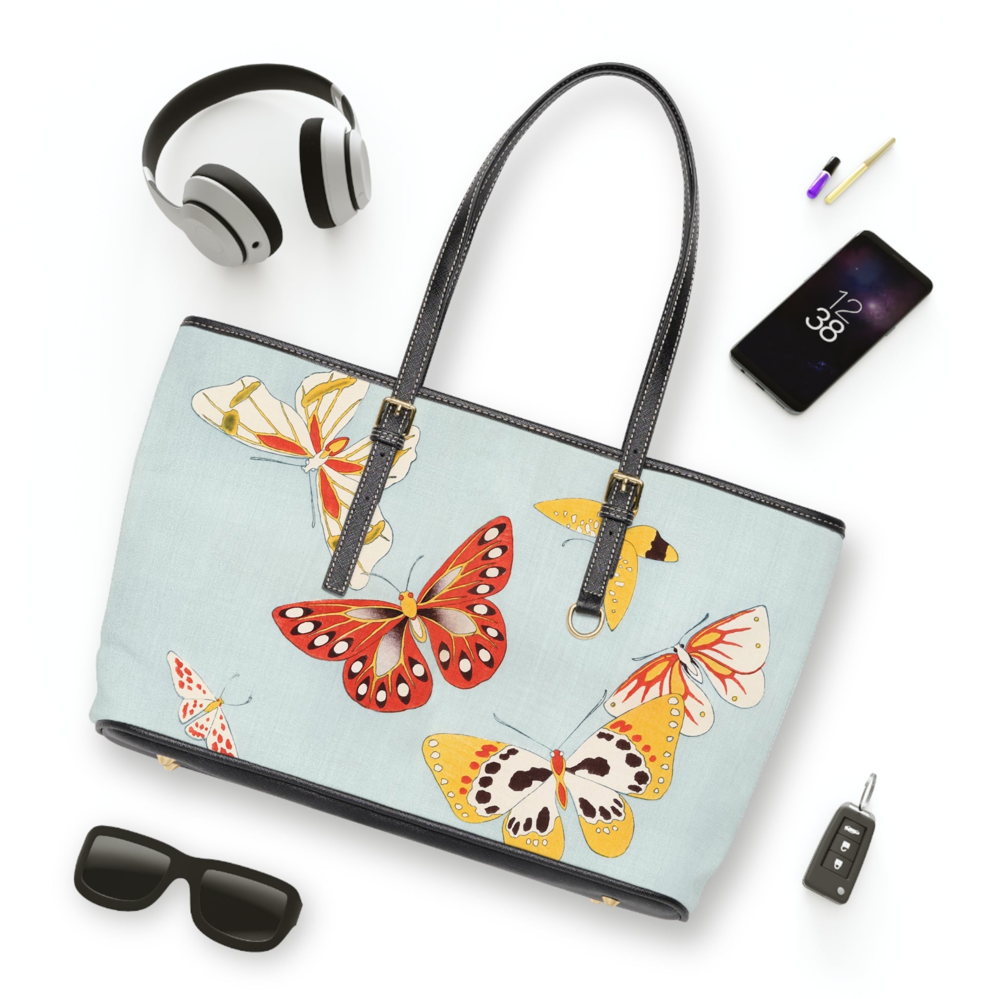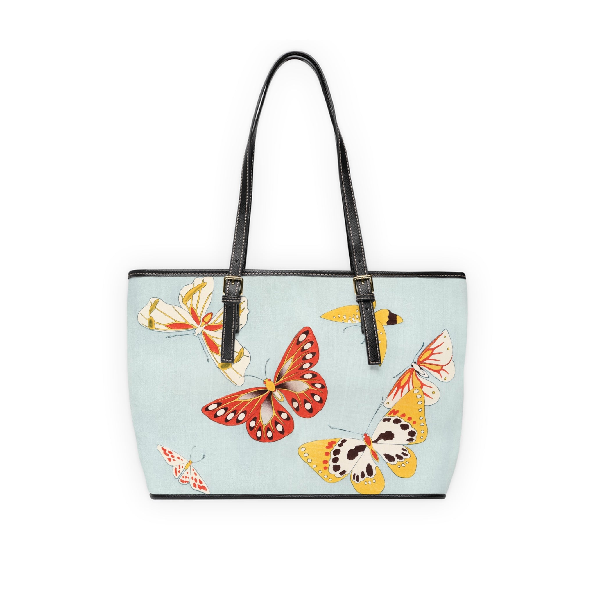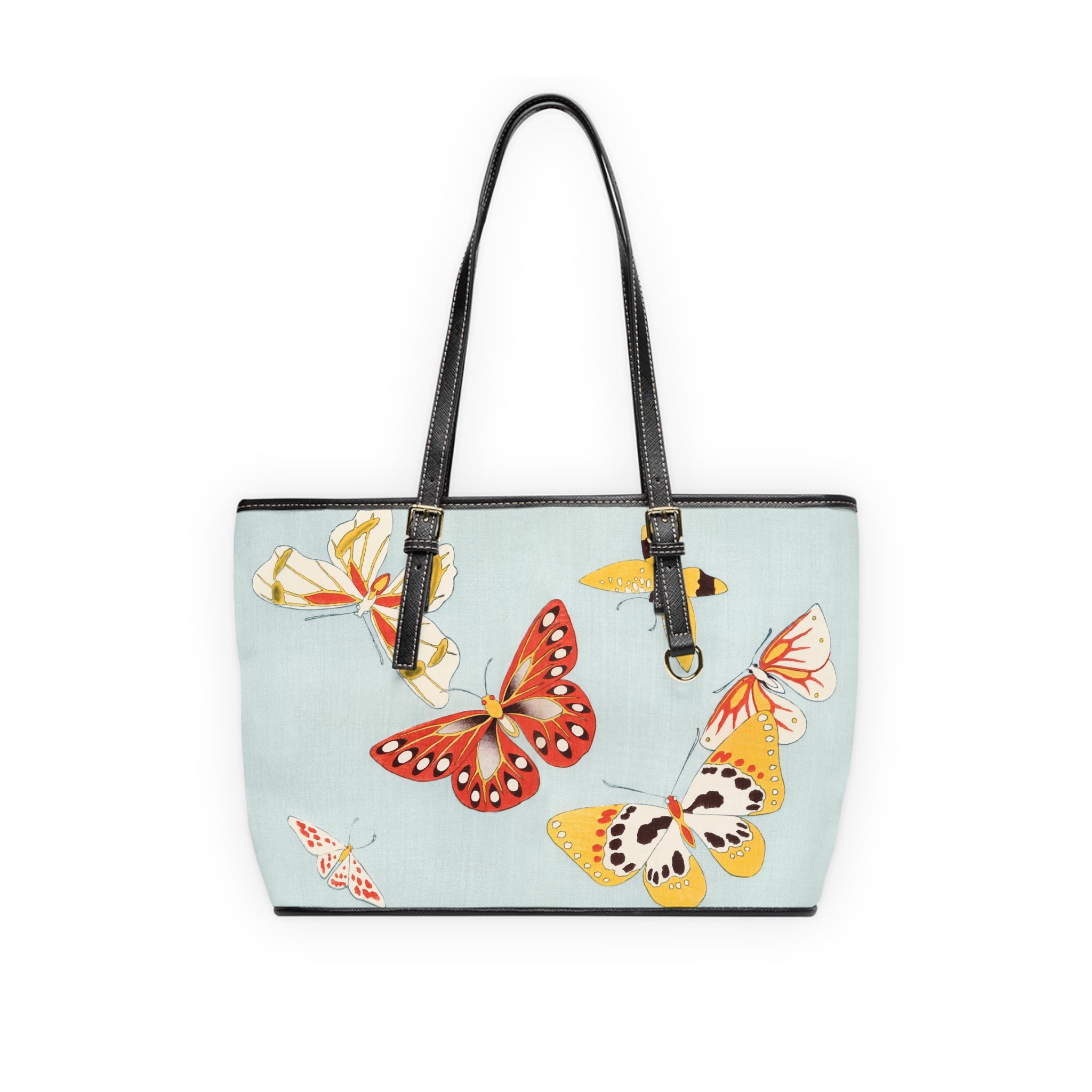 This shoulder bag features a delicate and vibrant Japanese butterfly illustration that captures the grace and whimsy of butterflies through stylized forms and bold color contrasts. Made of 100% PU leather with adjustable handles, it offers additional space inside with pockets for convenience. Perfect for those who appreciate Japanese aesthetics and design, this bag is ideal for everyday use or as a statement piece for special occasions.
