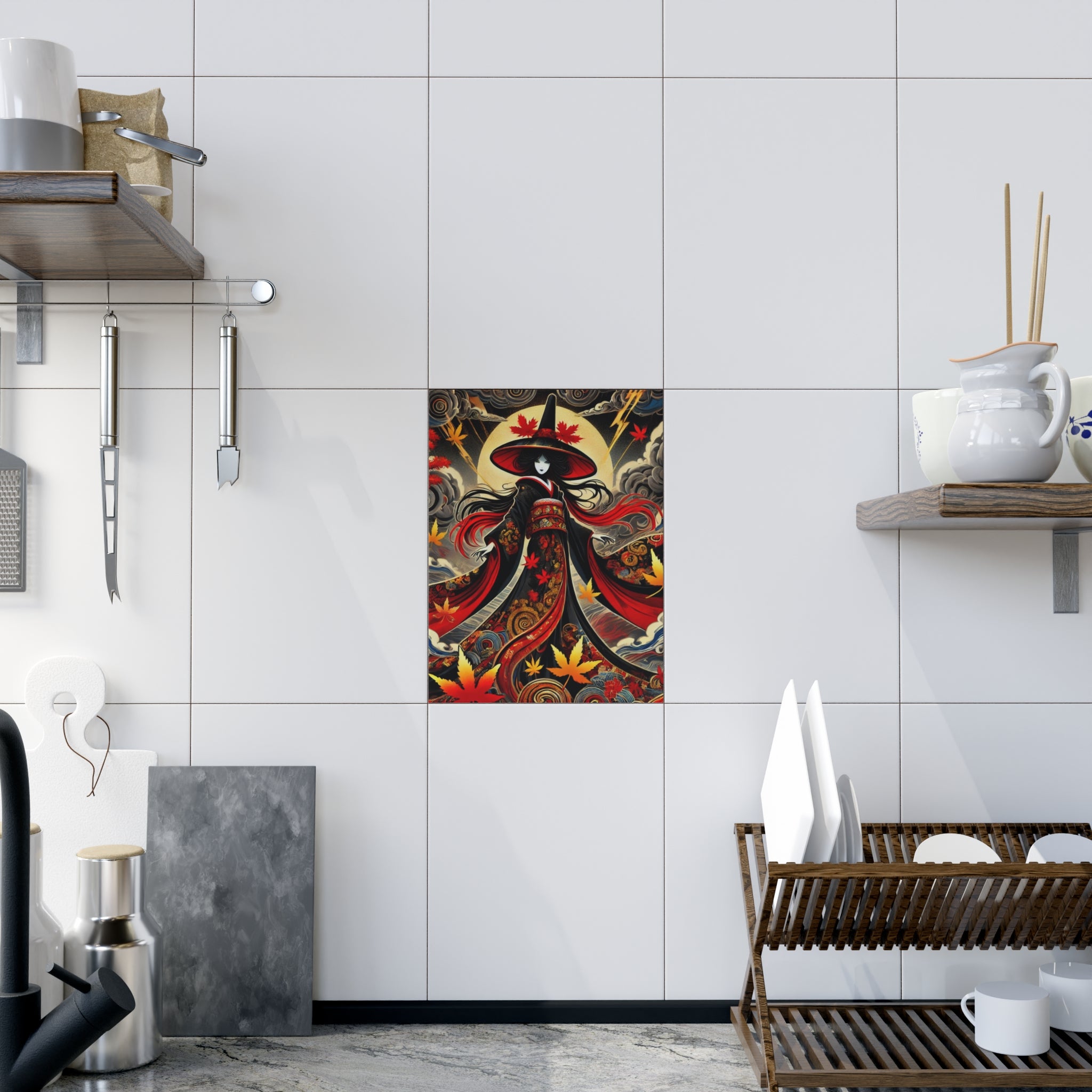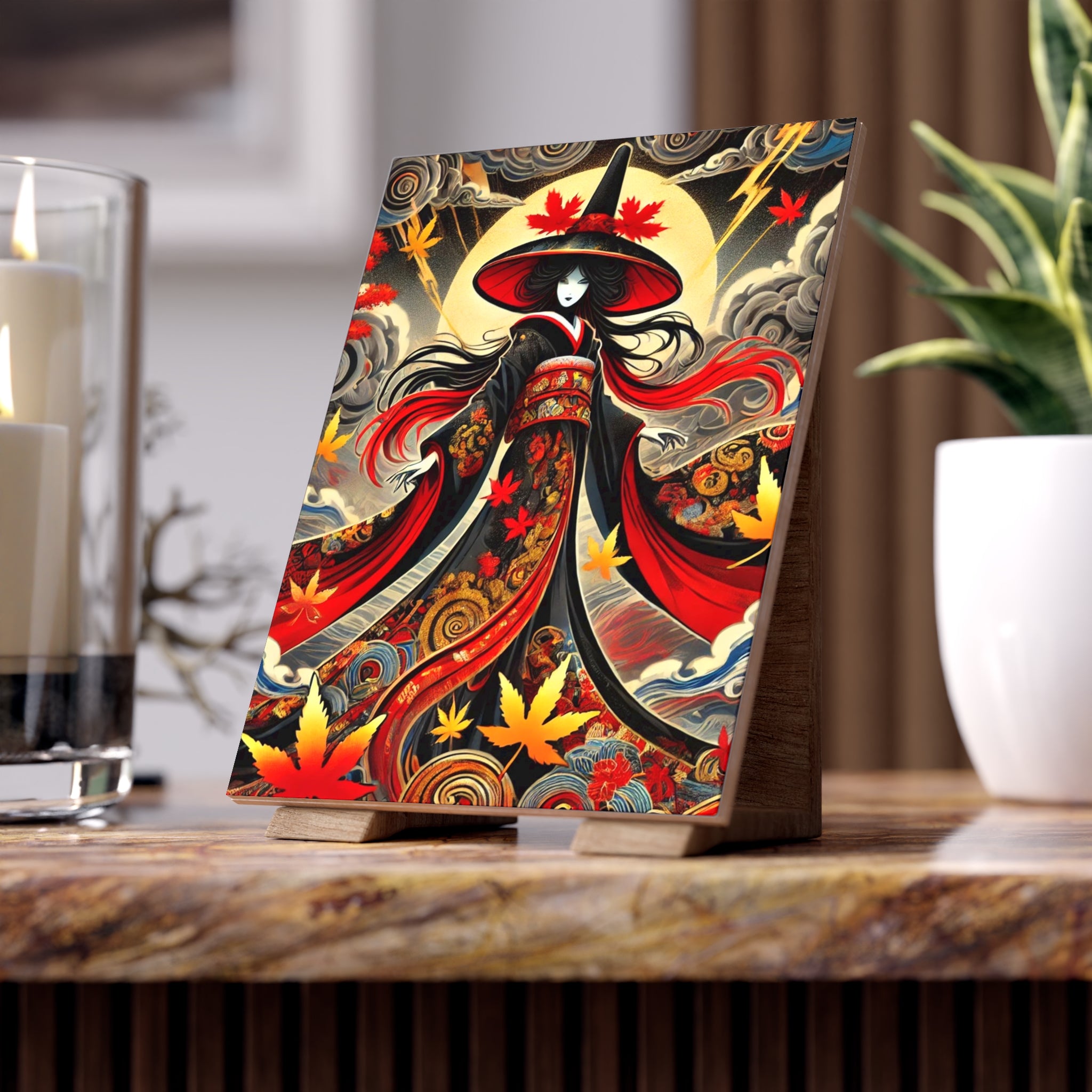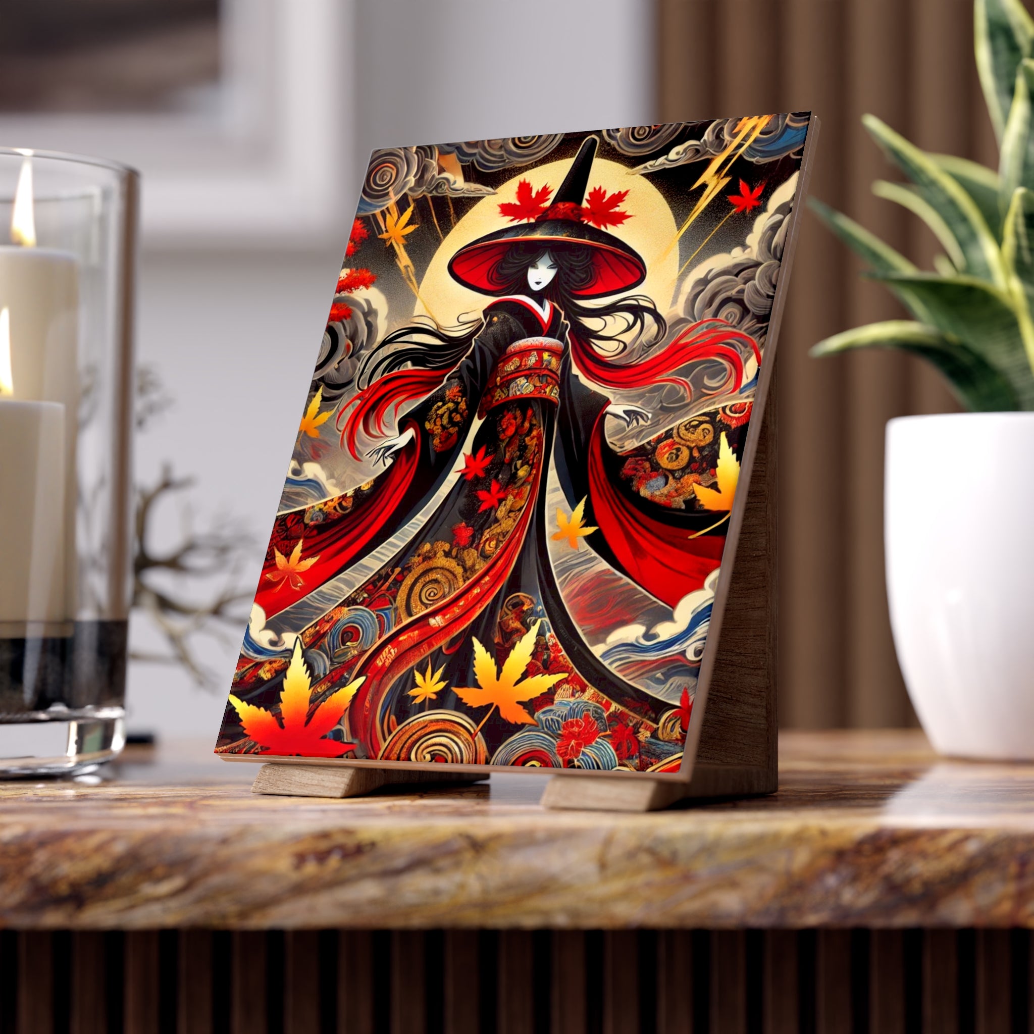 Bring dramatic flair to your décor with the Kabuki Witch Ceramic Tile, available in glossy or matte finish. This durable custom tile works beautifully as a trivet, display accent, or unique art piece. The design showcases a Kabuki-inspired witch in a towering red hat and flowing black kimono, her robes adorned with golden storm cloud patterns and fiery red maple leaves. Blending elegance with supernatural power, the artwork transforms this tile into a captivating mix of Japanese theater, fantasy, and Halloween magic.