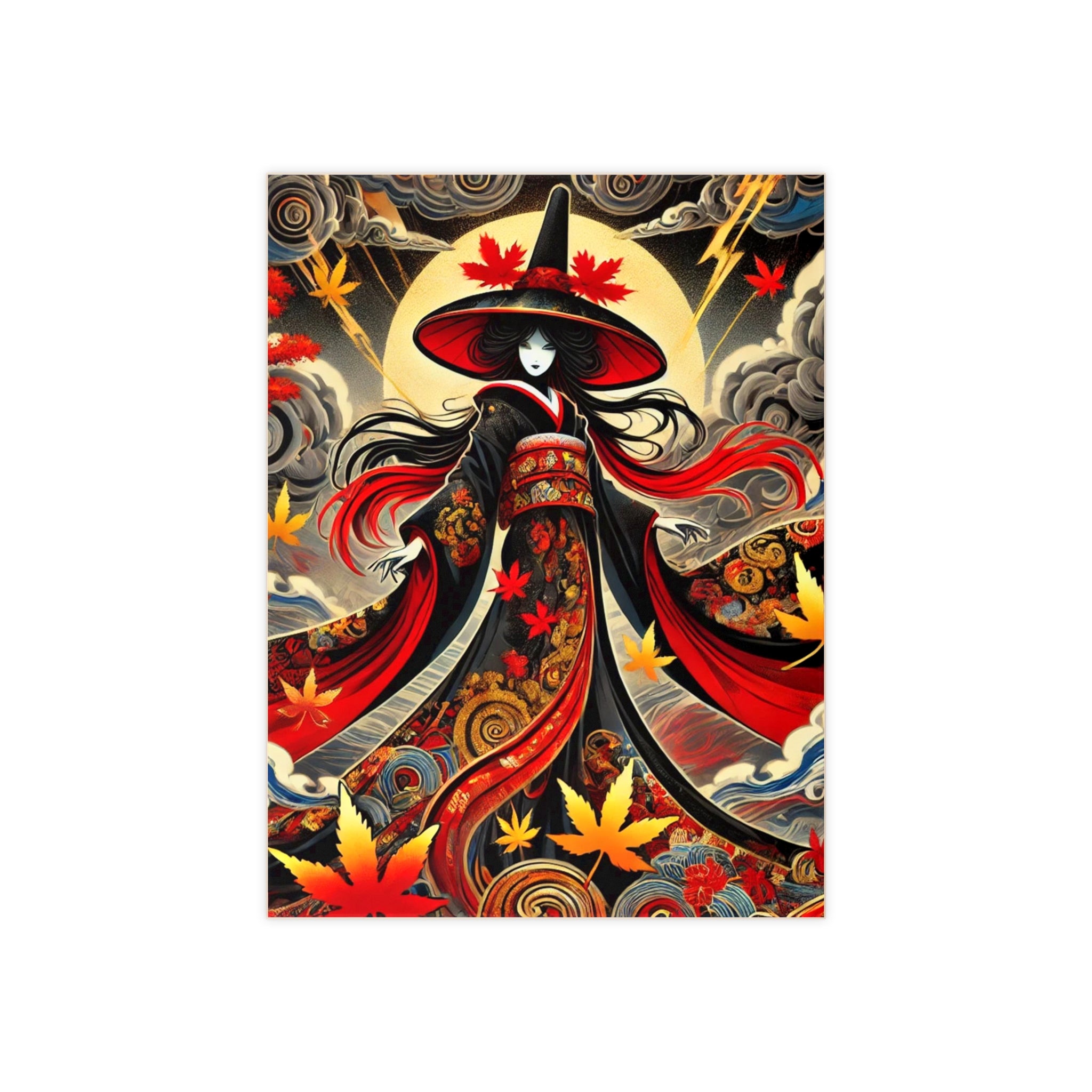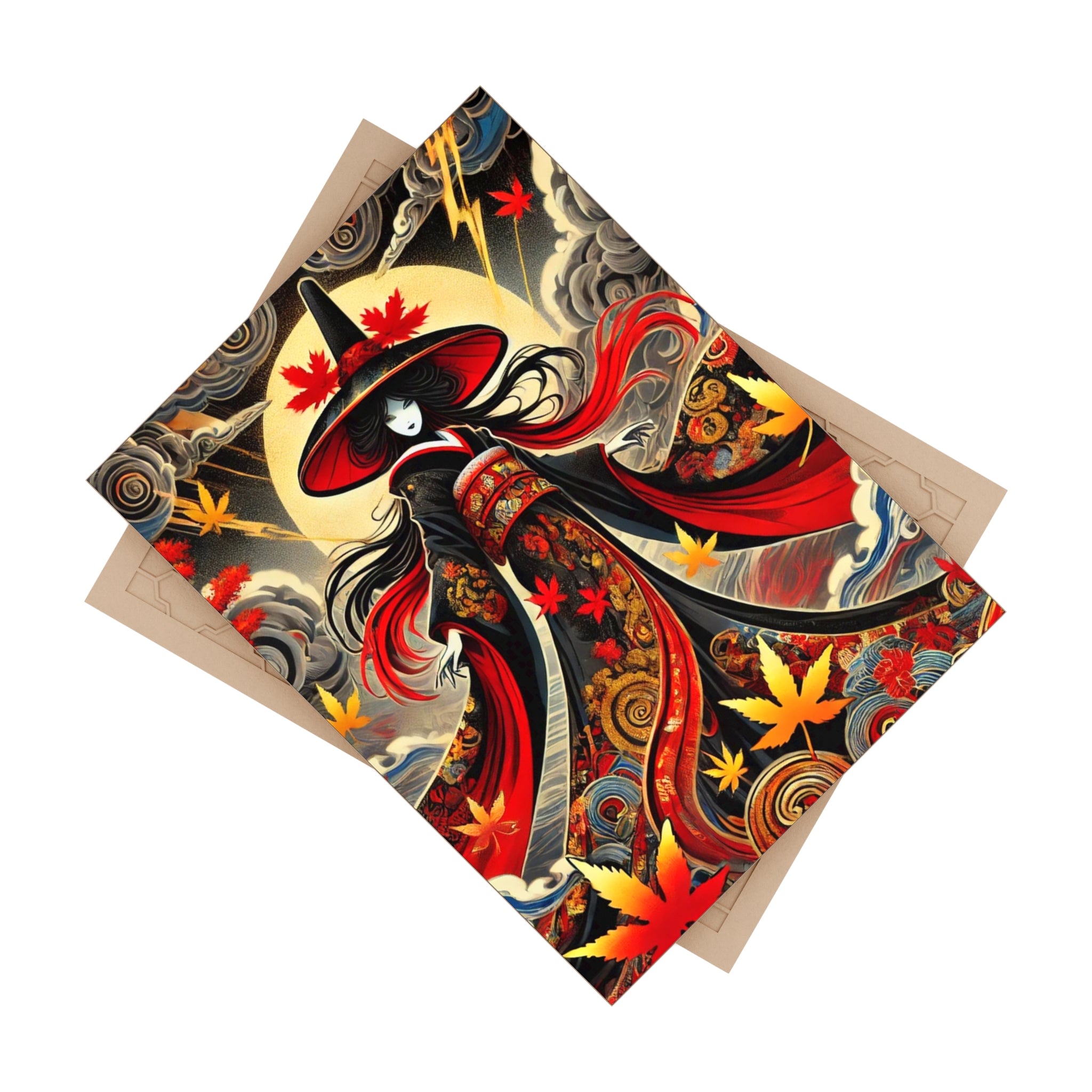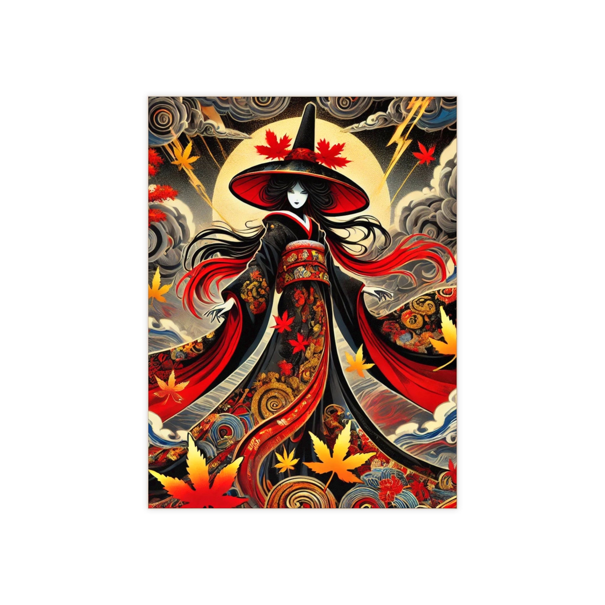Bring dramatic flair to your décor with the Kabuki Witch Ceramic Tile, available in glossy or matte finish. This durable custom tile works beautifully as a trivet, display accent, or unique art piece. The design showcases a Kabuki-inspired witch in a towering red hat and flowing black kimono, her robes adorned with golden storm cloud patterns and fiery red maple leaves. Blending elegance with supernatural power, the artwork transforms this tile into a captivating mix of Japanese theater, fantasy, and Halloween magic.