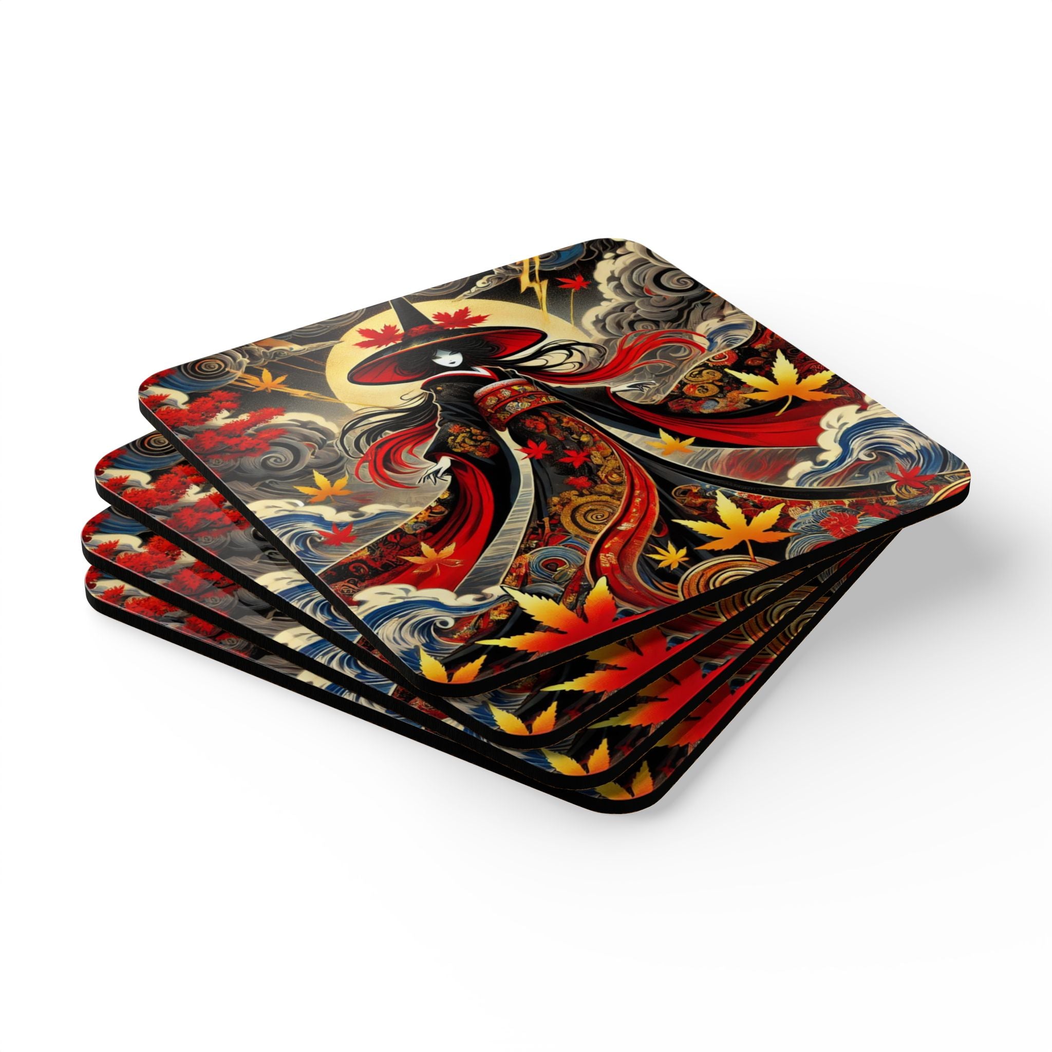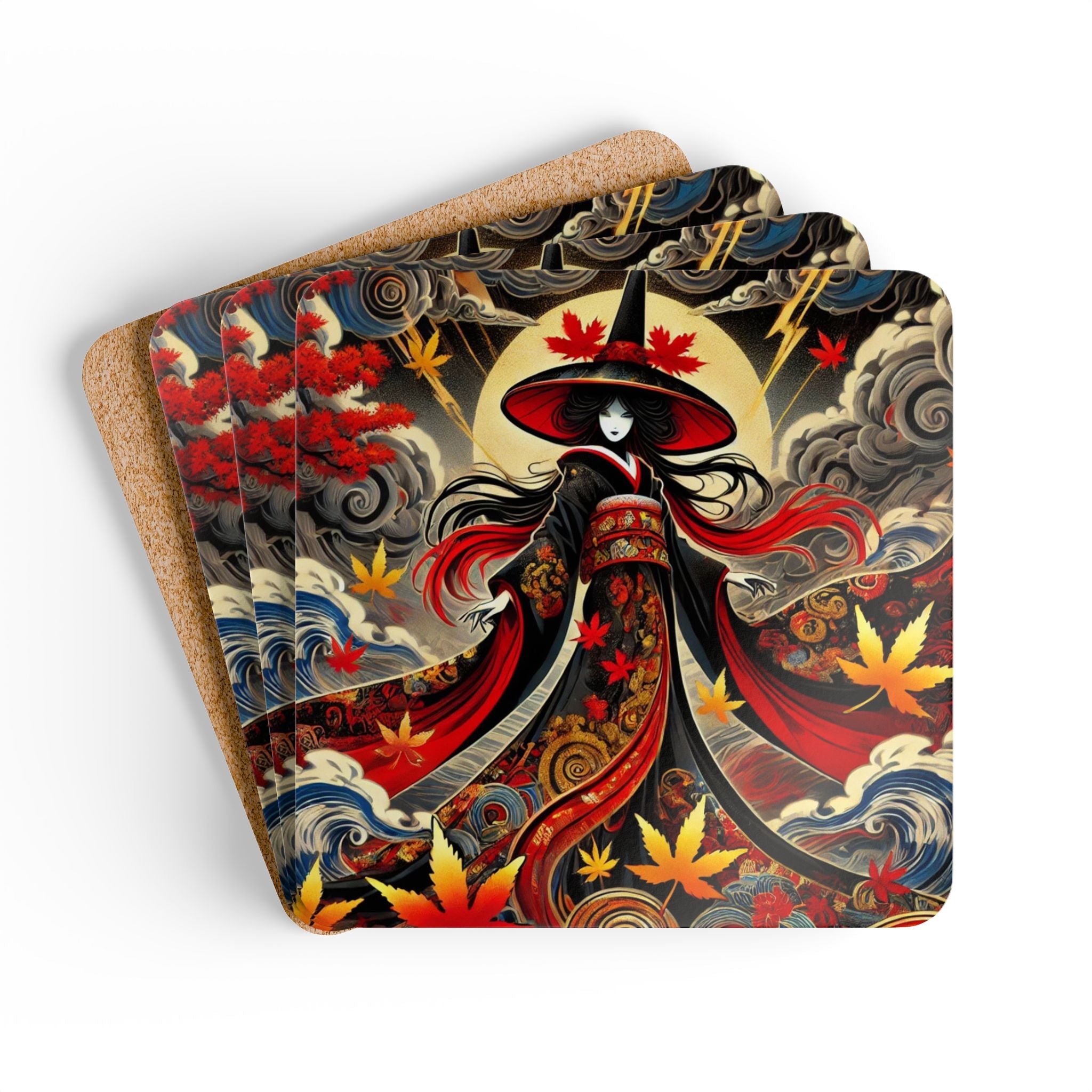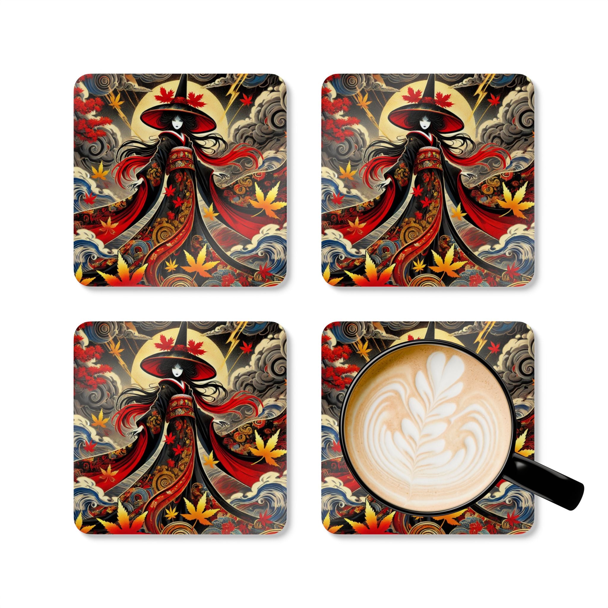 Across each glossy surface, a Kabuki-inspired witch takes center stage. Wearing a towering red hat and a flowing black kimono adorned with golden storm clouds and fiery red maple leaves, she radiates both elegance and supernatural power. The design draws on the traditions of Japanese theater while weaving in the fantasy and mystery of Halloween. With every use, these coasters transform simple table settings into a celebration of artistry, mystique, and seasonal magic.