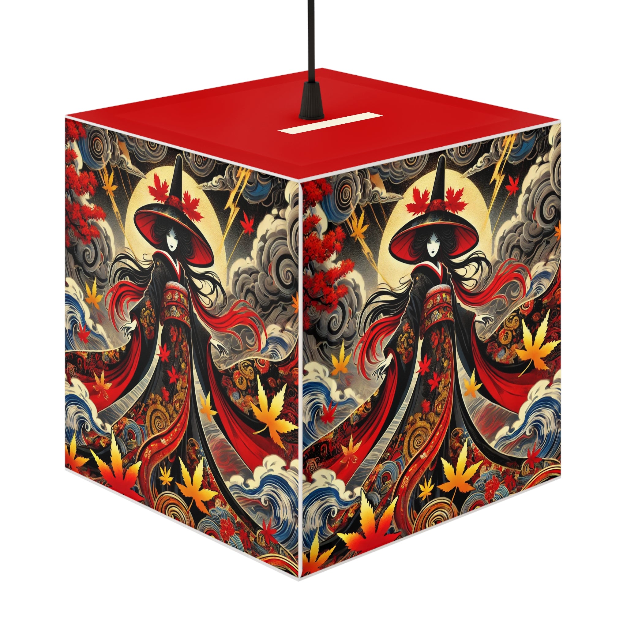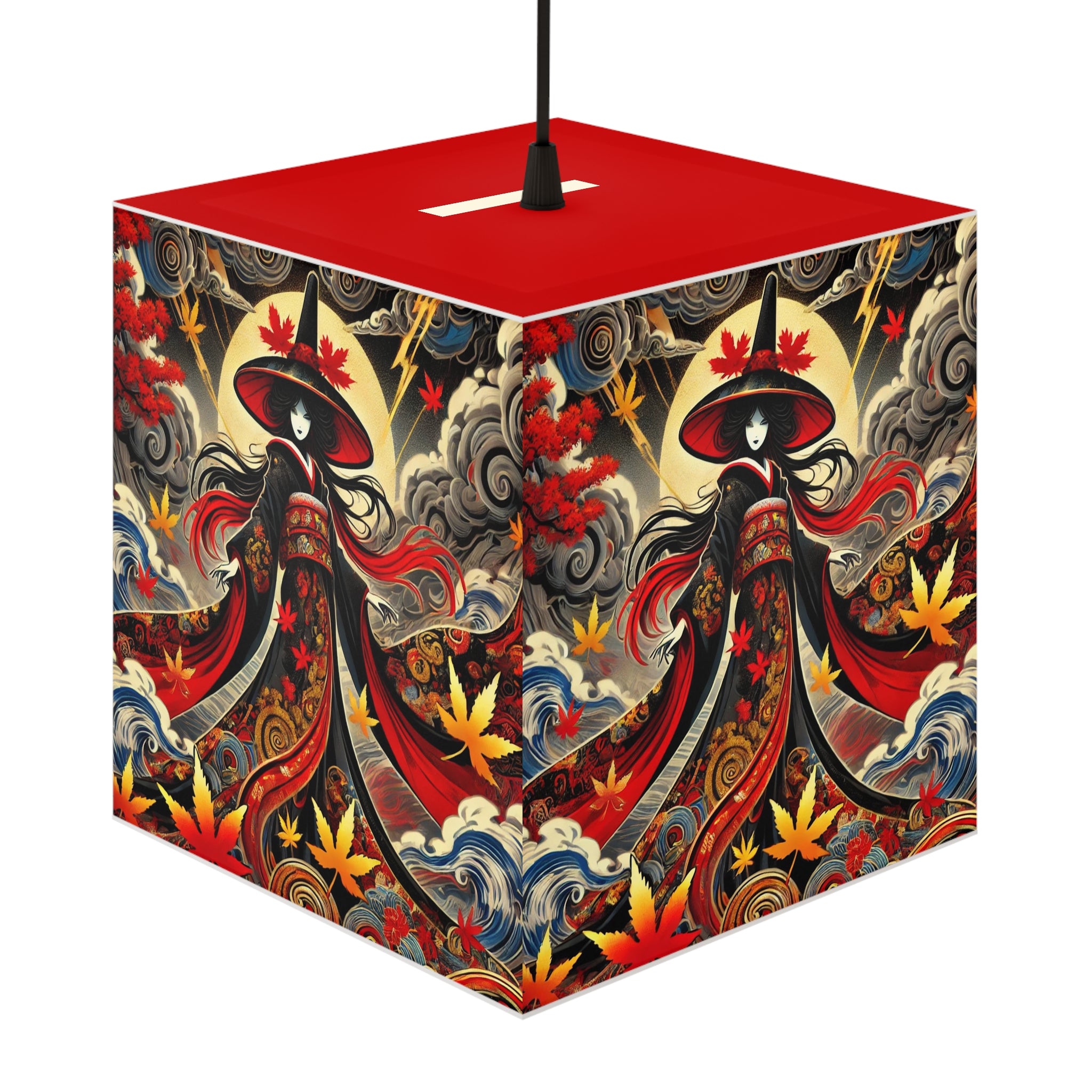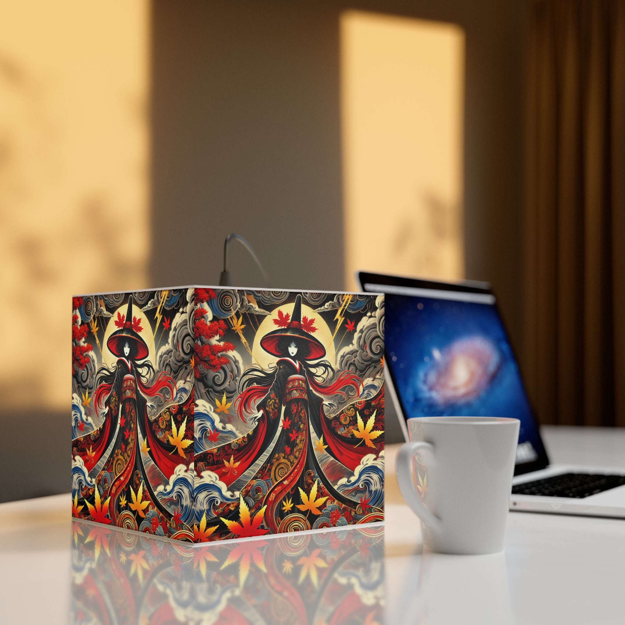 Illuminated across its surface, a Kabuki-inspired witch steps into view. She wears a towering red hat and a flowing black kimono alive with golden storm clouds and fiery red maple leaves. The patterns swirl dramatically under the glow, embodying both elegance and supernatural power. The lamp captures the spirit of Japanese theater while blending fantasy, mystique, and Halloween magic, creating a piece that turns ordinary light into a radiant performance of tradition and artistry.