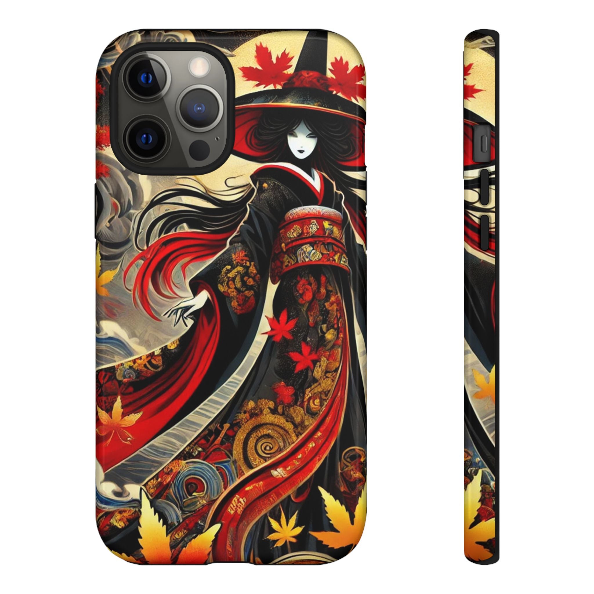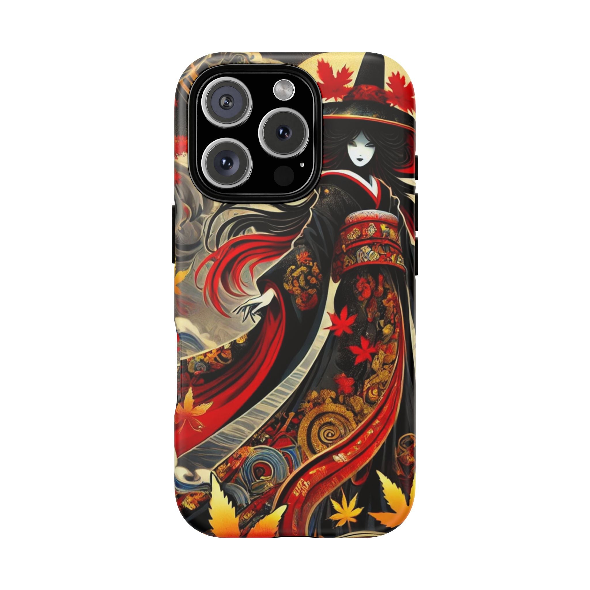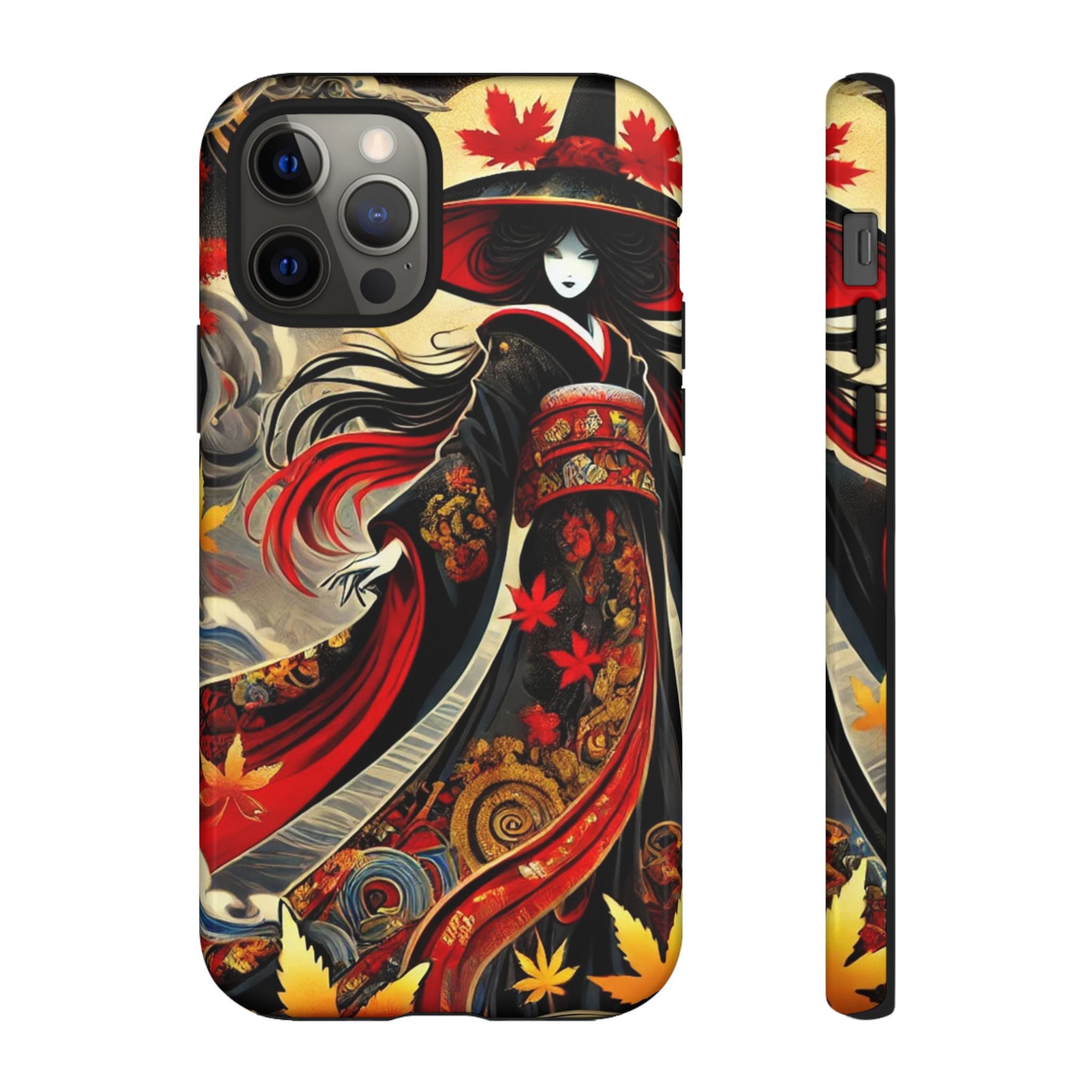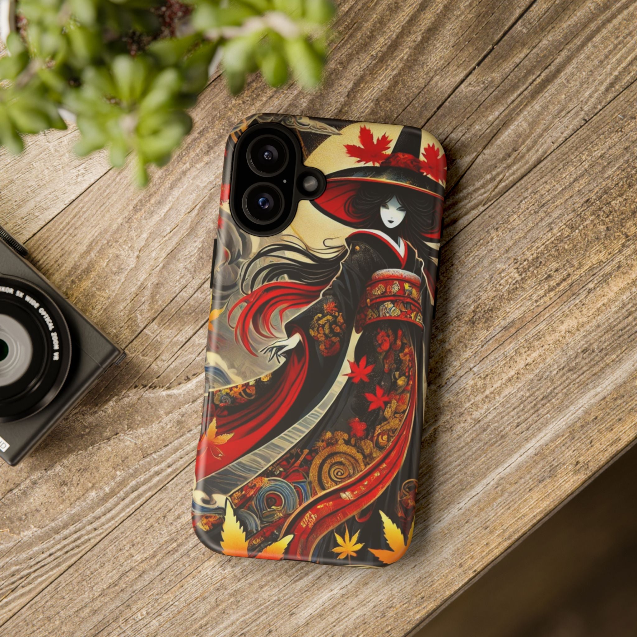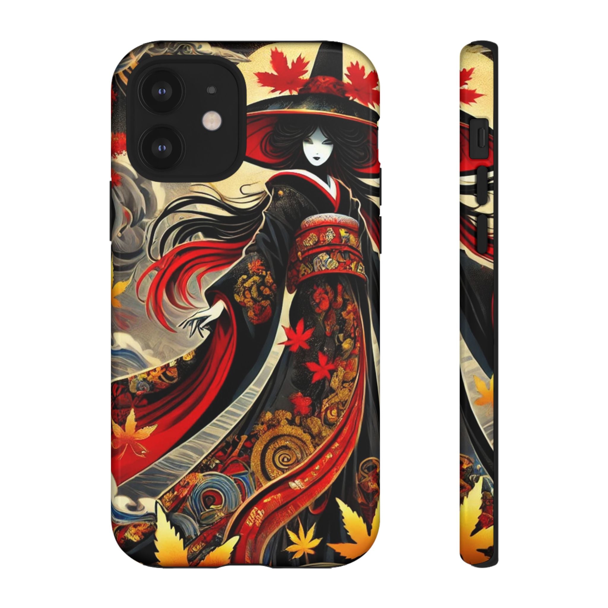 The case showcases a striking Kabuki-inspired witch in a towering red hat and flowing black kimono, detailed with golden storm clouds and fiery red maple leaves. Blending Japanese theater with Halloween mystique, it transforms everyday protection into a bold statement of art, fantasy, and elegance.