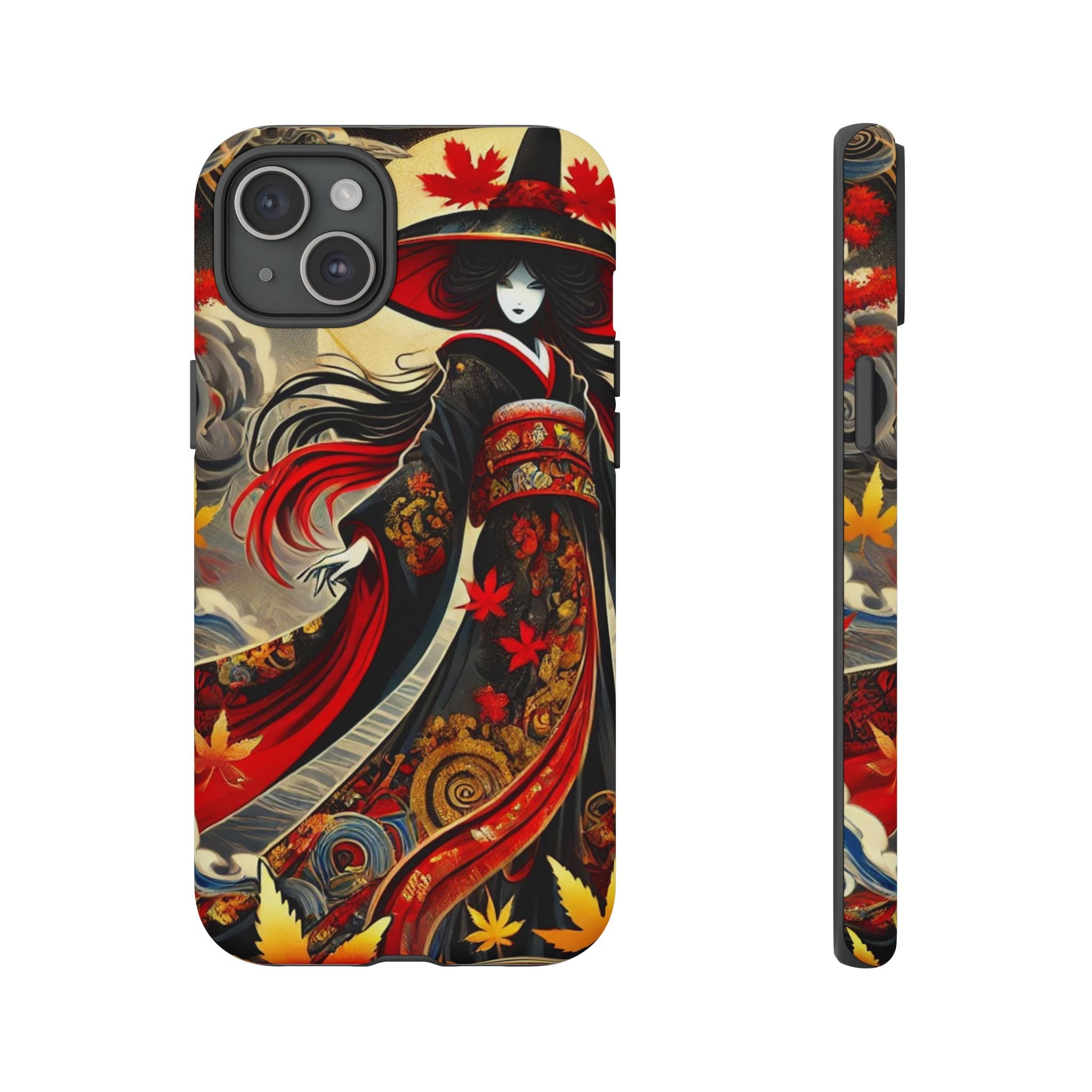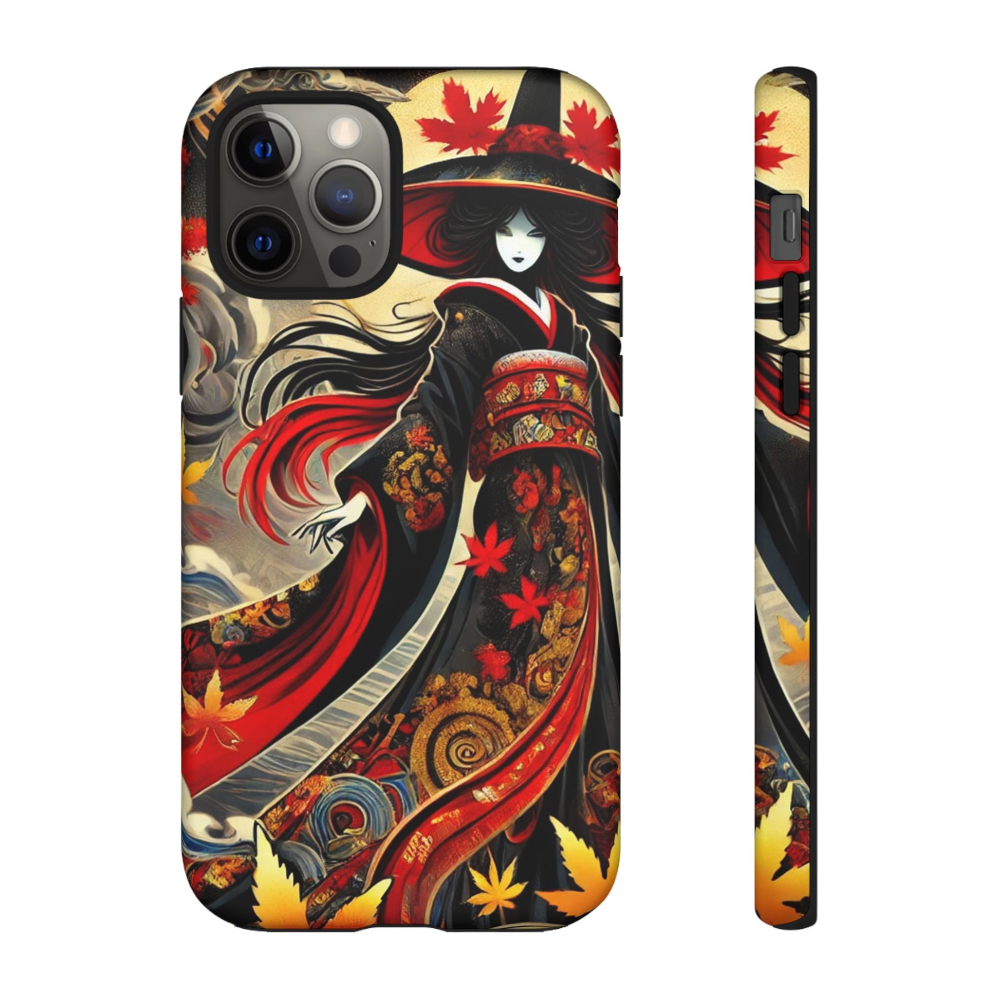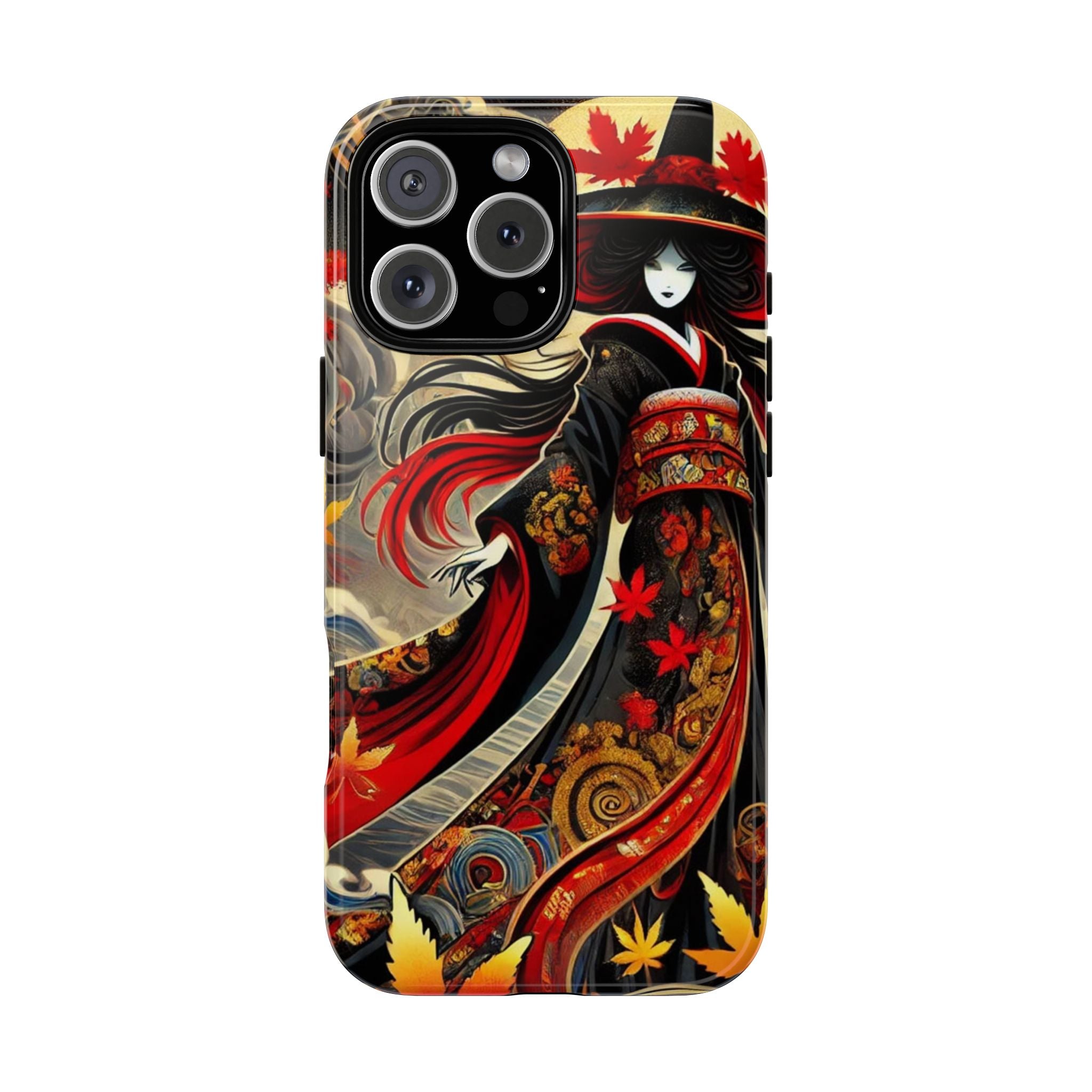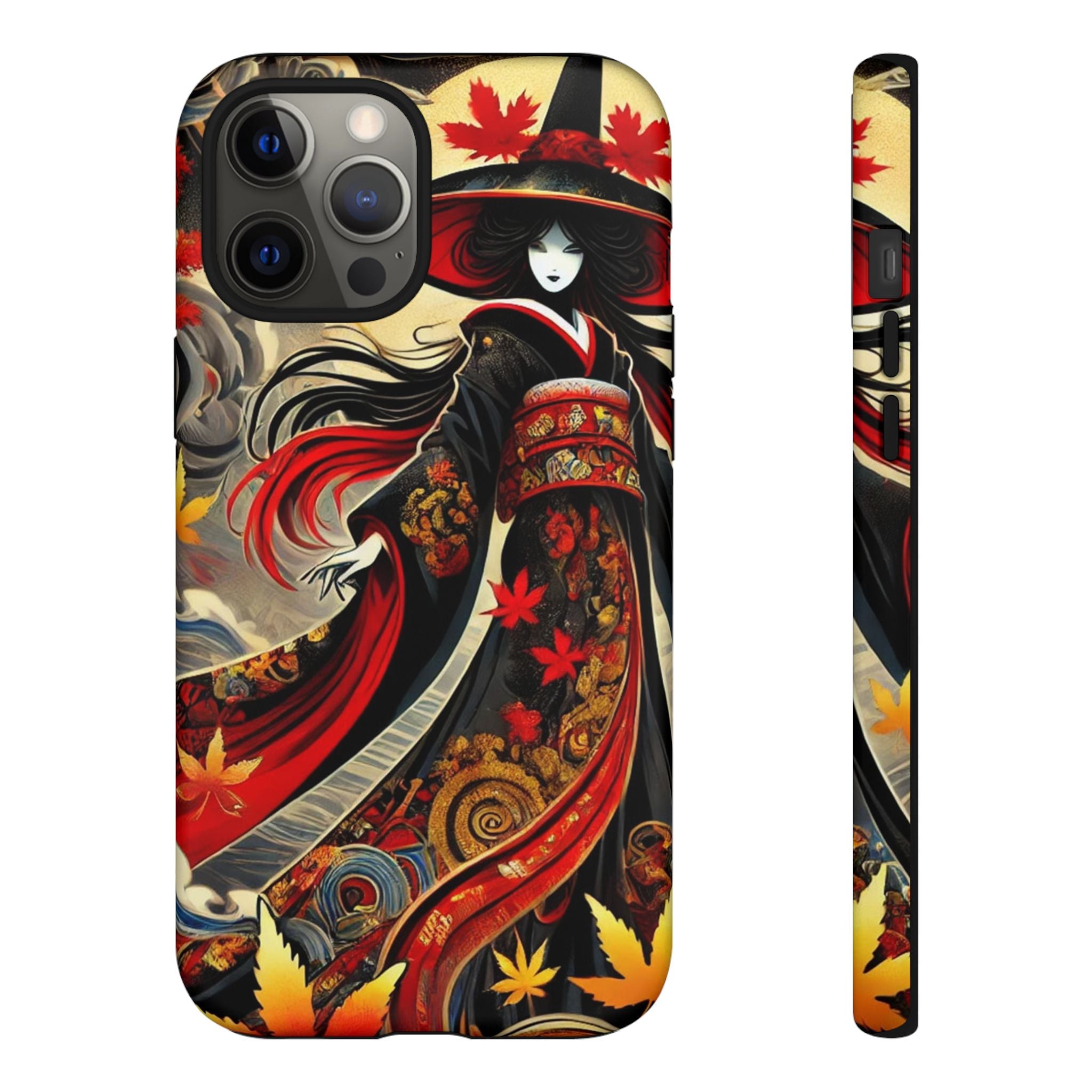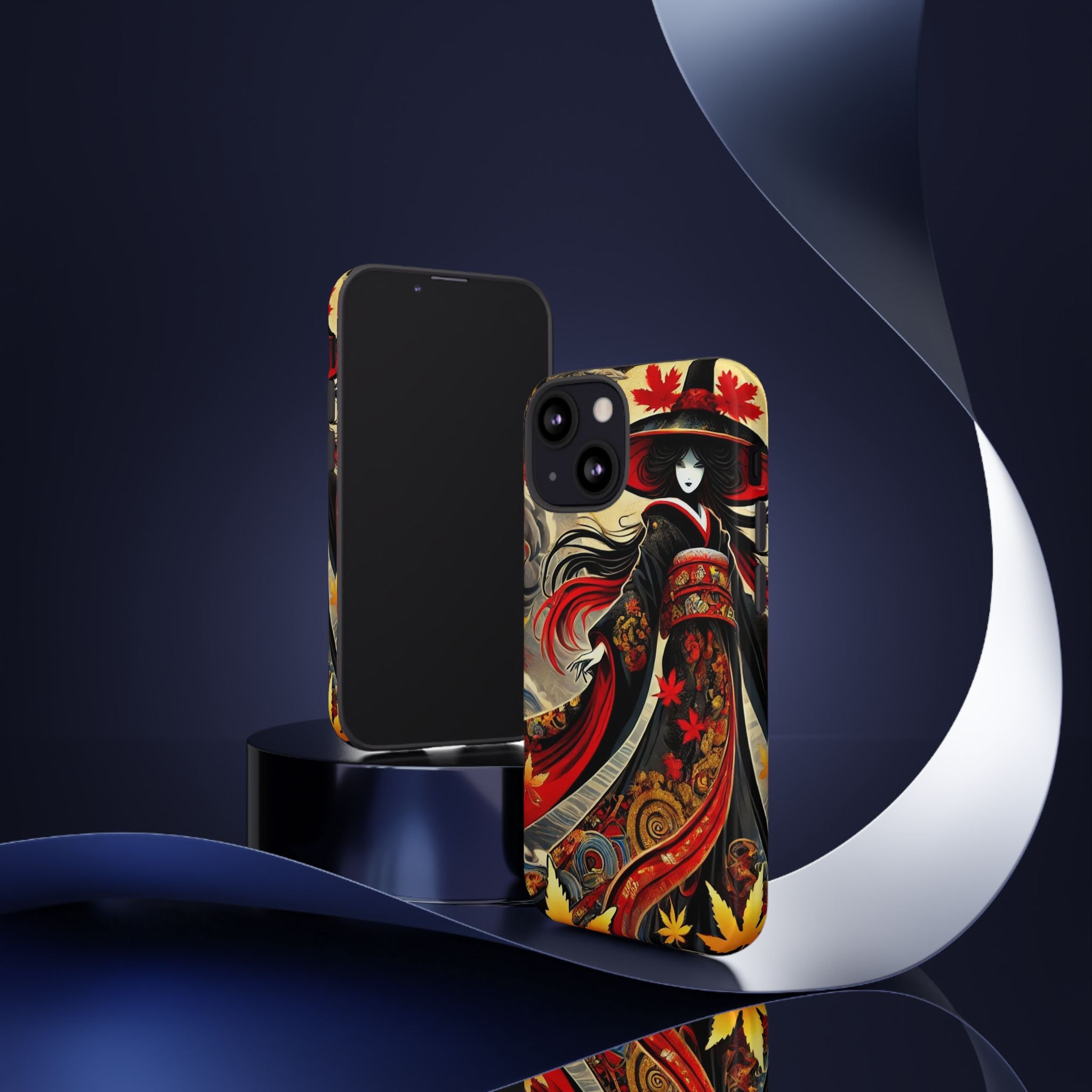 The case showcases a striking Kabuki-inspired witch in a towering red hat and flowing black kimono, detailed with golden storm clouds and fiery red maple leaves. Blending Japanese theater with Halloween mystique, it transforms everyday protection into a bold statement of art, fantasy, and elegance.