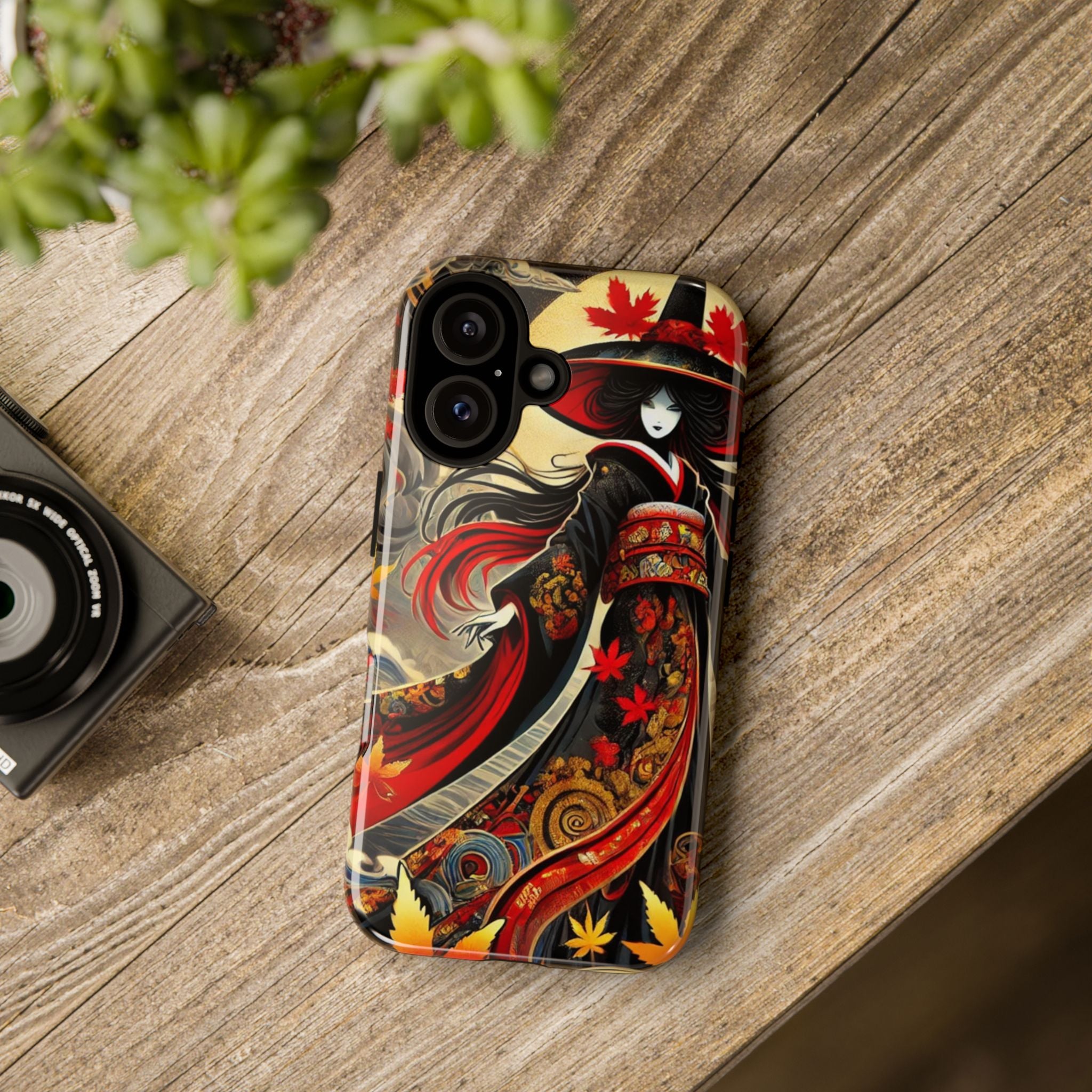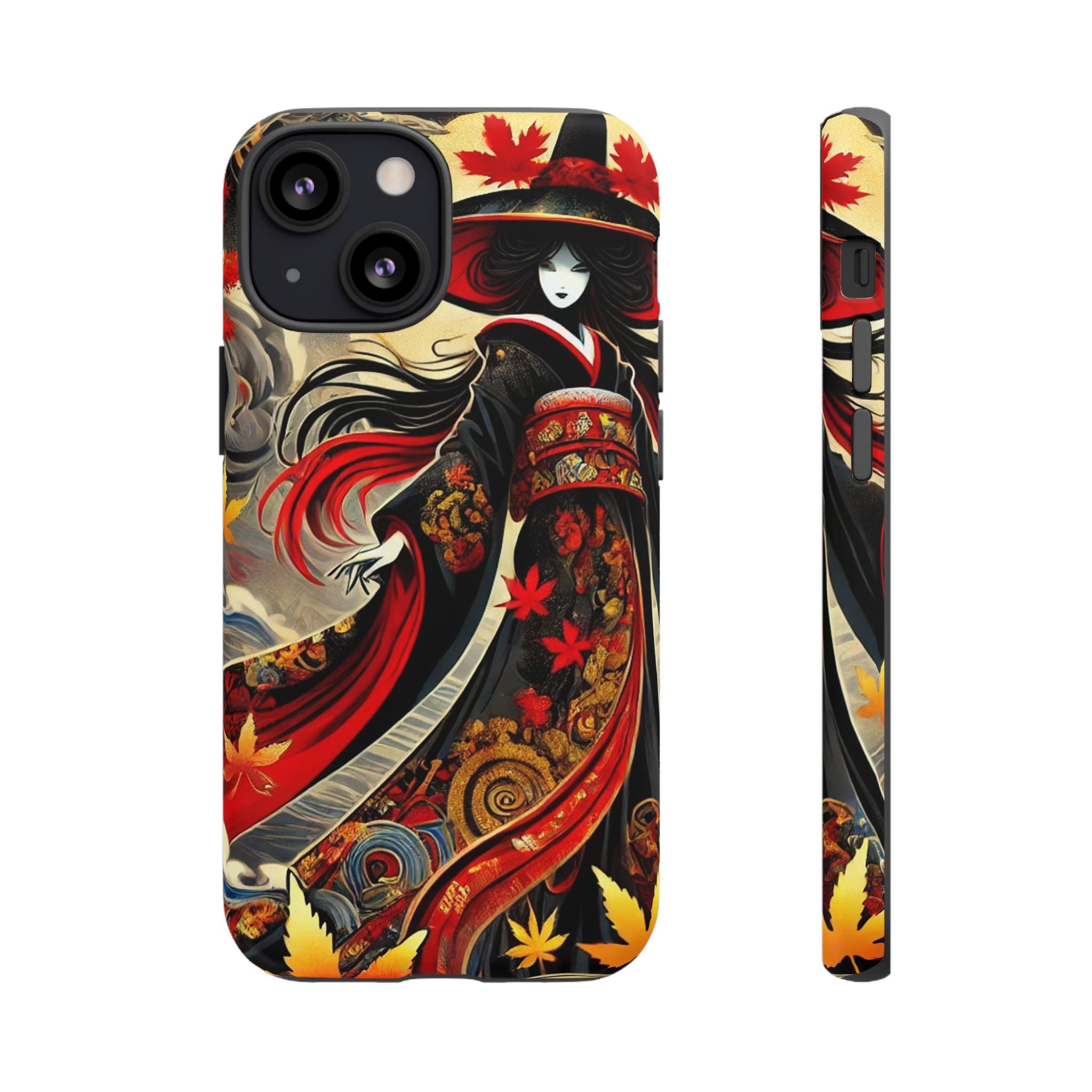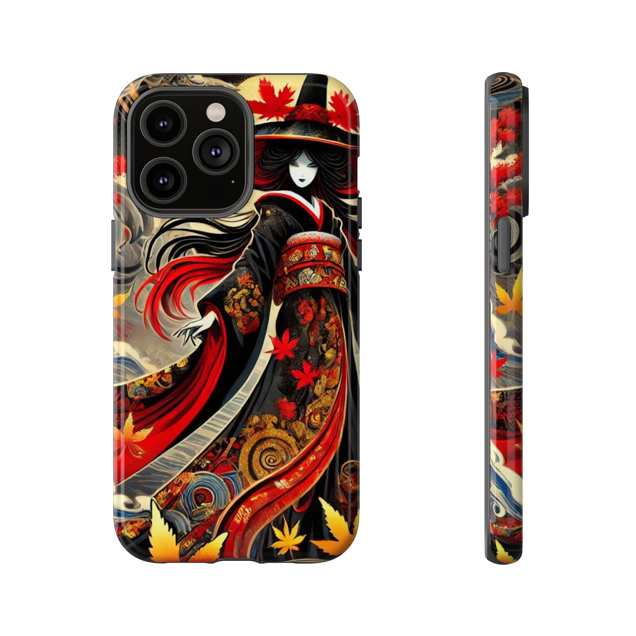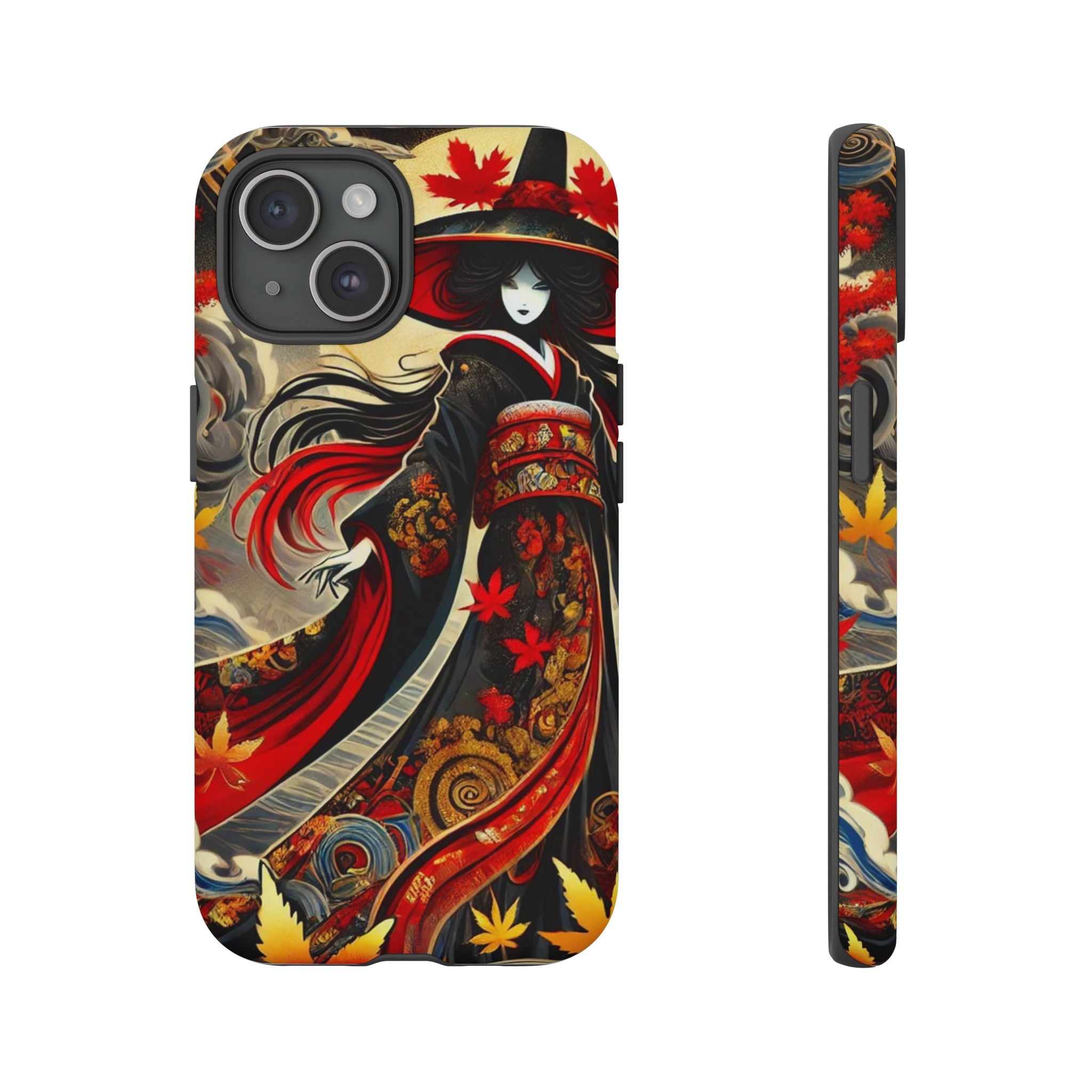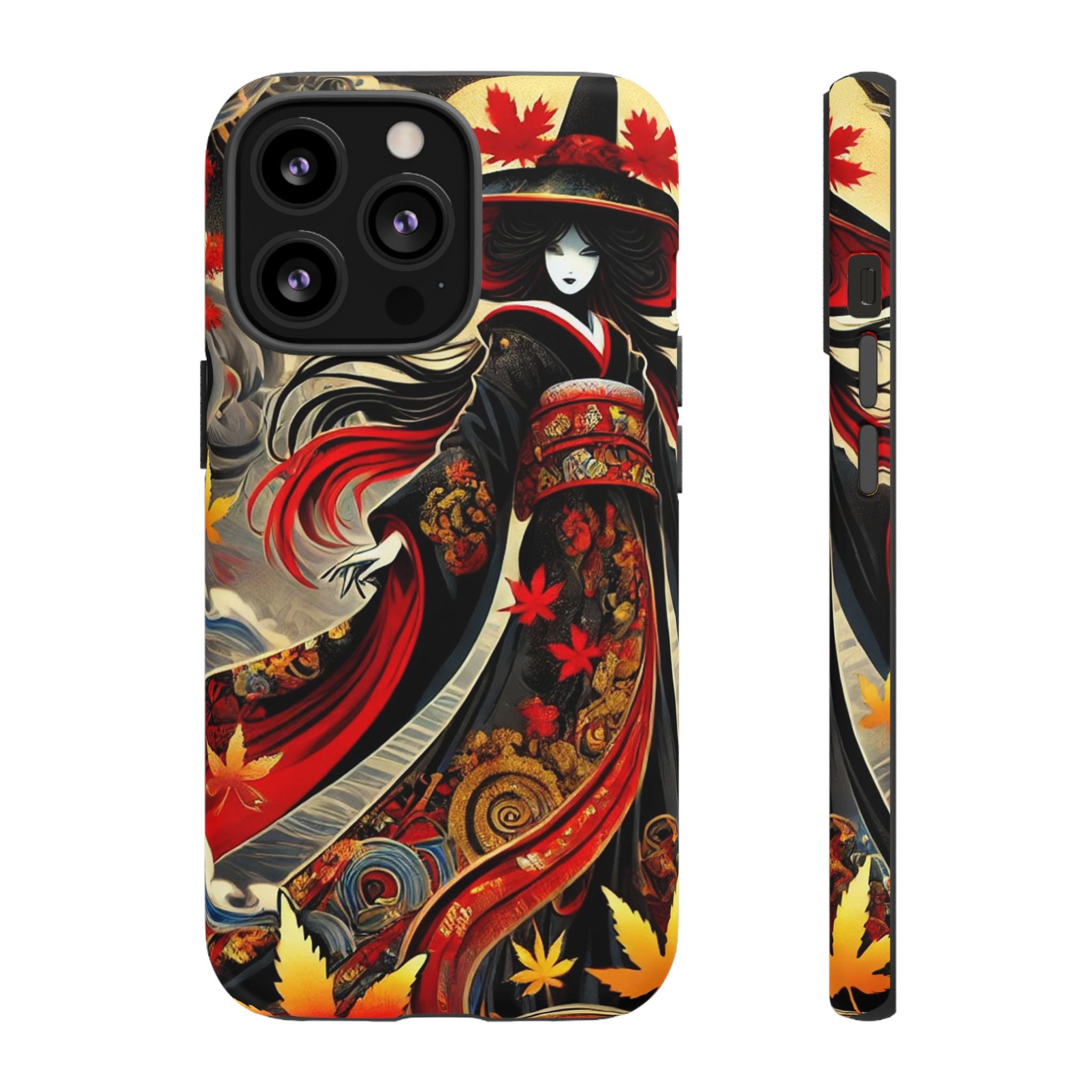 The case showcases a striking Kabuki-inspired witch in a towering red hat and flowing black kimono, detailed with golden storm clouds and fiery red maple leaves. Blending Japanese theater with Halloween mystique, it transforms everyday protection into a bold statement of art, fantasy, and elegance.