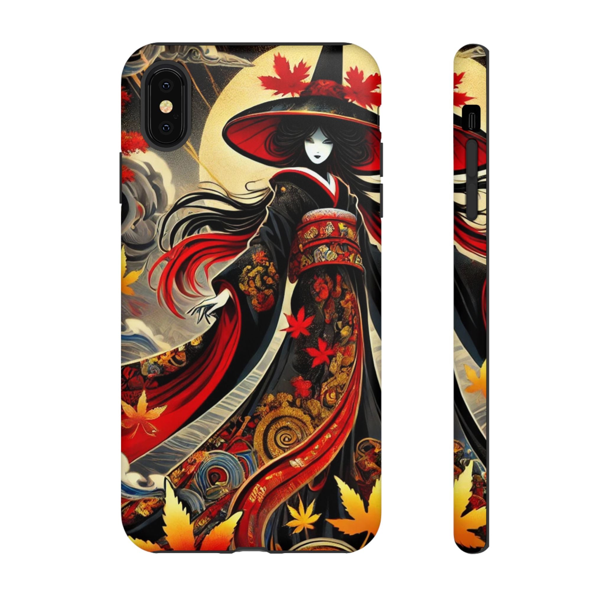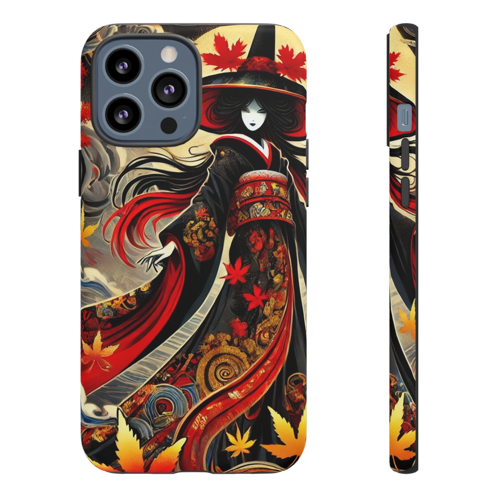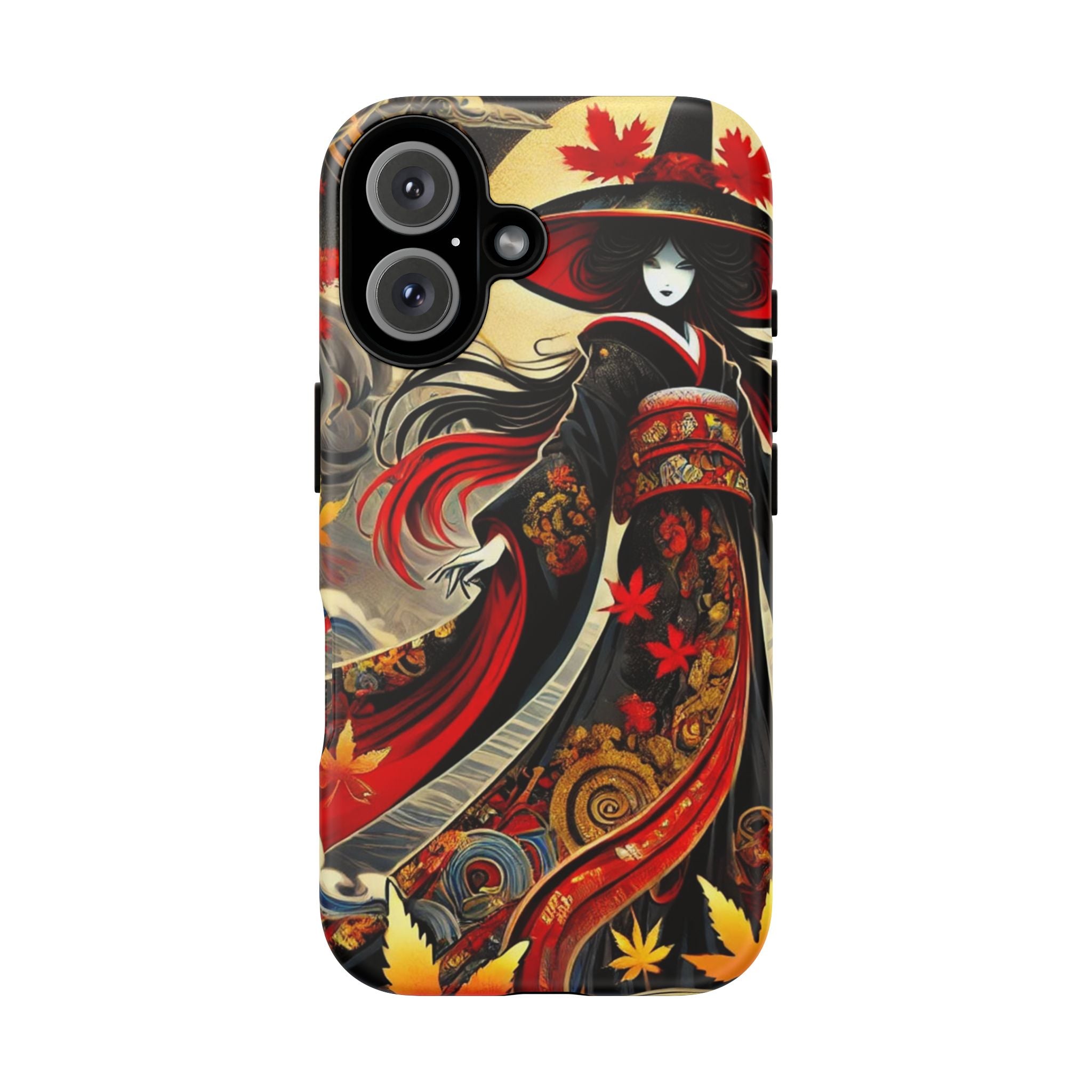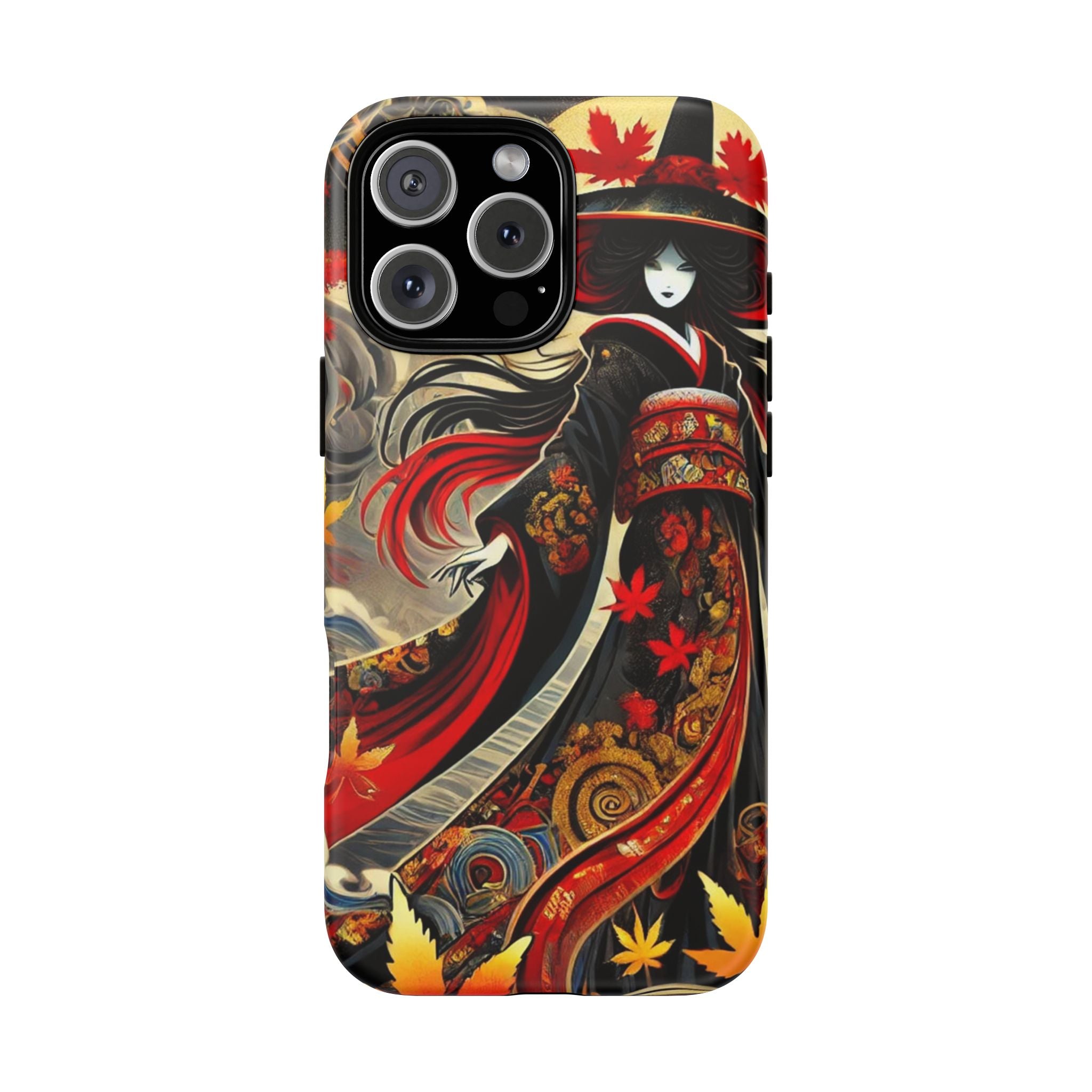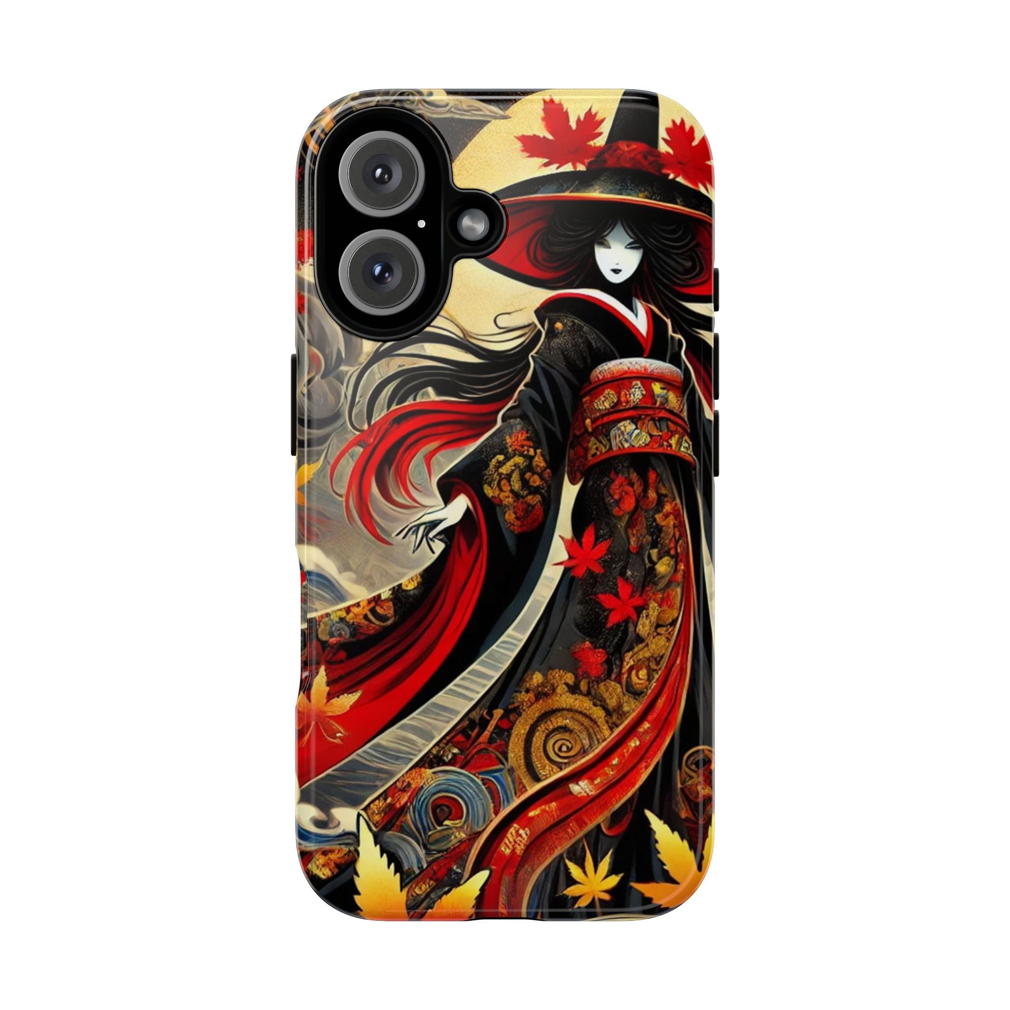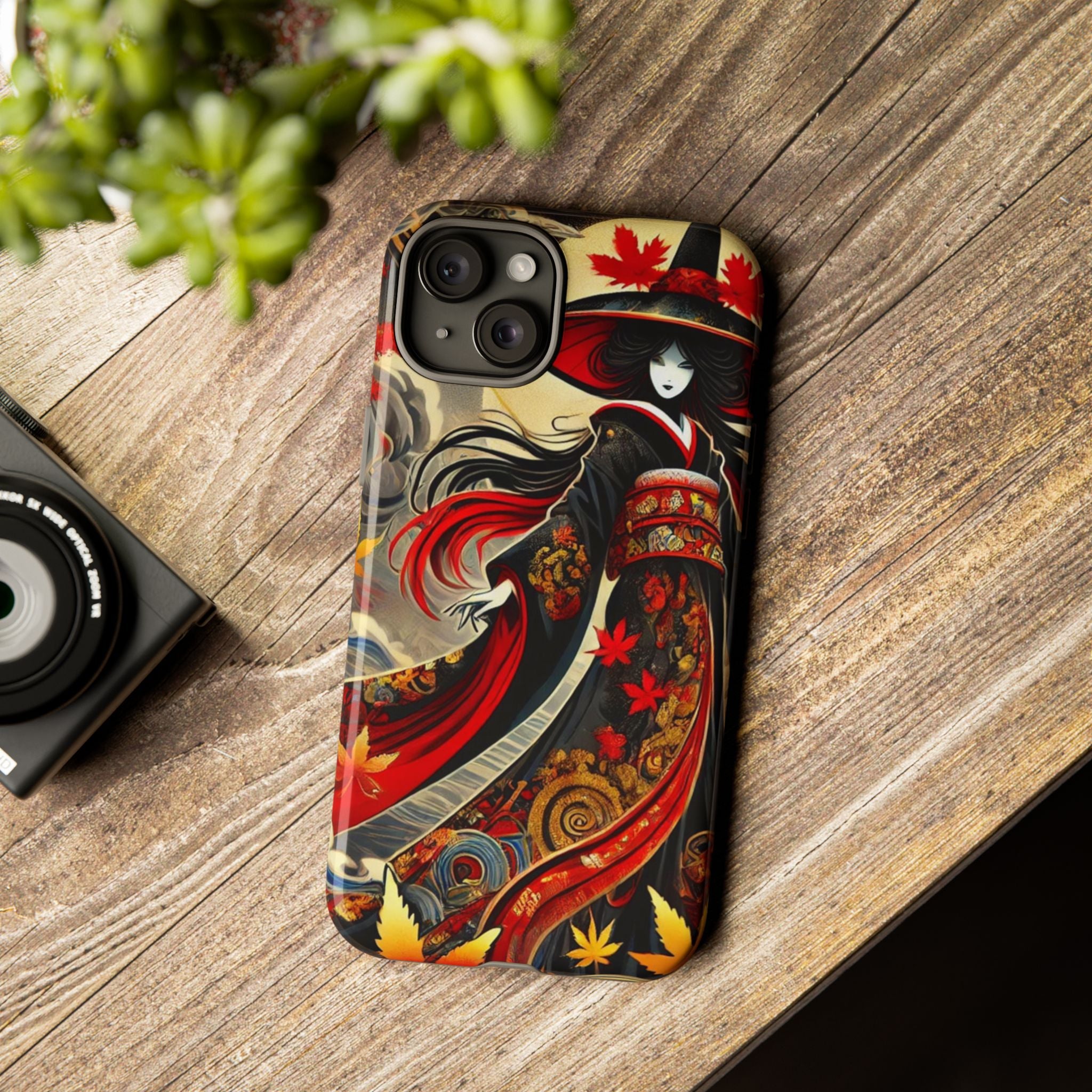 The case showcases a striking Kabuki-inspired witch in a towering red hat and flowing black kimono, detailed with golden storm clouds and fiery red maple leaves. Blending Japanese theater with Halloween mystique, it transforms everyday protection into a bold statement of art, fantasy, and elegance.