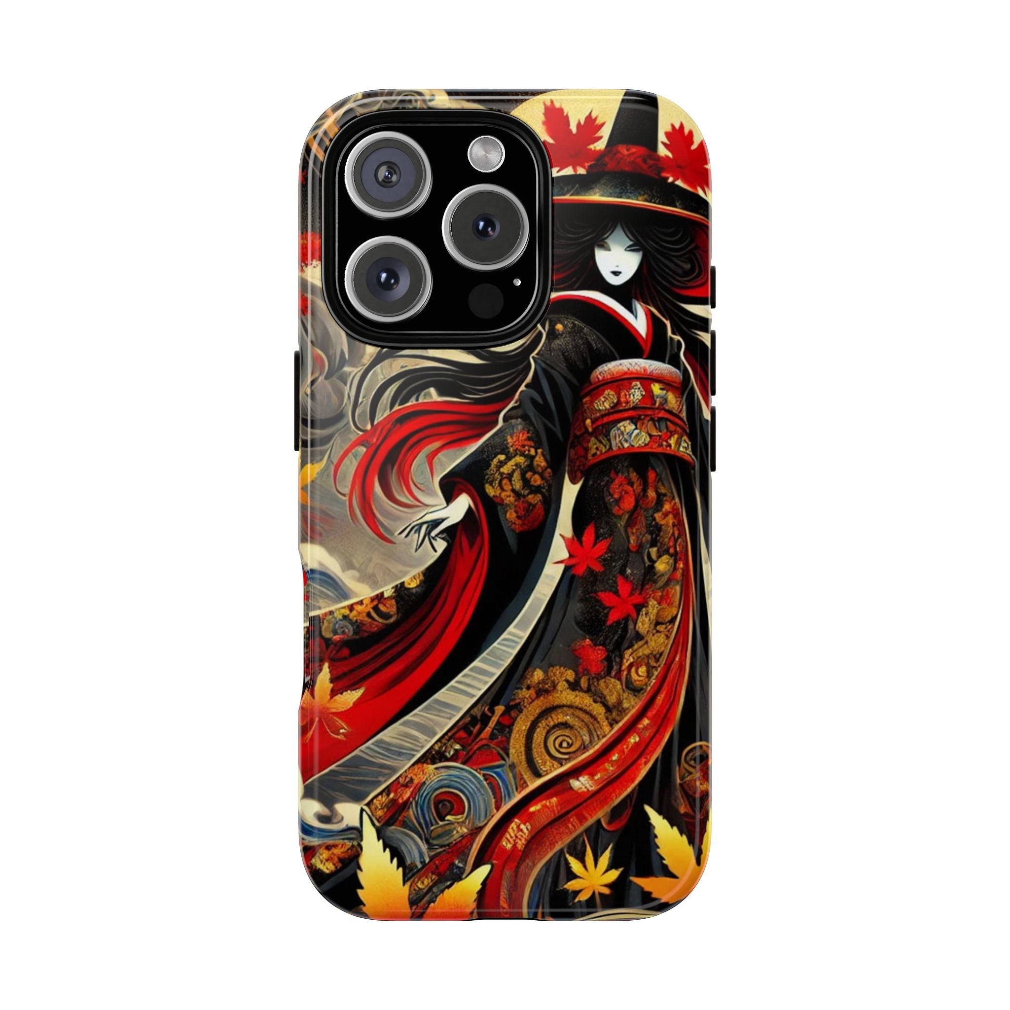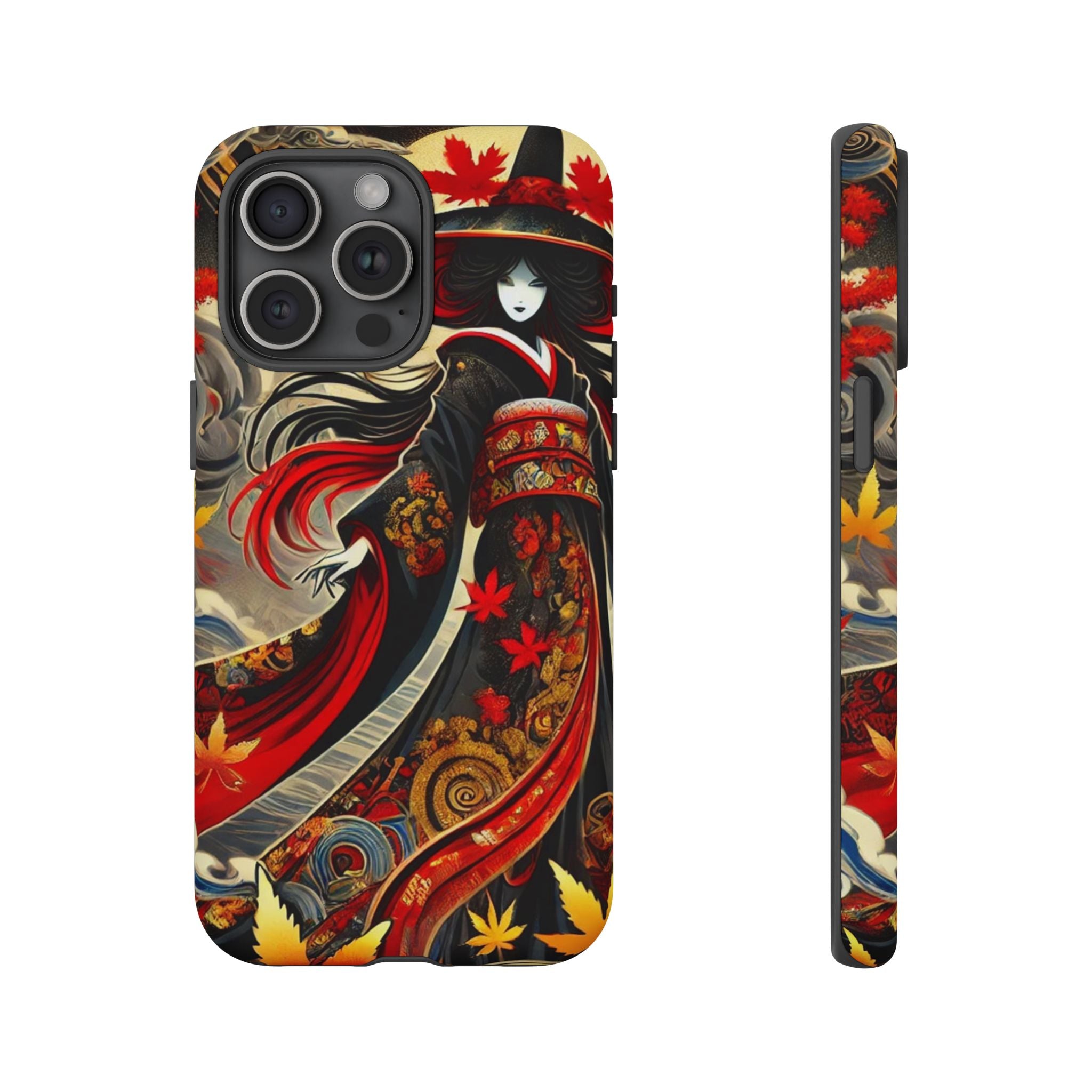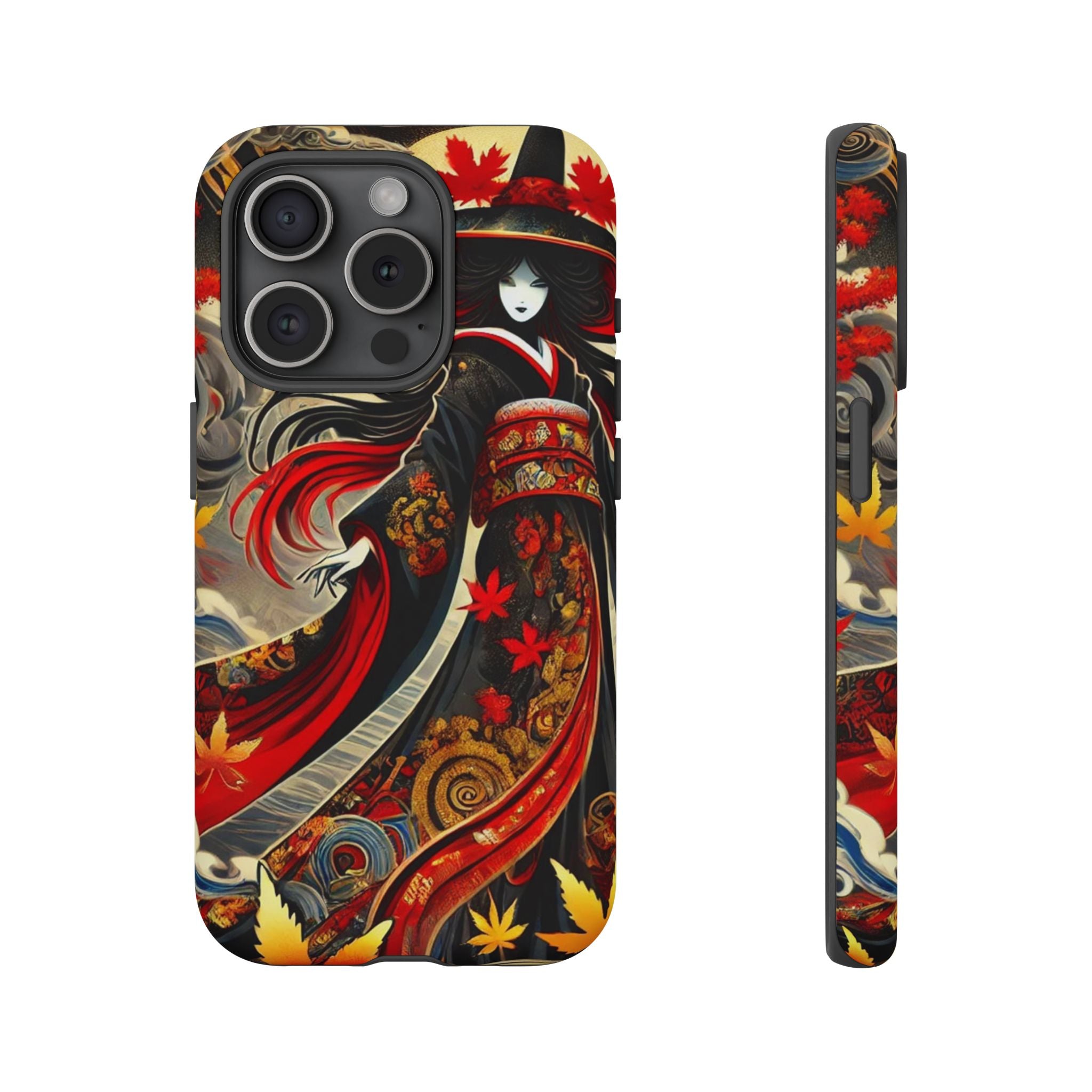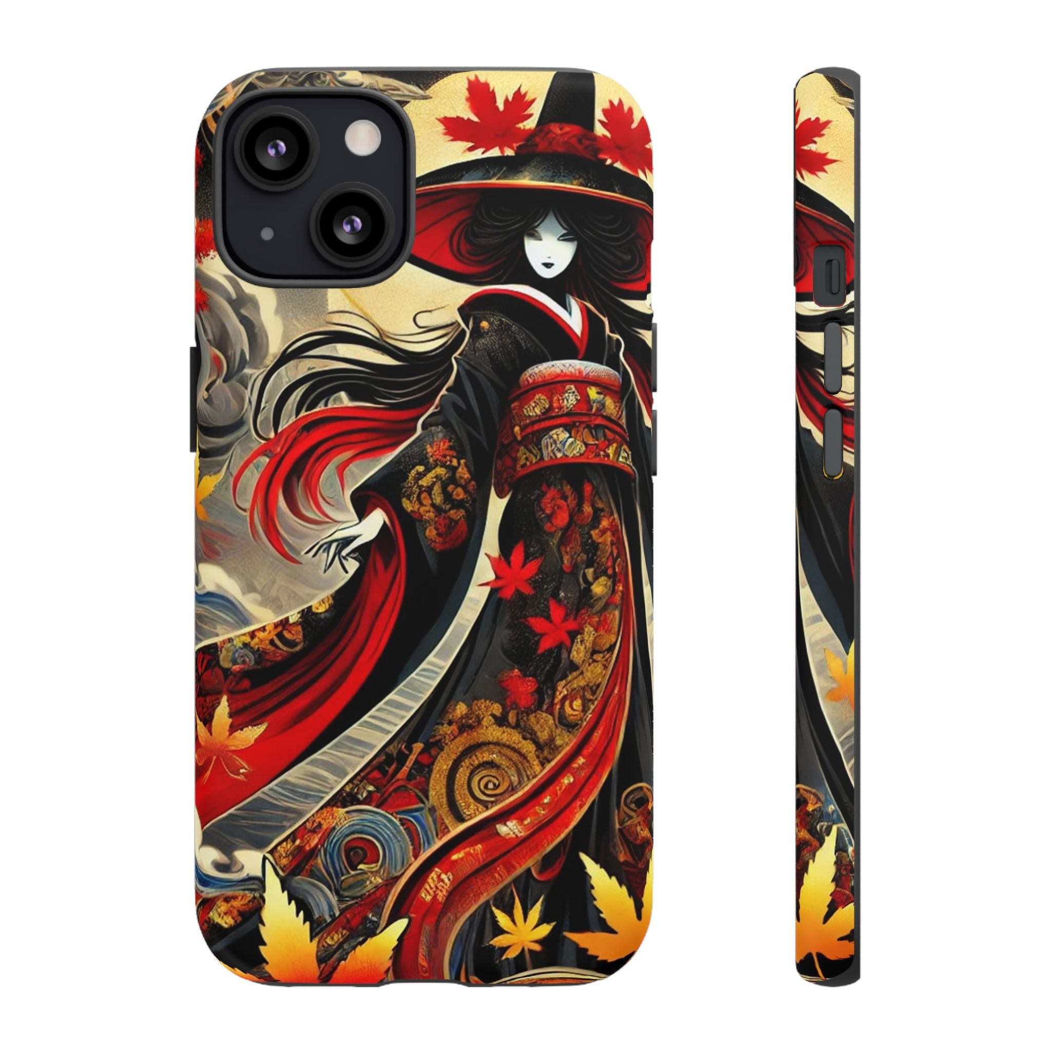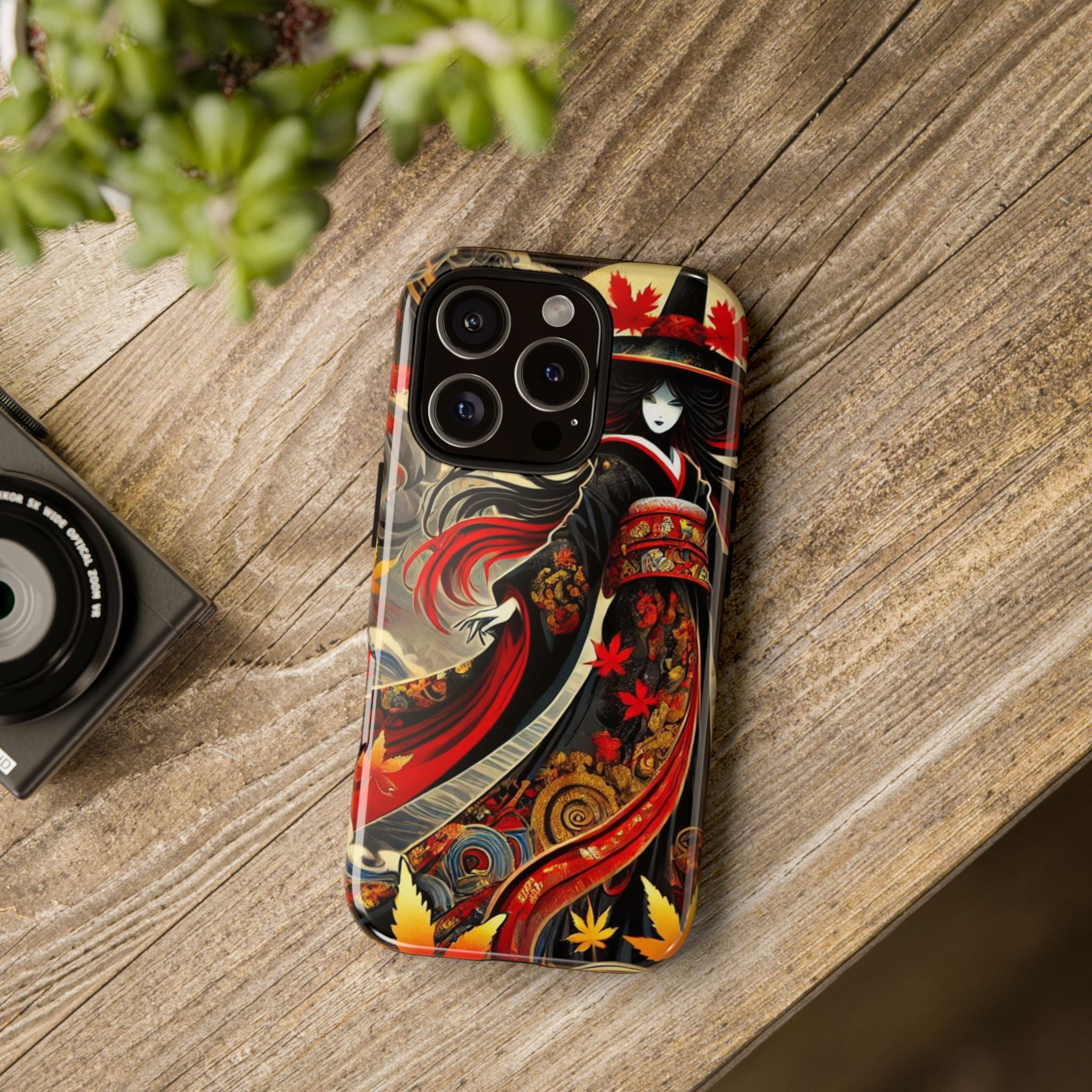 The case showcases a striking Kabuki-inspired witch in a towering red hat and flowing black kimono, detailed with golden storm clouds and fiery red maple leaves. Blending Japanese theater with Halloween mystique, it transforms everyday protection into a bold statement of art, fantasy, and elegance.