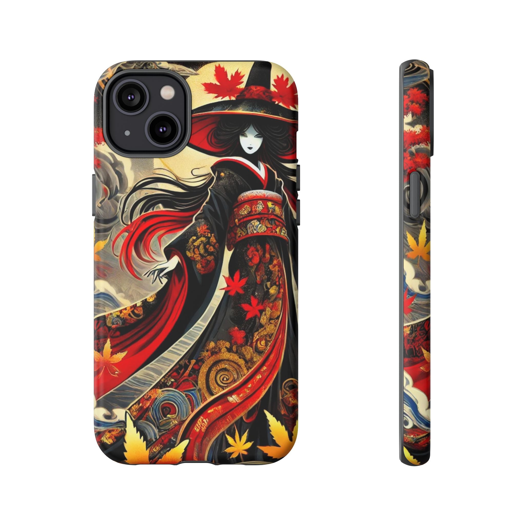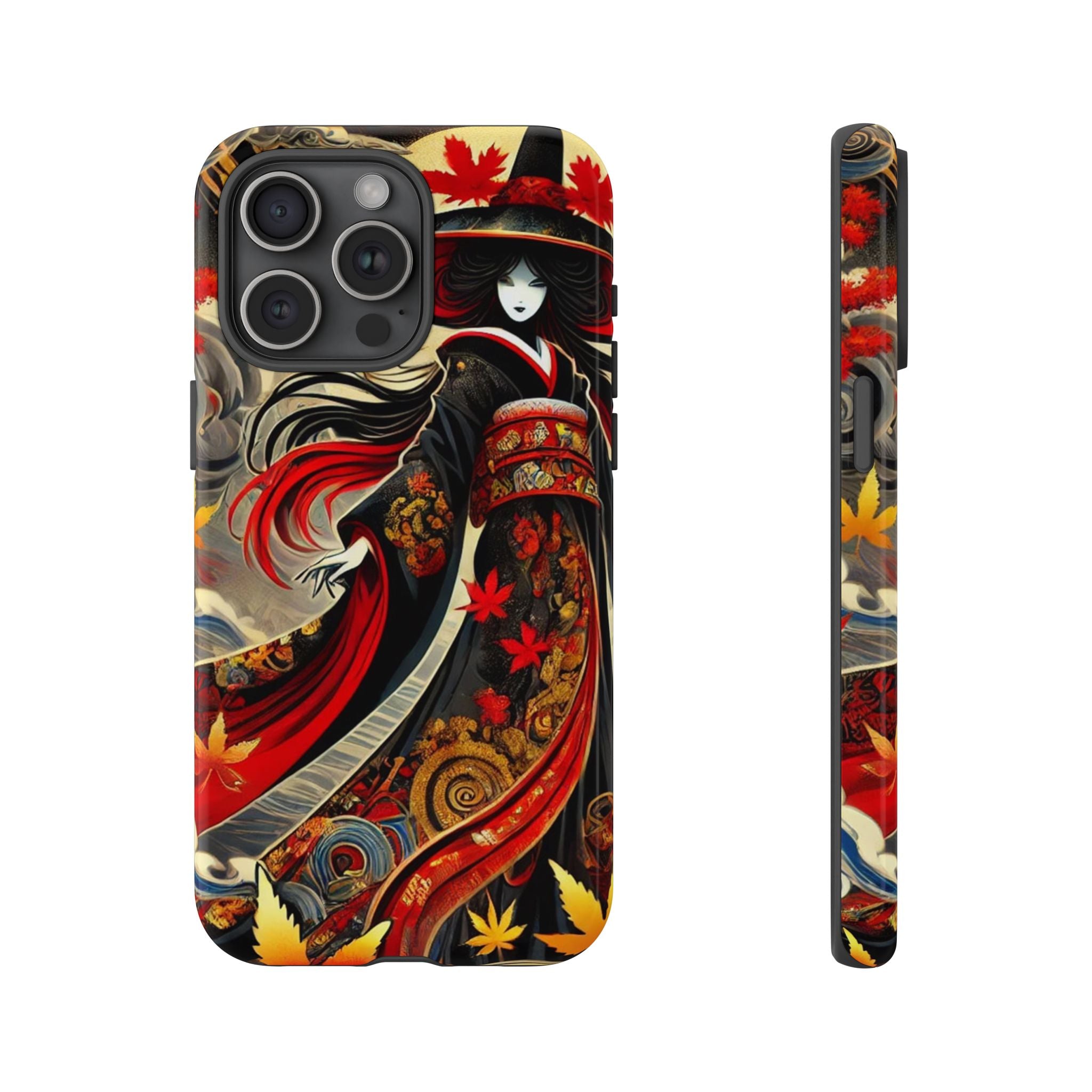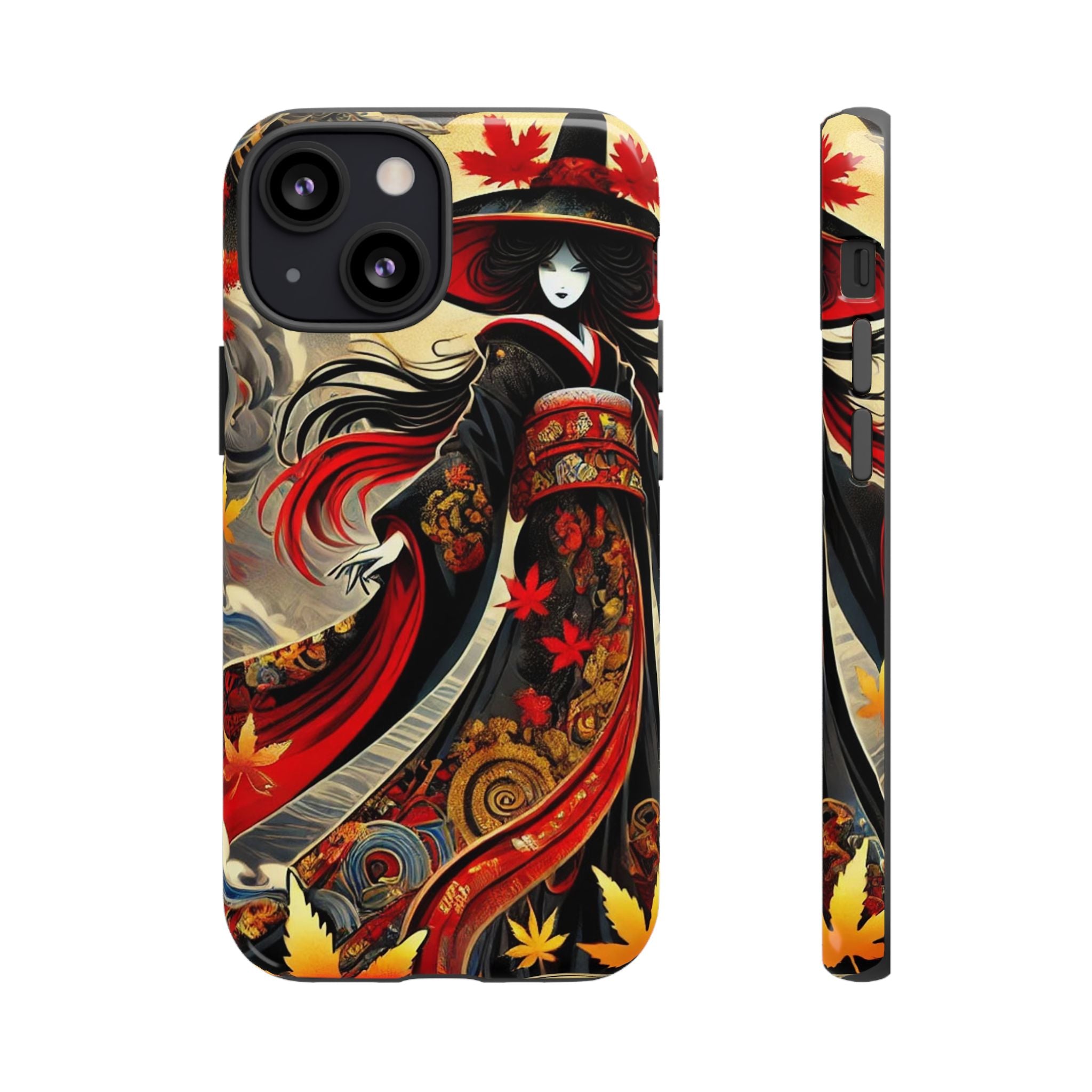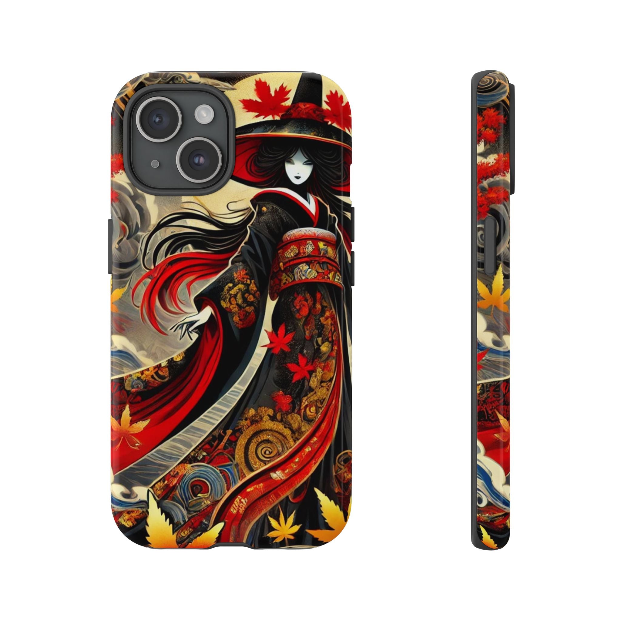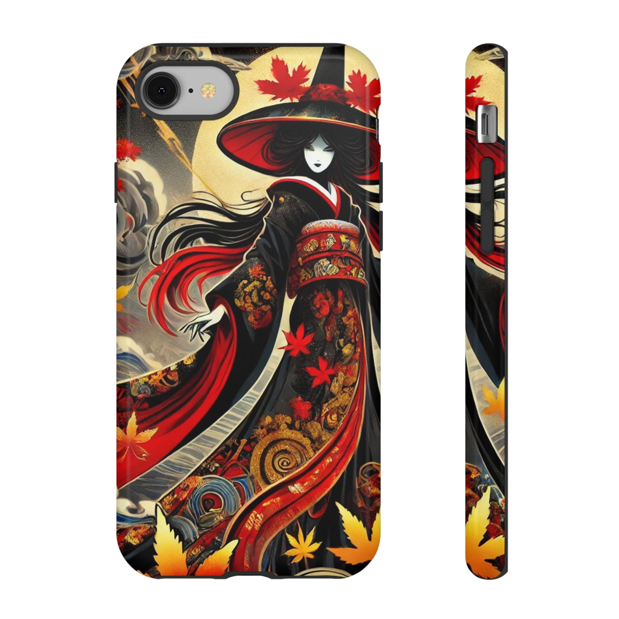 The case showcases a striking Kabuki-inspired witch in a towering red hat and flowing black kimono, detailed with golden storm clouds and fiery red maple leaves. Blending Japanese theater with Halloween mystique, it transforms everyday protection into a bold statement of art, fantasy, and elegance.