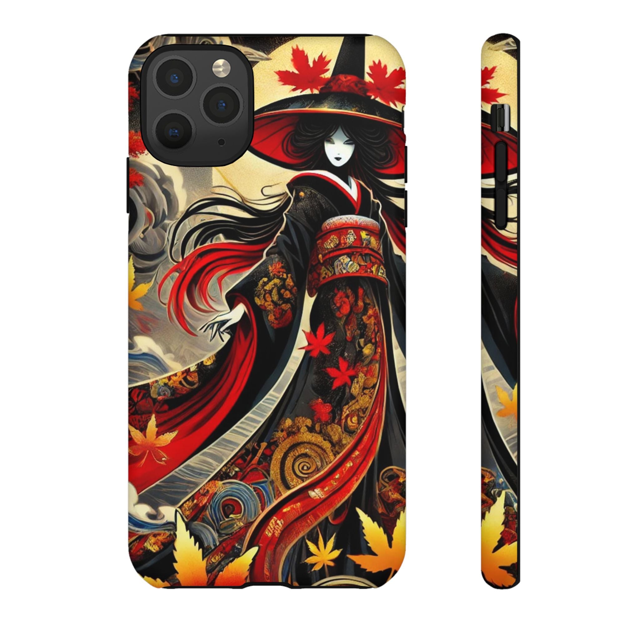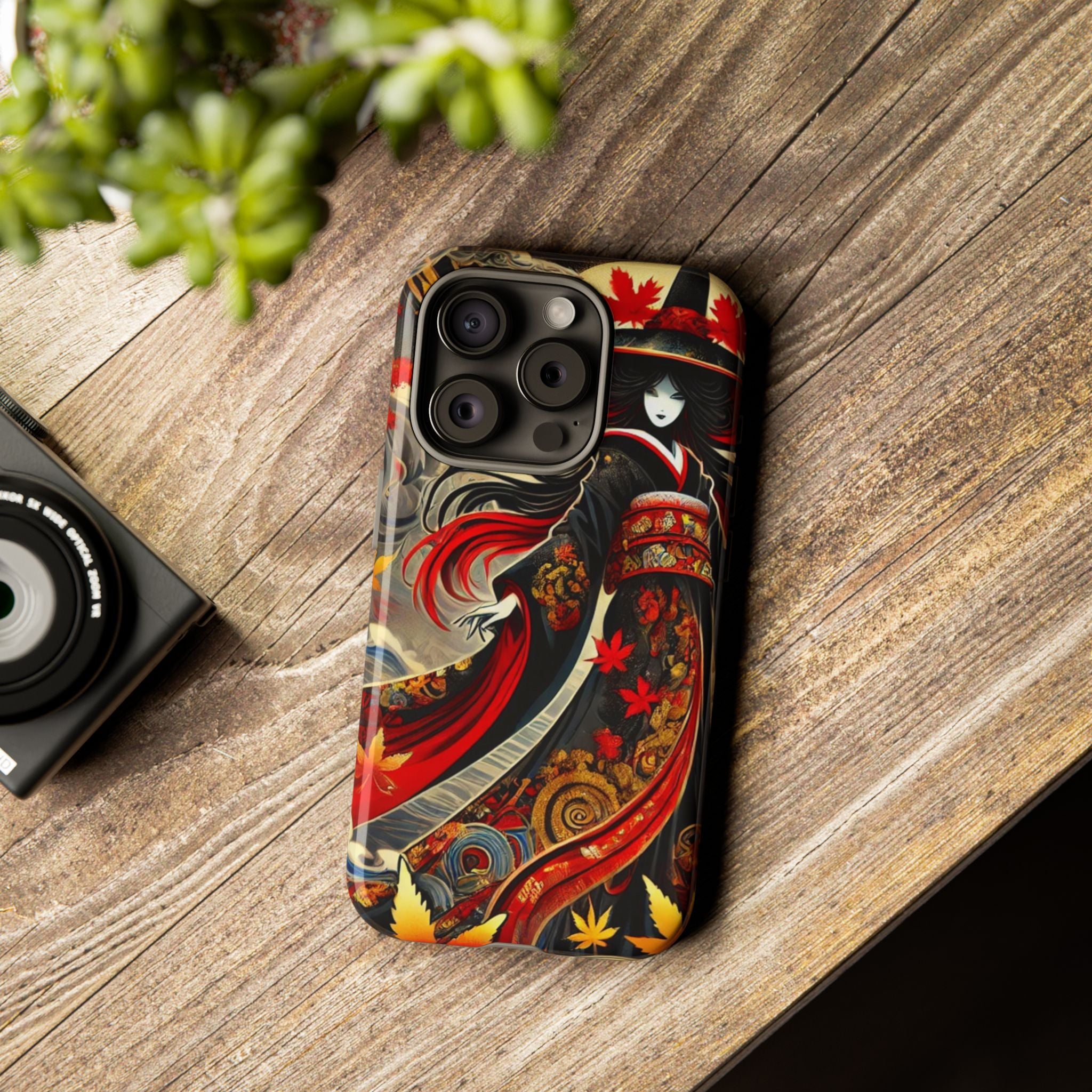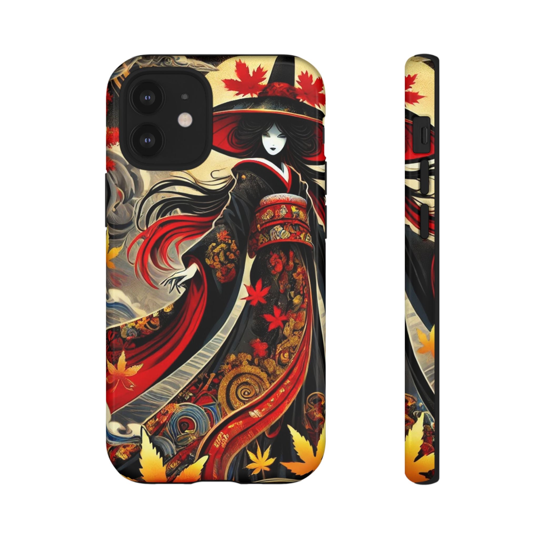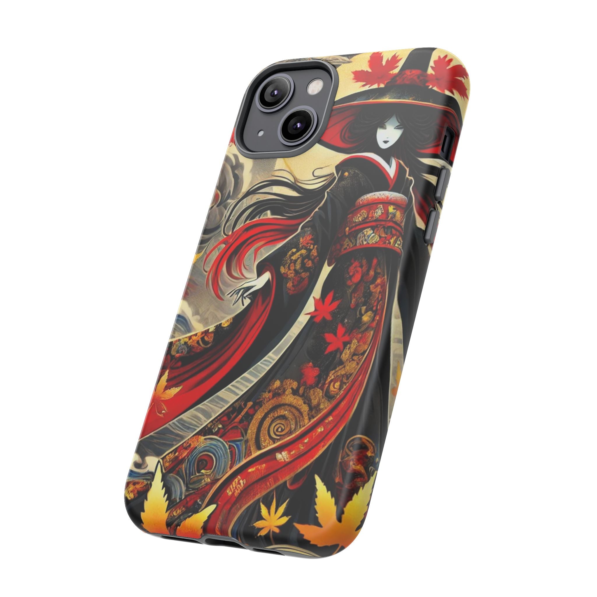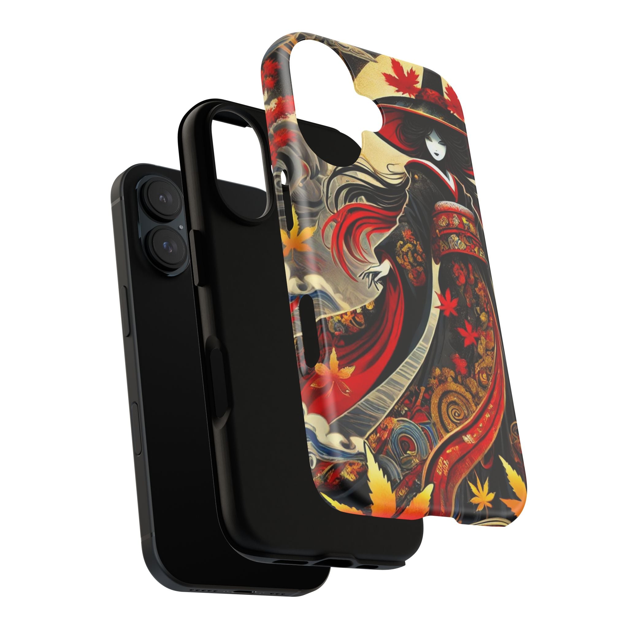 The case showcases a striking Kabuki-inspired witch in a towering red hat and flowing black kimono, detailed with golden storm clouds and fiery red maple leaves. Blending Japanese theater with Halloween mystique, it transforms everyday protection into a bold statement of art, fantasy, and elegance.