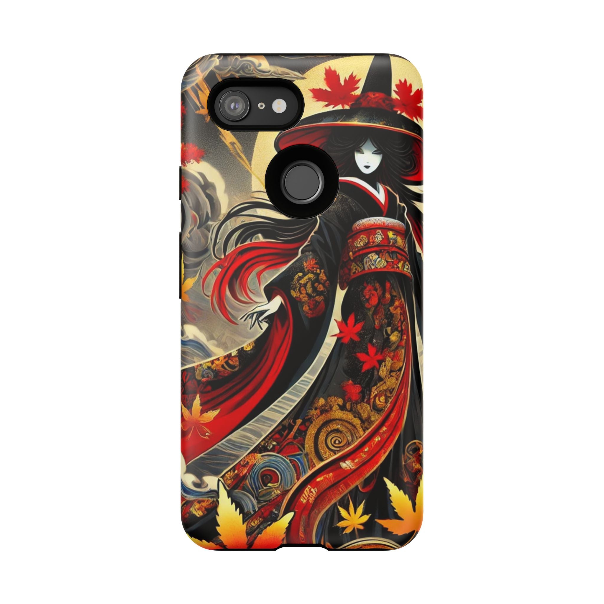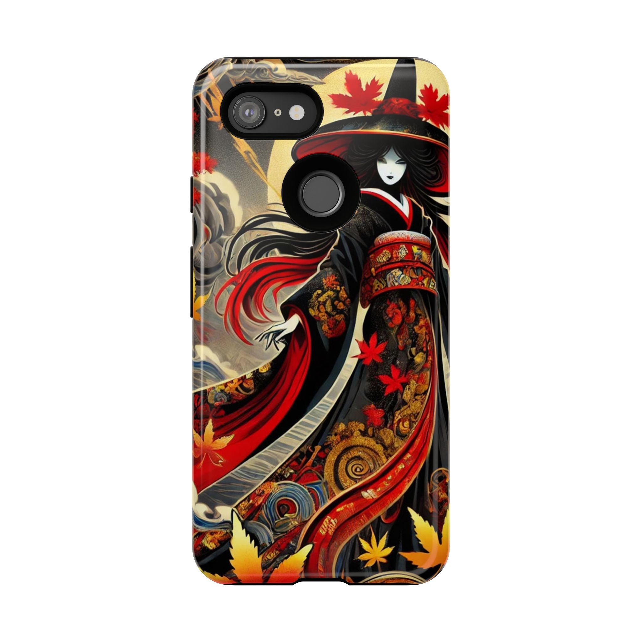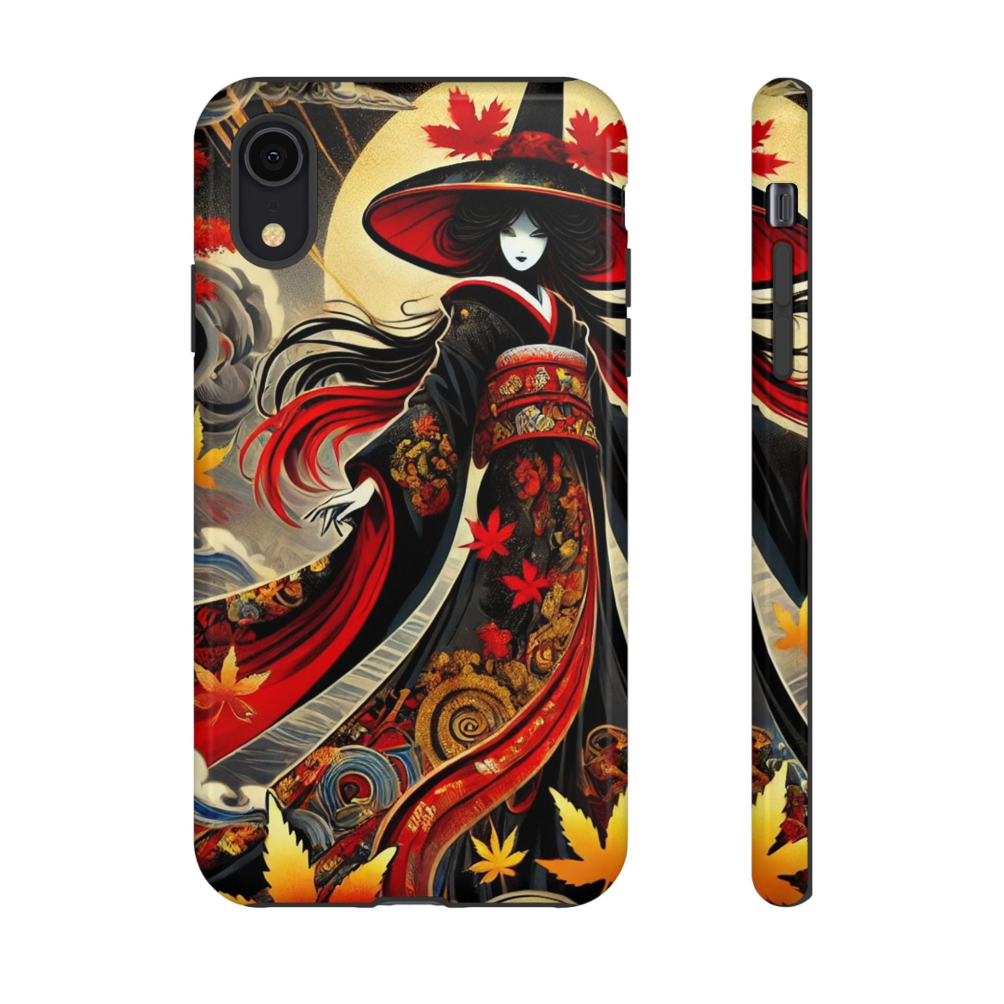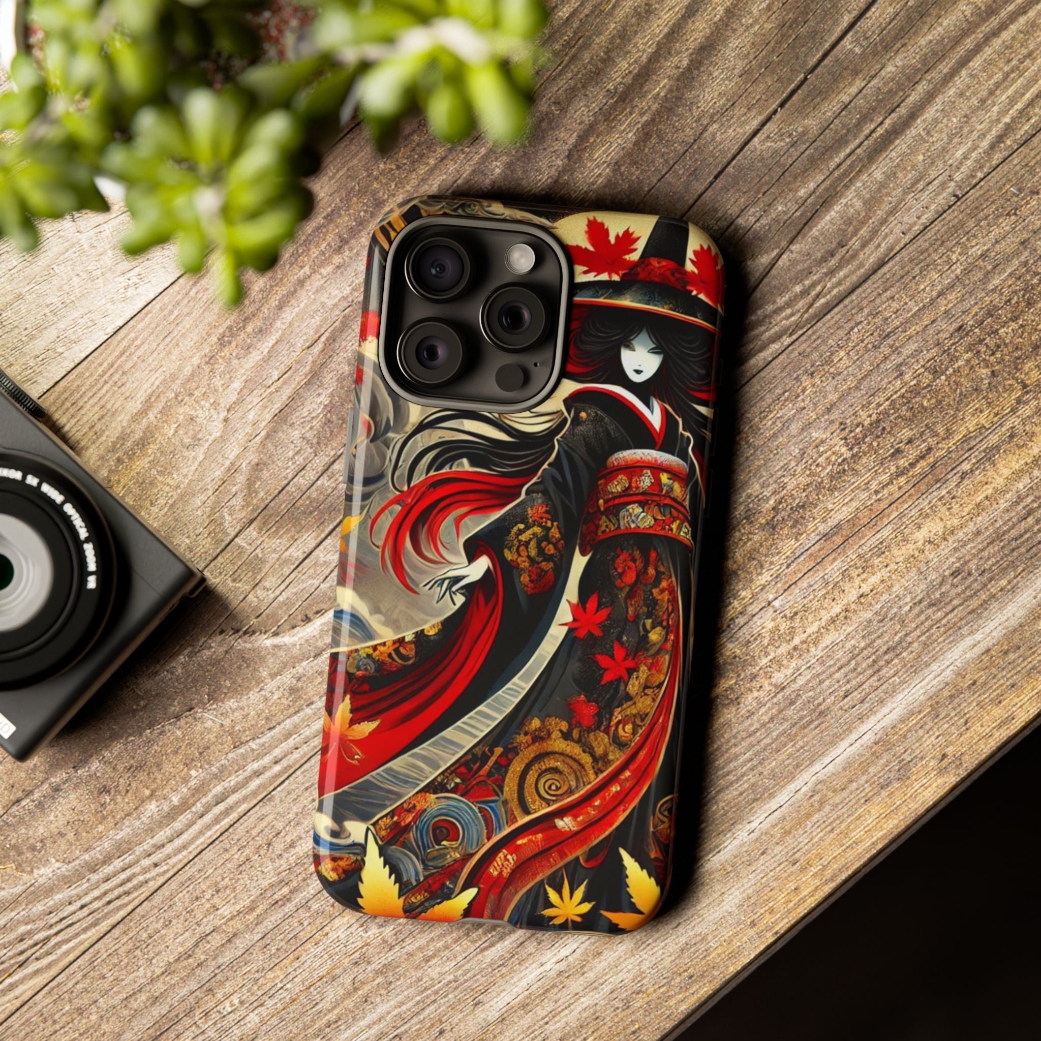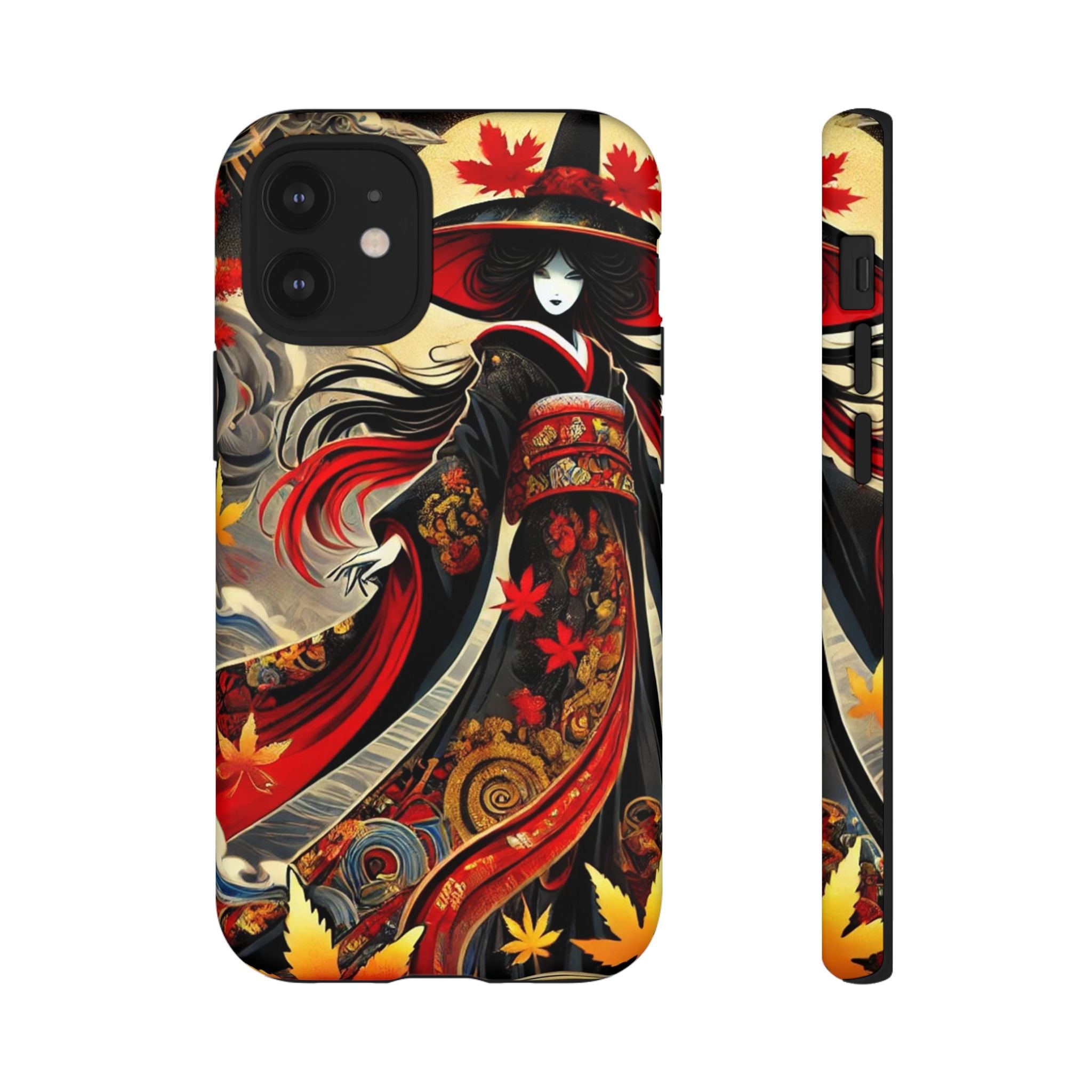 The case showcases a striking Kabuki-inspired witch in a towering red hat and flowing black kimono, detailed with golden storm clouds and fiery red maple leaves. Blending Japanese theater with Halloween mystique, it transforms everyday protection into a bold statement of art, fantasy, and elegance.