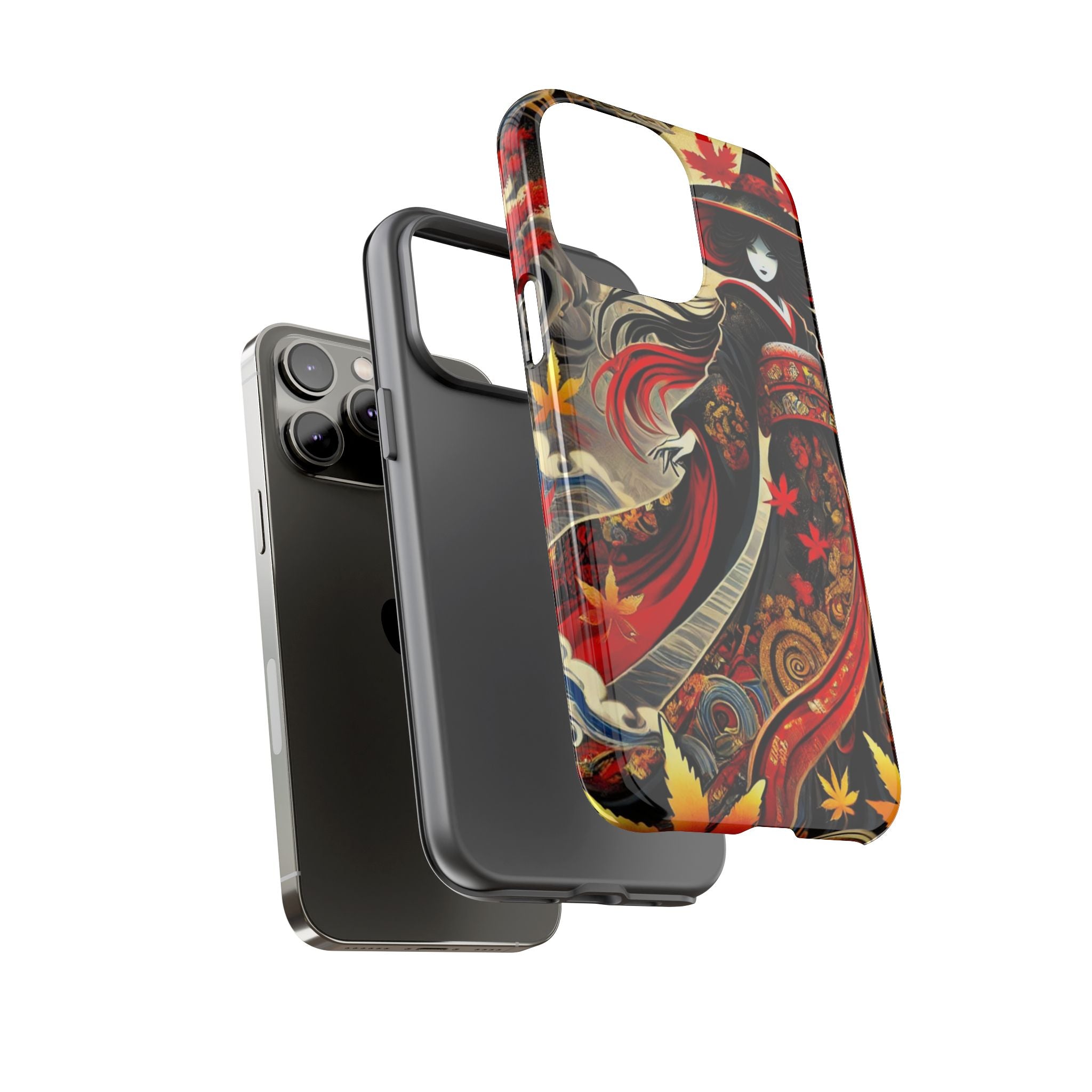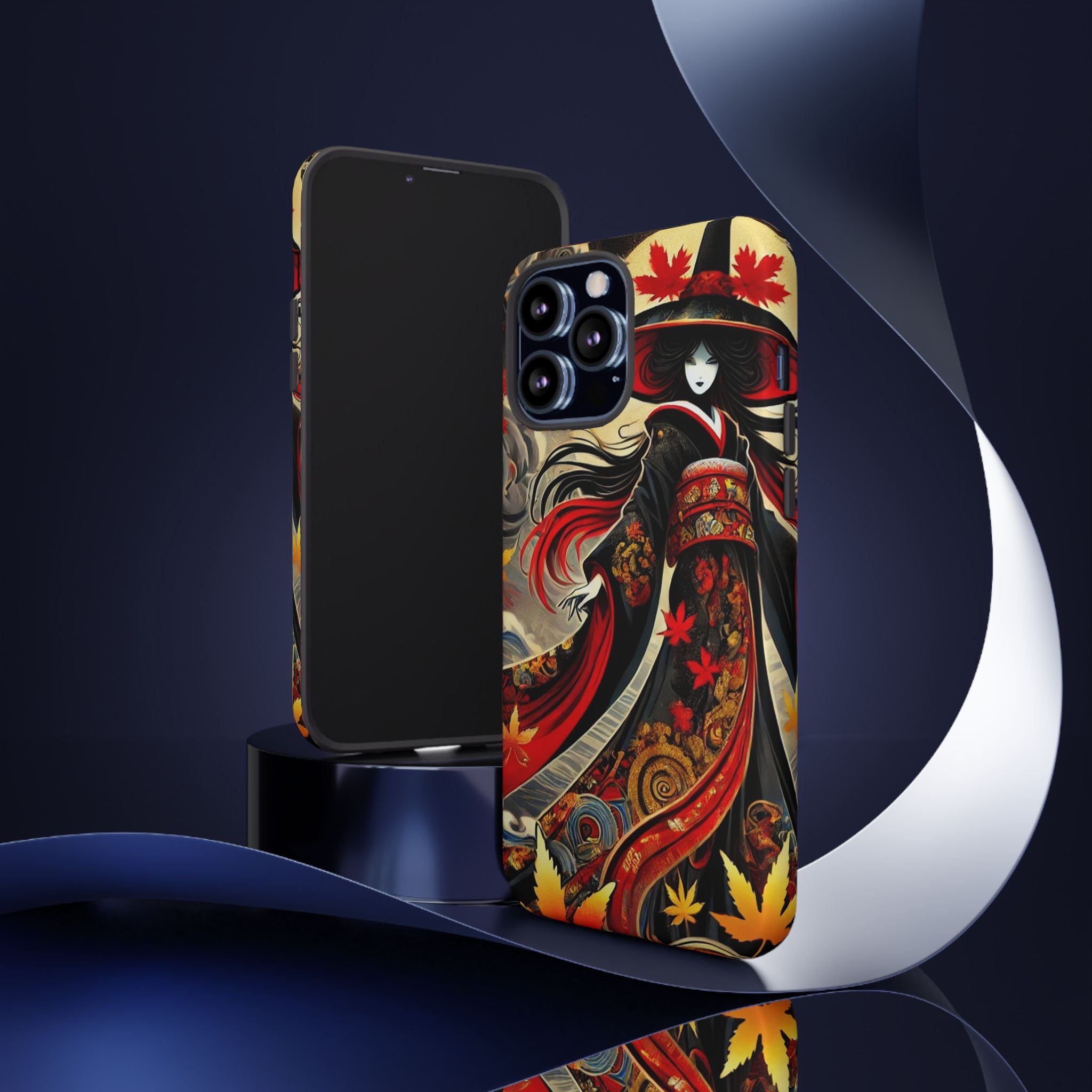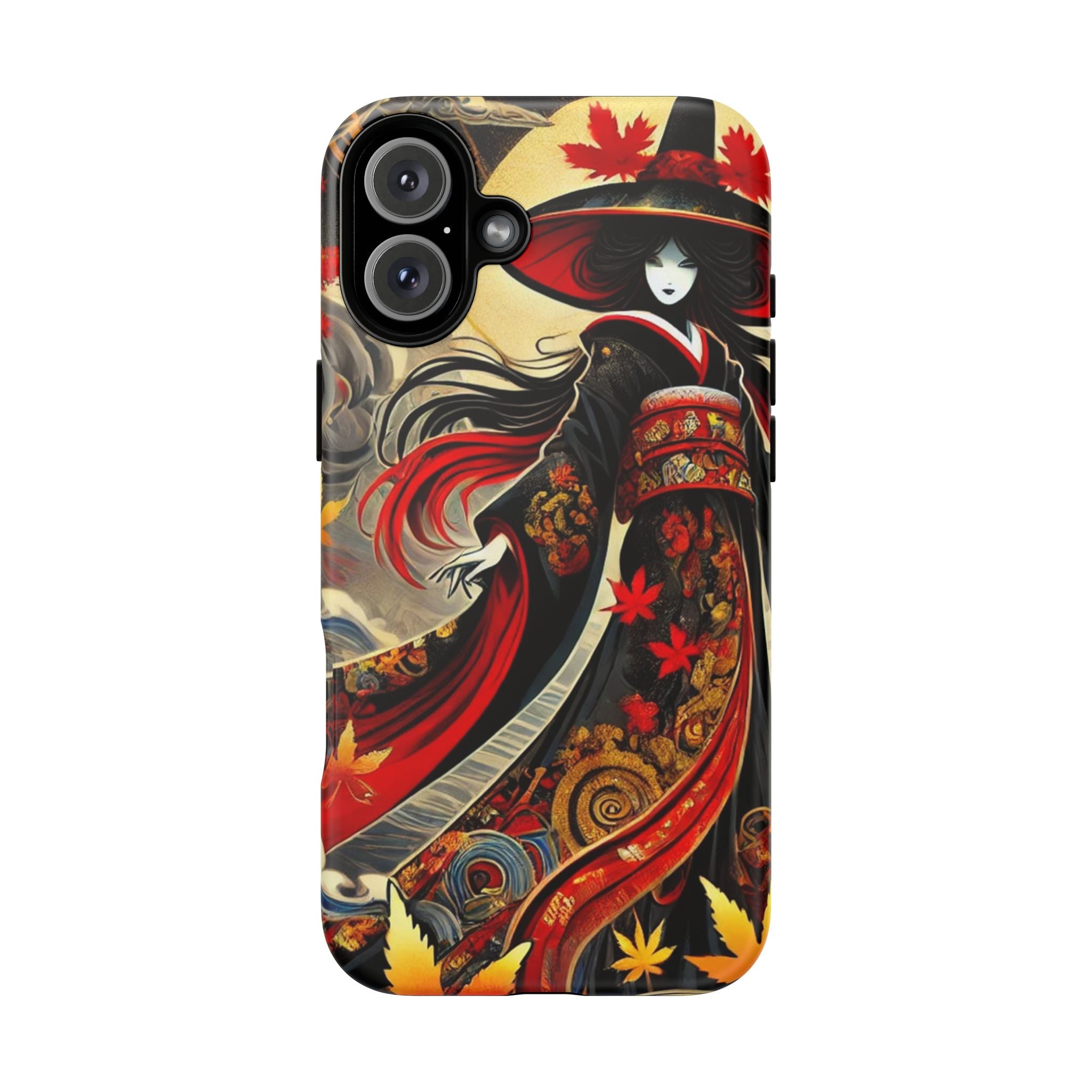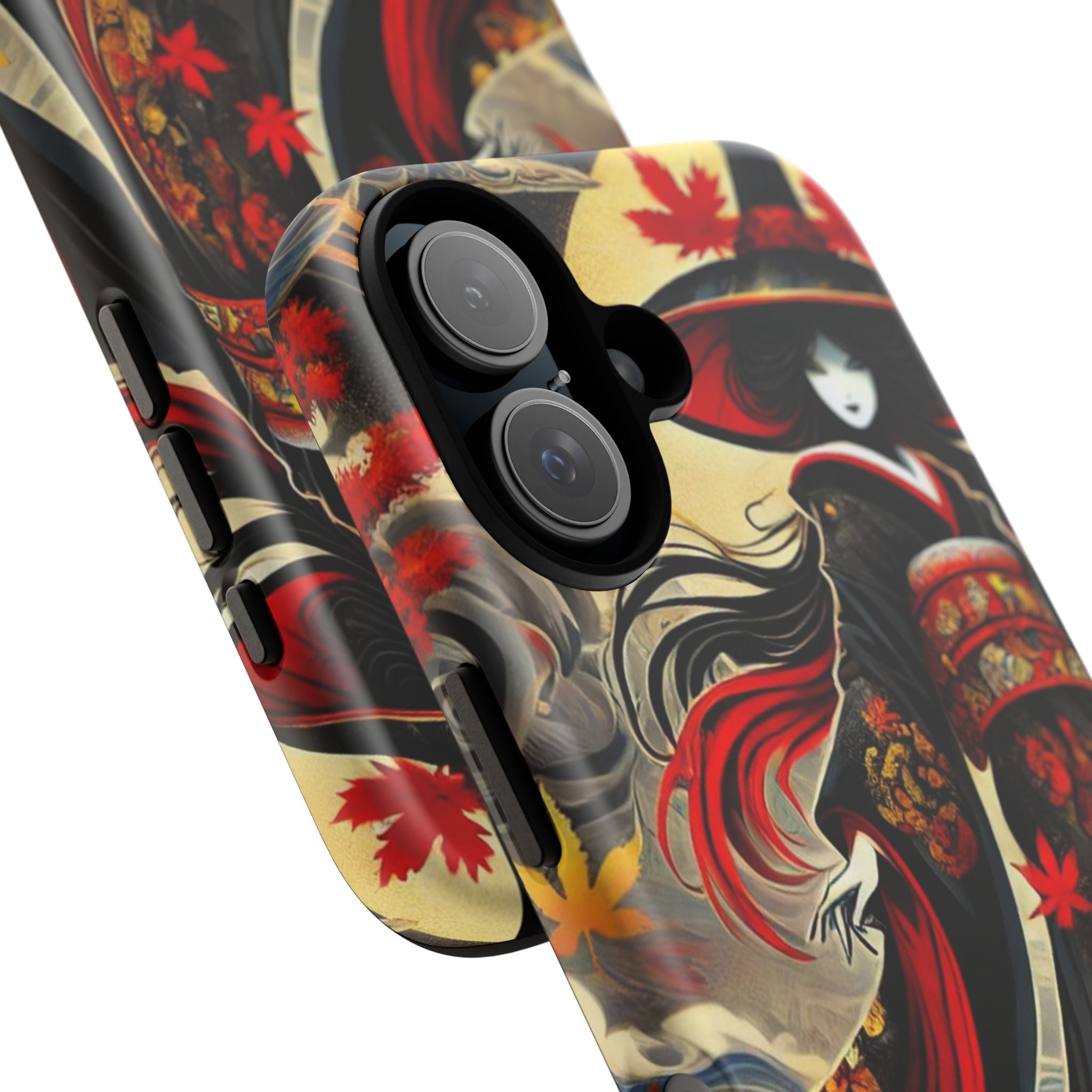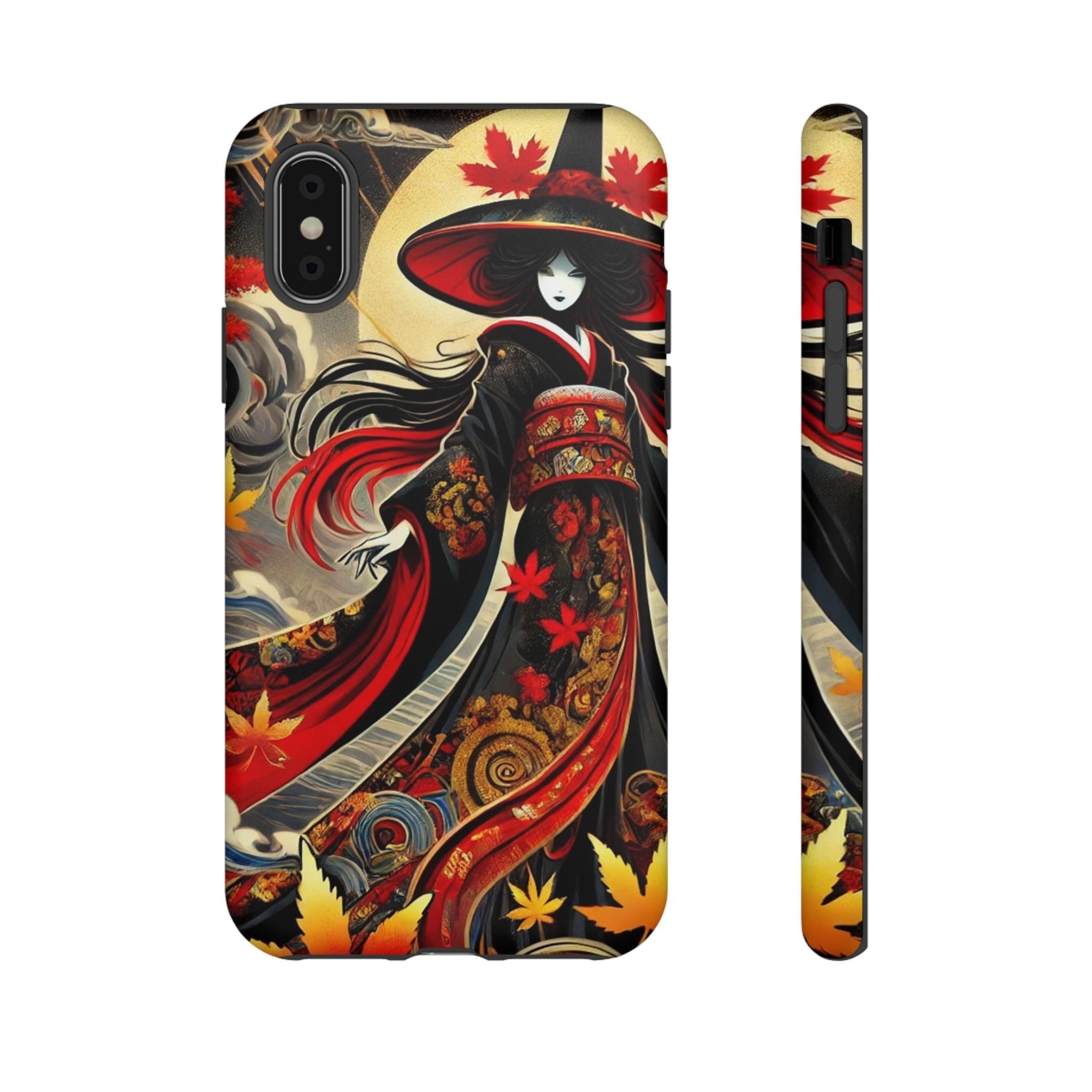 The case showcases a striking Kabuki-inspired witch in a towering red hat and flowing black kimono, detailed with golden storm clouds and fiery red maple leaves. Blending Japanese theater with Halloween mystique, it transforms everyday protection into a bold statement of art, fantasy, and elegance.