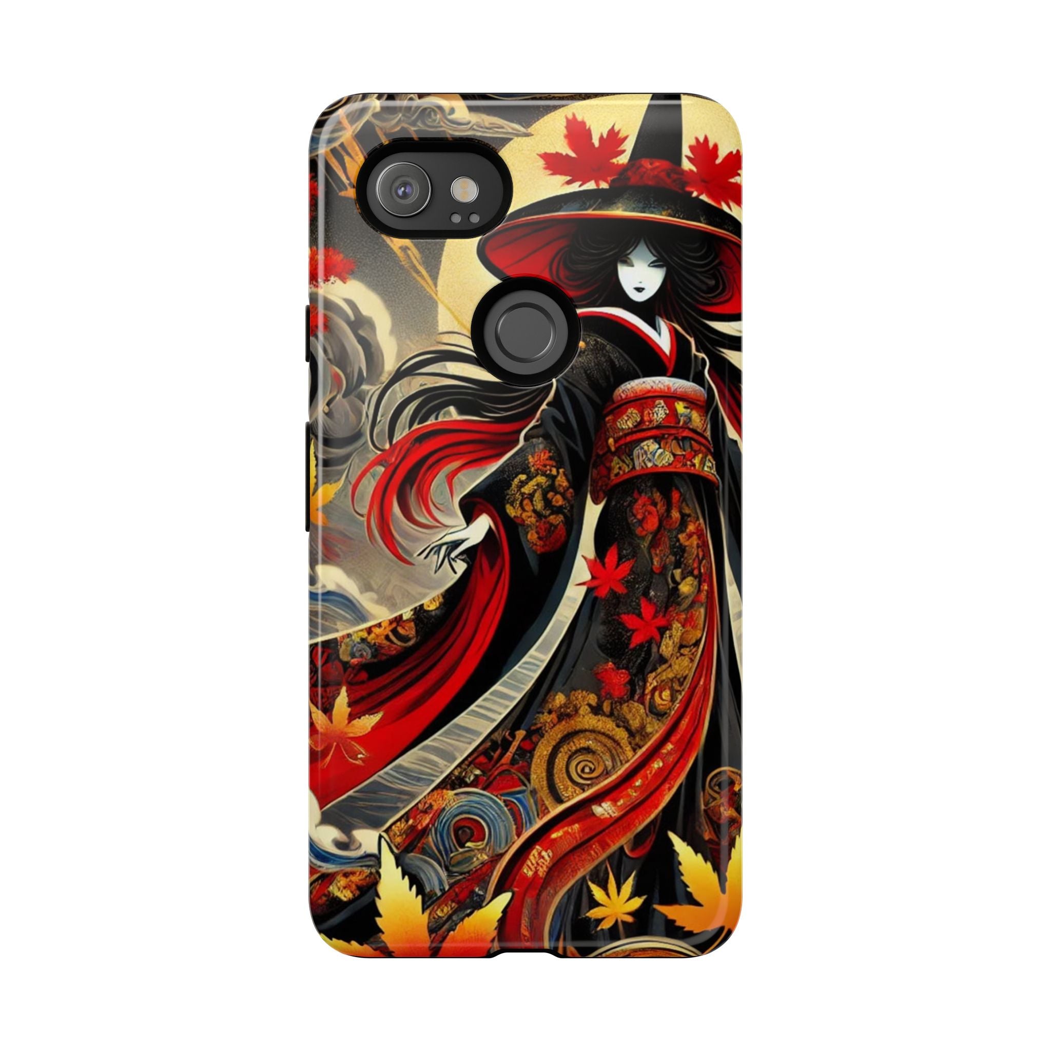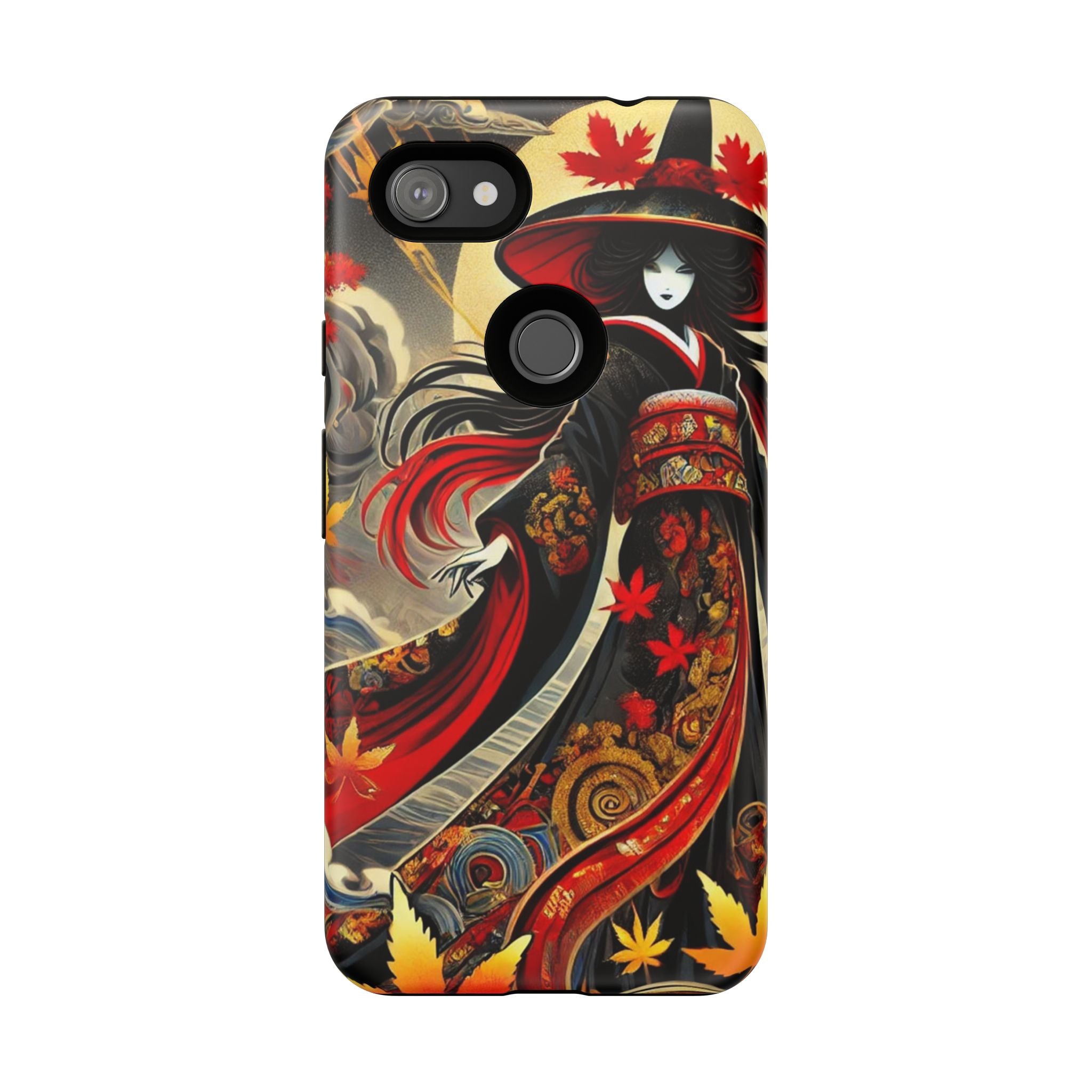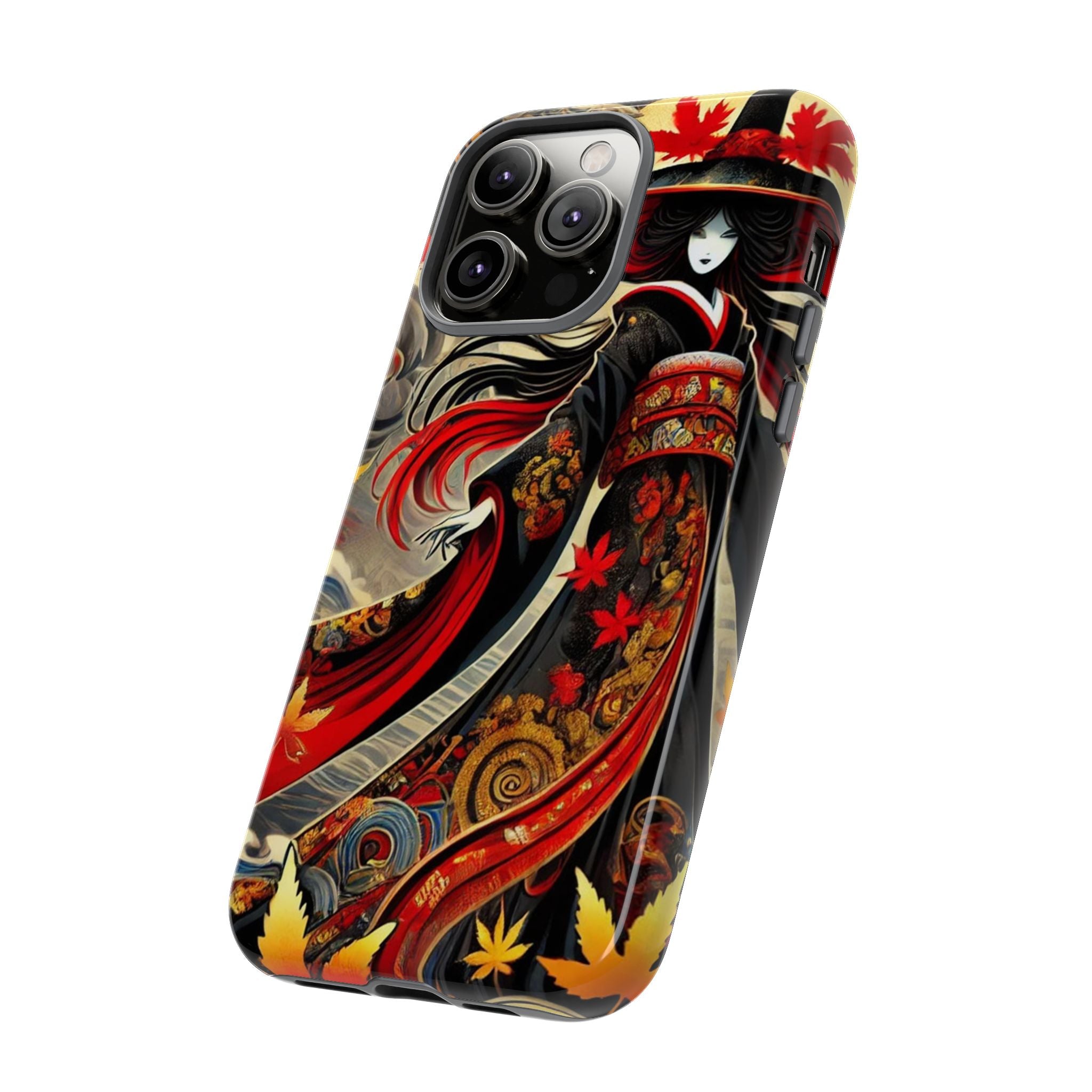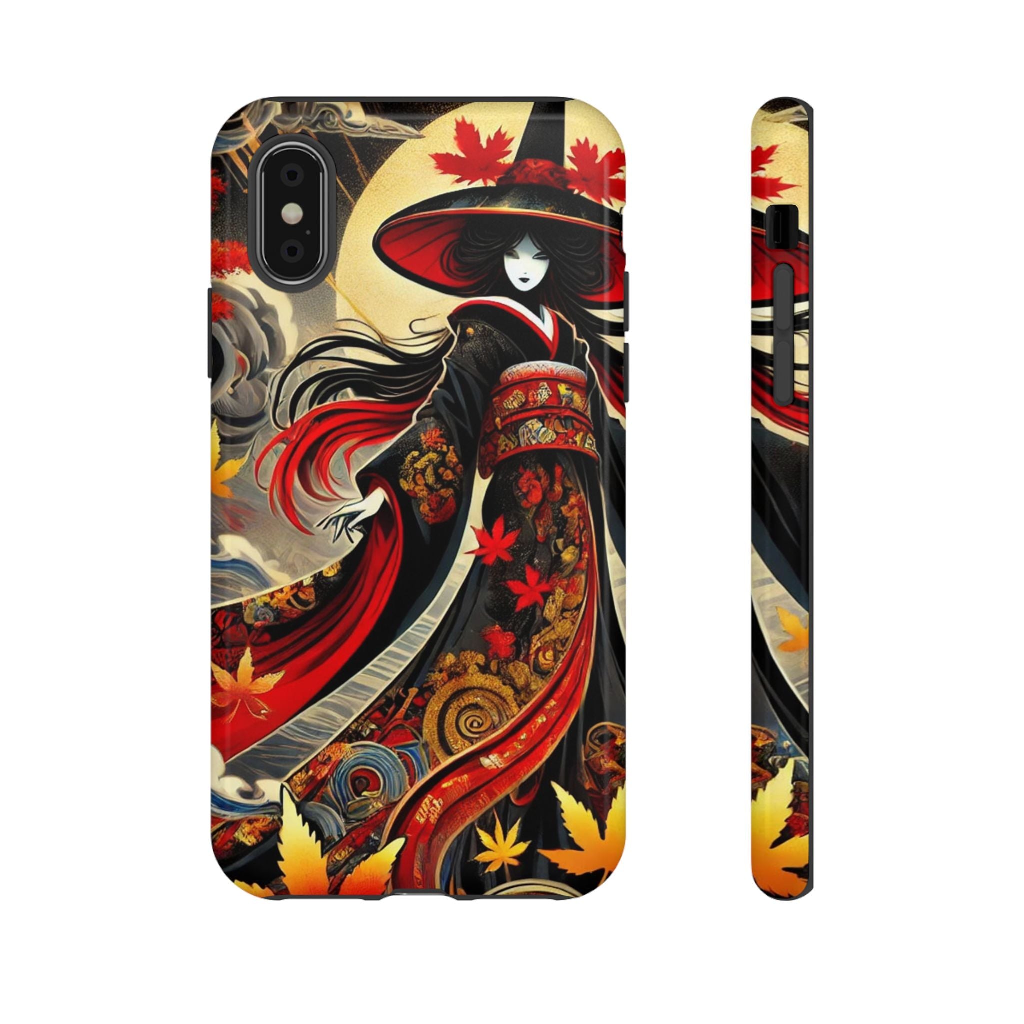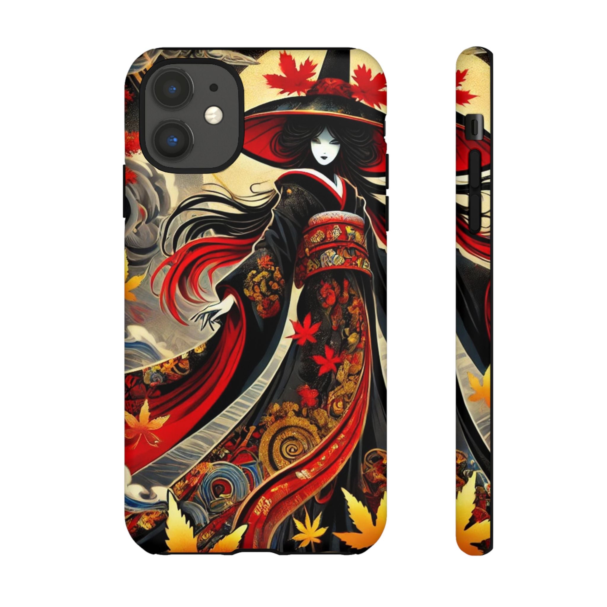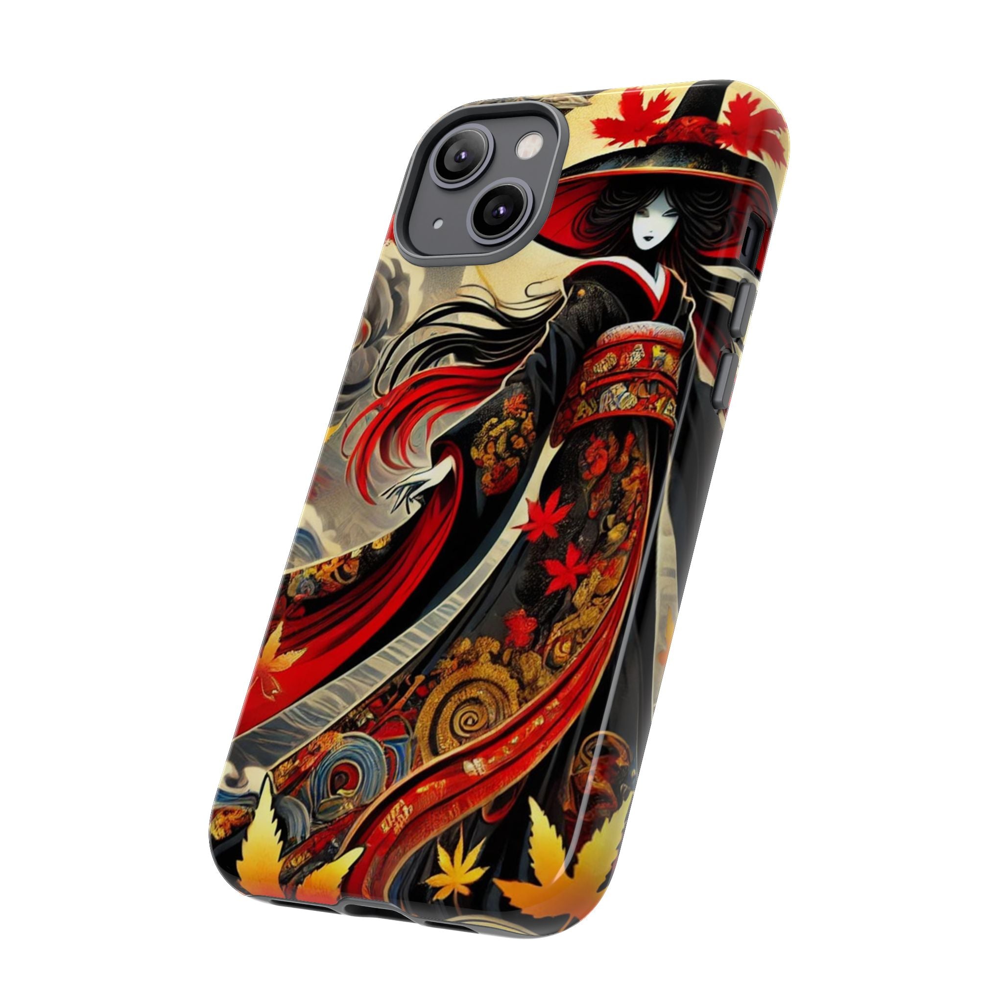 The case showcases a striking Kabuki-inspired witch in a towering red hat and flowing black kimono, detailed with golden storm clouds and fiery red maple leaves. Blending Japanese theater with Halloween mystique, it transforms everyday protection into a bold statement of art, fantasy, and elegance.