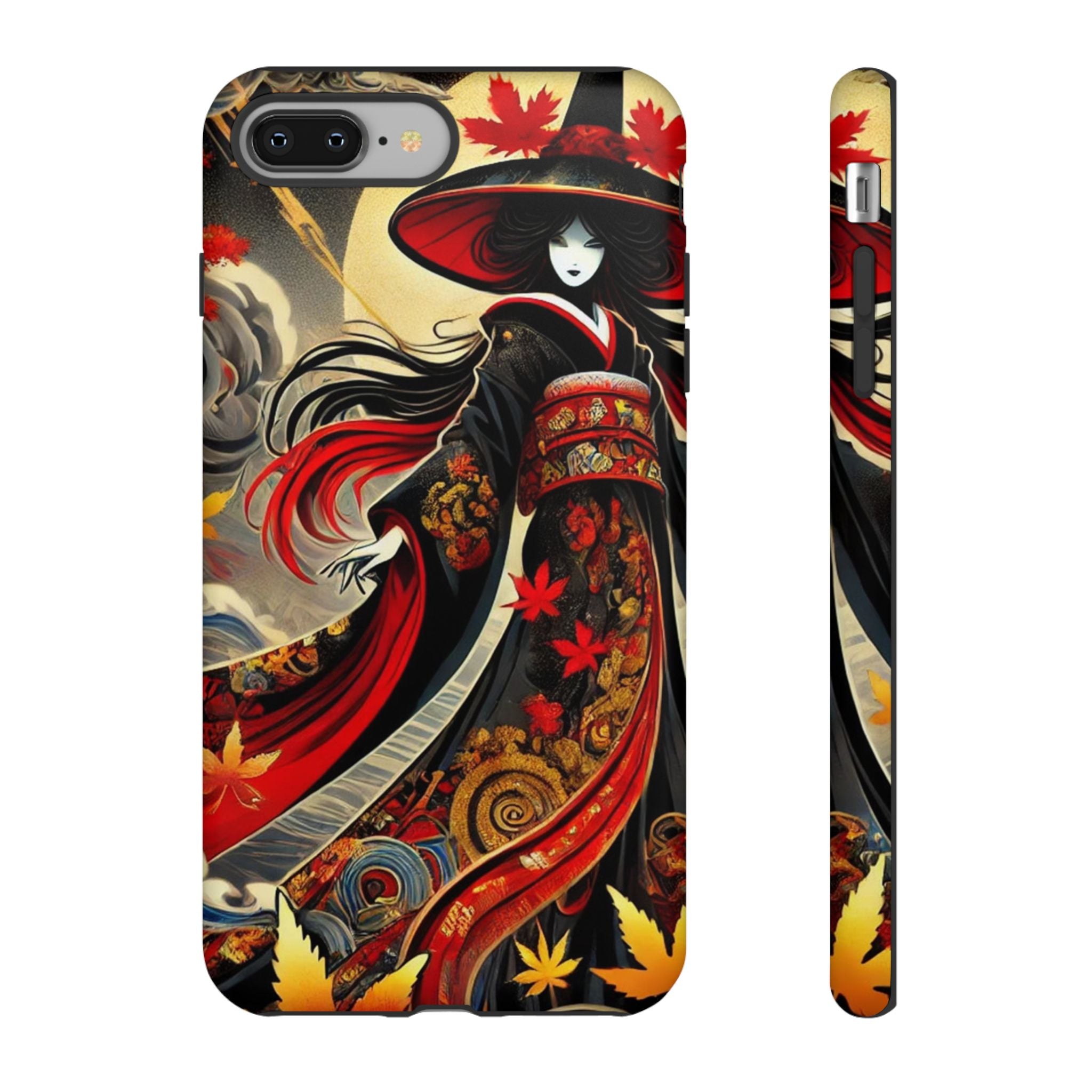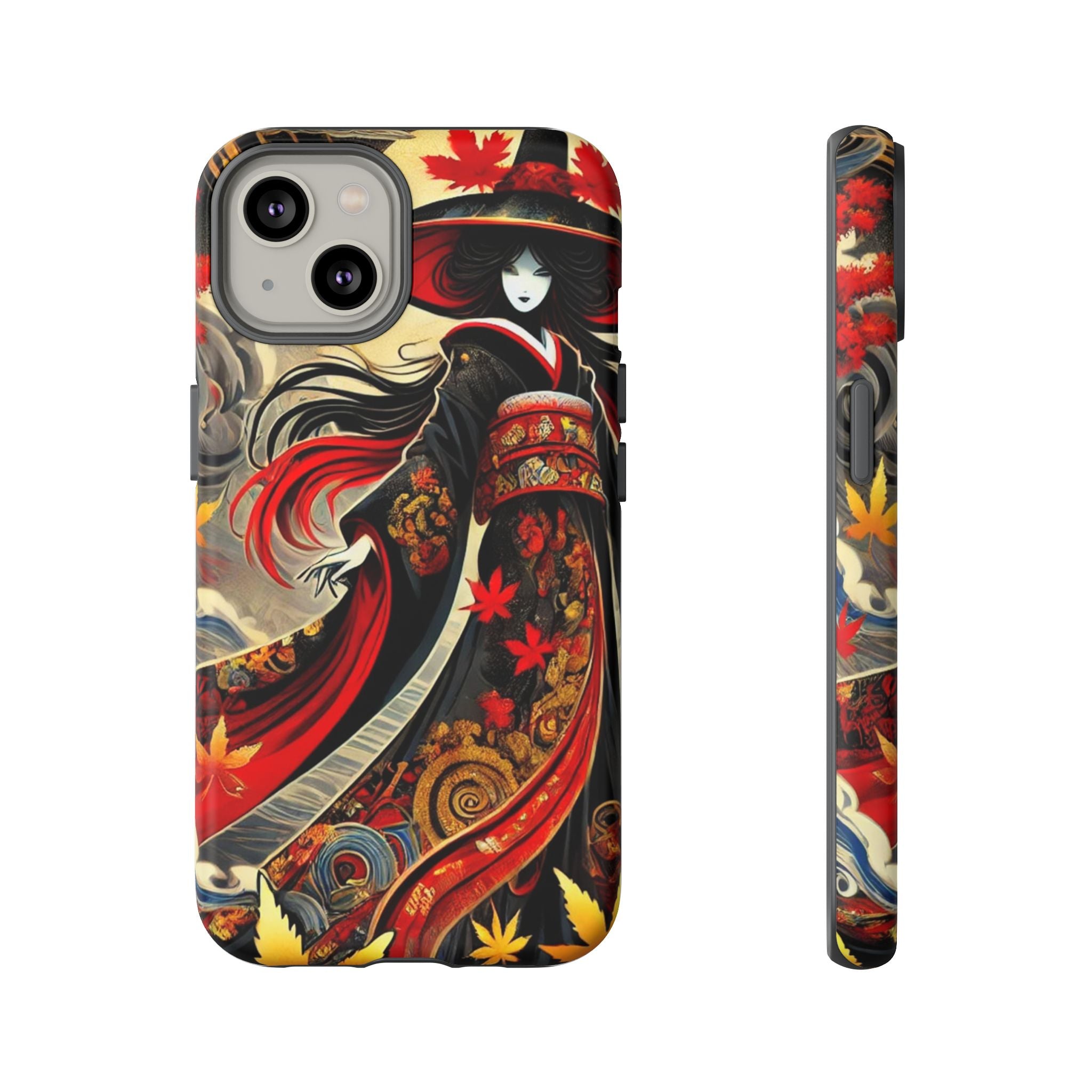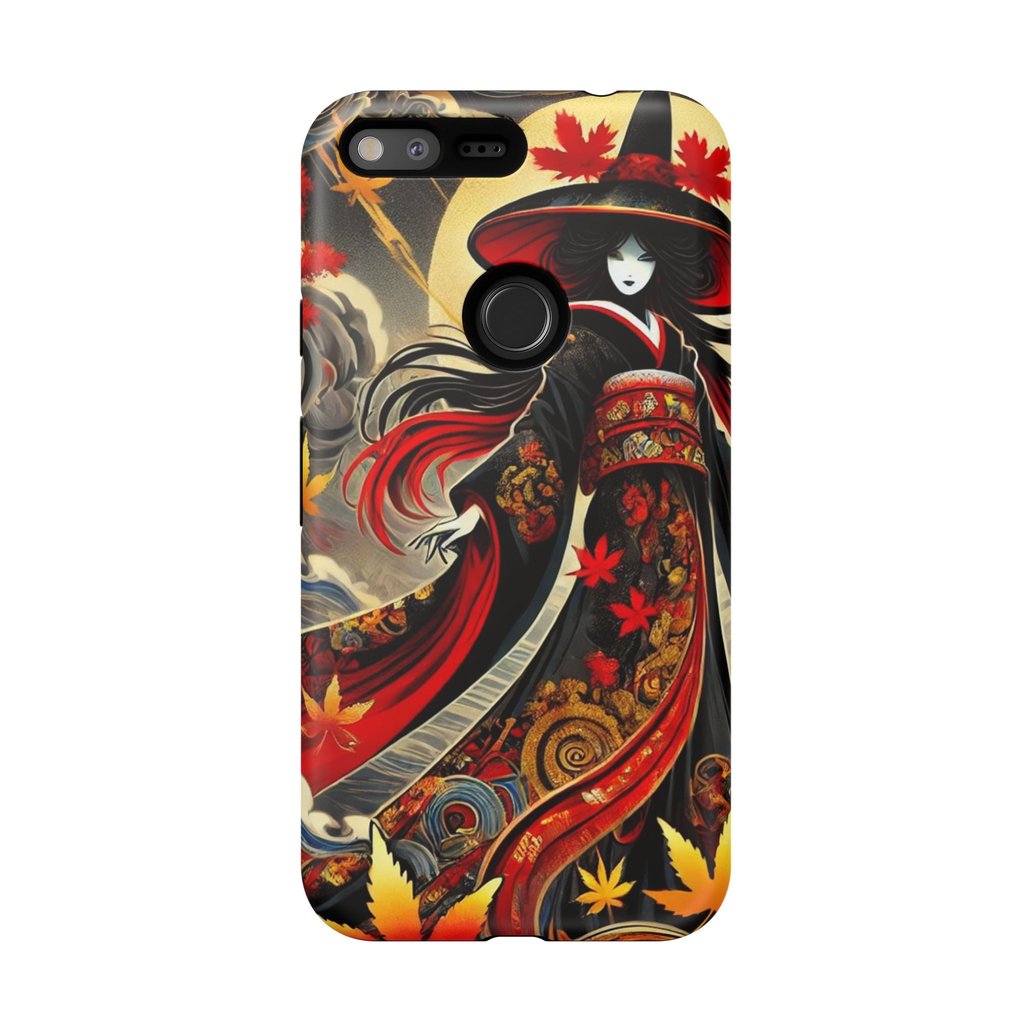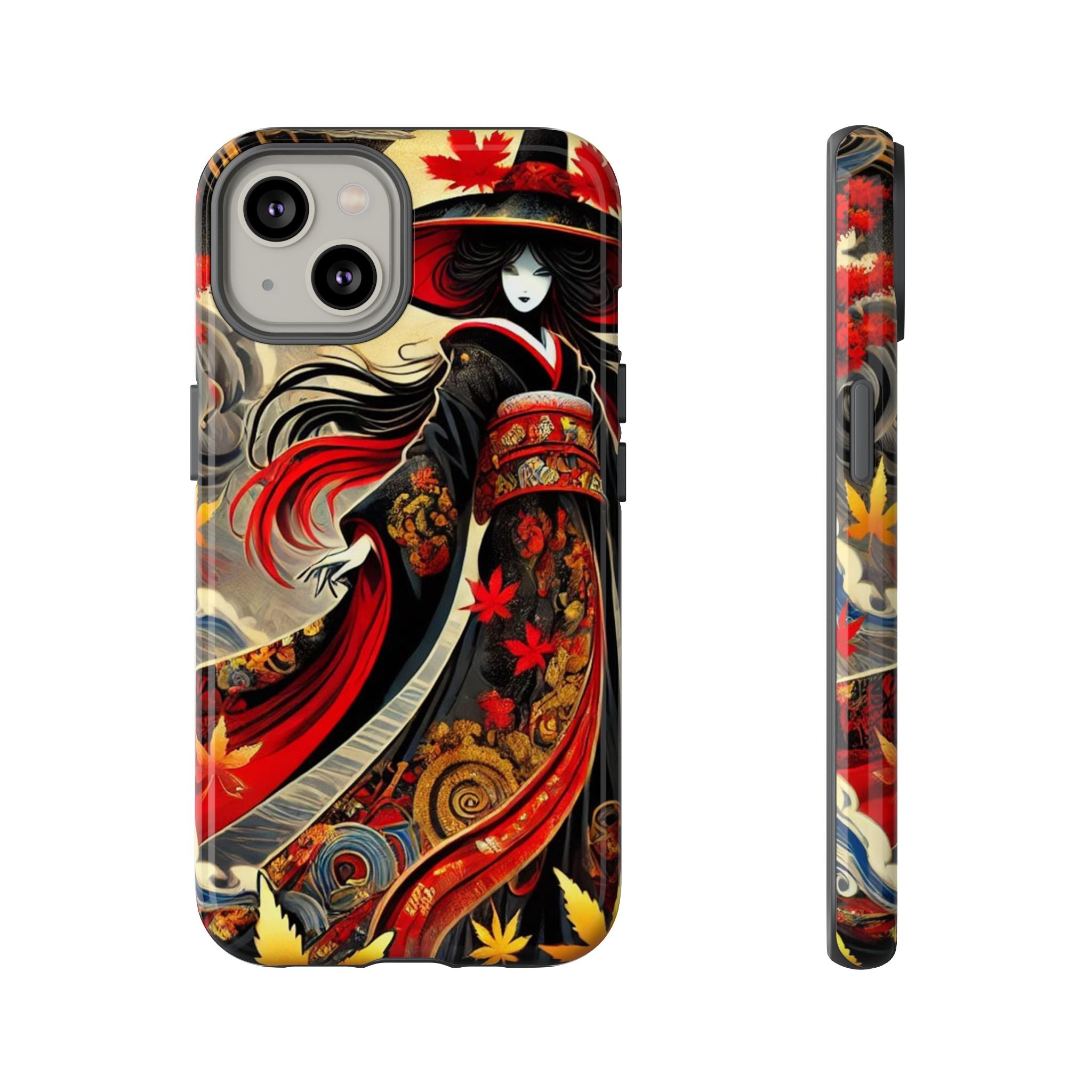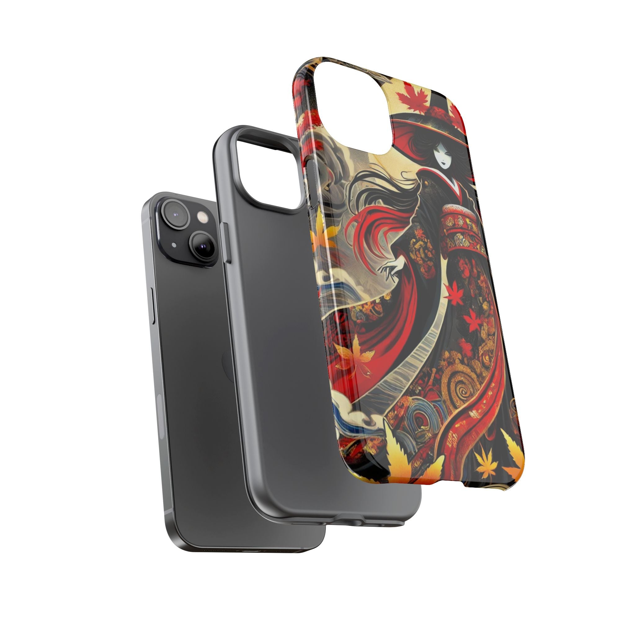 The case showcases a striking Kabuki-inspired witch in a towering red hat and flowing black kimono, detailed with golden storm clouds and fiery red maple leaves. Blending Japanese theater with Halloween mystique, it transforms everyday protection into a bold statement of art, fantasy, and elegance.