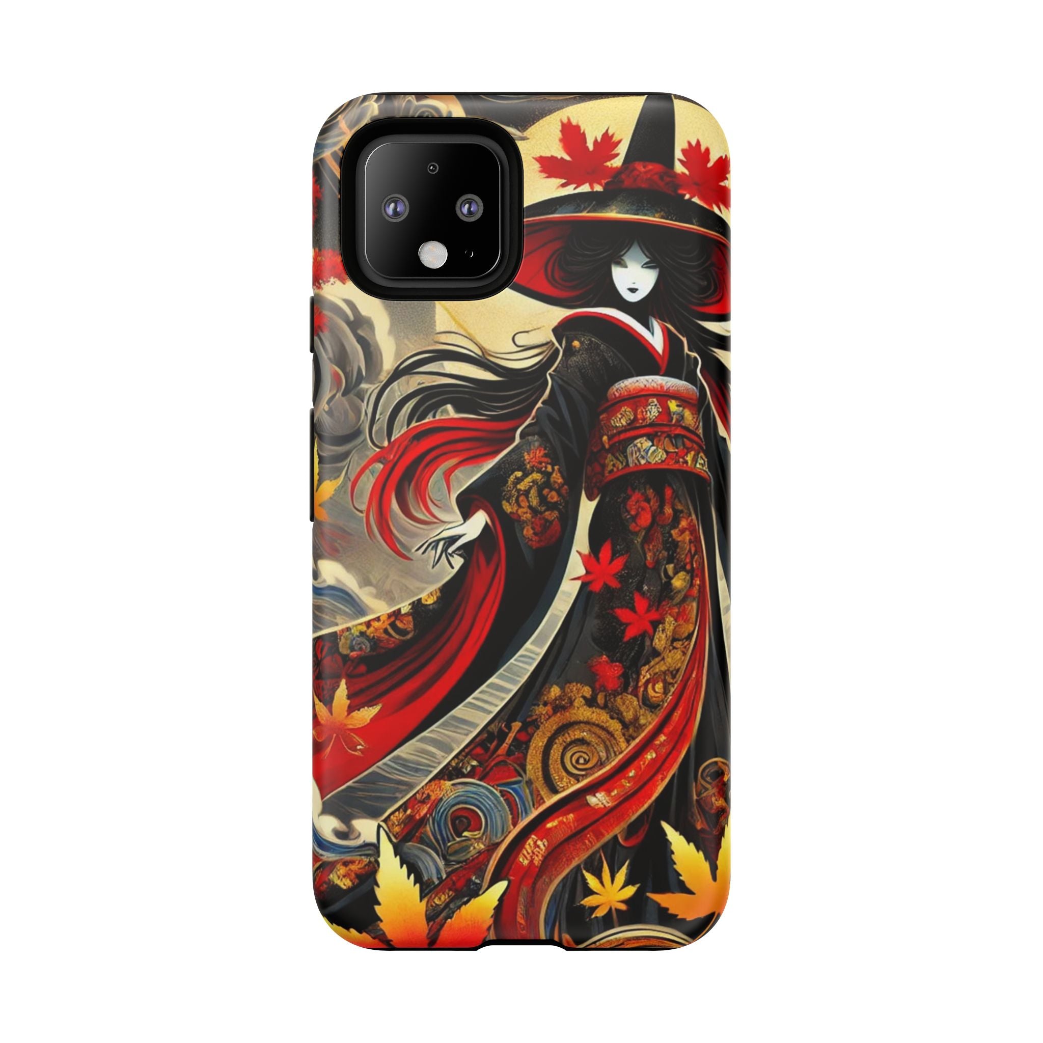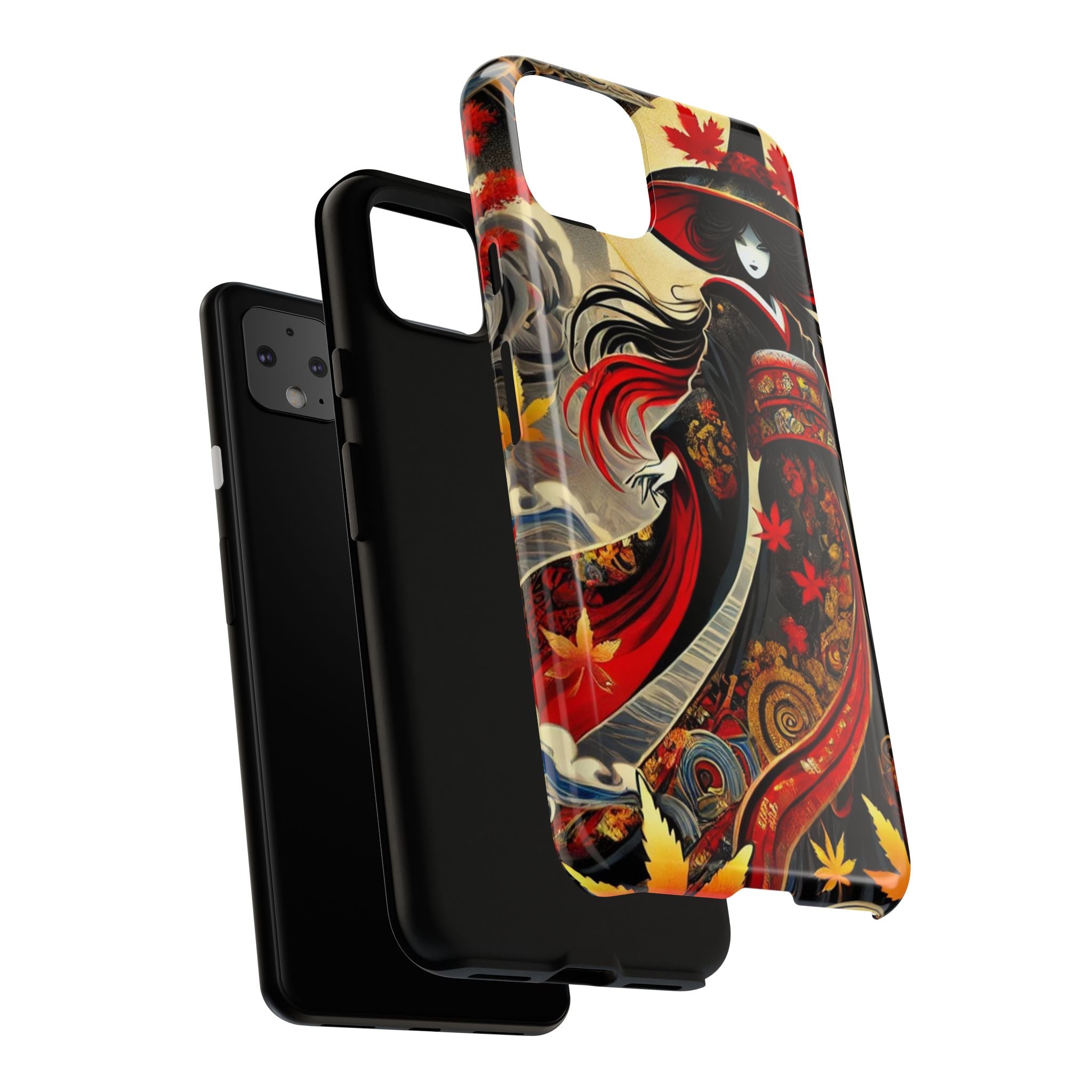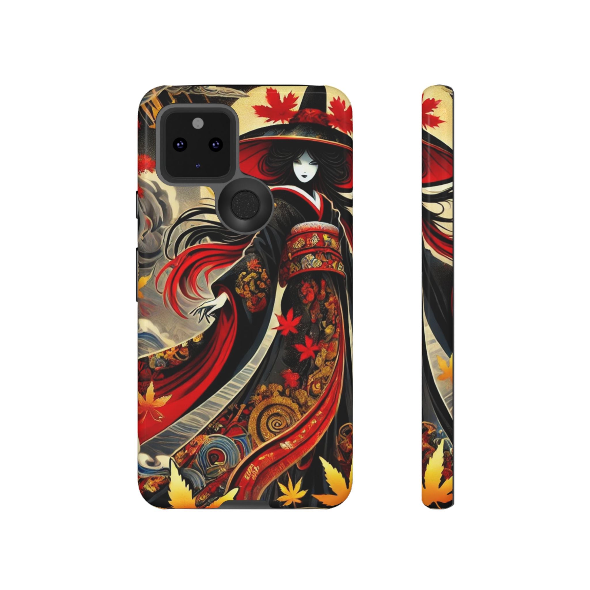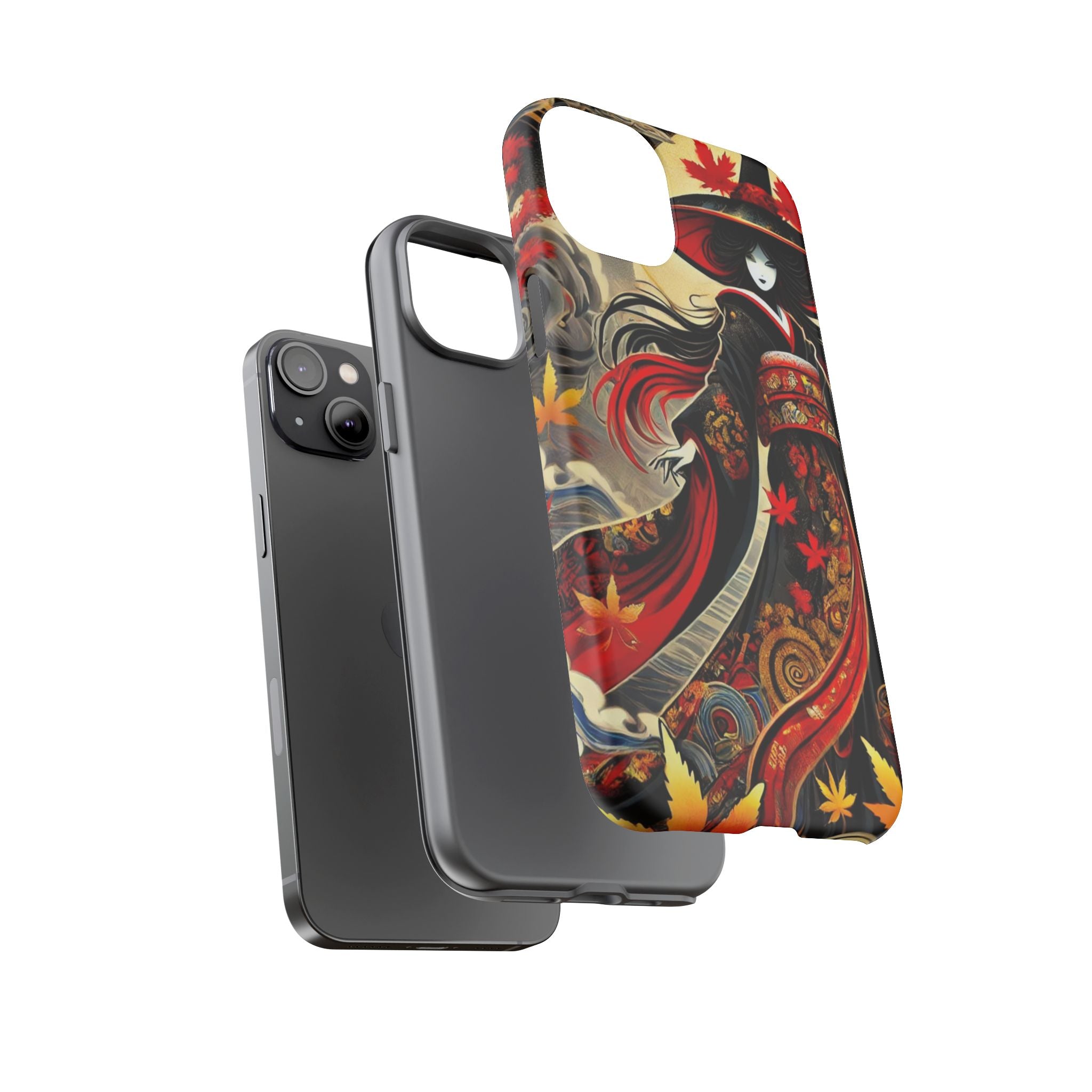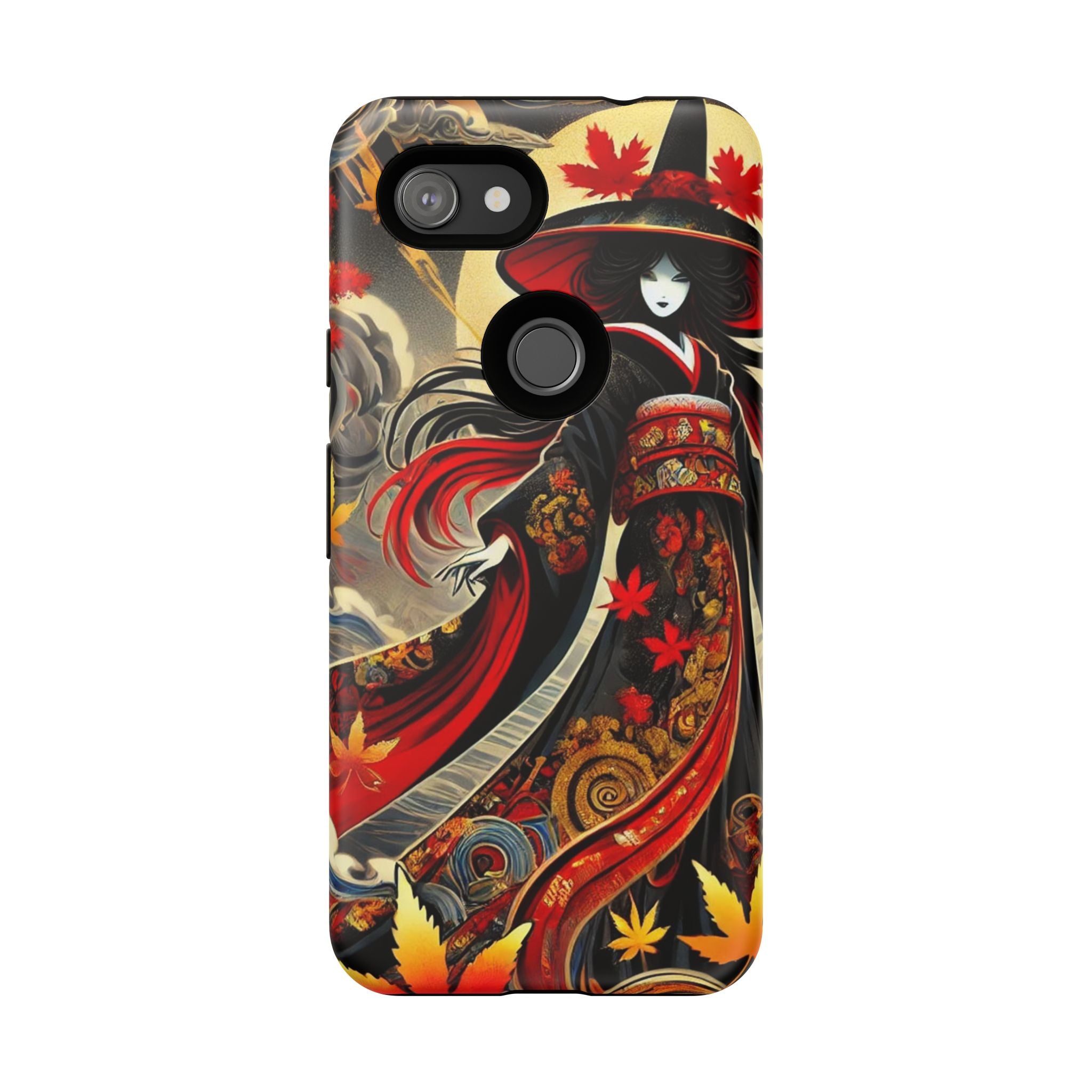 The case showcases a striking Kabuki-inspired witch in a towering red hat and flowing black kimono, detailed with golden storm clouds and fiery red maple leaves. Blending Japanese theater with Halloween mystique, it transforms everyday protection into a bold statement of art, fantasy, and elegance.