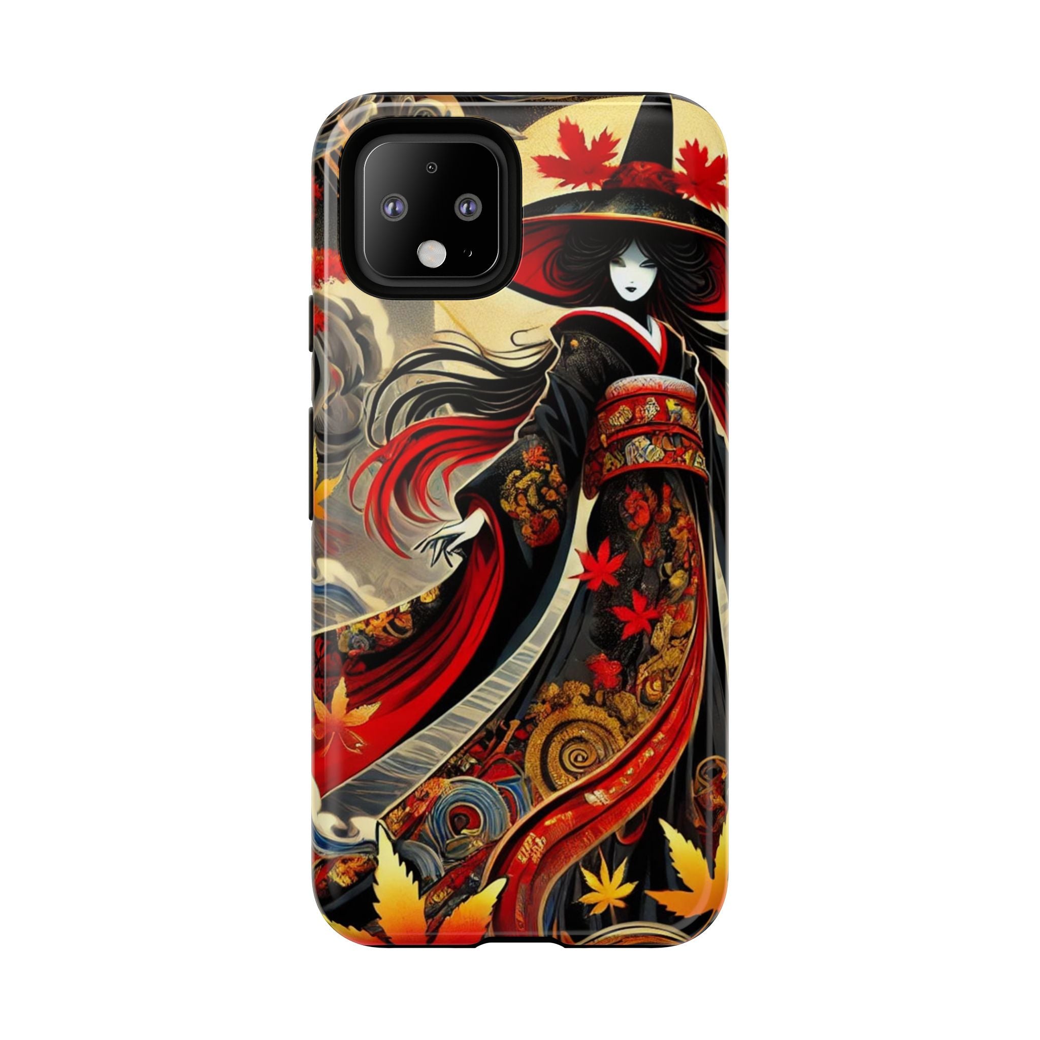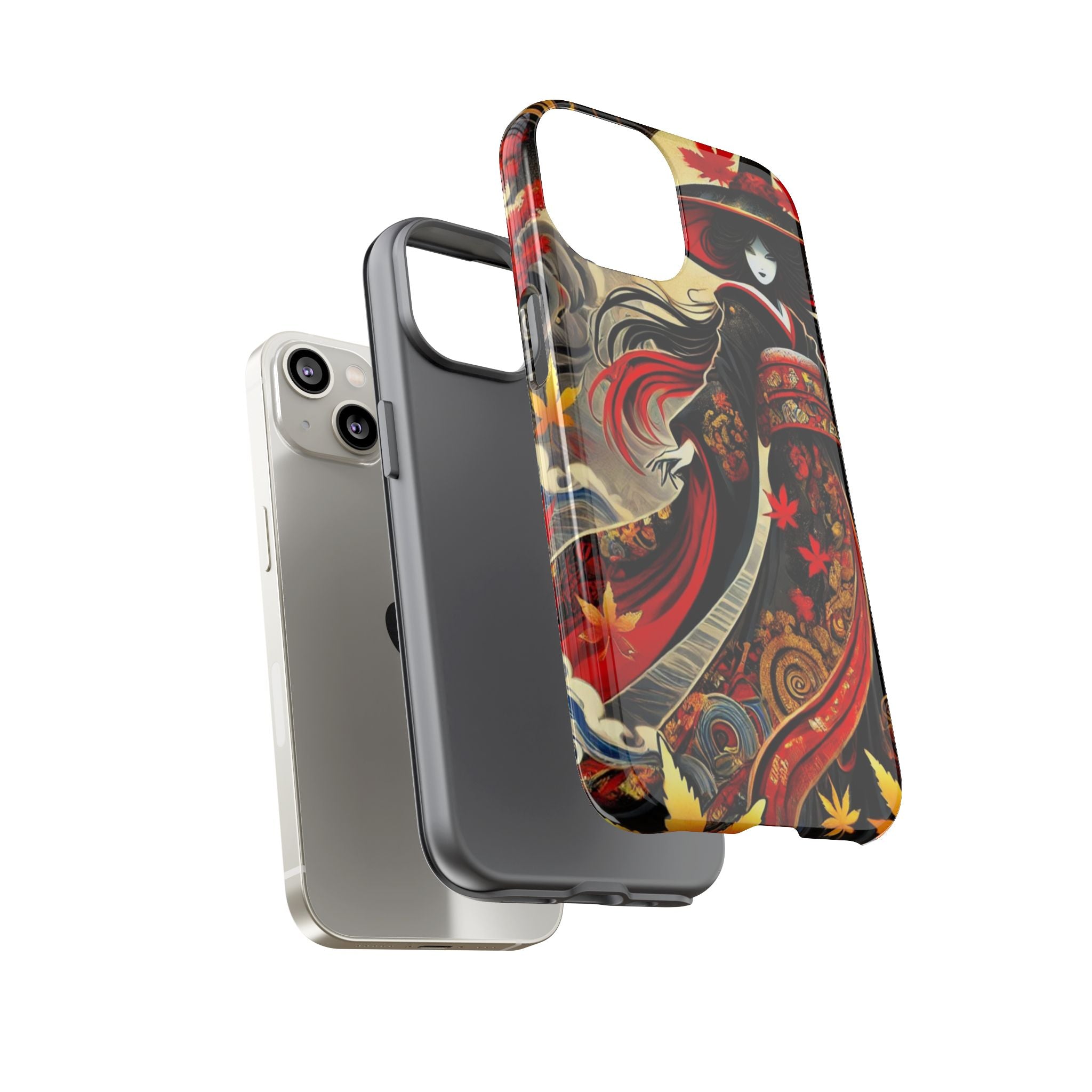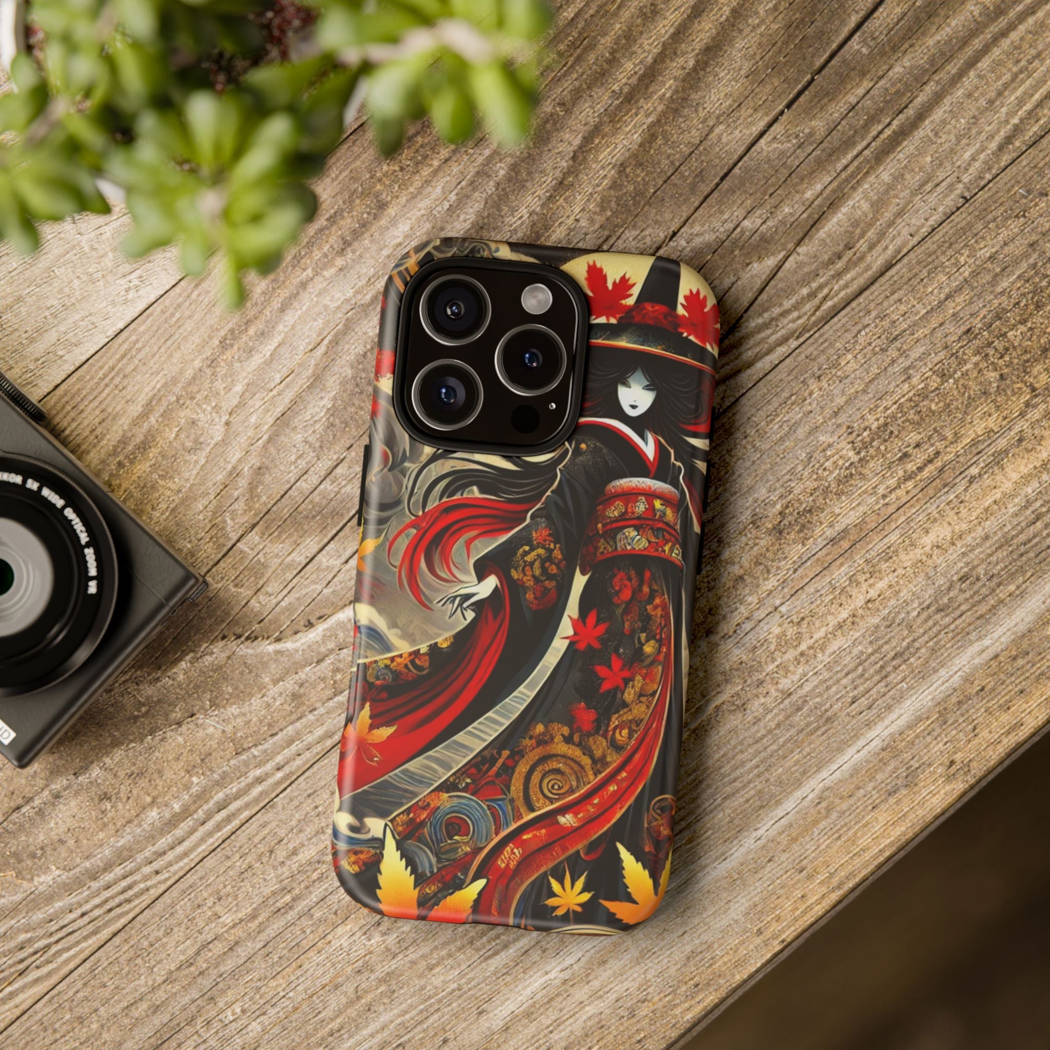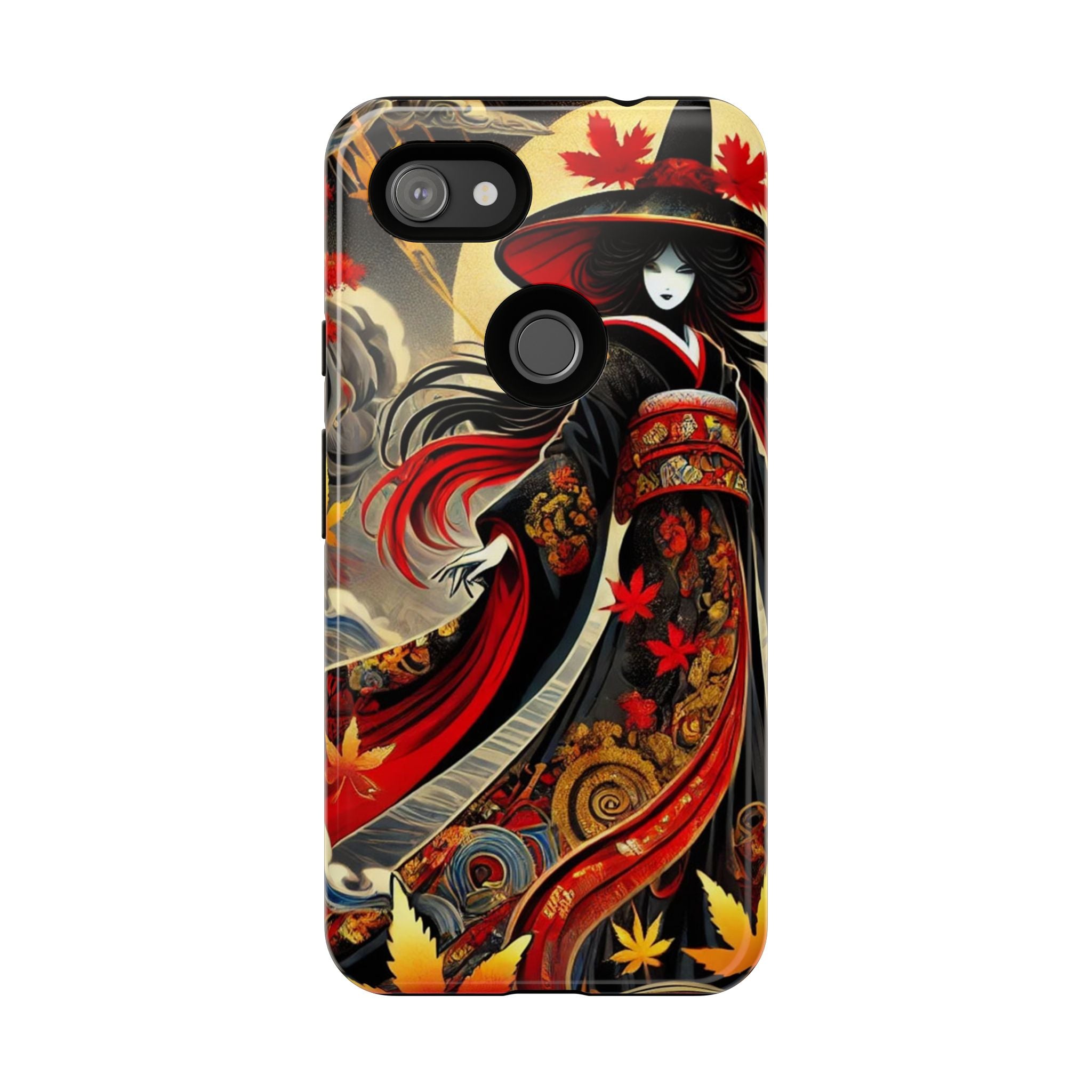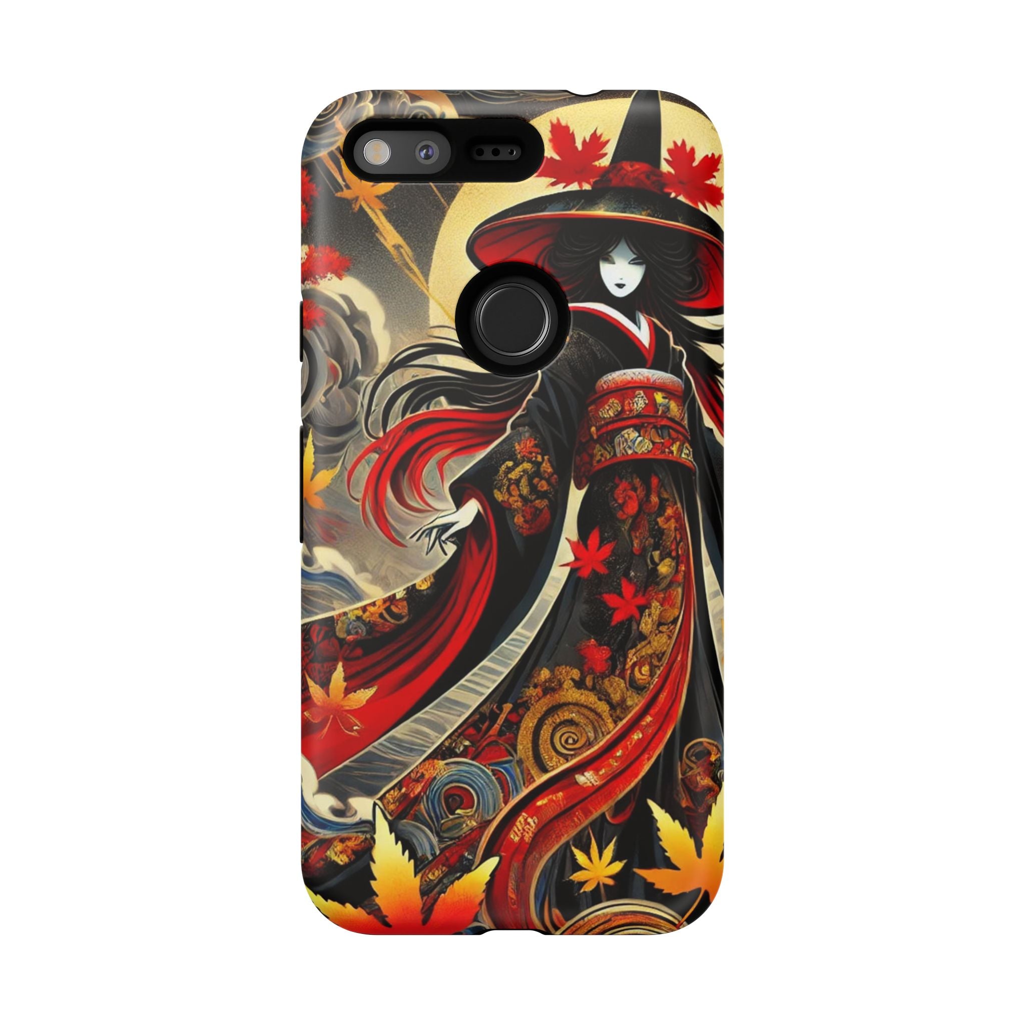 The case showcases a striking Kabuki-inspired witch in a towering red hat and flowing black kimono, detailed with golden storm clouds and fiery red maple leaves. Blending Japanese theater with Halloween mystique, it transforms everyday protection into a bold statement of art, fantasy, and elegance.