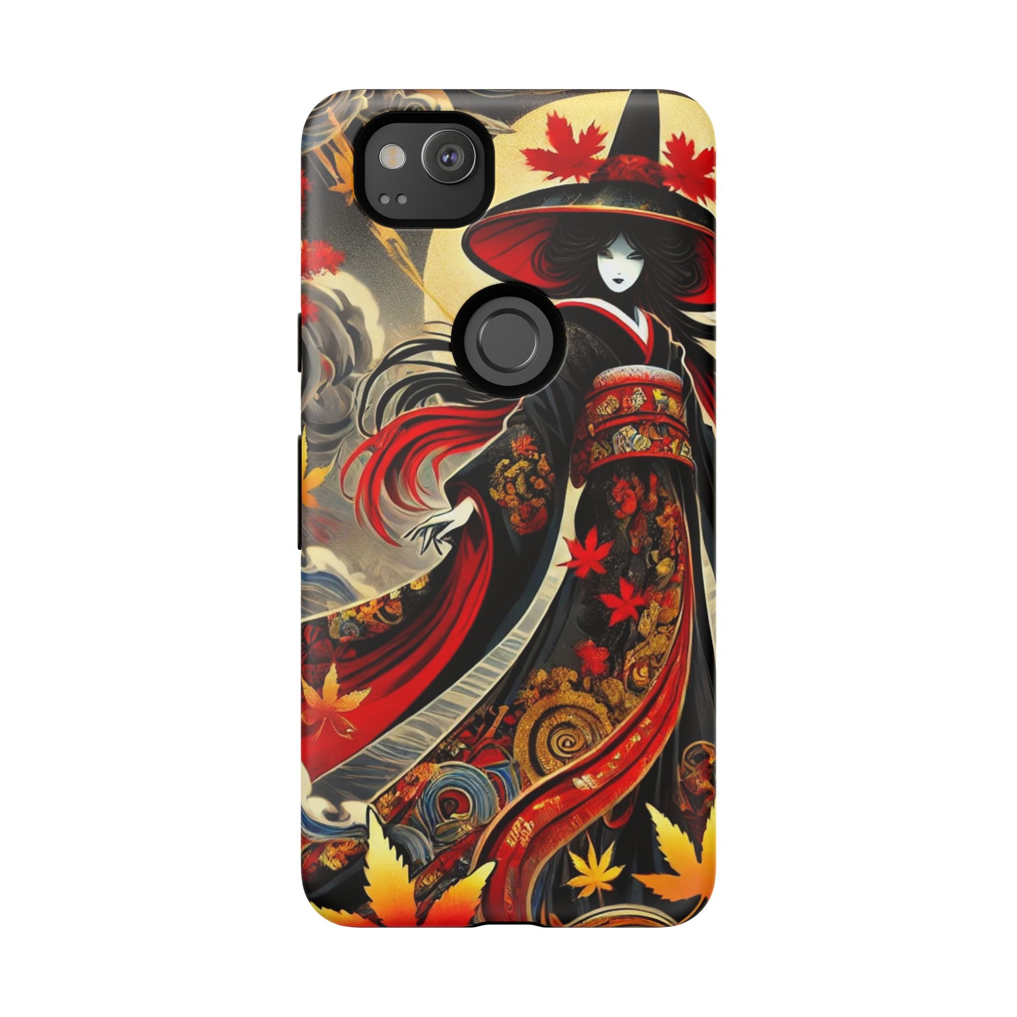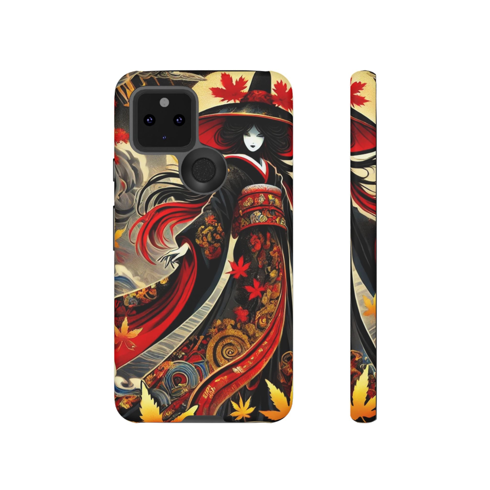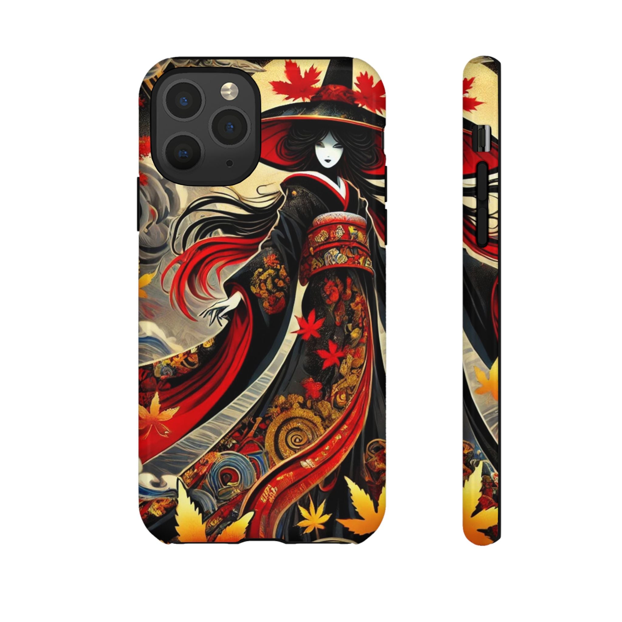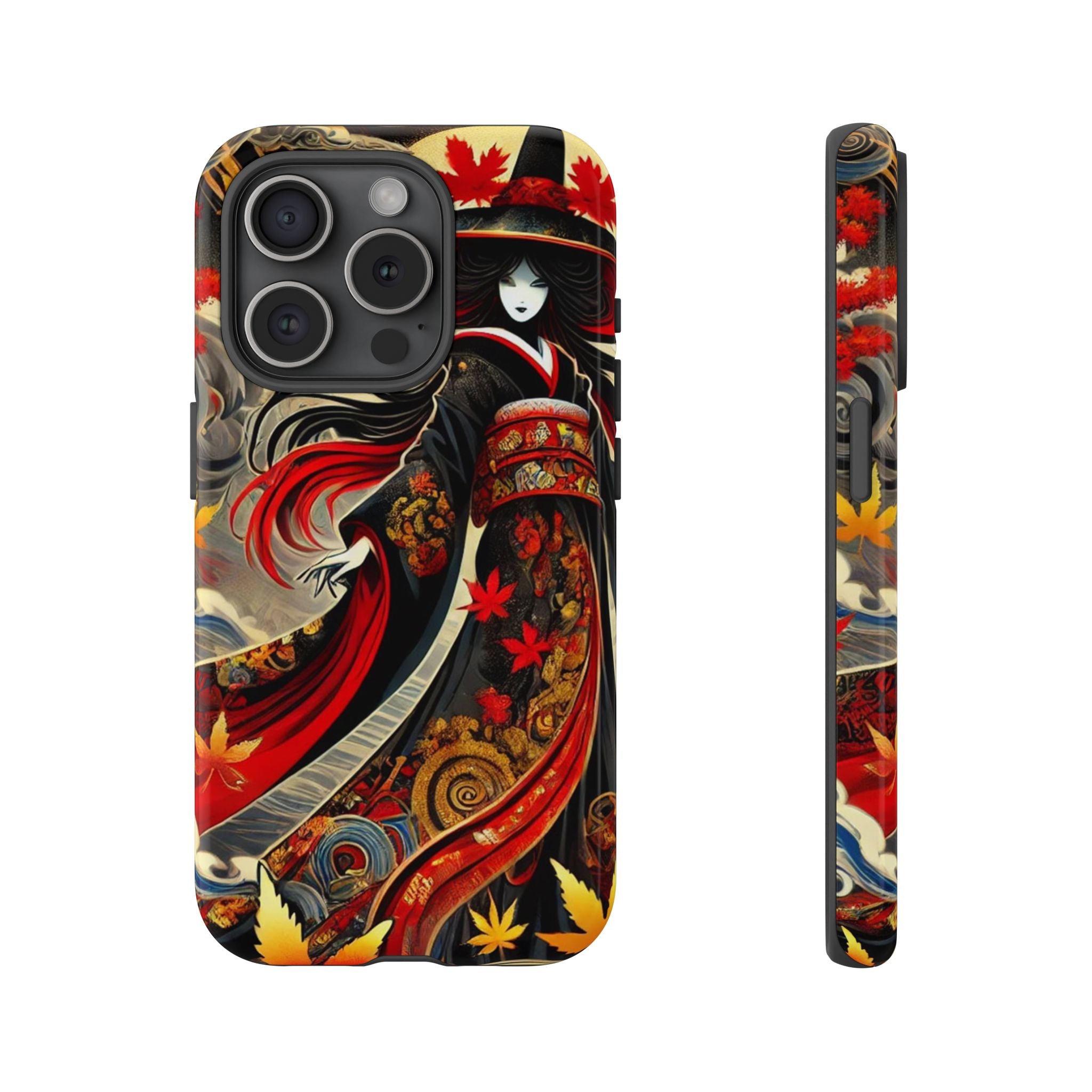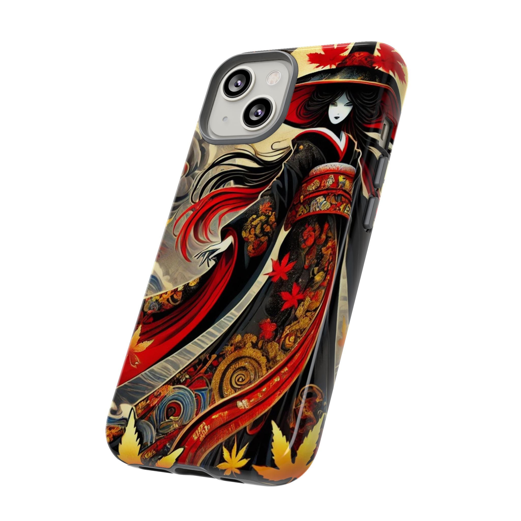 The case showcases a striking Kabuki-inspired witch in a towering red hat and flowing black kimono, detailed with golden storm clouds and fiery red maple leaves. Blending Japanese theater with Halloween mystique, it transforms everyday protection into a bold statement of art, fantasy, and elegance.