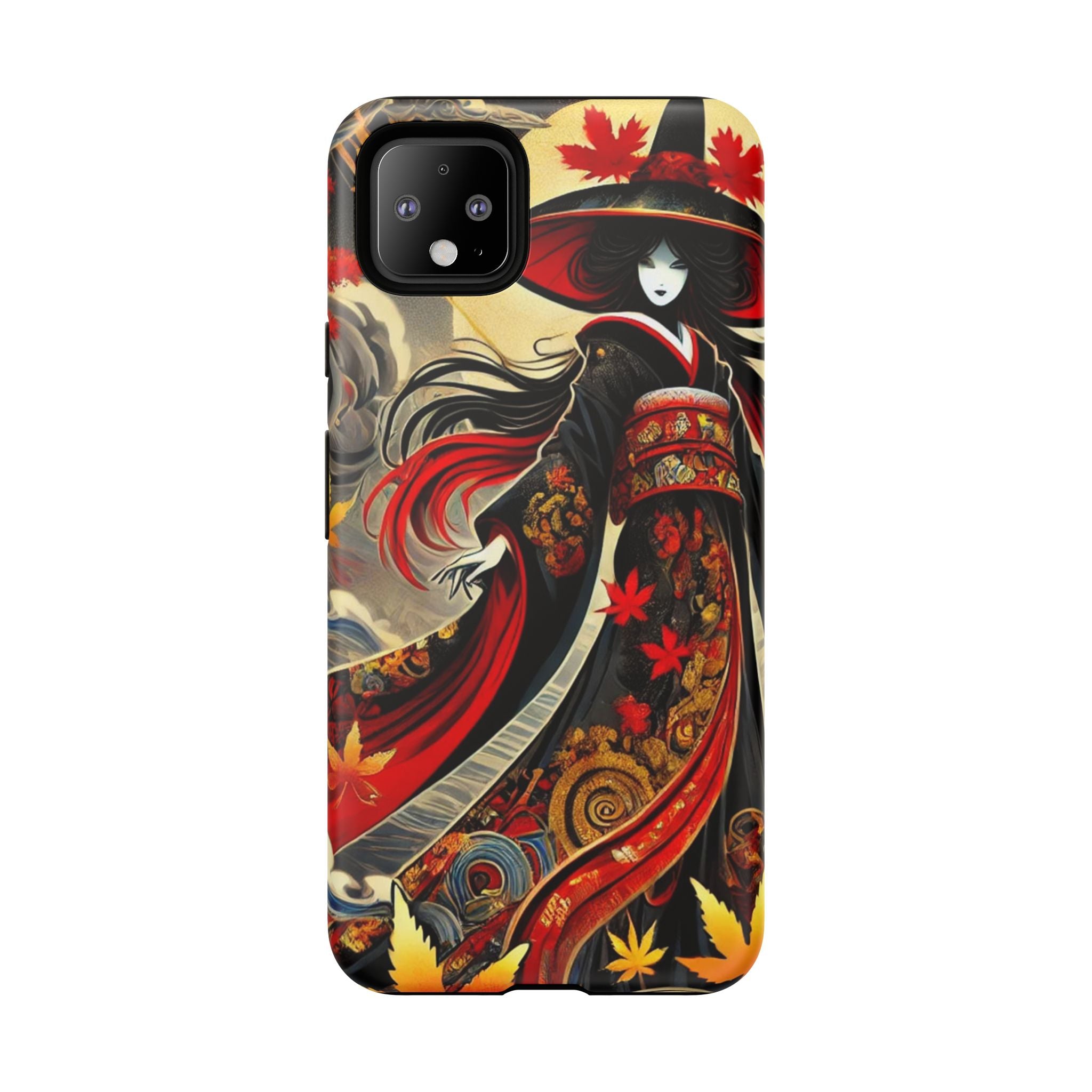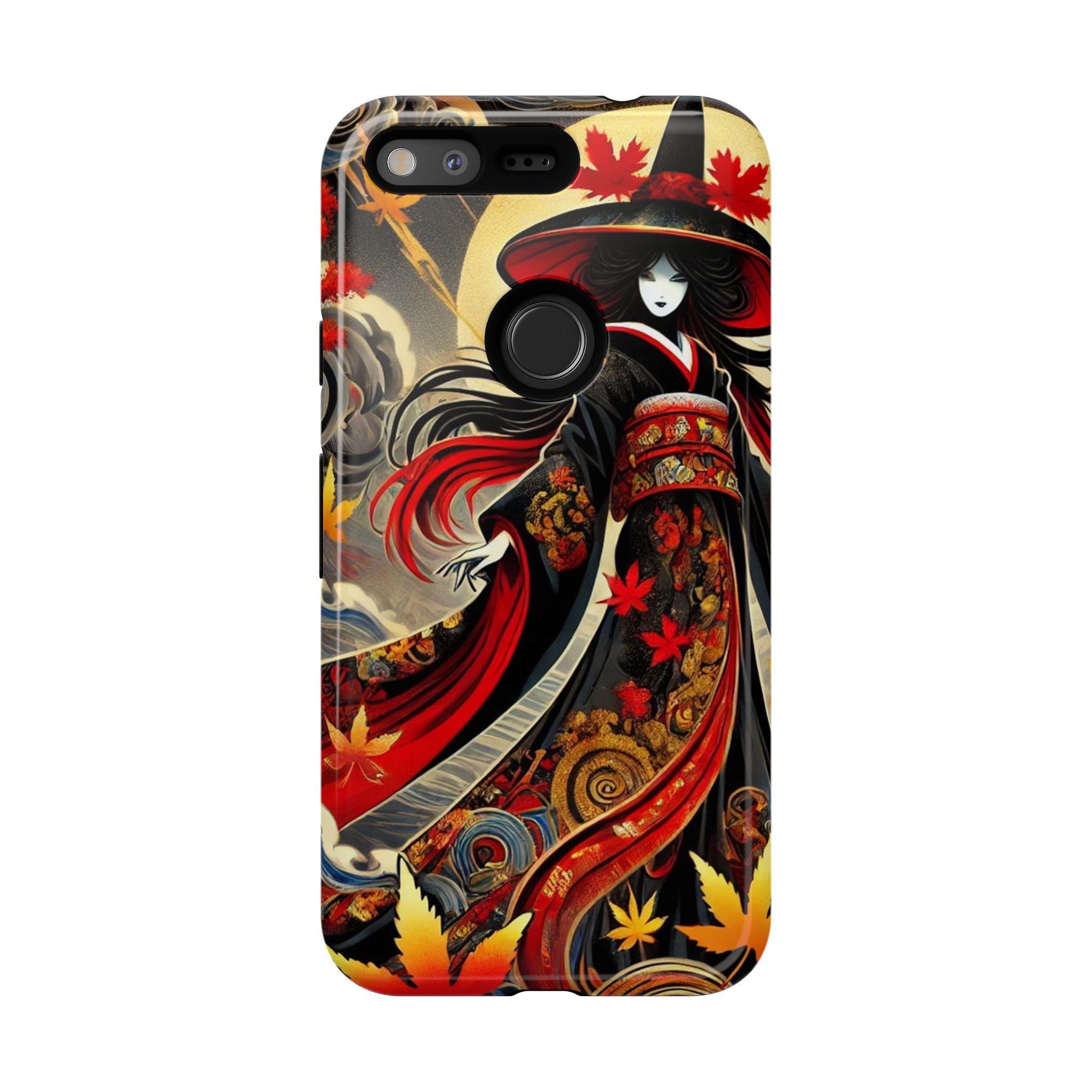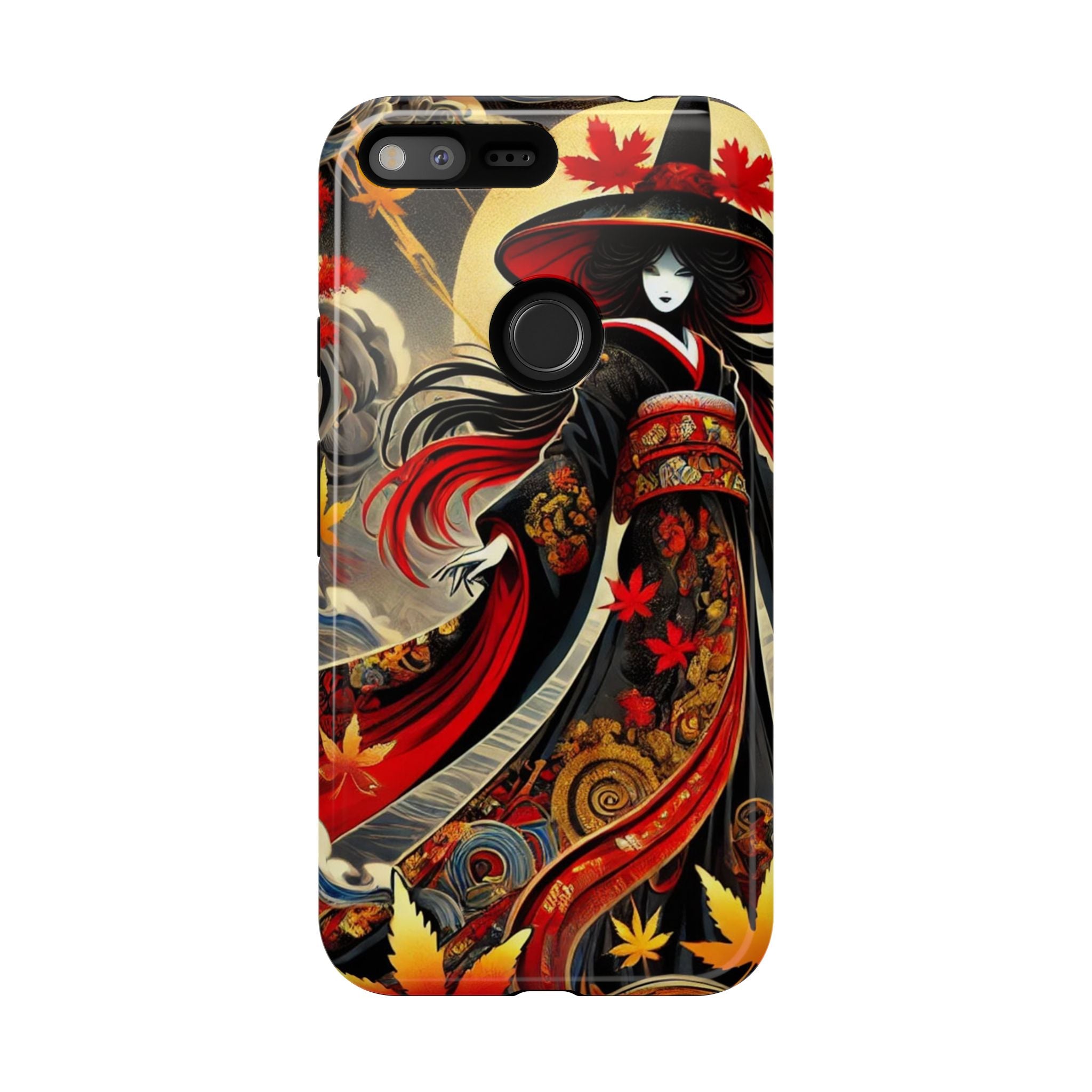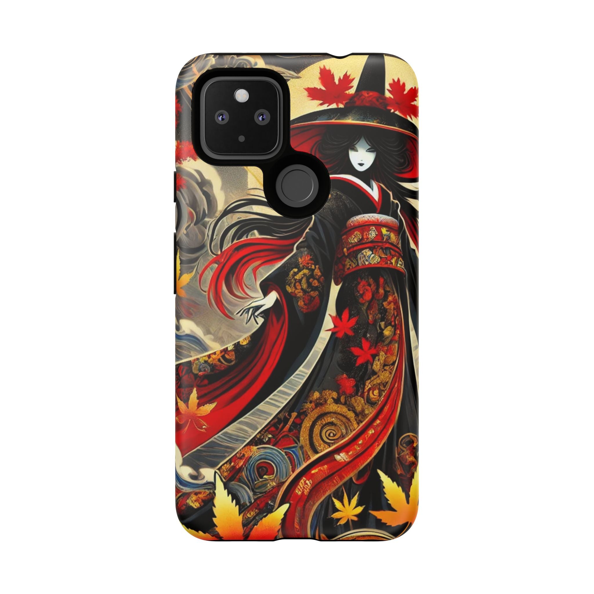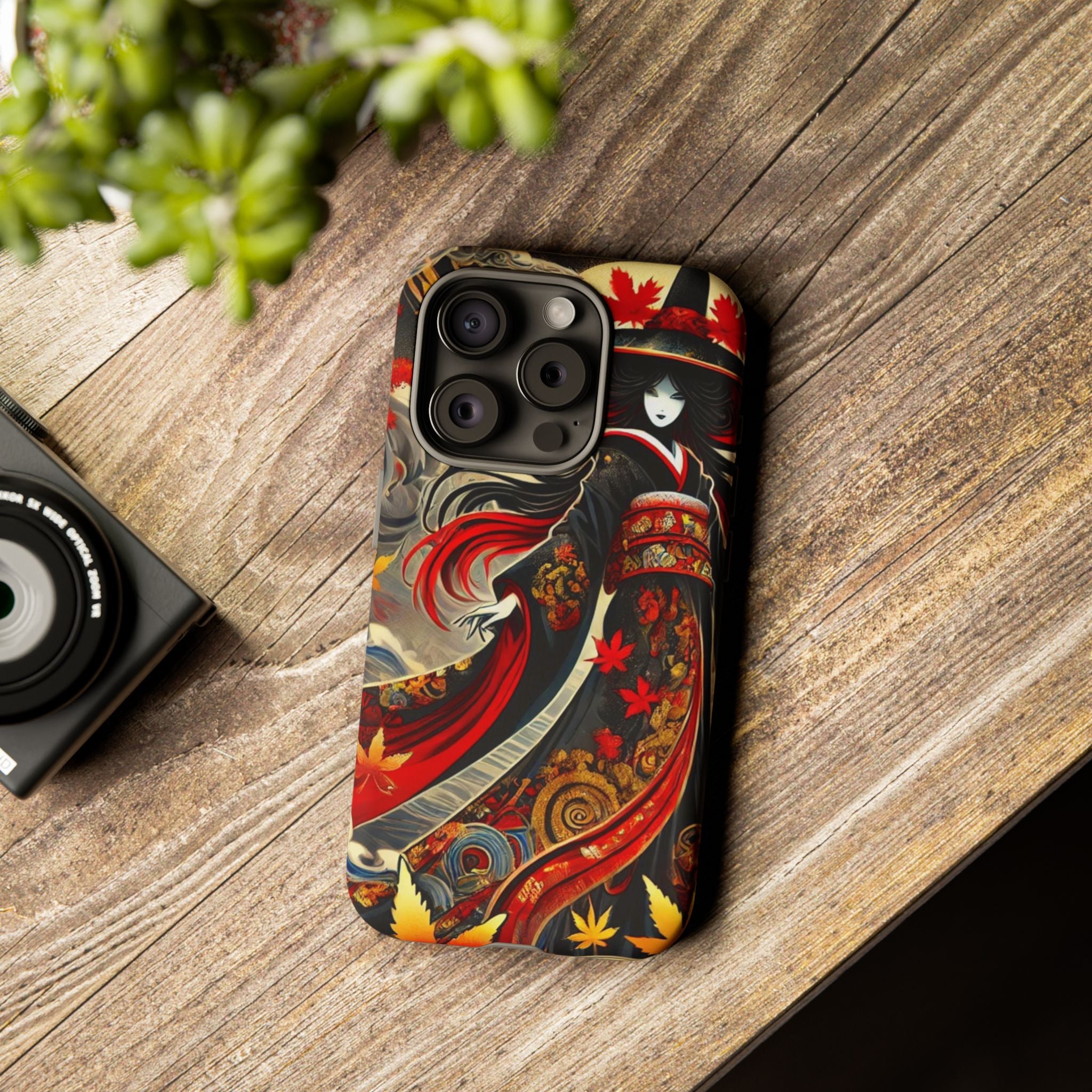 The case showcases a striking Kabuki-inspired witch in a towering red hat and flowing black kimono, detailed with golden storm clouds and fiery red maple leaves. Blending Japanese theater with Halloween mystique, it transforms everyday protection into a bold statement of art, fantasy, and elegance.