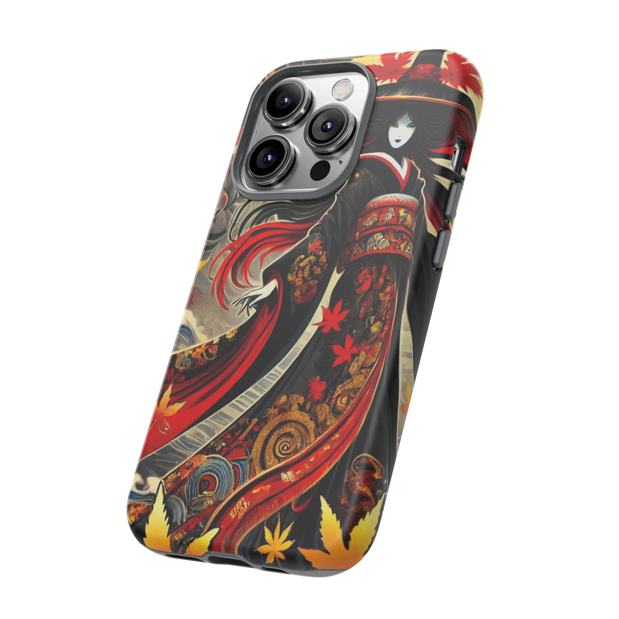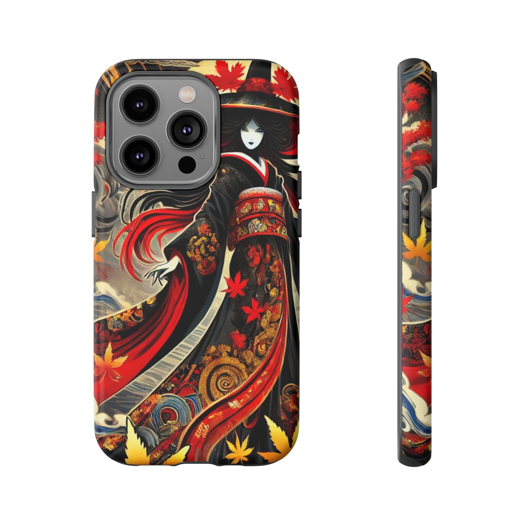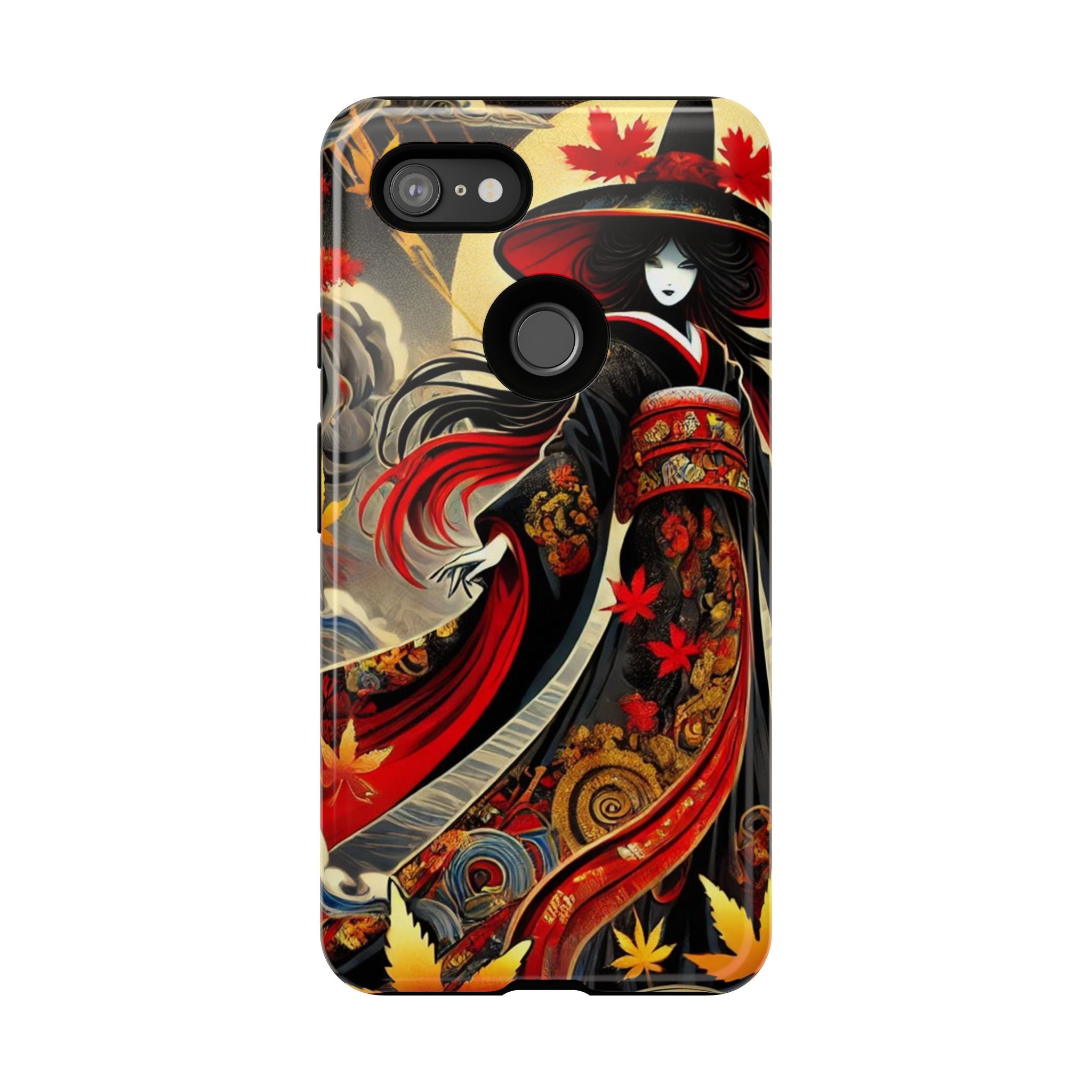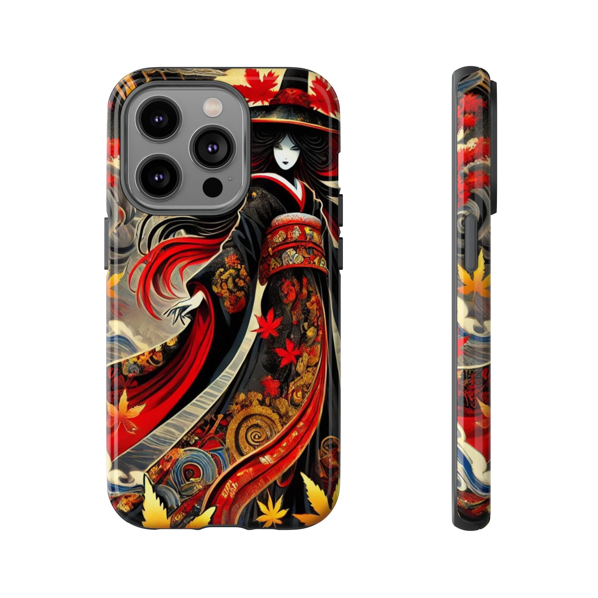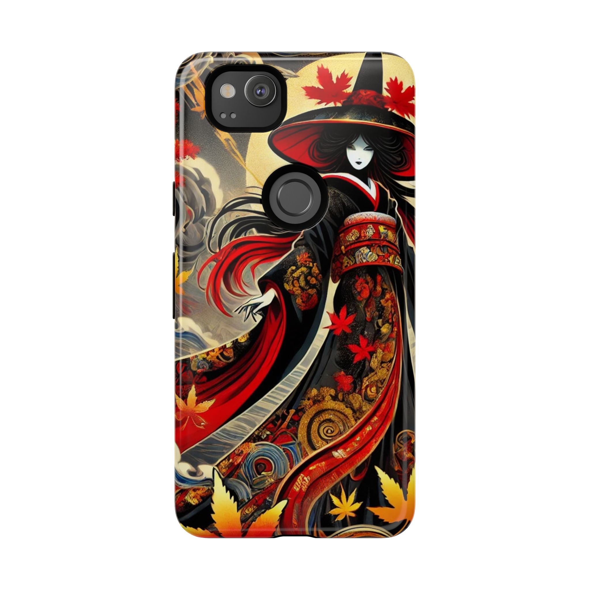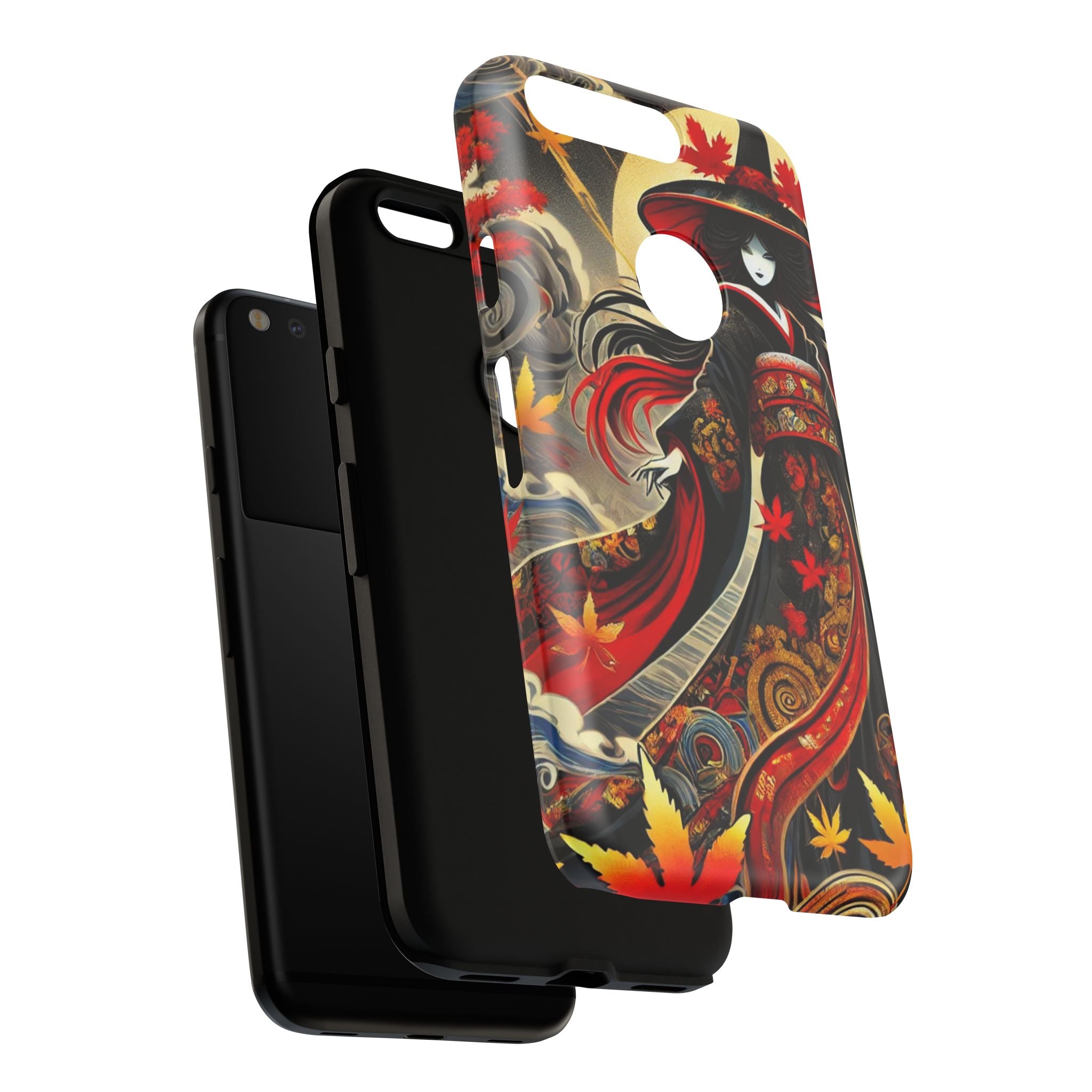 The case showcases a striking Kabuki-inspired witch in a towering red hat and flowing black kimono, detailed with golden storm clouds and fiery red maple leaves. Blending Japanese theater with Halloween mystique, it transforms everyday protection into a bold statement of art, fantasy, and elegance.