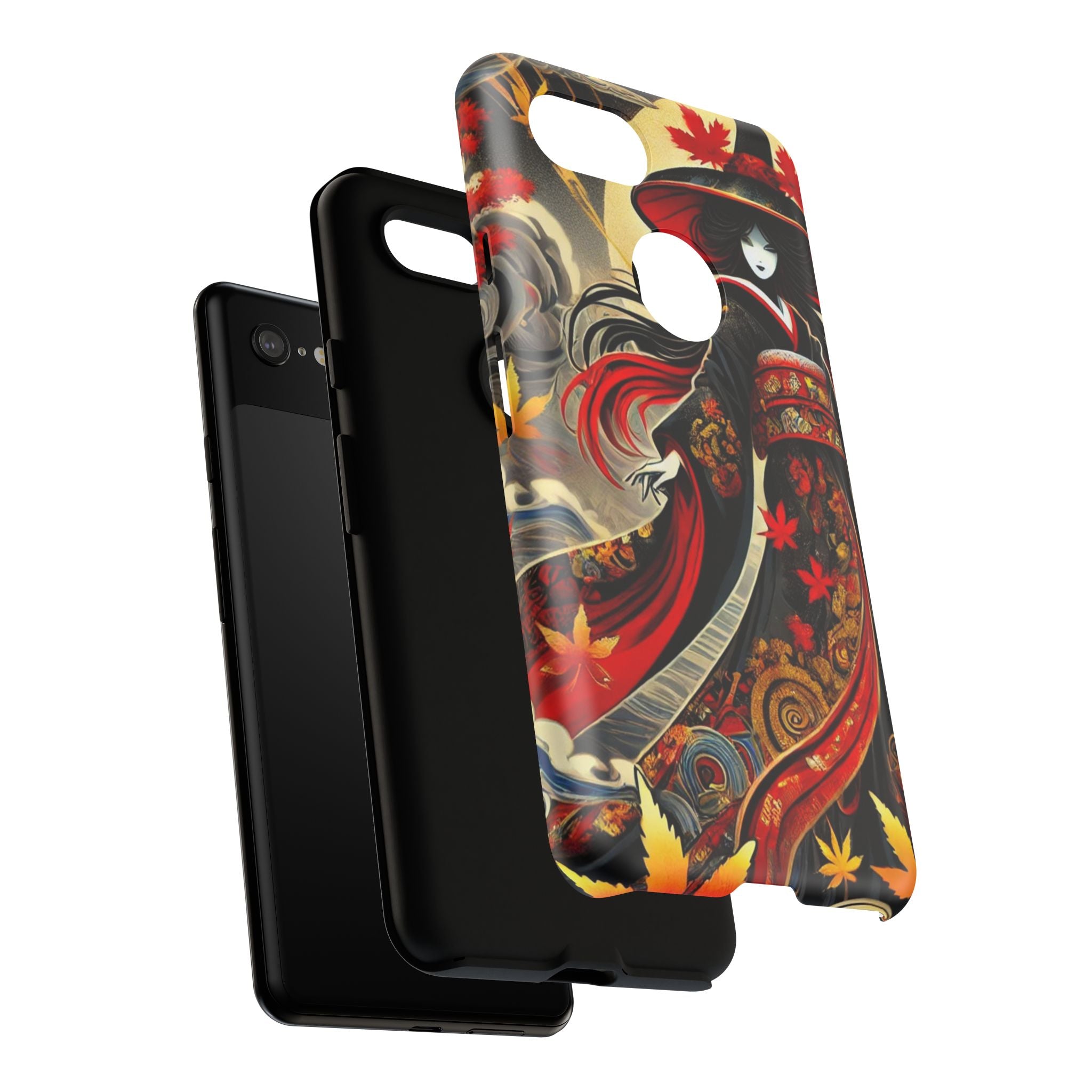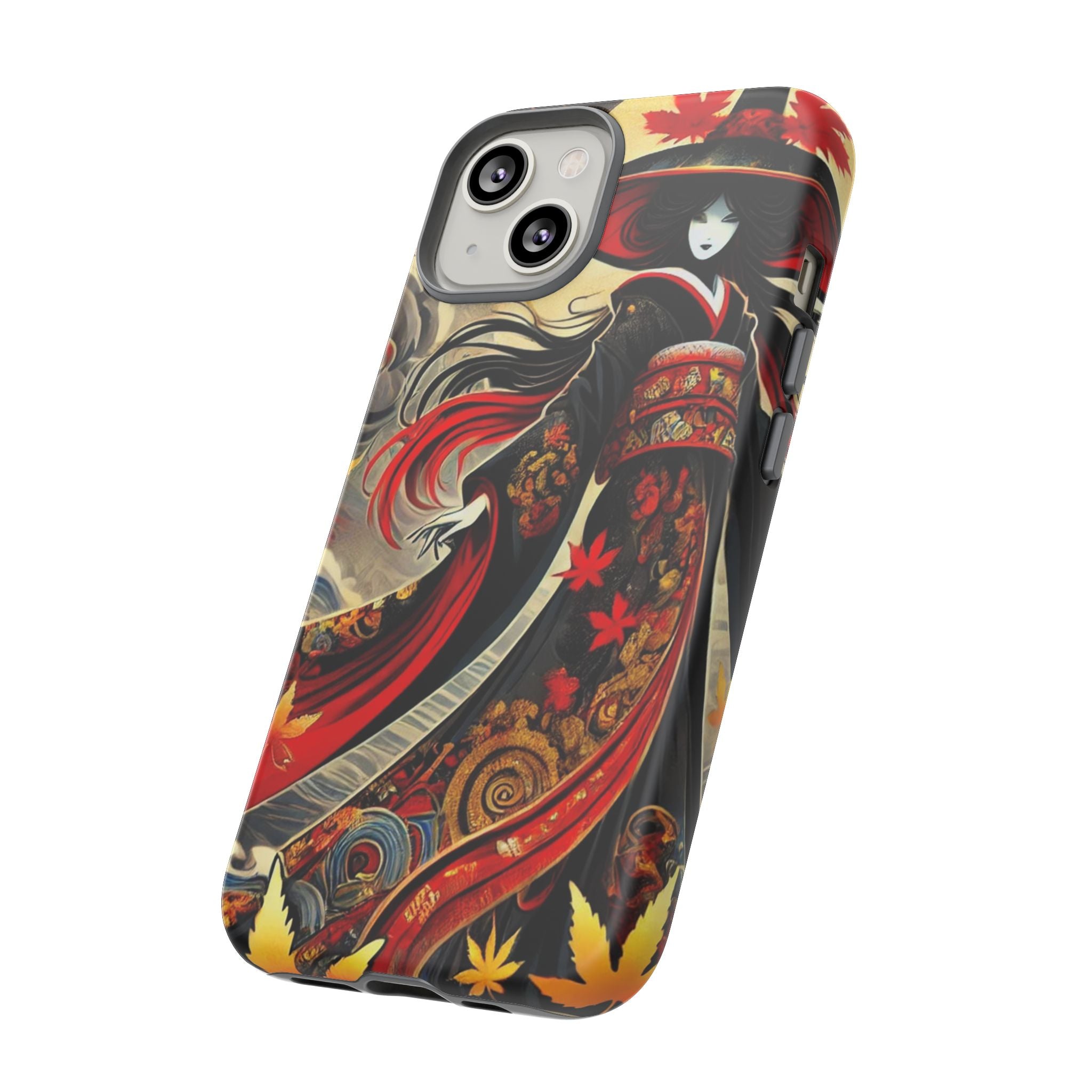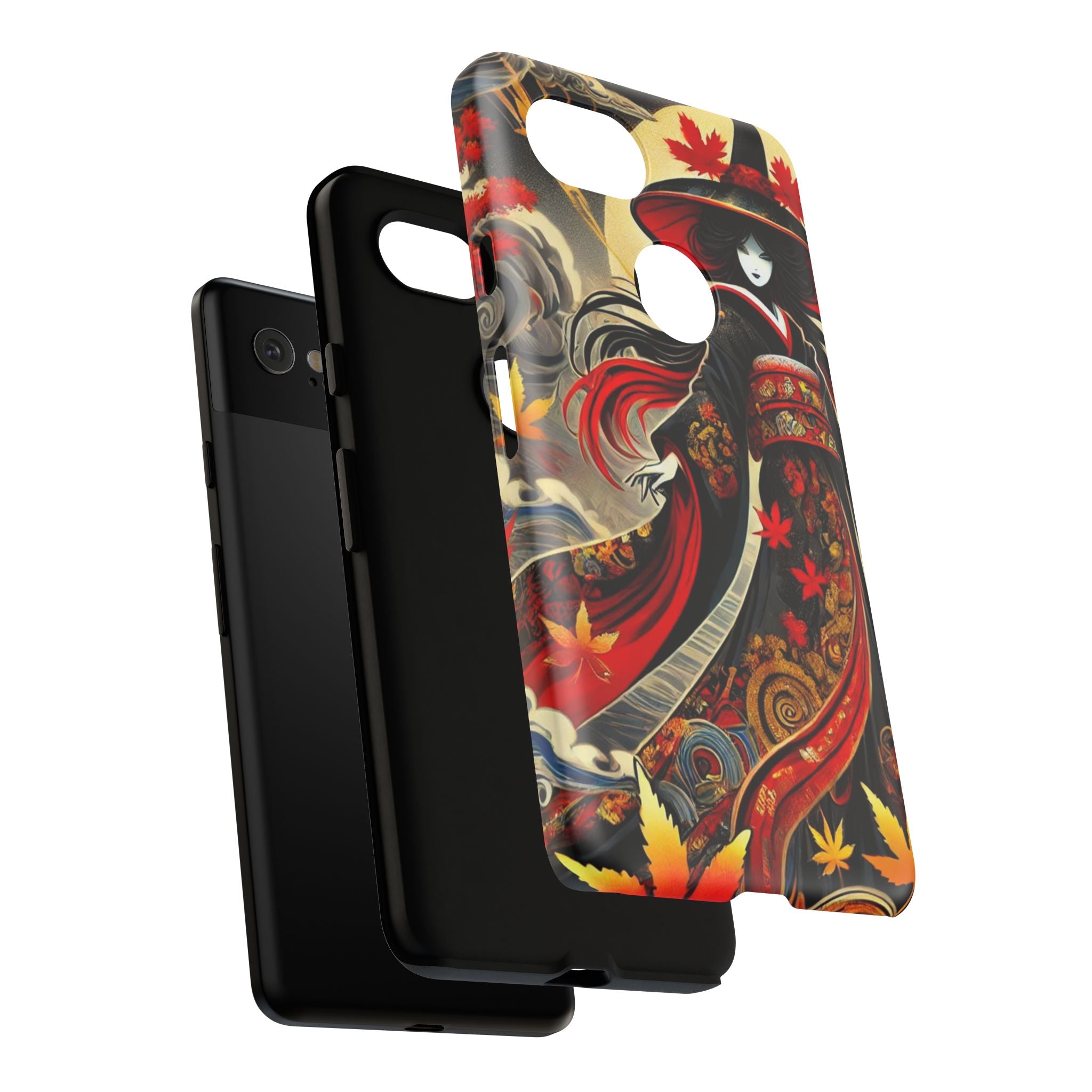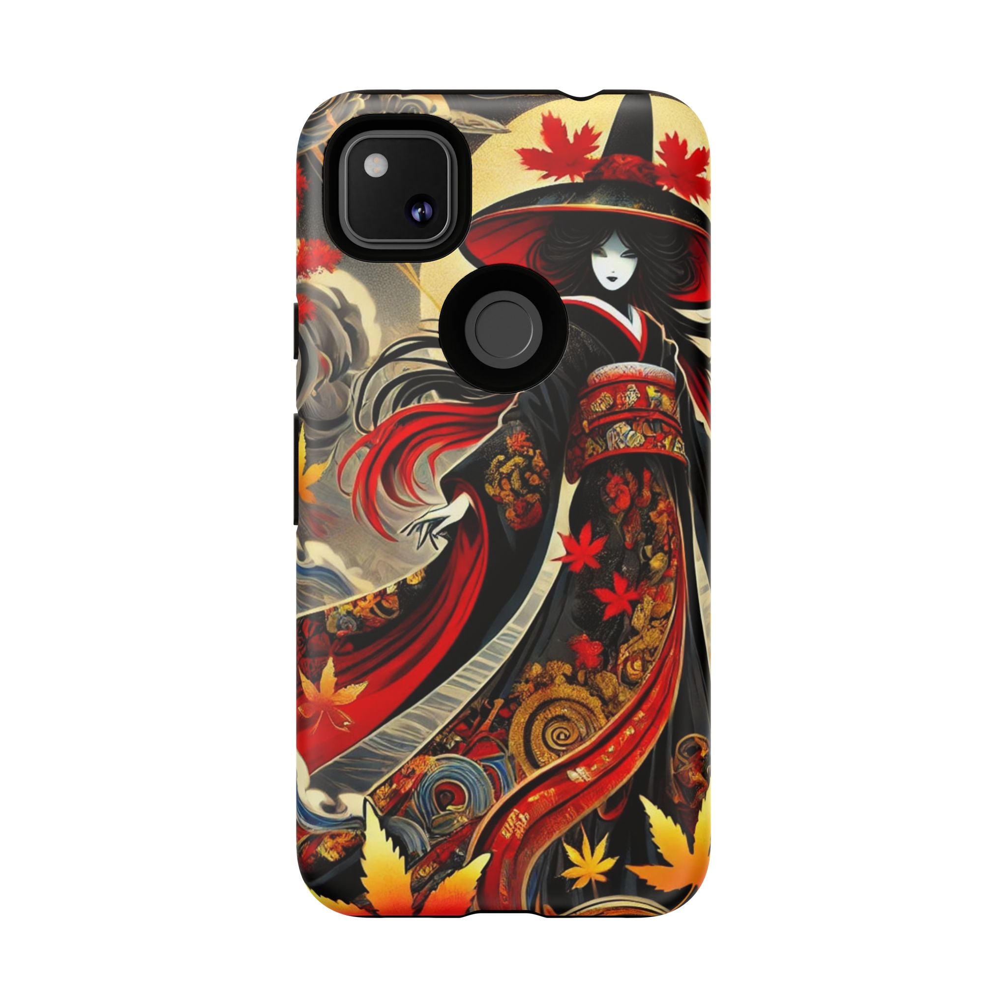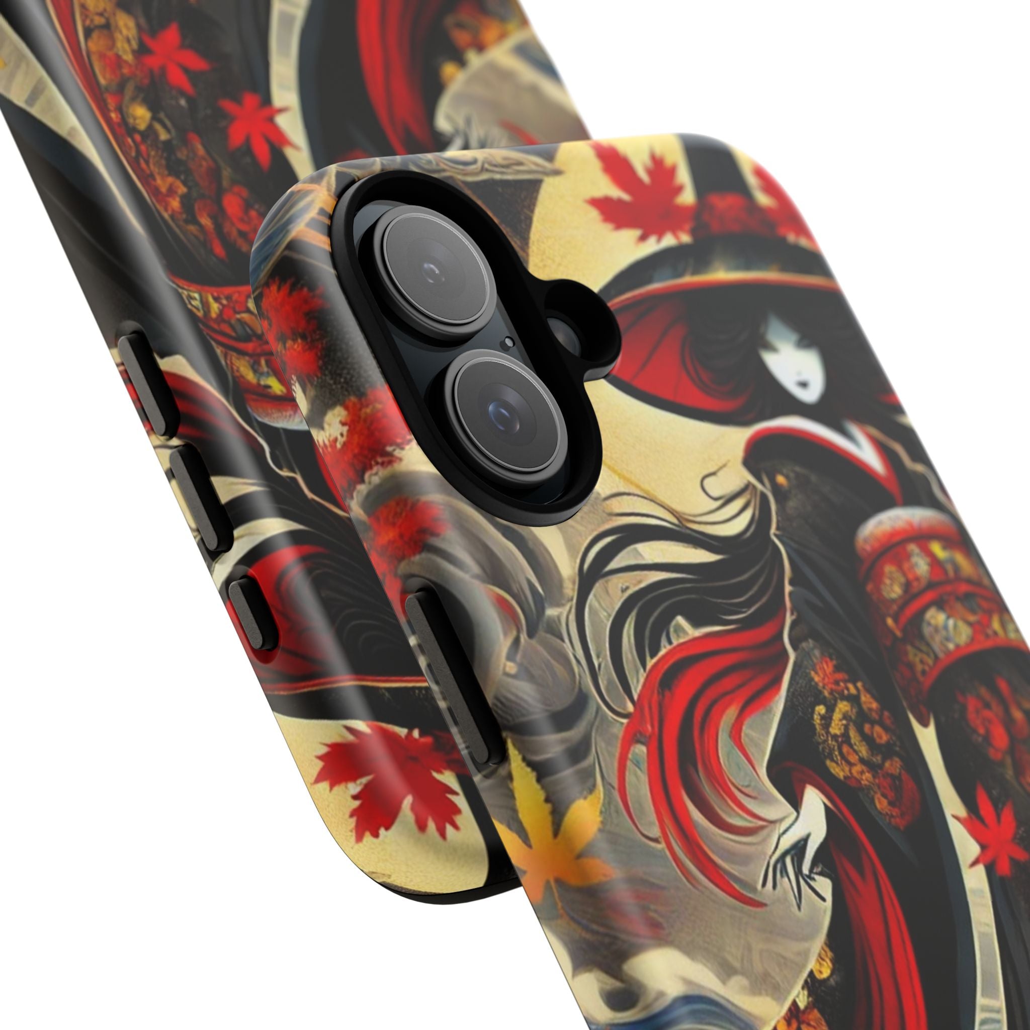 The case showcases a striking Kabuki-inspired witch in a towering red hat and flowing black kimono, detailed with golden storm clouds and fiery red maple leaves. Blending Japanese theater with Halloween mystique, it transforms everyday protection into a bold statement of art, fantasy, and elegance.