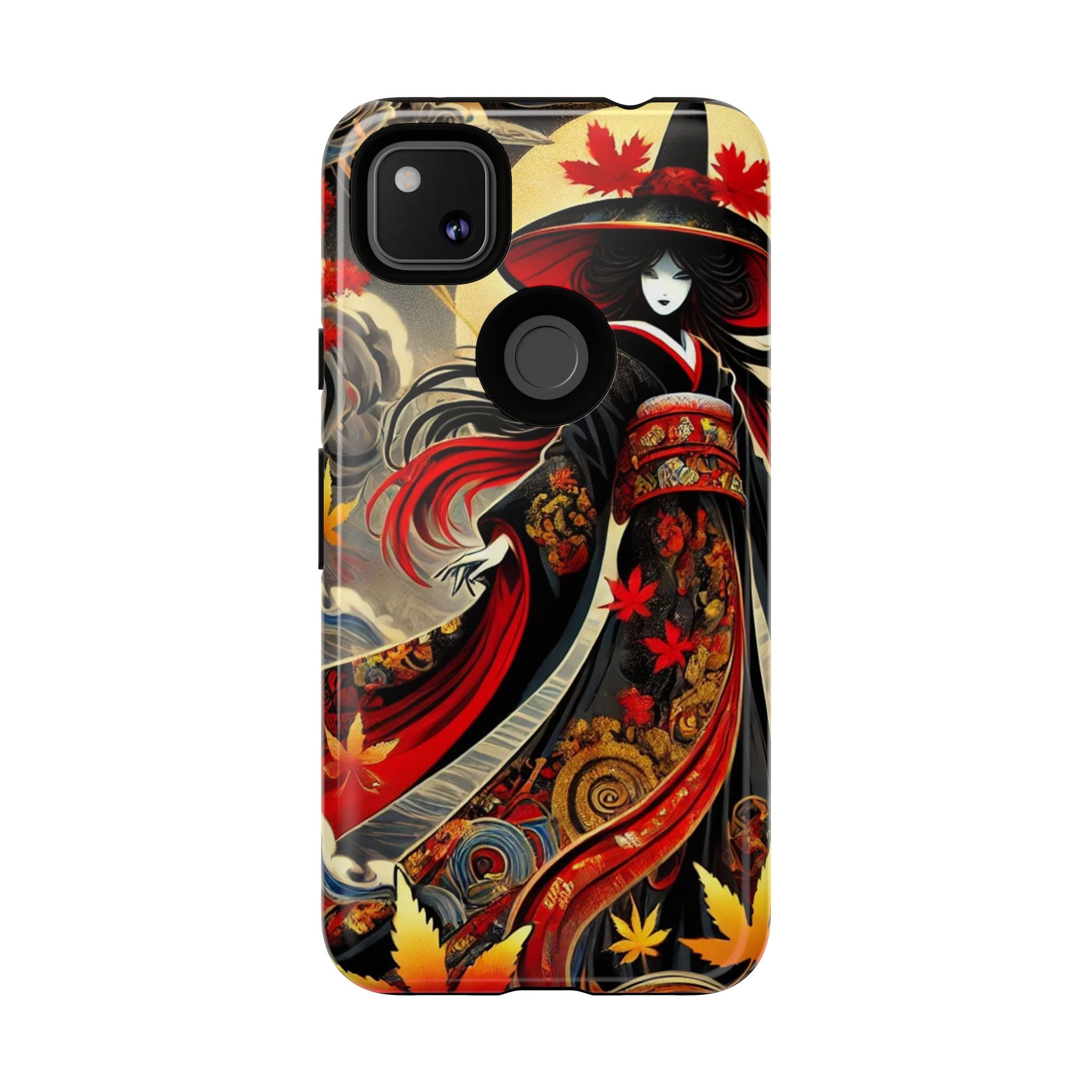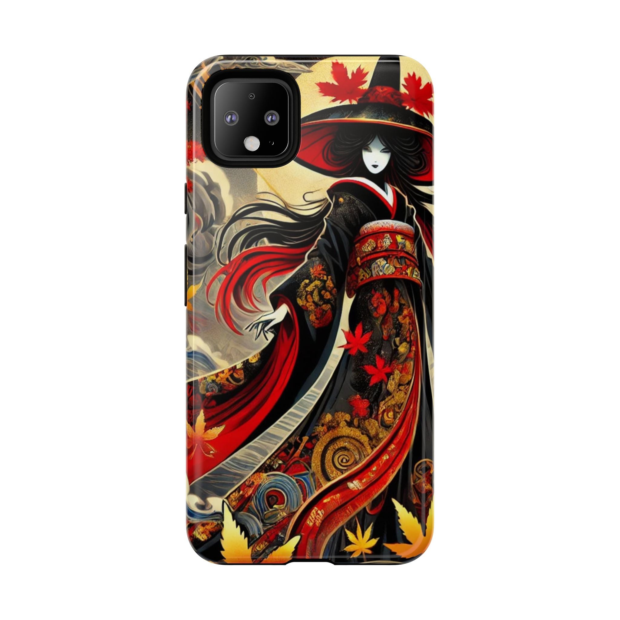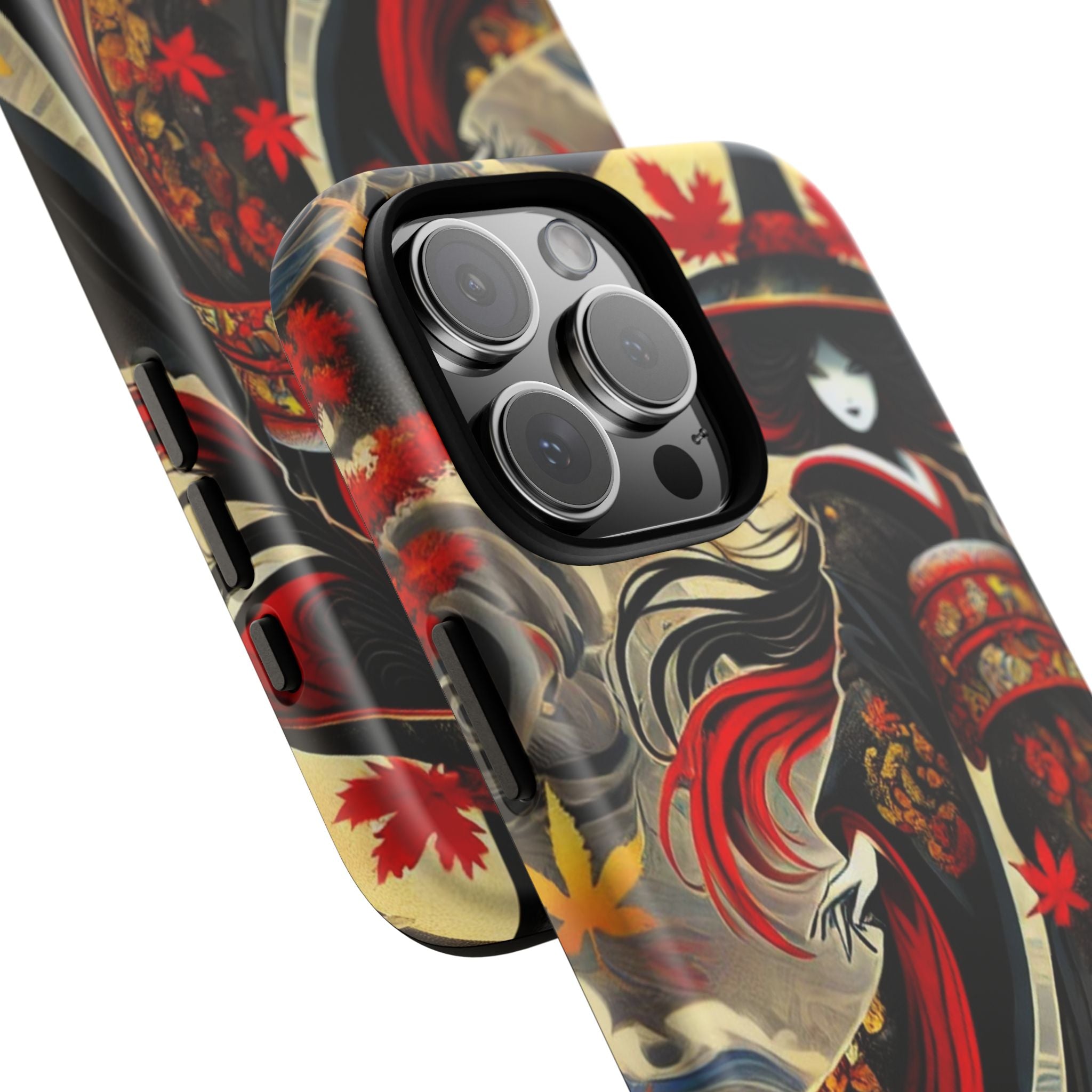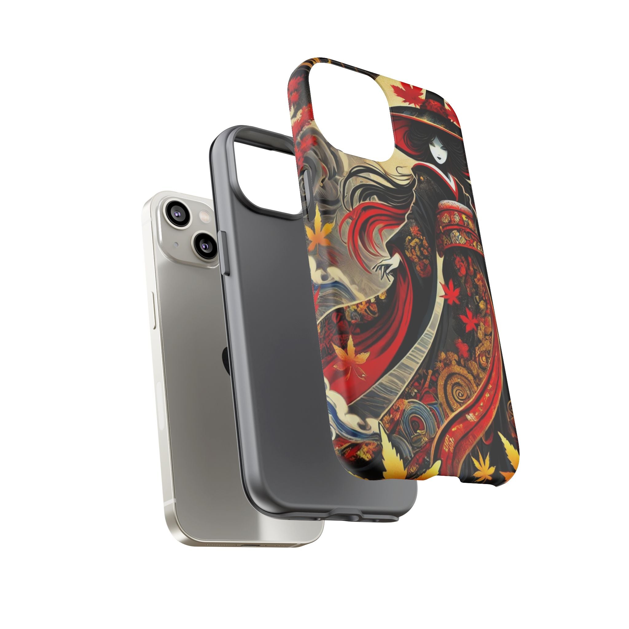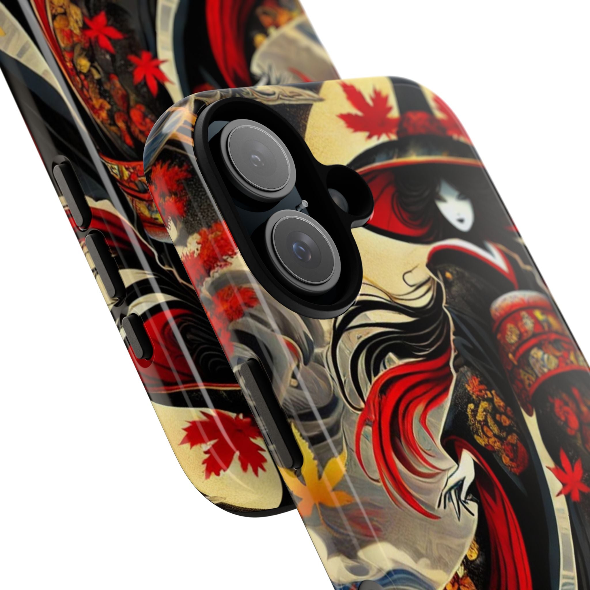 The case showcases a striking Kabuki-inspired witch in a towering red hat and flowing black kimono, detailed with golden storm clouds and fiery red maple leaves. Blending Japanese theater with Halloween mystique, it transforms everyday protection into a bold statement of art, fantasy, and elegance.