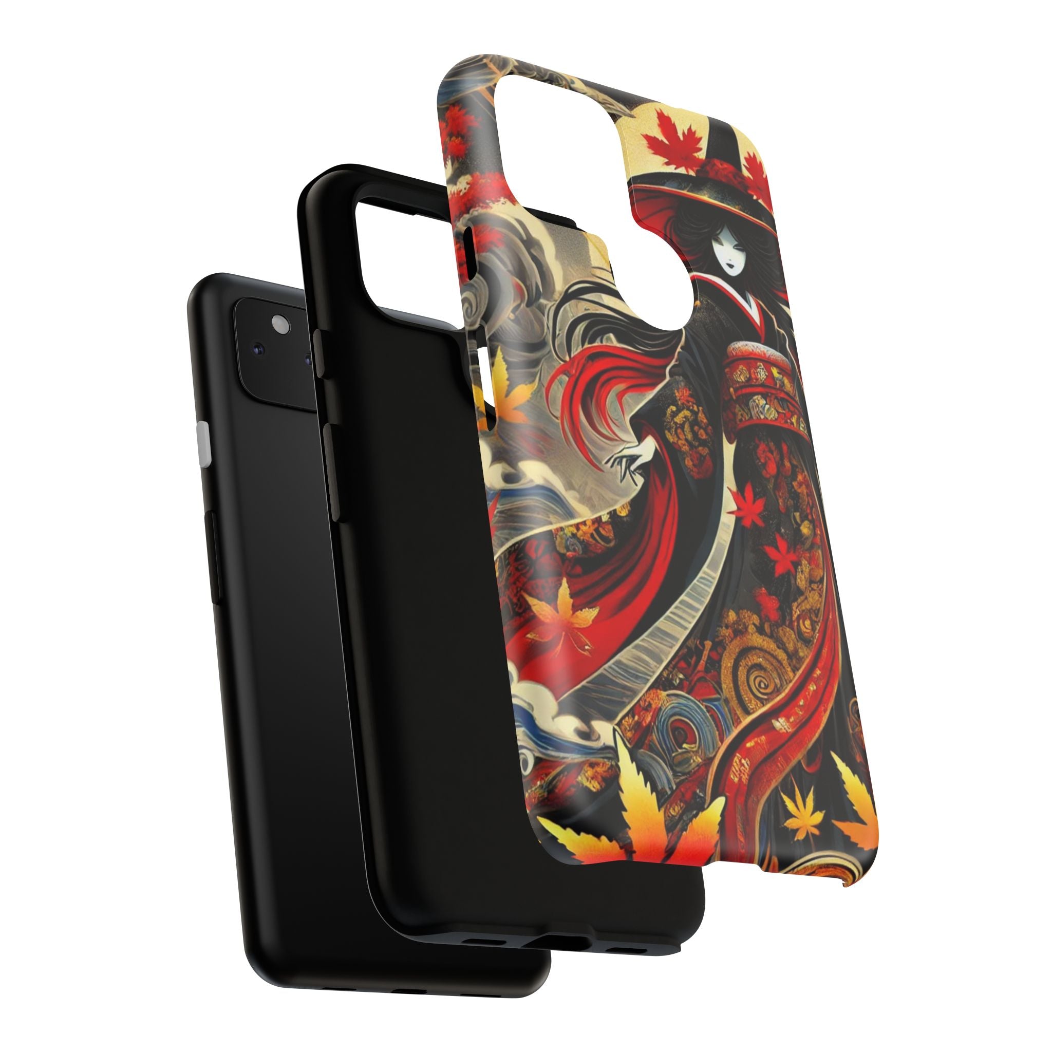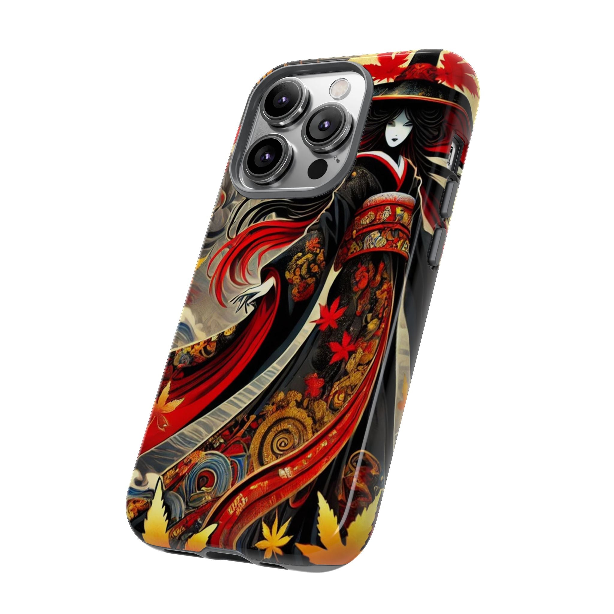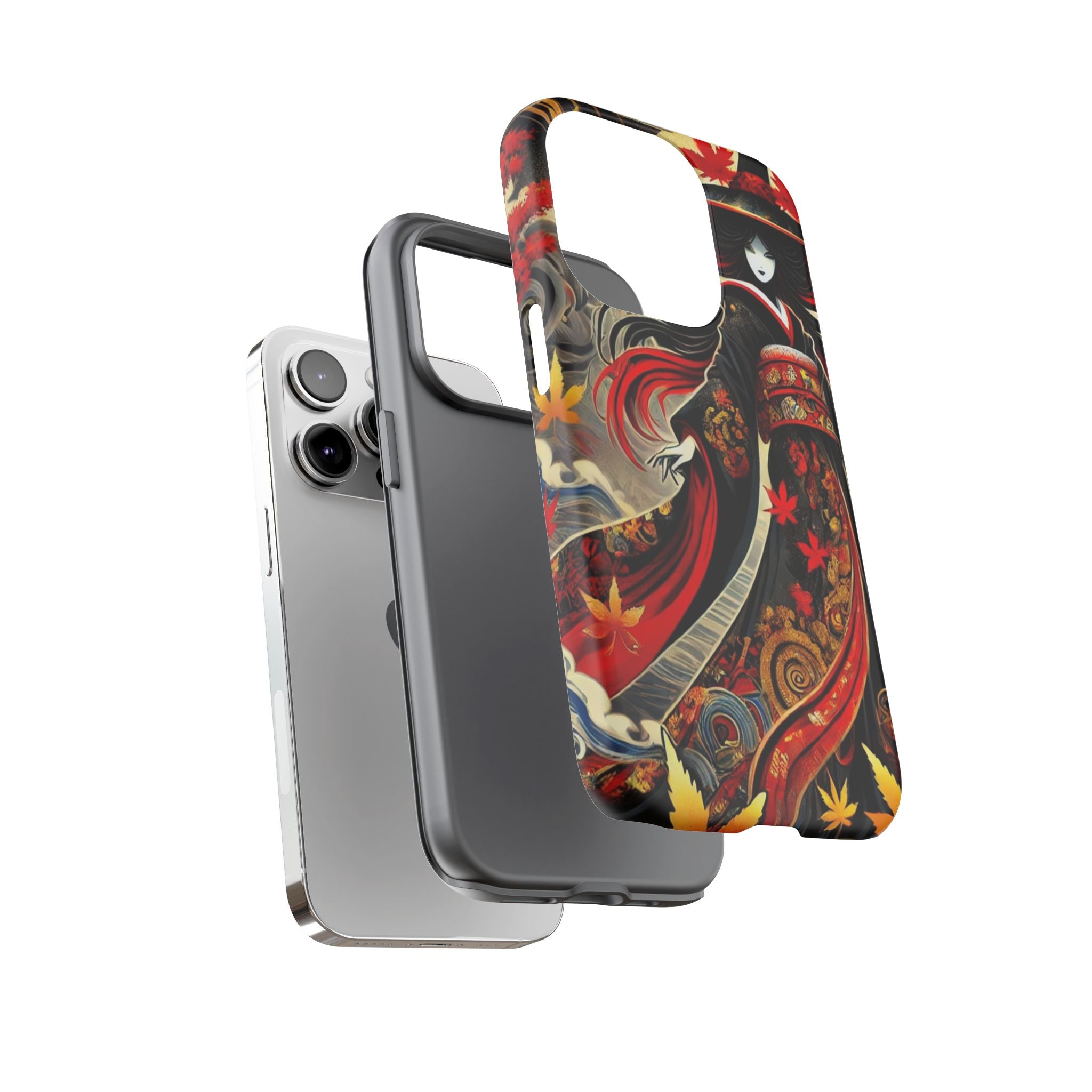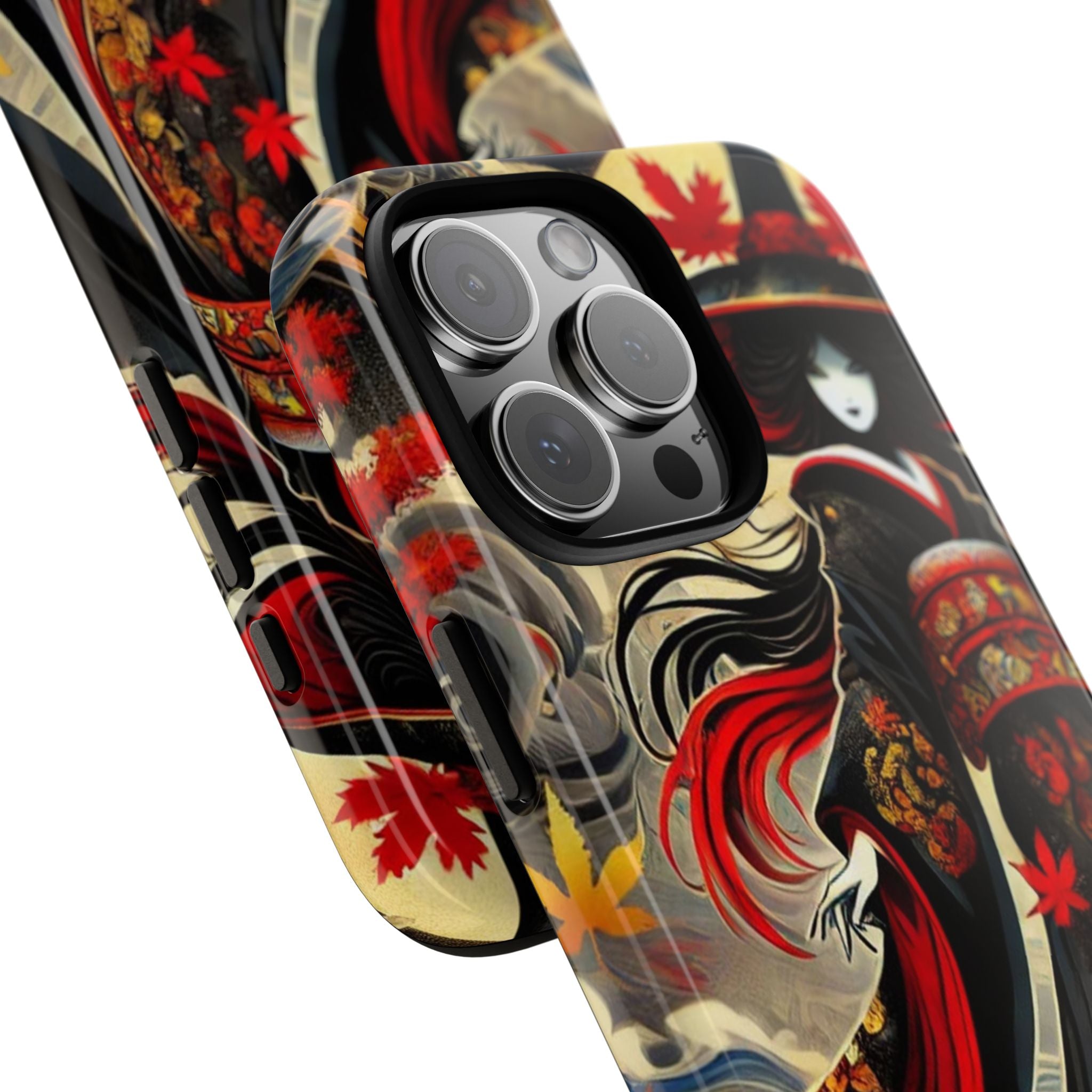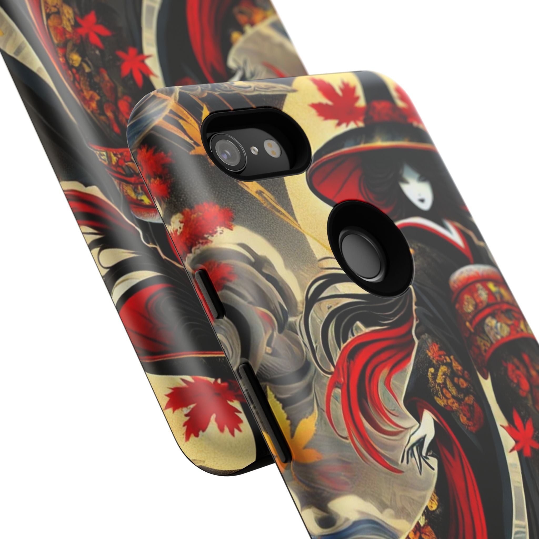 The case showcases a striking Kabuki-inspired witch in a towering red hat and flowing black kimono, detailed with golden storm clouds and fiery red maple leaves. Blending Japanese theater with Halloween mystique, it transforms everyday protection into a bold statement of art, fantasy, and elegance.