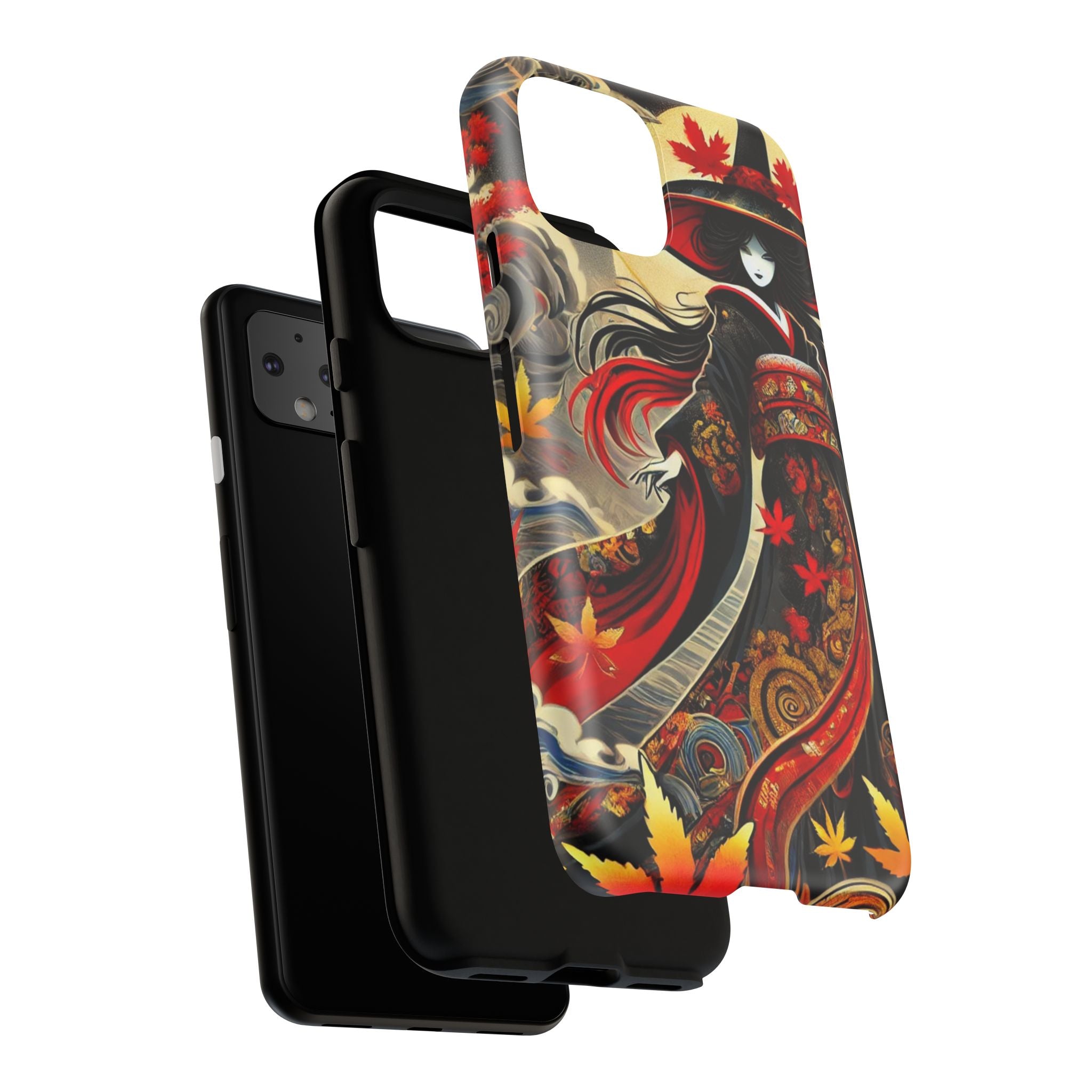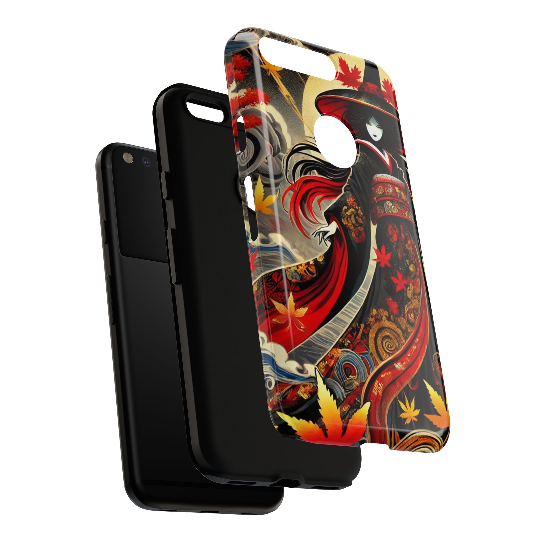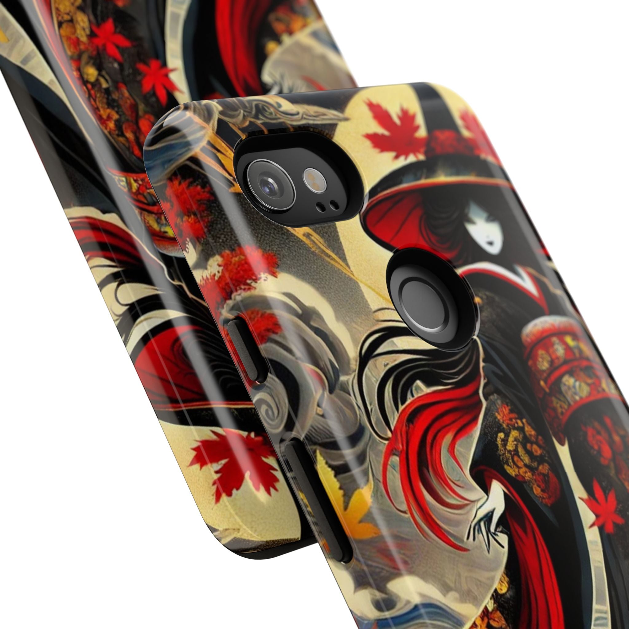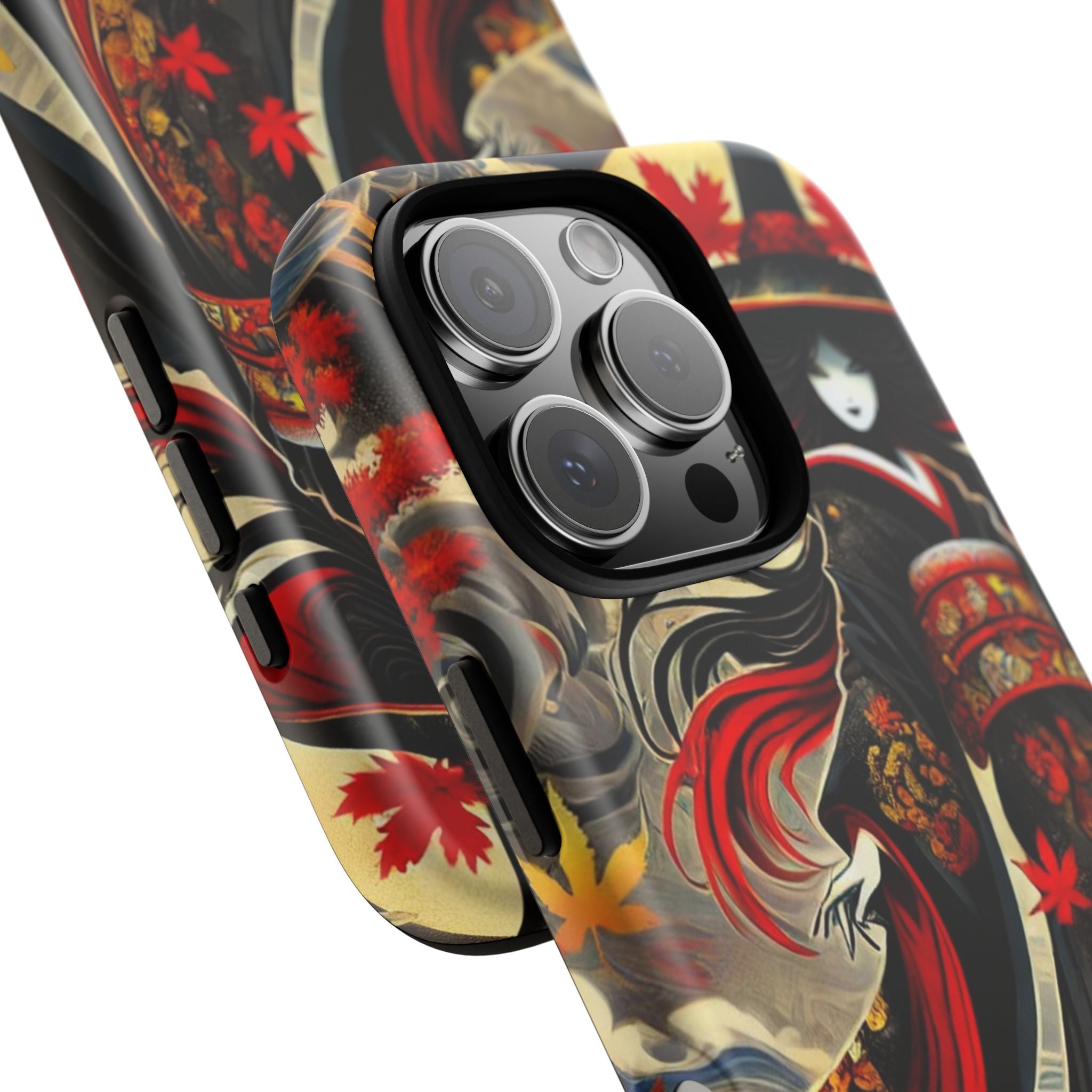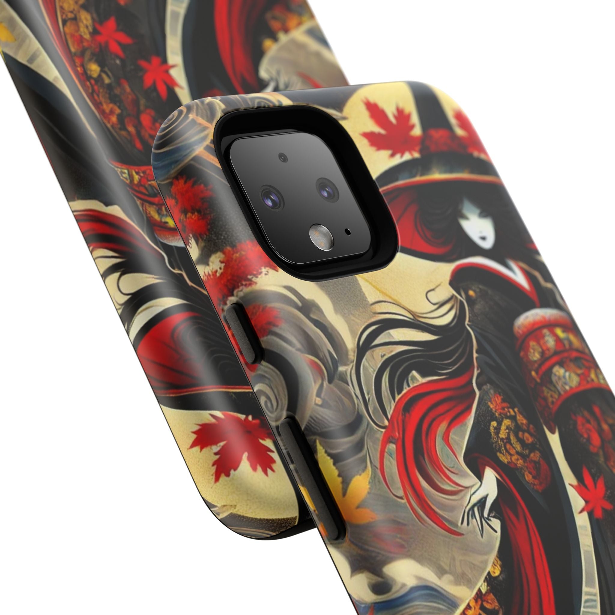 The case showcases a striking Kabuki-inspired witch in a towering red hat and flowing black kimono, detailed with golden storm clouds and fiery red maple leaves. Blending Japanese theater with Halloween mystique, it transforms everyday protection into a bold statement of art, fantasy, and elegance.