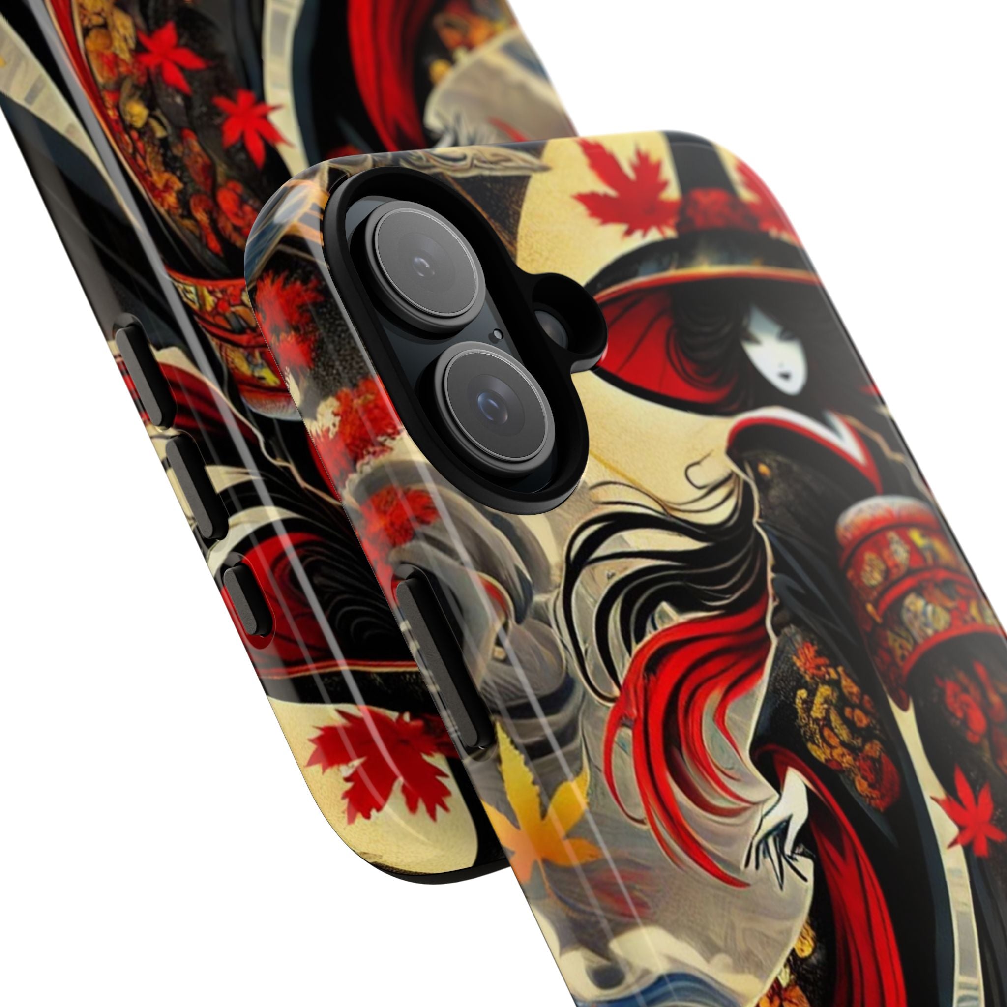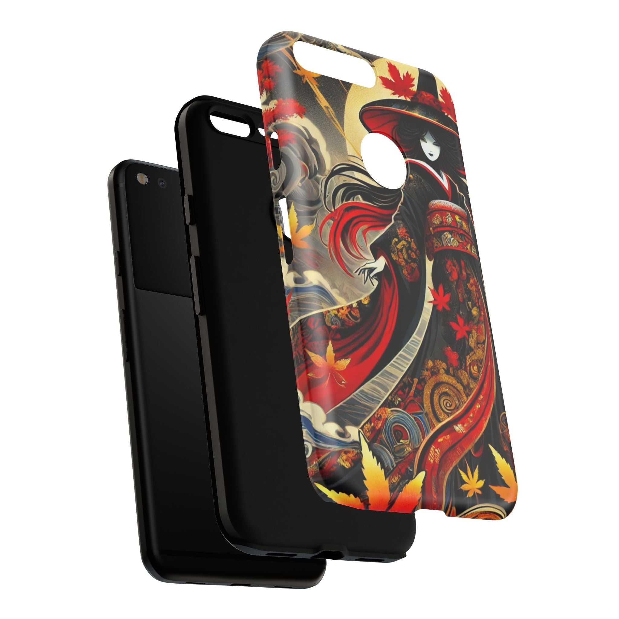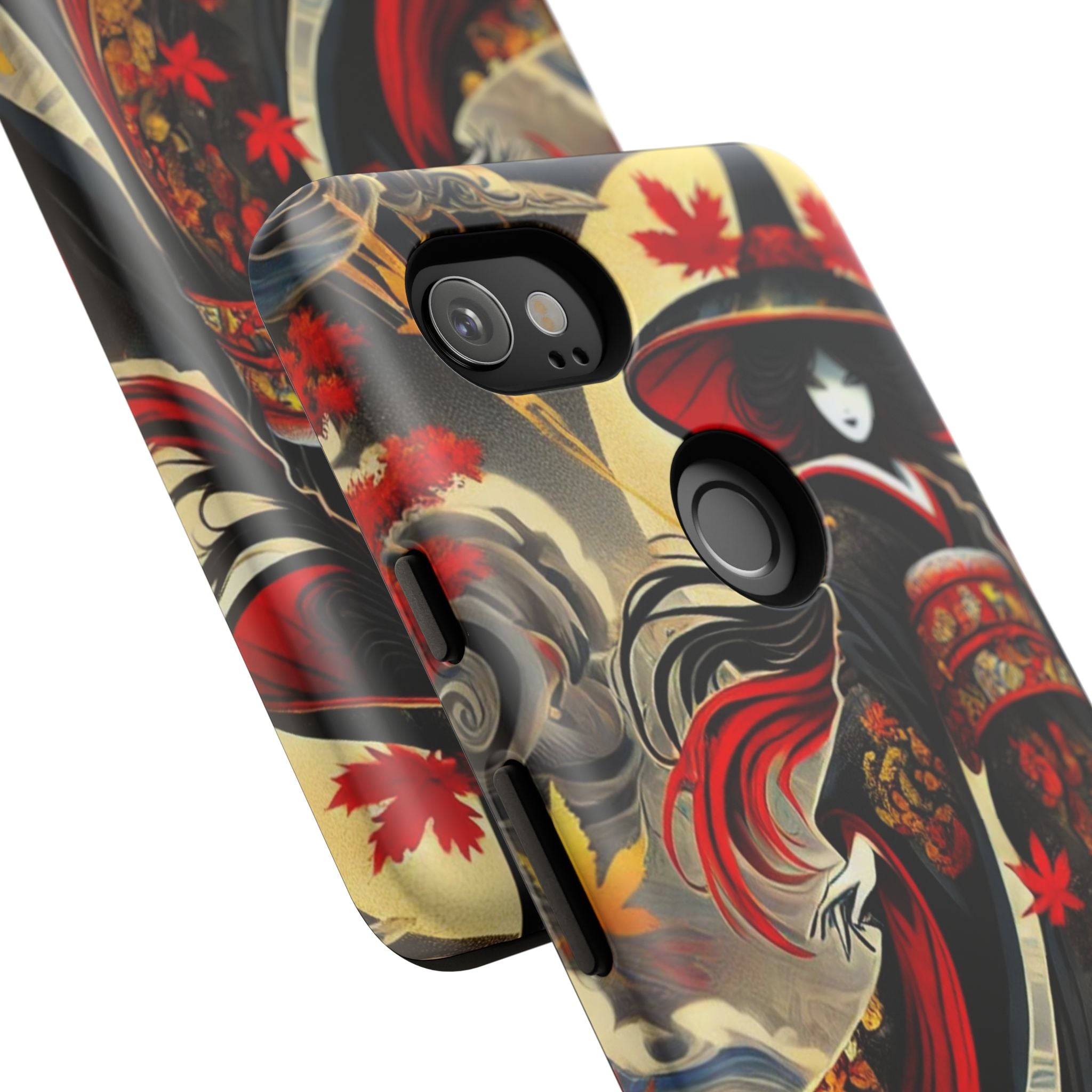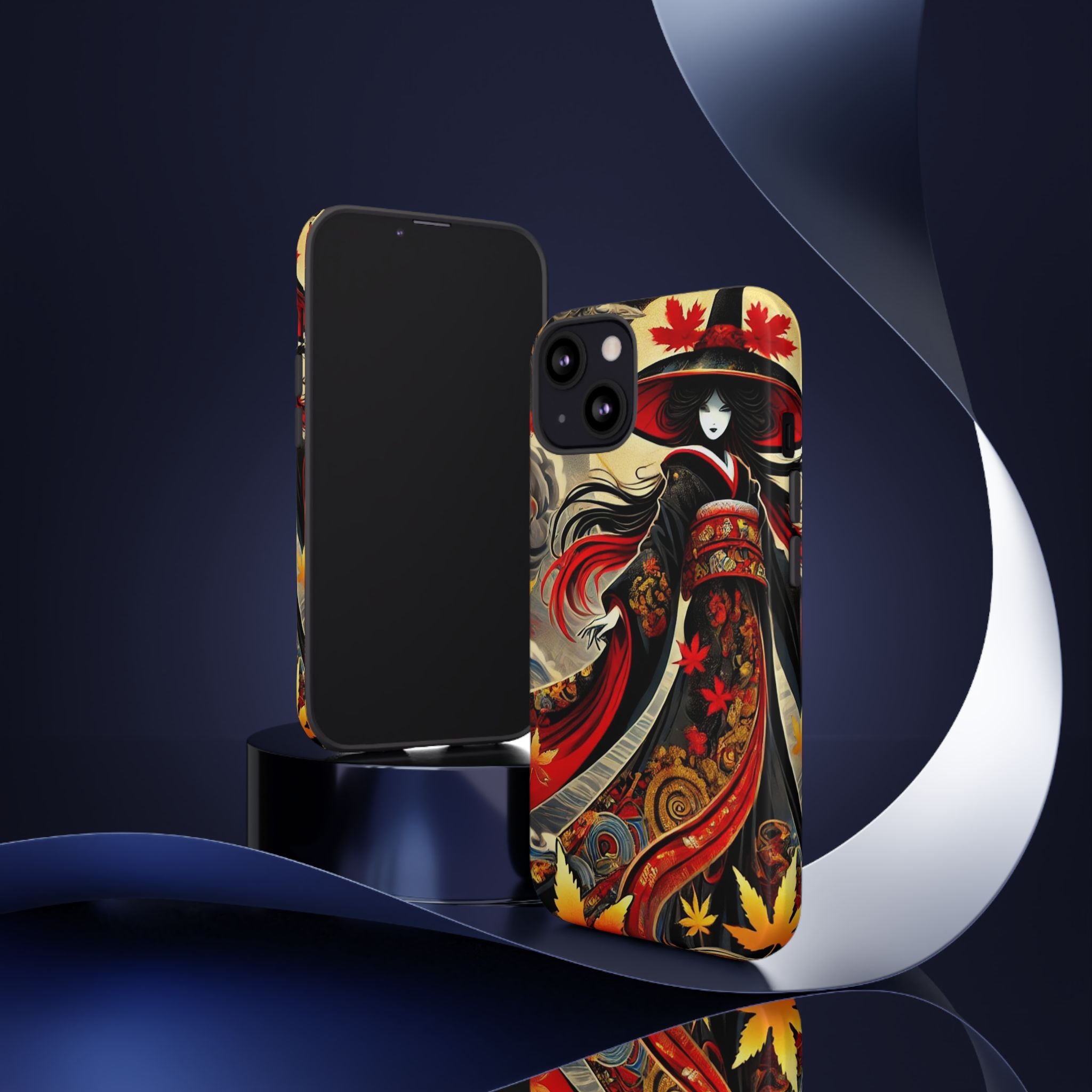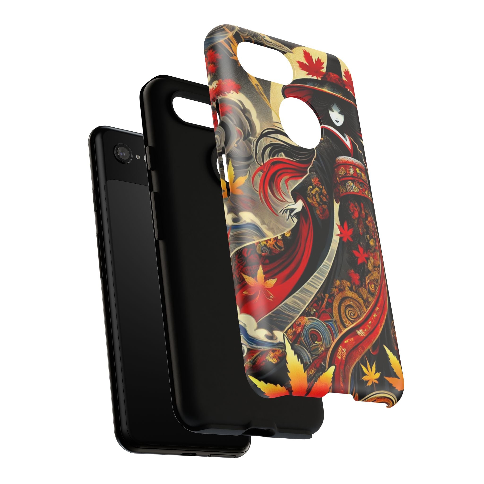 The case showcases a striking Kabuki-inspired witch in a towering red hat and flowing black kimono, detailed with golden storm clouds and fiery red maple leaves. Blending Japanese theater with Halloween mystique, it transforms everyday protection into a bold statement of art, fantasy, and elegance.