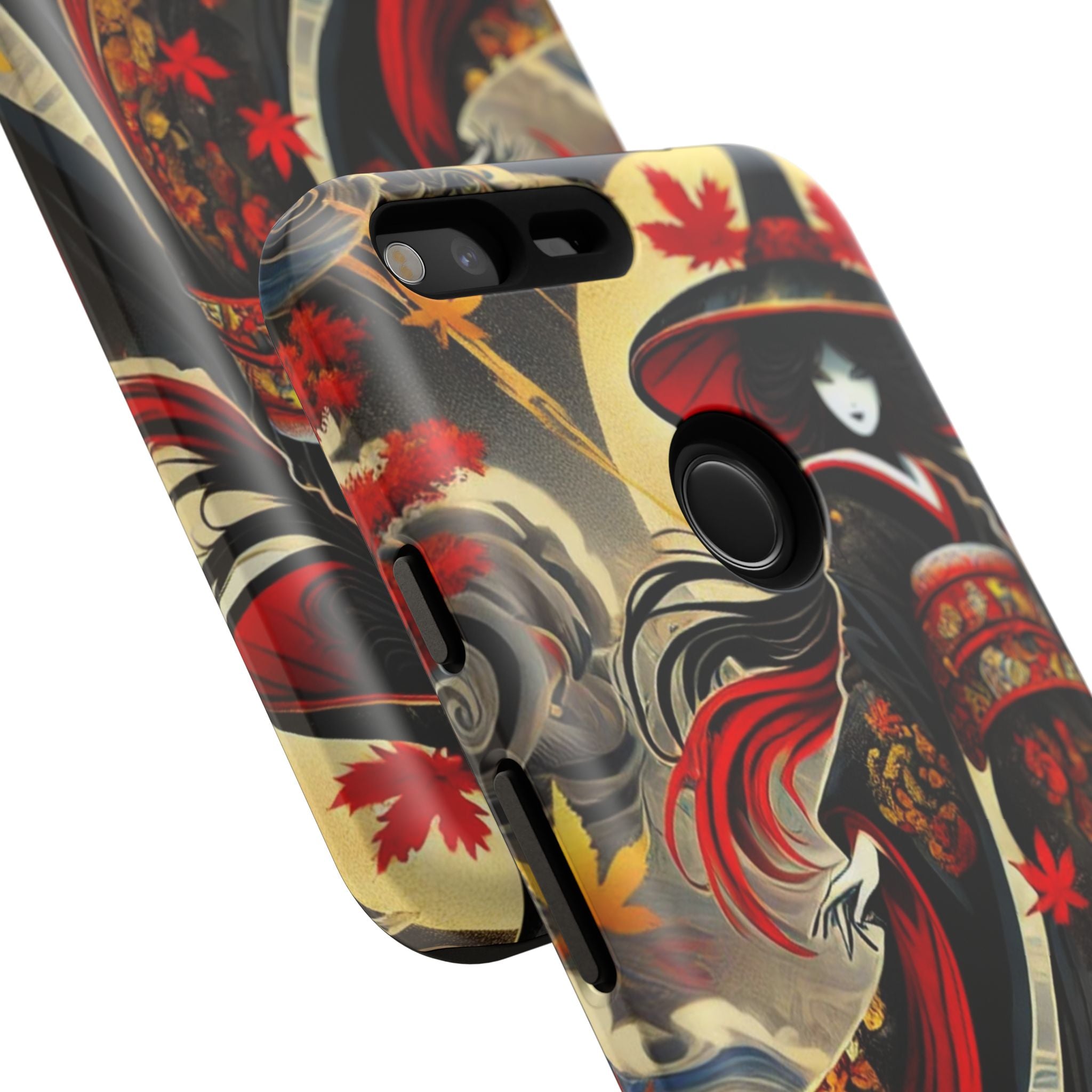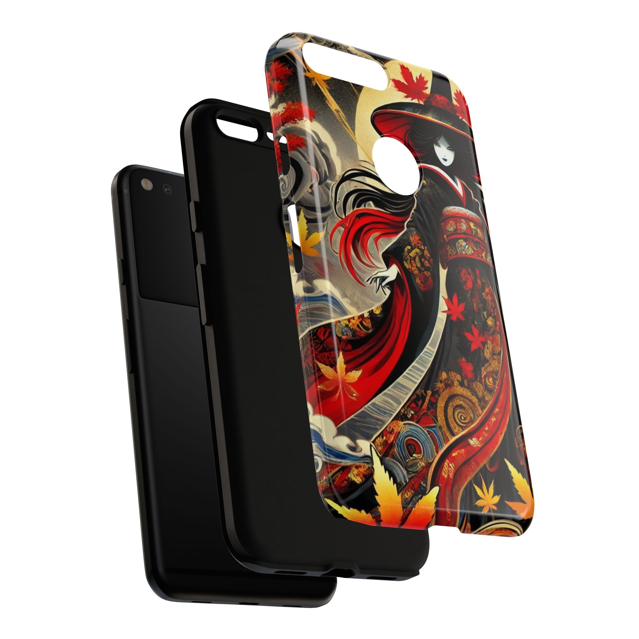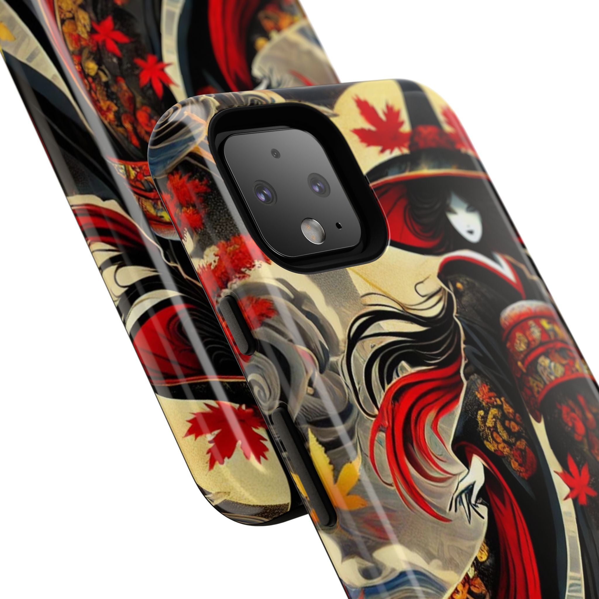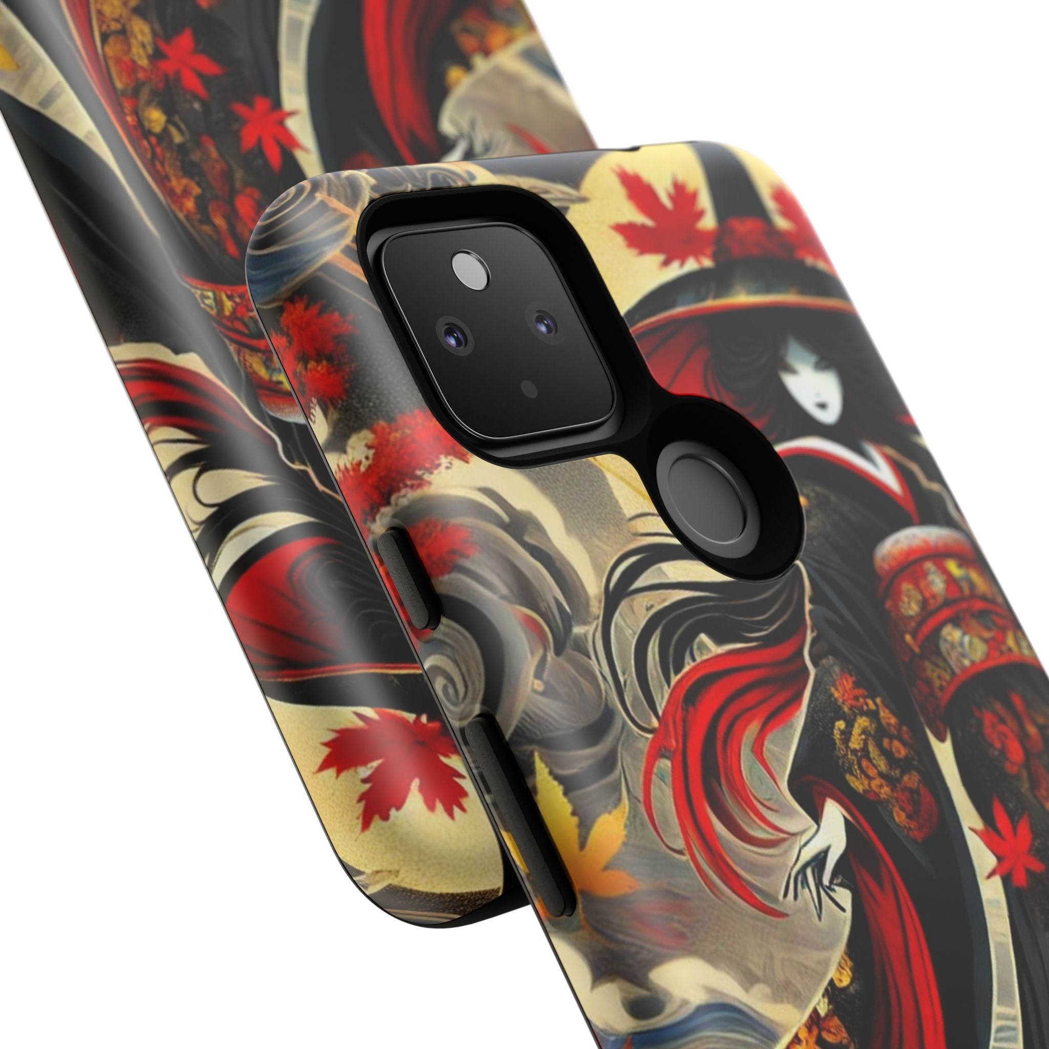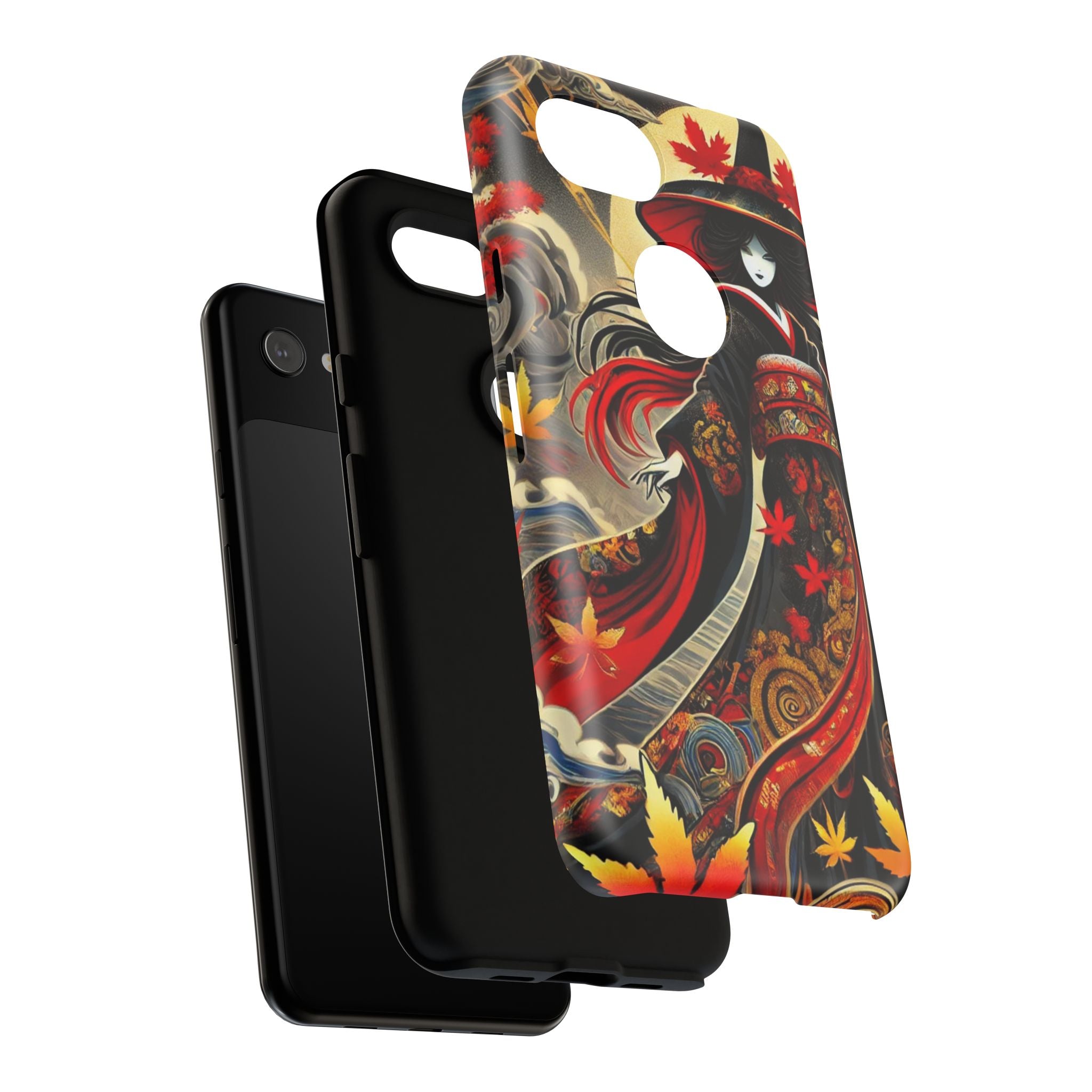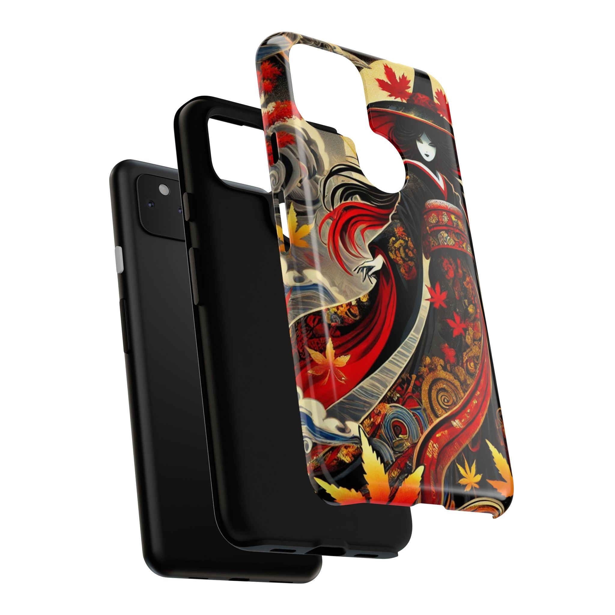 The case showcases a striking Kabuki-inspired witch in a towering red hat and flowing black kimono, detailed with golden storm clouds and fiery red maple leaves. Blending Japanese theater with Halloween mystique, it transforms everyday protection into a bold statement of art, fantasy, and elegance.