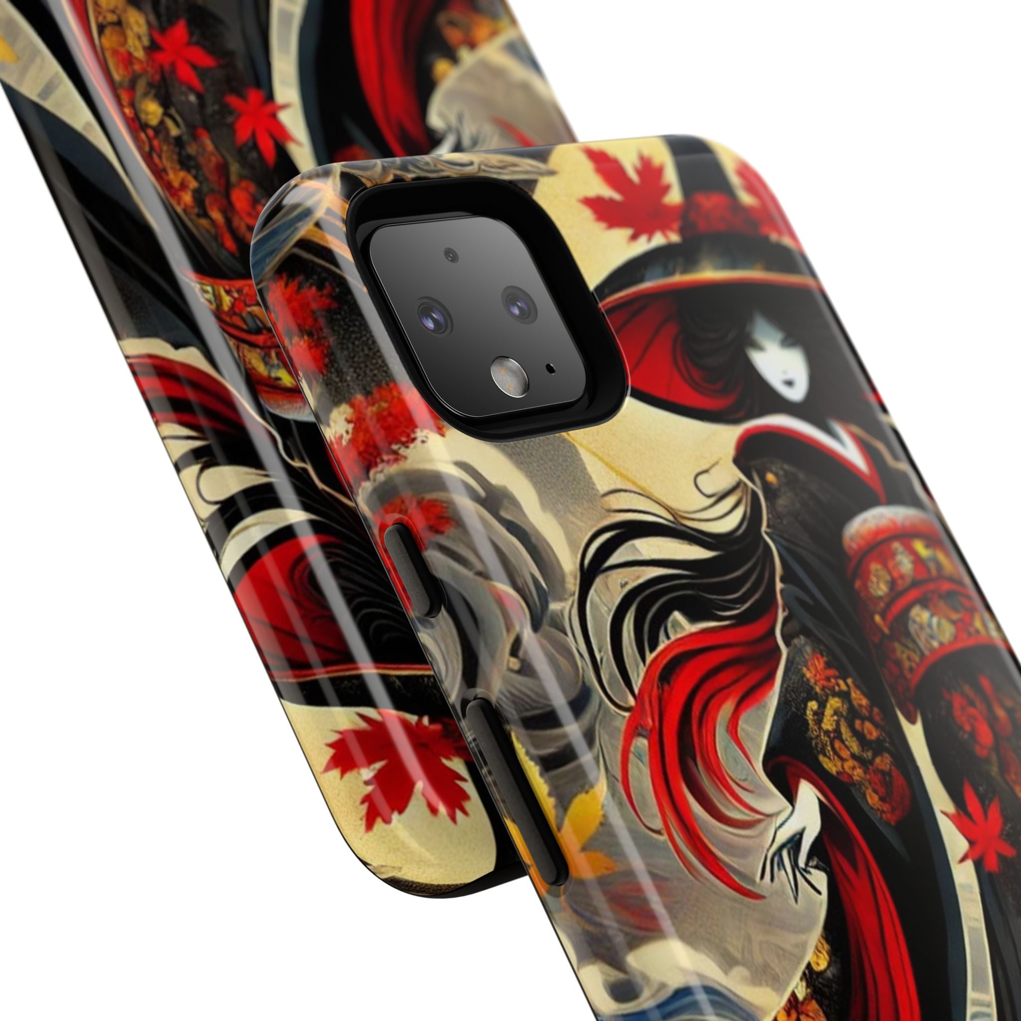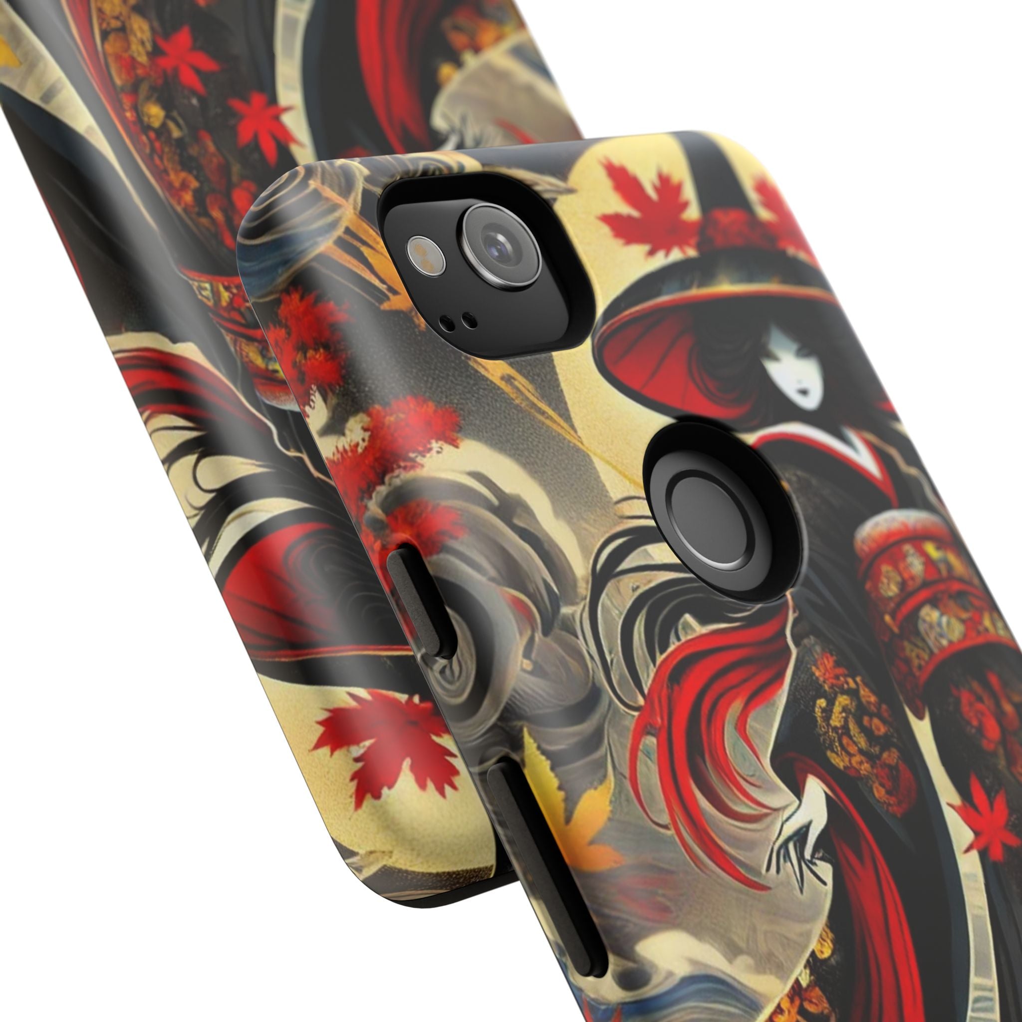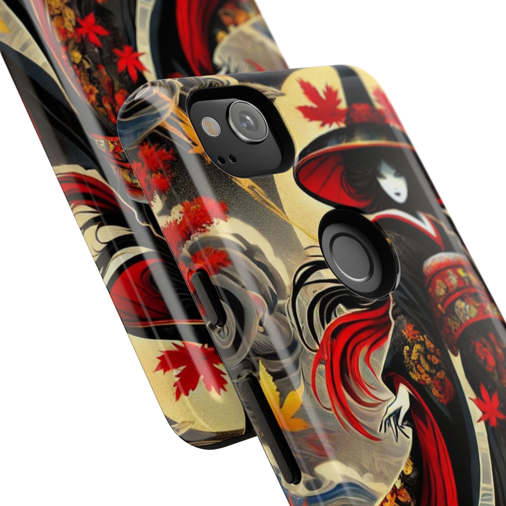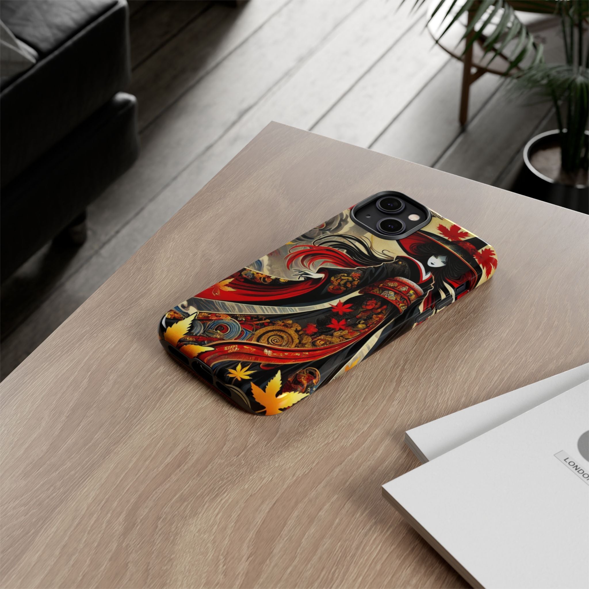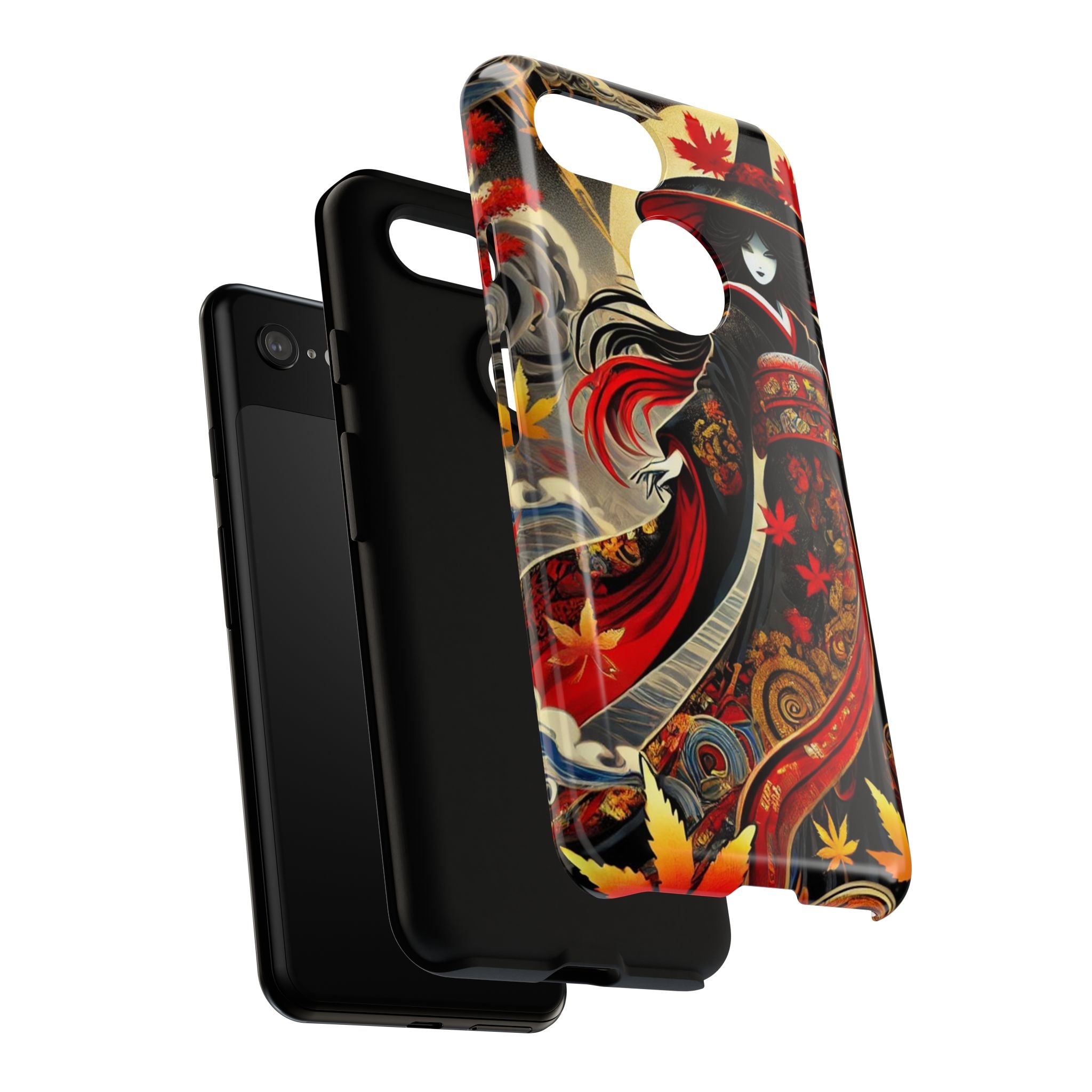 The case showcases a striking Kabuki-inspired witch in a towering red hat and flowing black kimono, detailed with golden storm clouds and fiery red maple leaves. Blending Japanese theater with Halloween mystique, it transforms everyday protection into a bold statement of art, fantasy, and elegance.