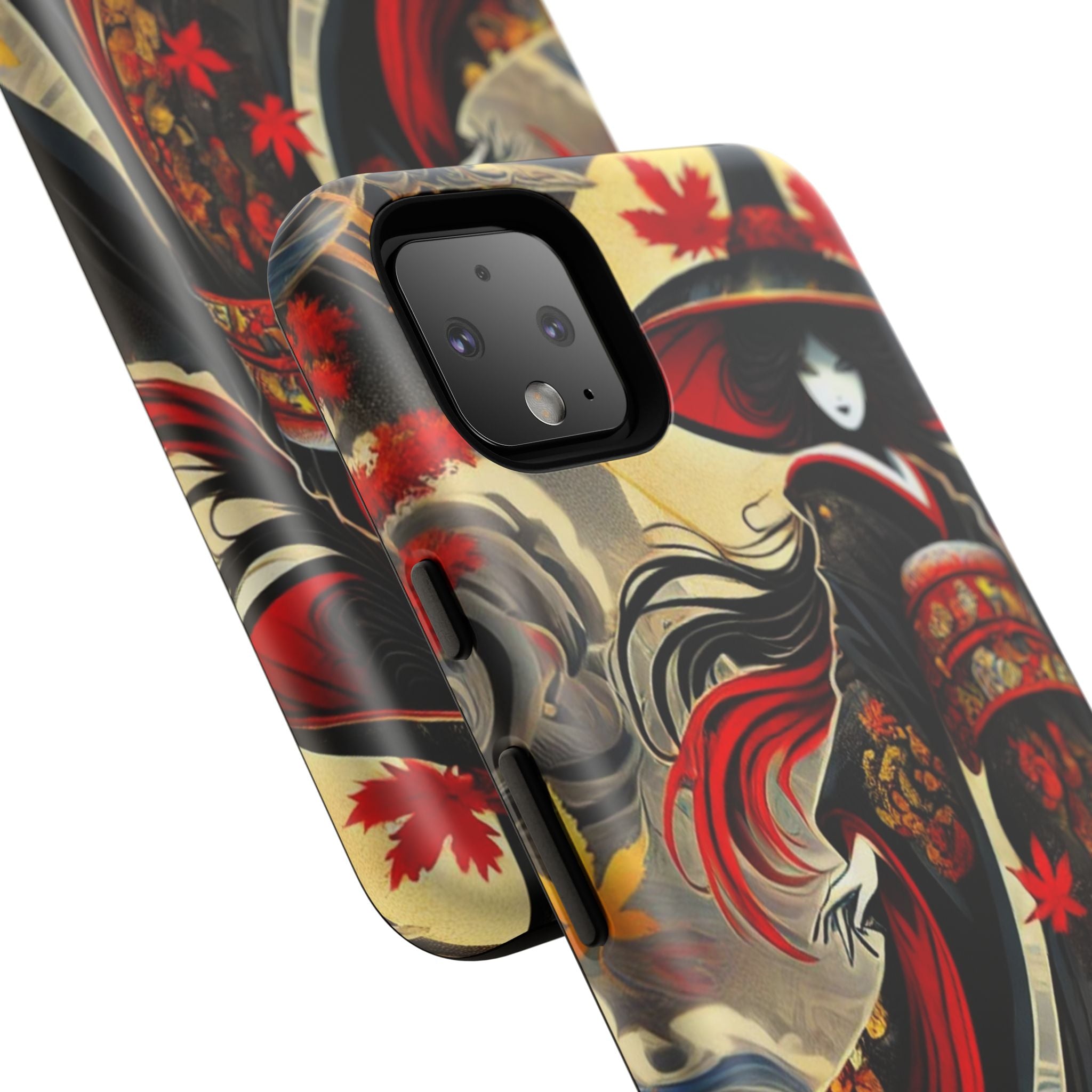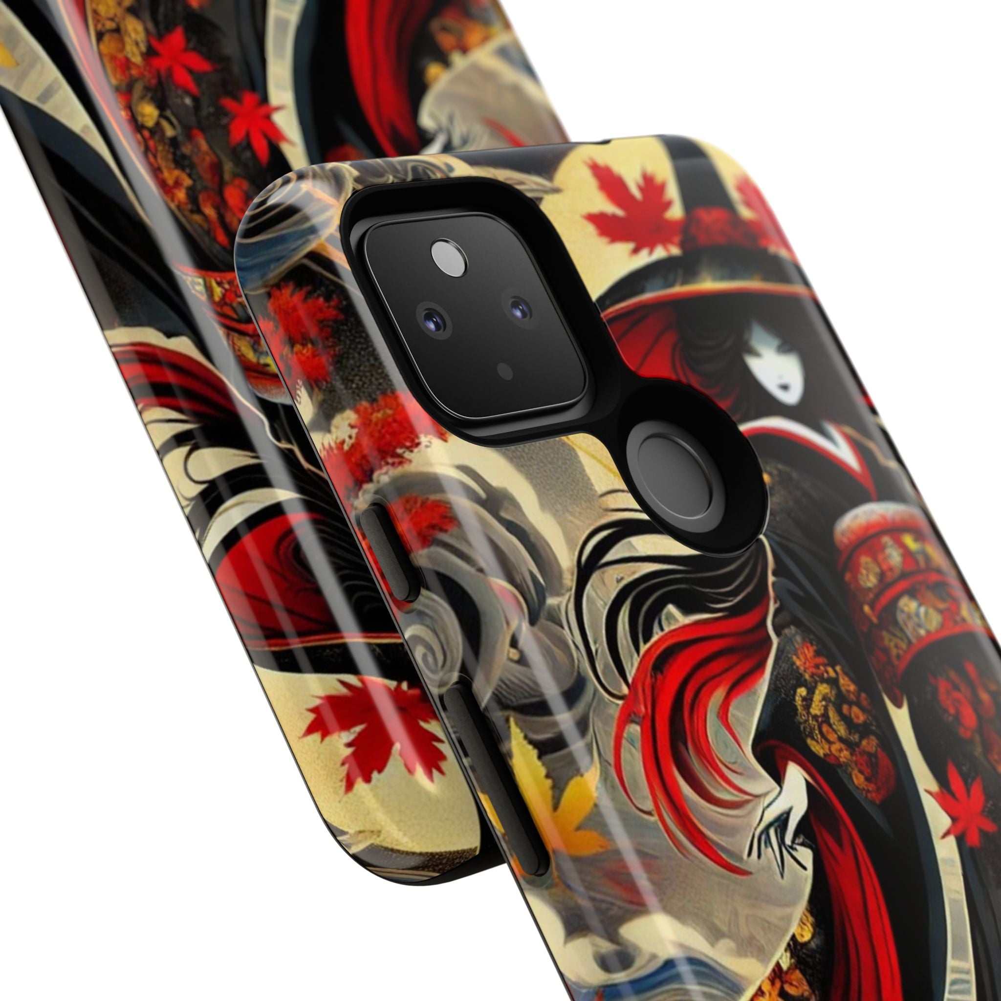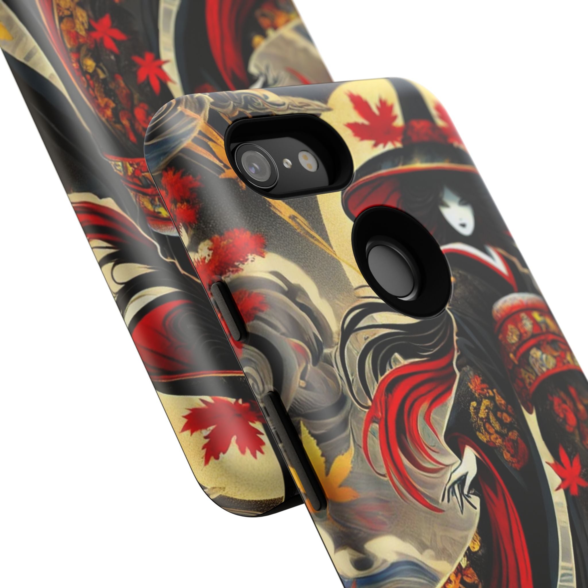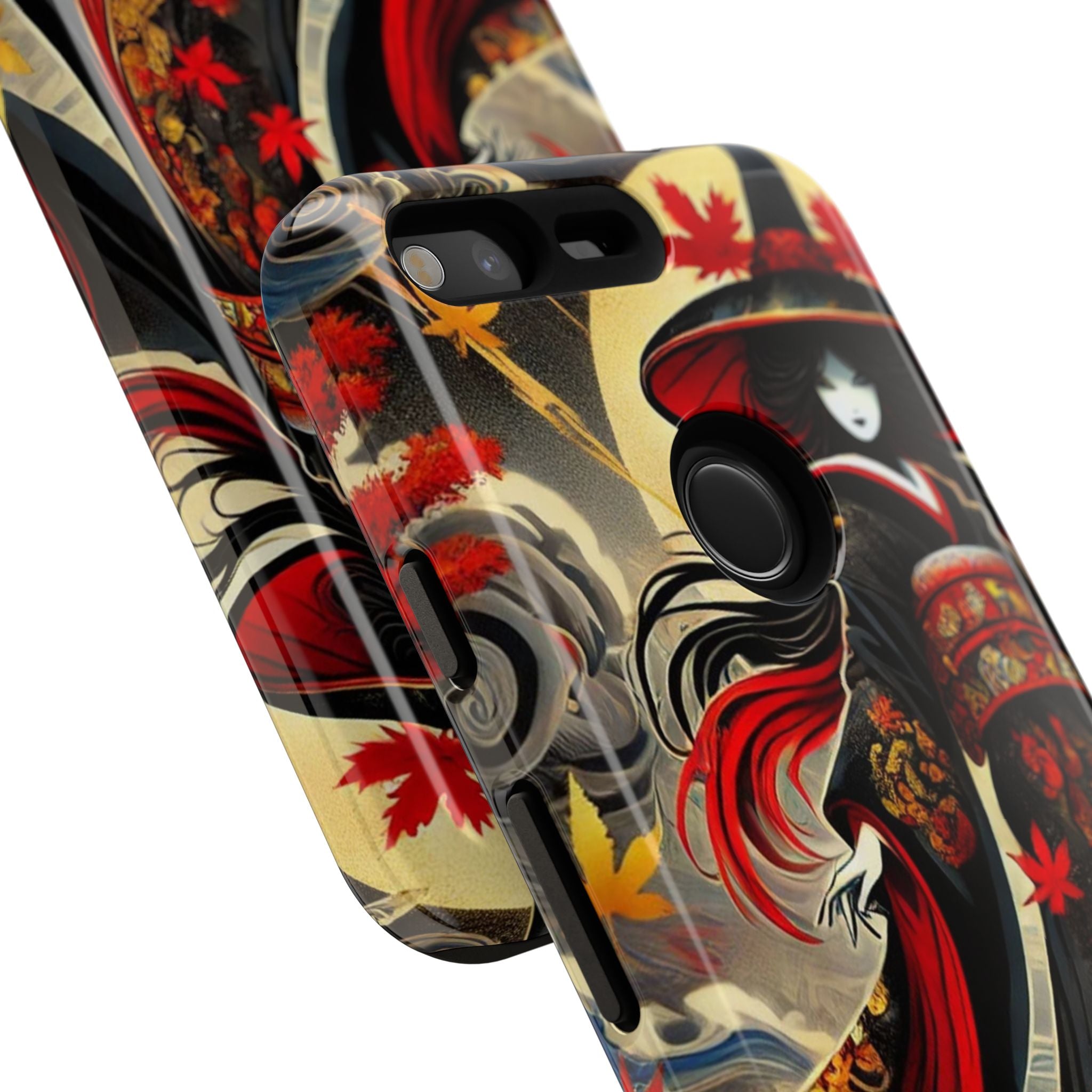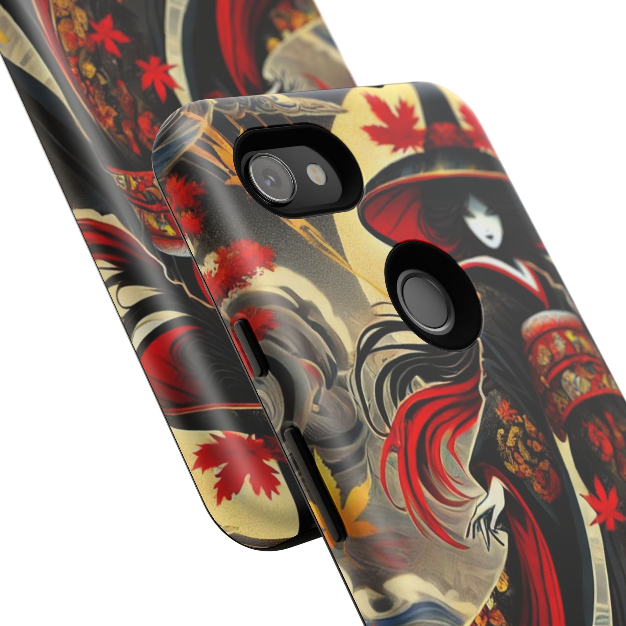 The case showcases a striking Kabuki-inspired witch in a towering red hat and flowing black kimono, detailed with golden storm clouds and fiery red maple leaves. Blending Japanese theater with Halloween mystique, it transforms everyday protection into a bold statement of art, fantasy, and elegance.