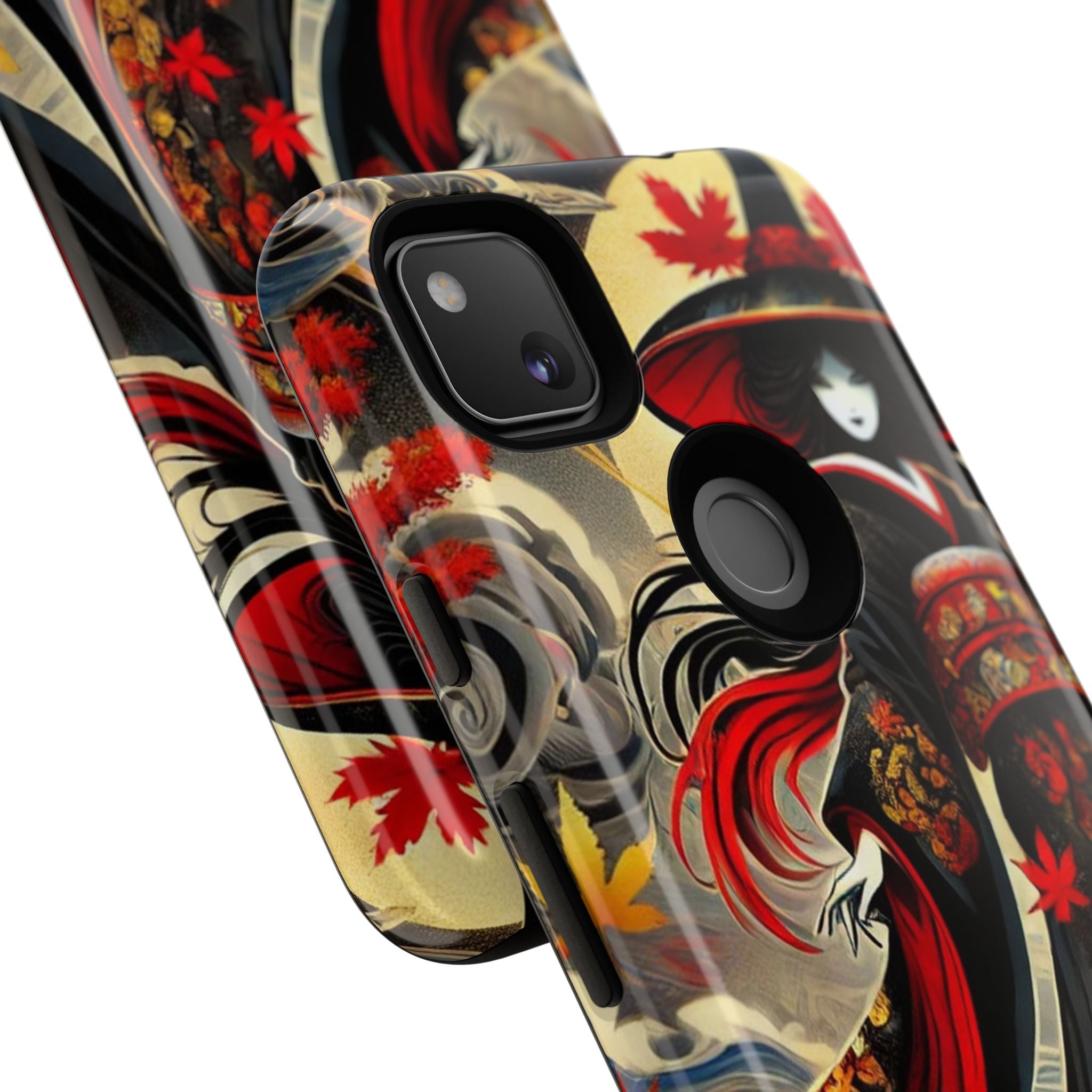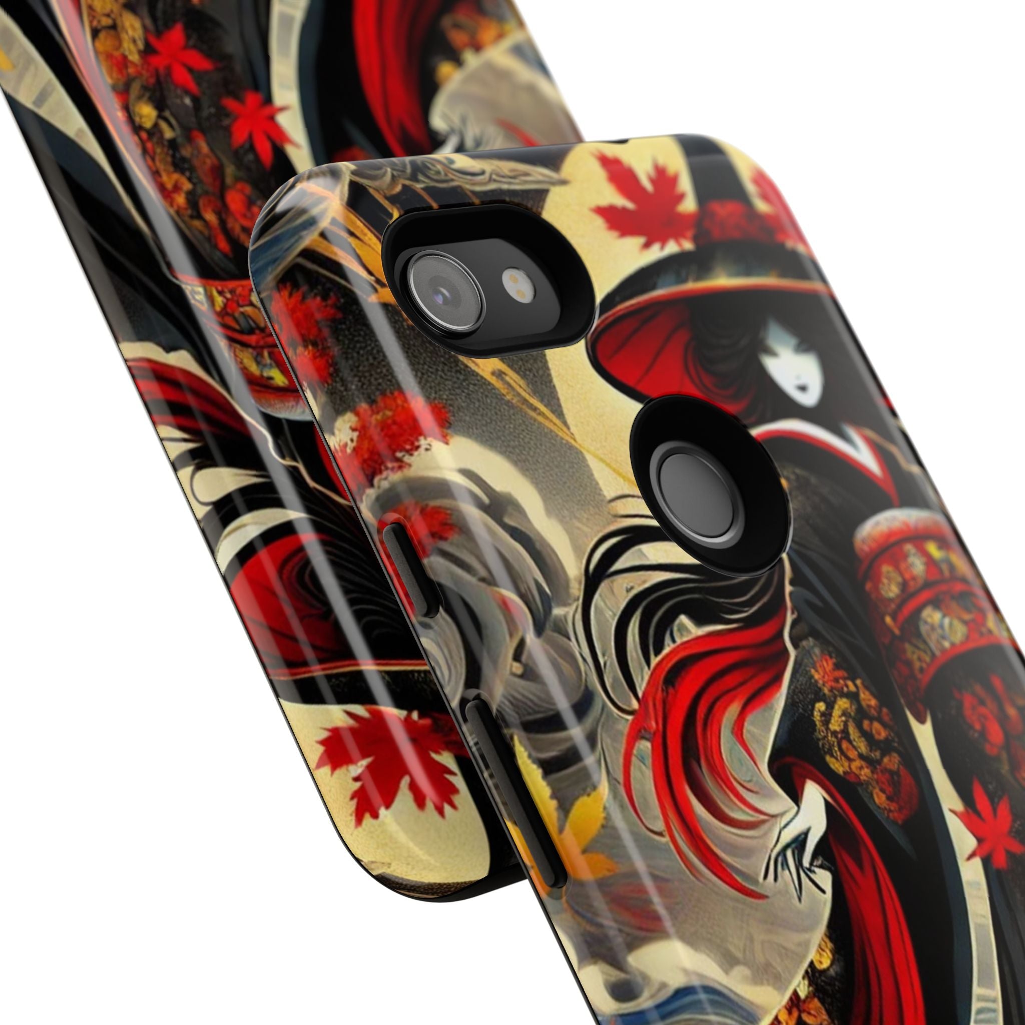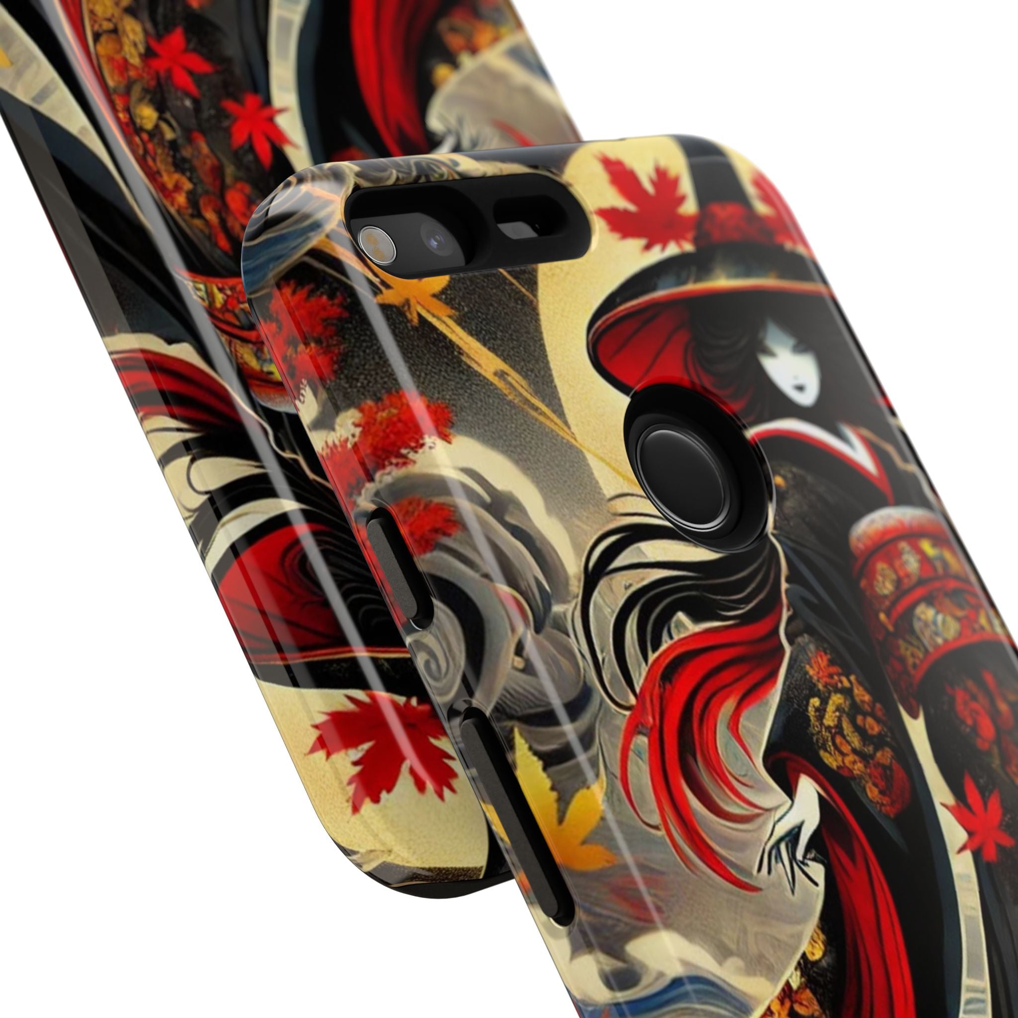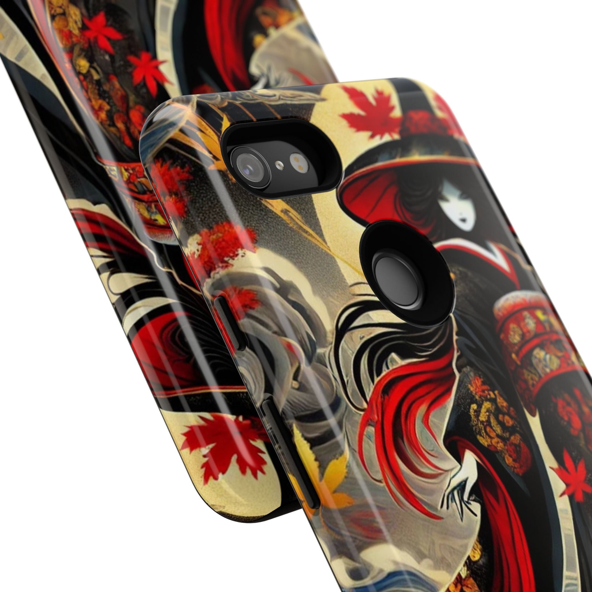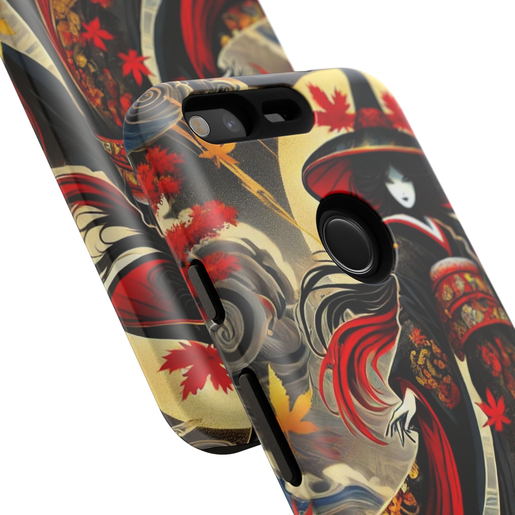 The case showcases a striking Kabuki-inspired witch in a towering red hat and flowing black kimono, detailed with golden storm clouds and fiery red maple leaves. Blending Japanese theater with Halloween mystique, it transforms everyday protection into a bold statement of art, fantasy, and elegance.