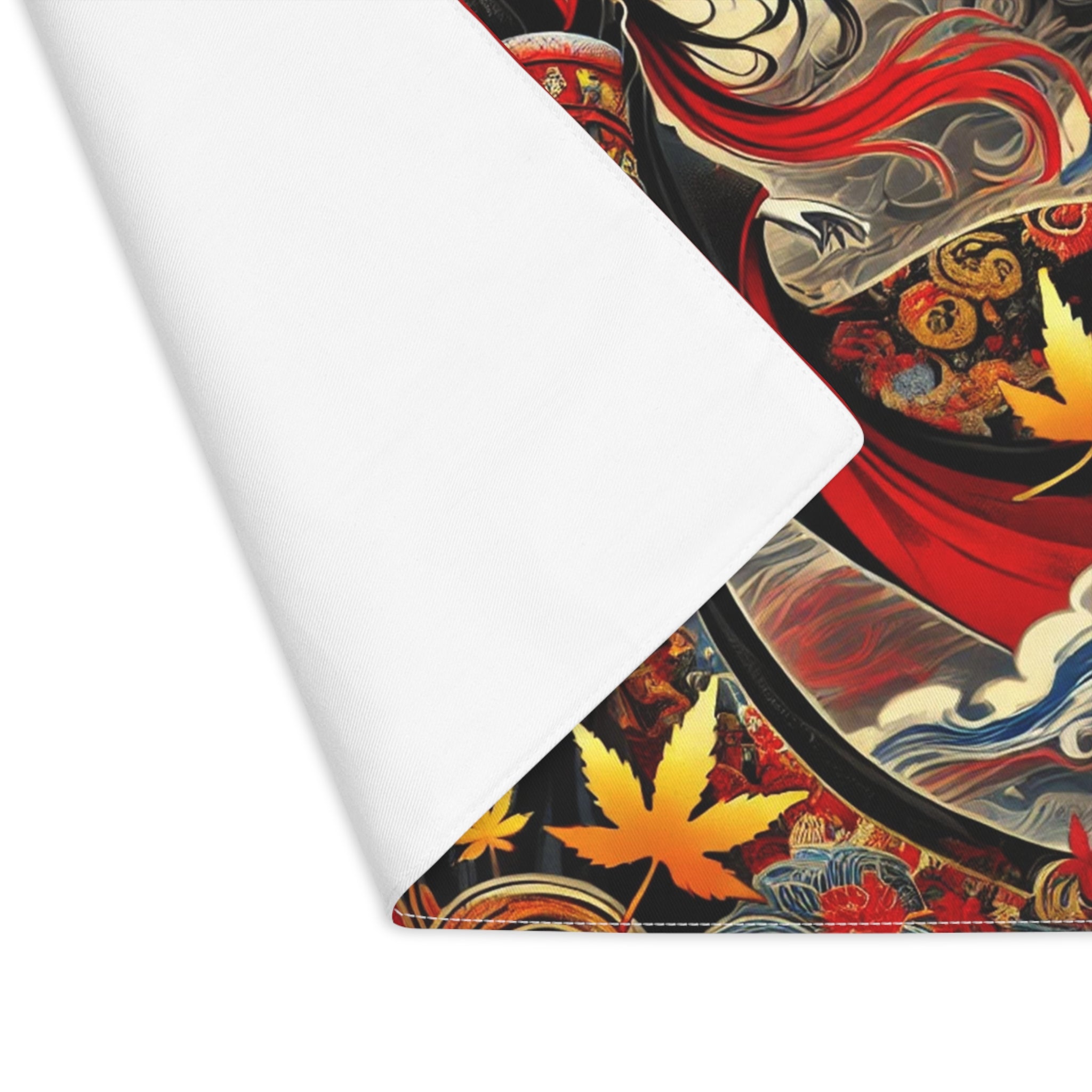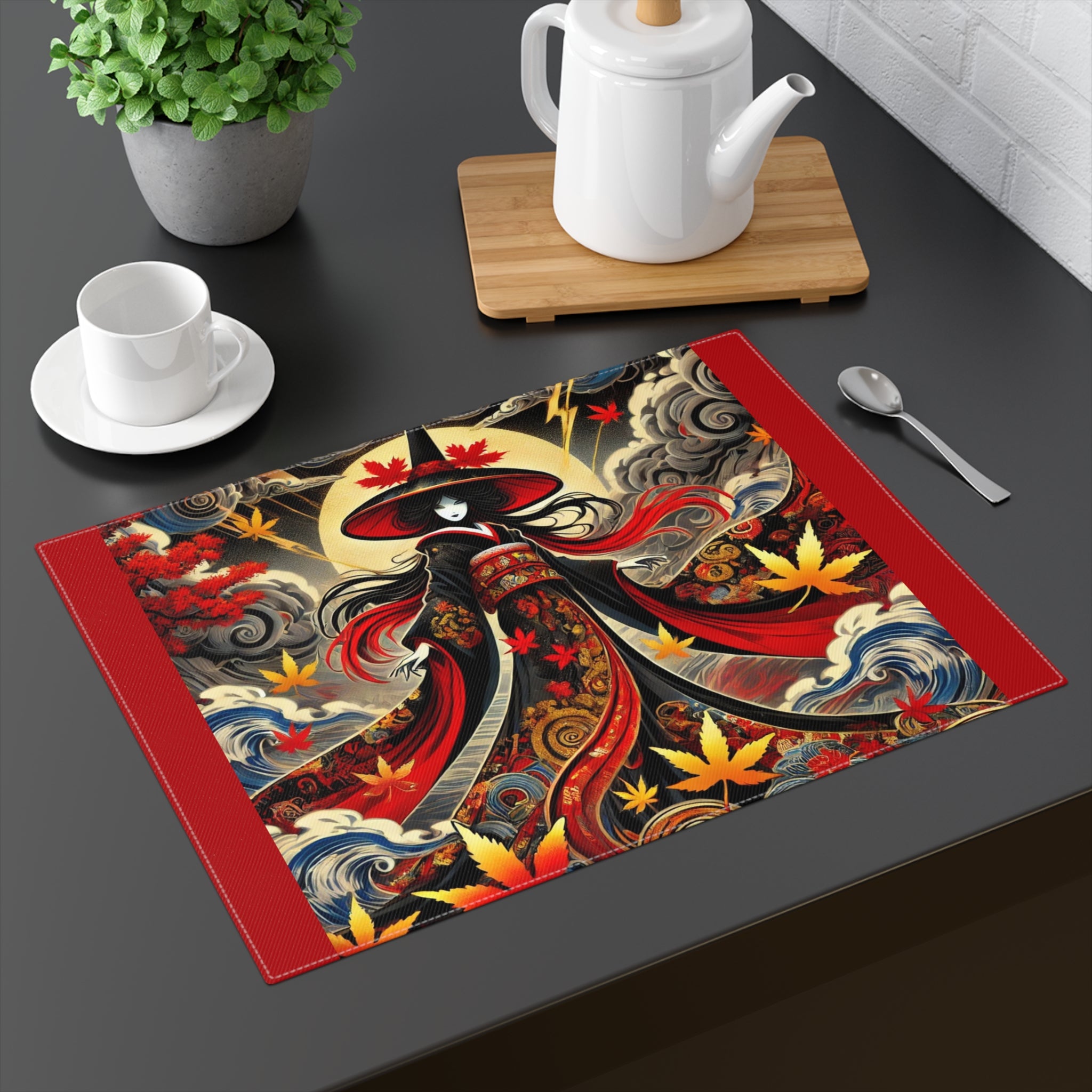 Across its surface, the scene of a Kabuki-inspired witch unfolds with theatrical intensity. She wears a towering red hat and a flowing black kimono adorned with golden storm cloud patterns and fiery red maple leaves, embodying elegance and supernatural power. The artwork infuses your table with mystique and enchantment, blending Japanese tradition, fantasy, and Halloween magic into one unforgettable piece. This placemat is more than a dining accessory—it’s a stage where culture and creativity bring every meal to life.