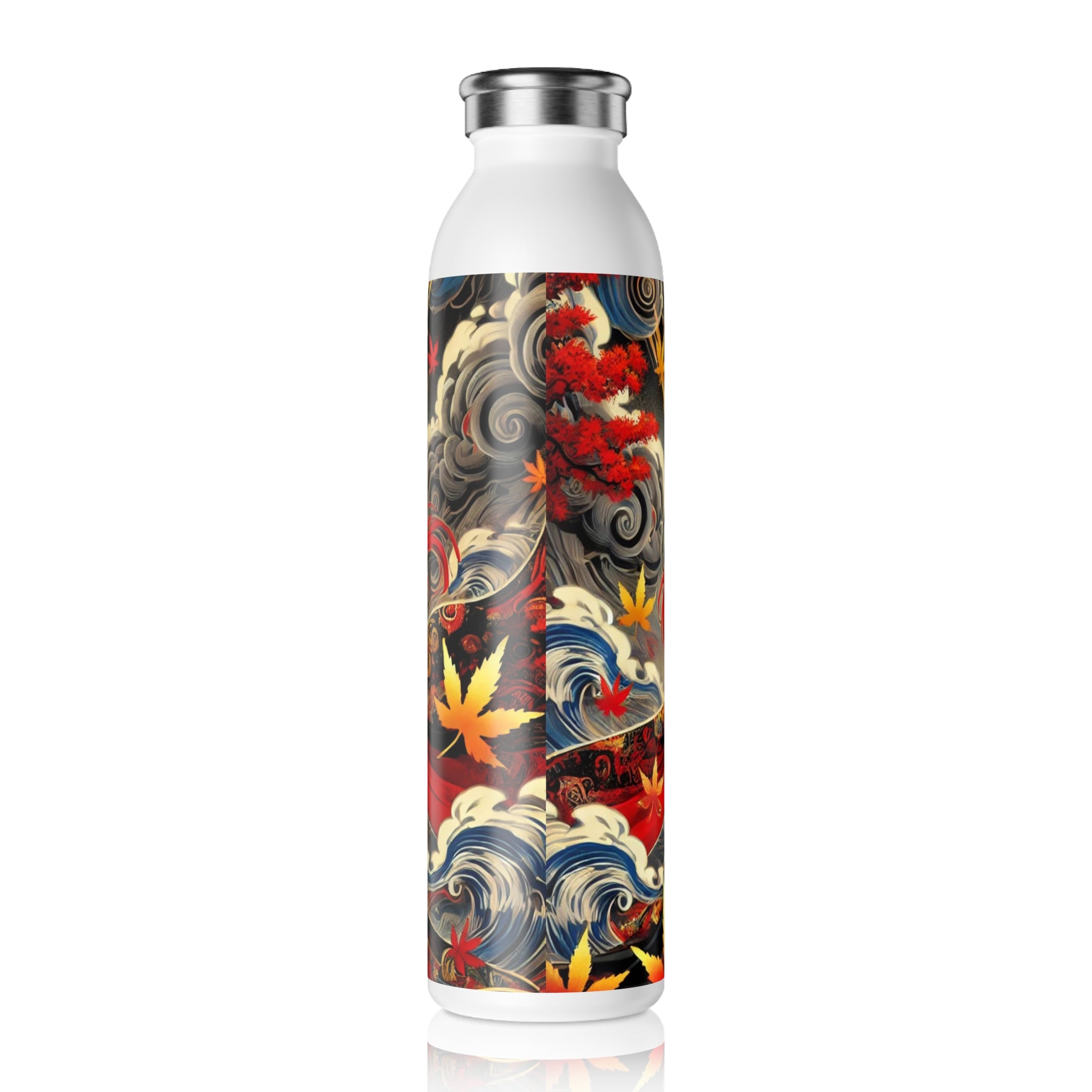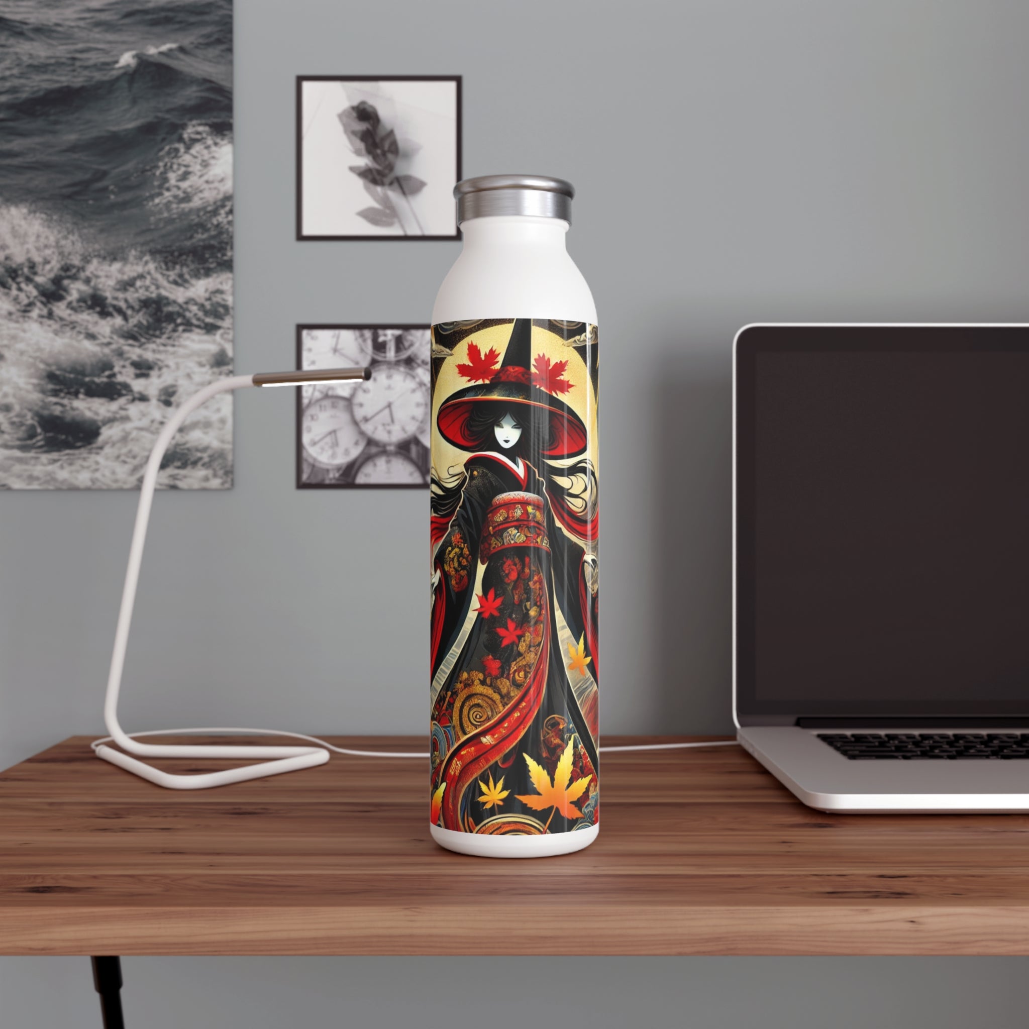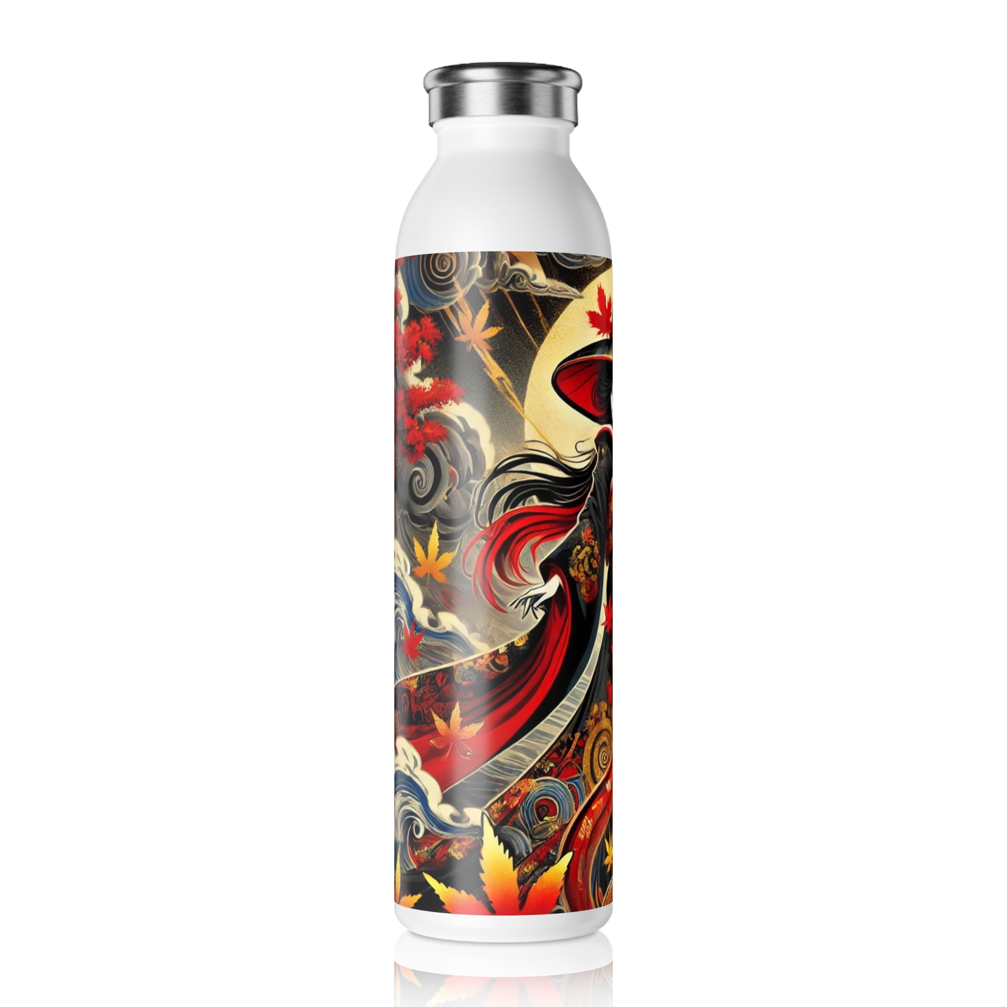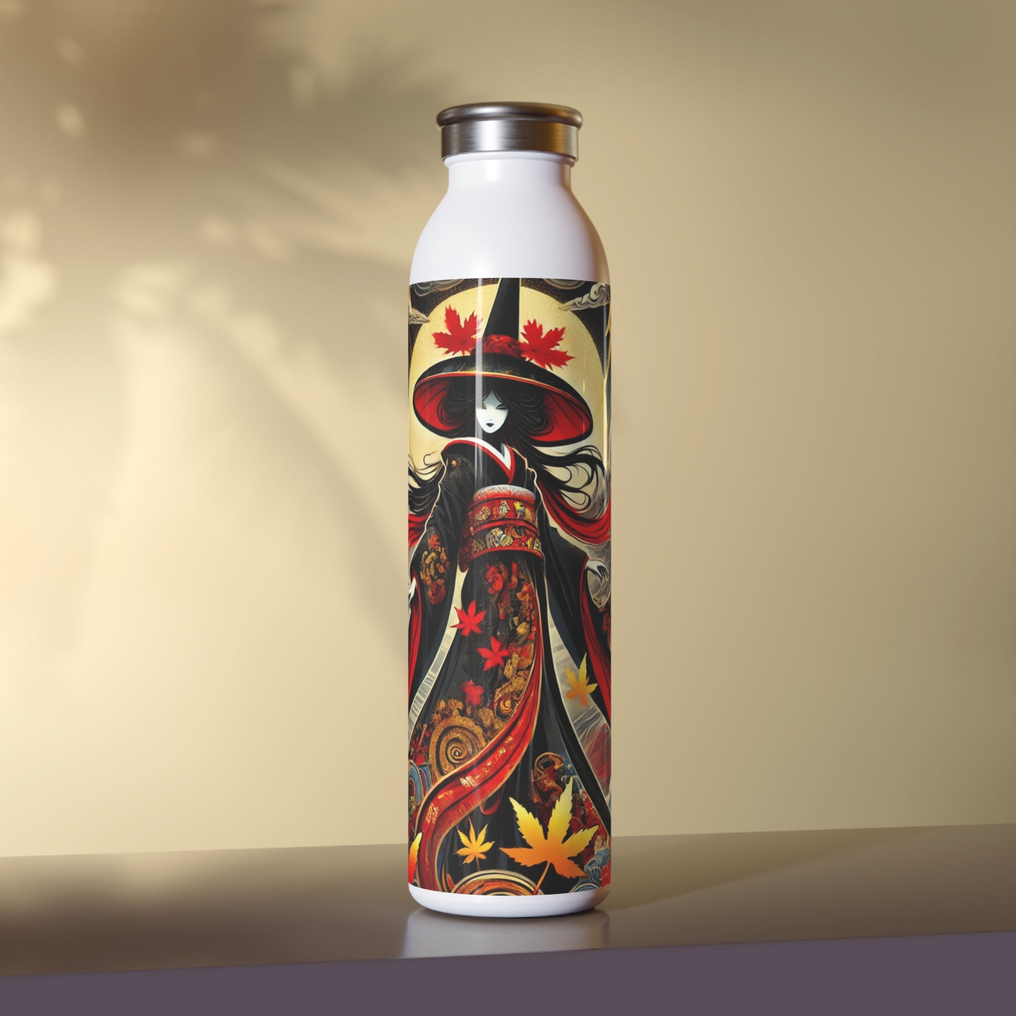 This slim 20oz stainless steel water bottle turns hydration into theater. Its double-wall vacuum insulation keeps drinks hot or cold for hours, while the sleek matte finish and fashionable lid add sophistication to your daily routine. Yet beyond function, it carries a scene of pure enchantment: a Kabuki witch rises from tradition and fantasy alike, her towering red hat crowned above a flowing black kimono patterned with golden storm clouds and fiery red maple leaves.