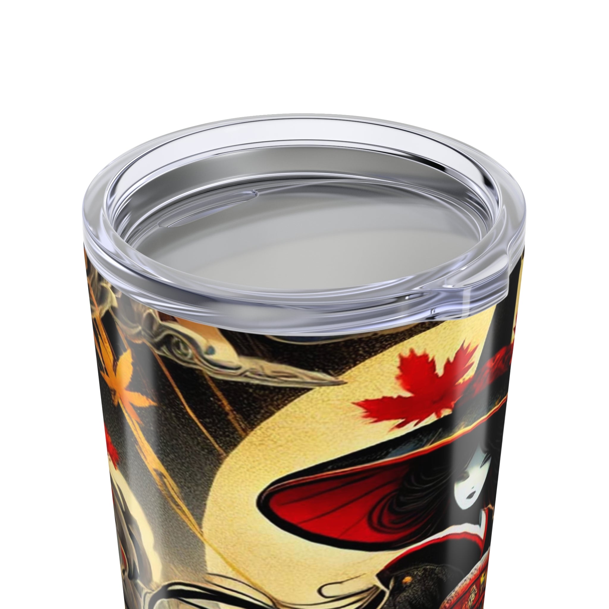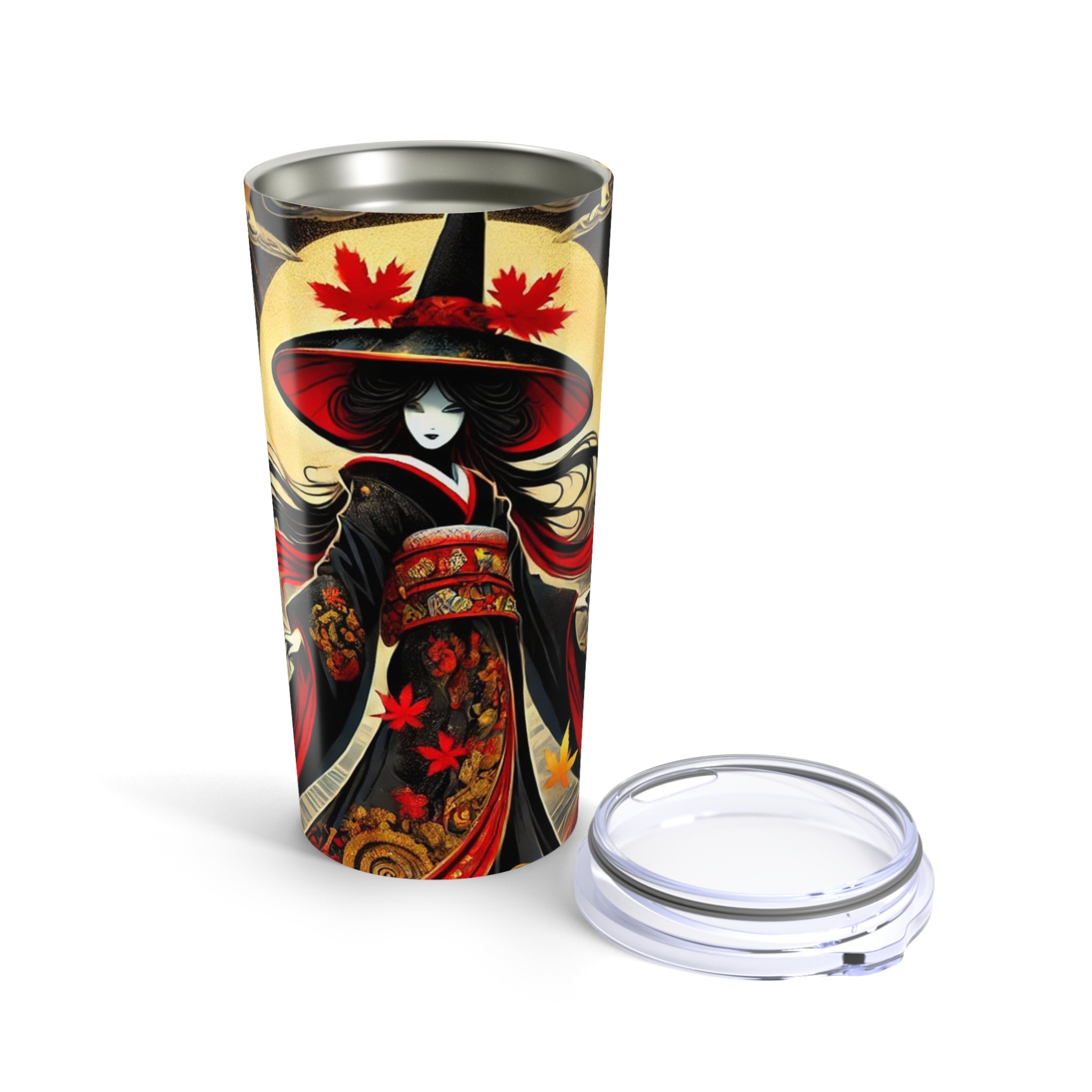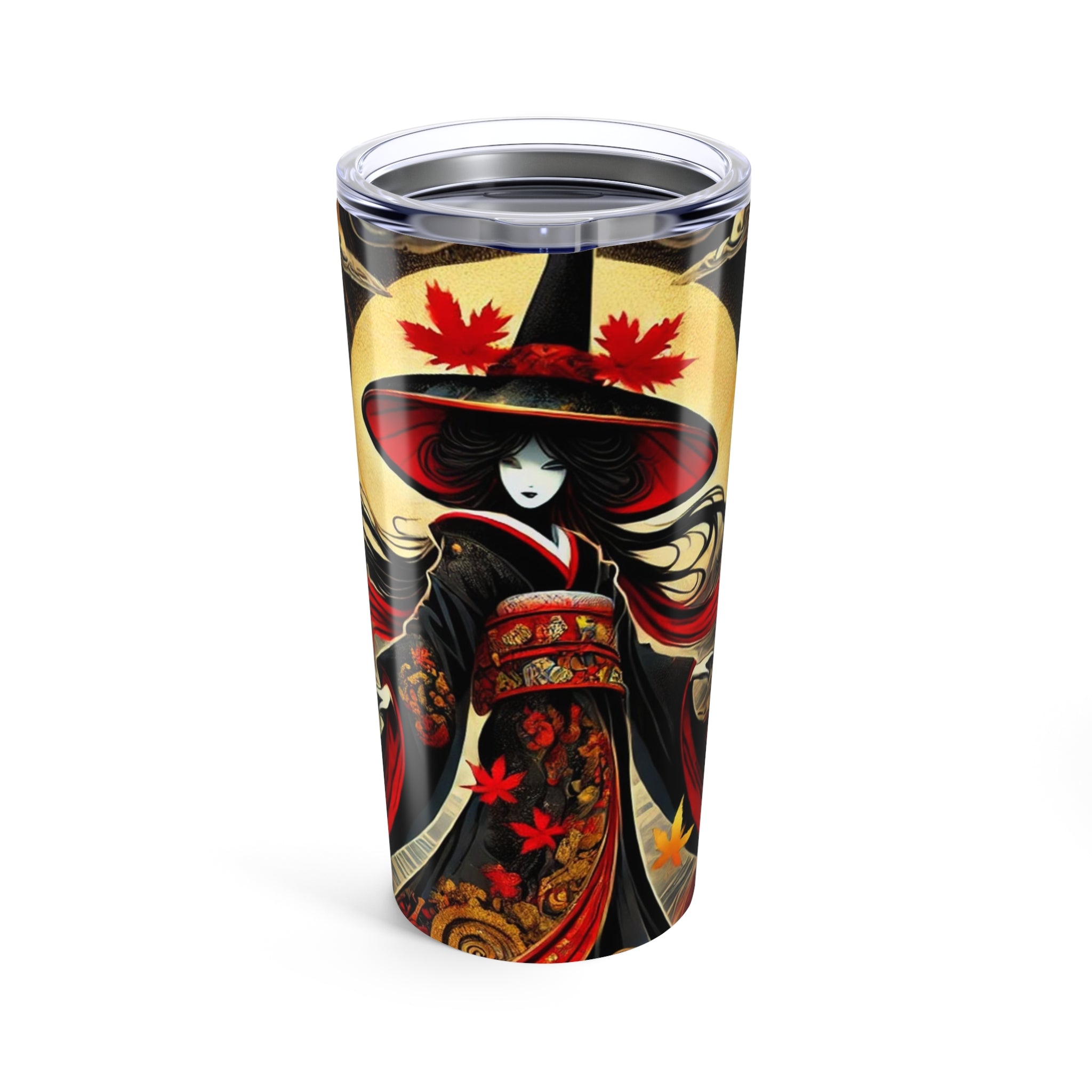 Across its surface, a Kabuki witch comes to life — her towering red hat rising above a flowing black kimono patterned with golden storm clouds and fiery red maple leaves. The stainless steel frame reflects her strength, while the insulation seems to hold her supernatural power within. Blending elegance, fantasy, and Japanese theatrical tradition, this tumbler doesn’t just carry your drink — it carries an atmosphere of mystique and Halloween magic into your everyday rituals.