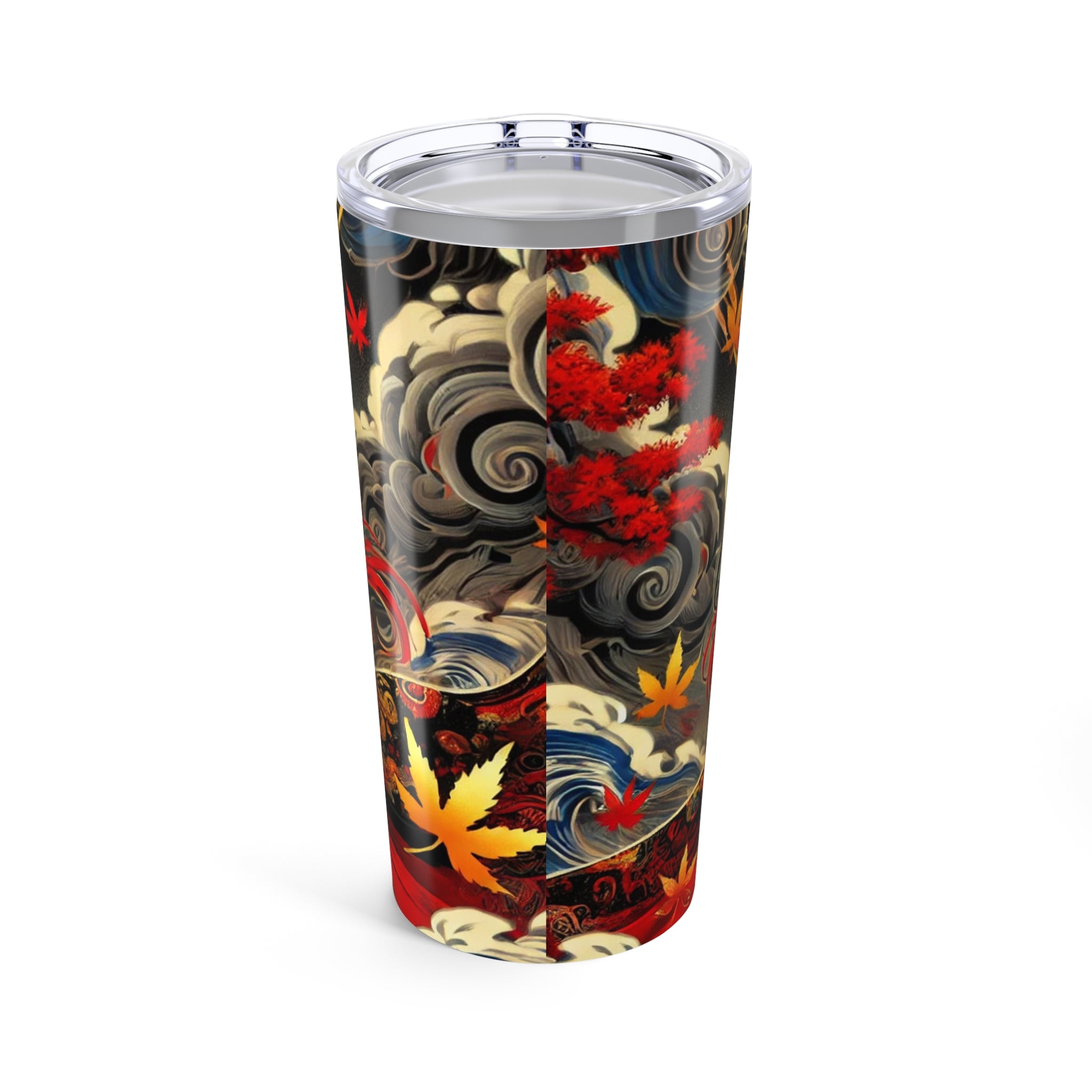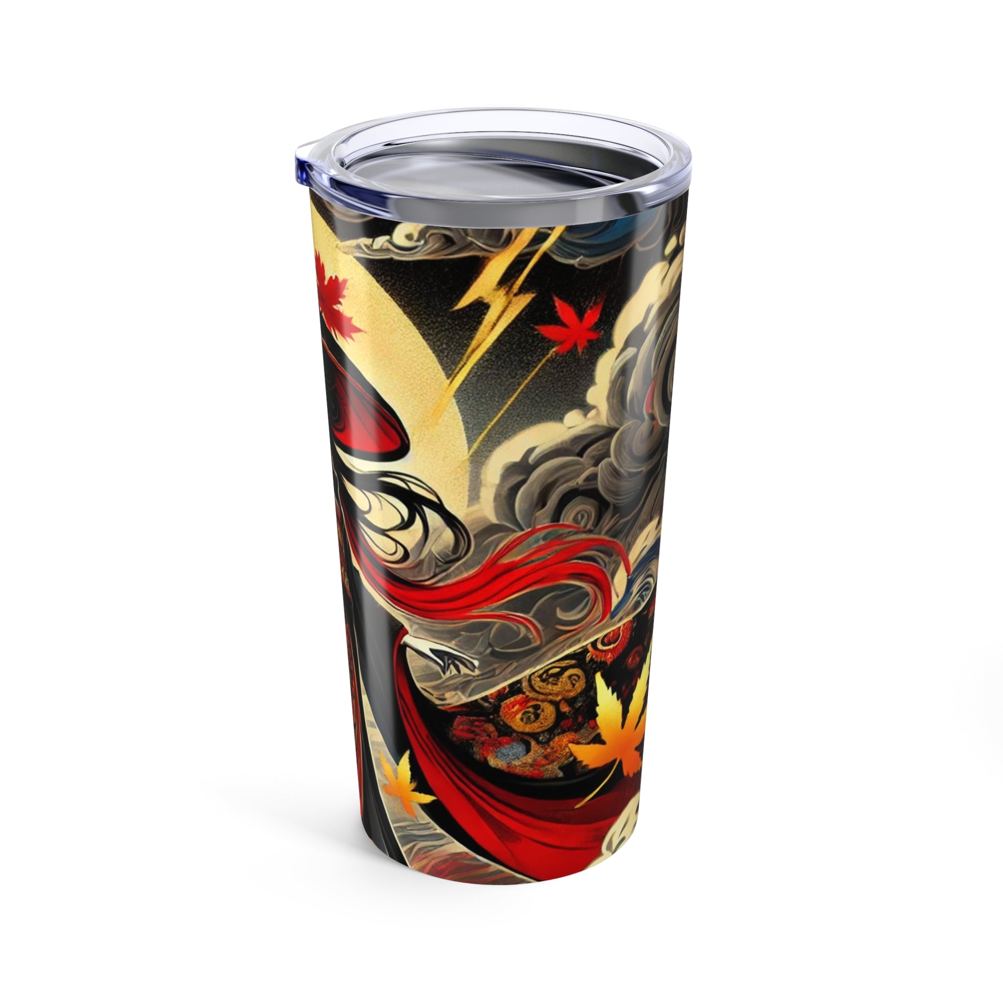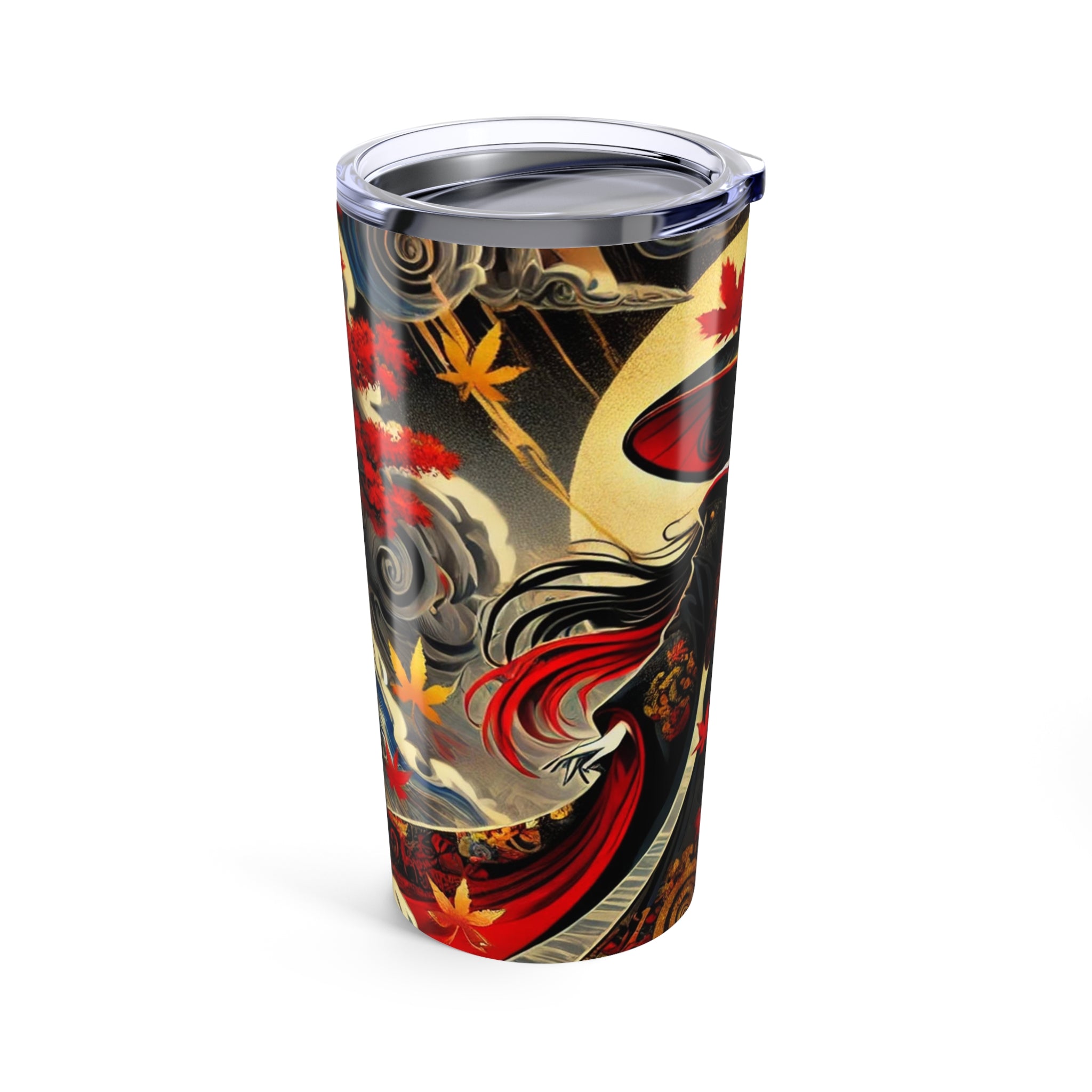 Across its surface, a Kabuki witch comes to life — her towering red hat rising above a flowing black kimono patterned with golden storm clouds and fiery red maple leaves. The stainless steel frame reflects her strength, while the insulation seems to hold her supernatural power within. Blending elegance, fantasy, and Japanese theatrical tradition, this tumbler doesn’t just carry your drink — it carries an atmosphere of mystique and Halloween magic into your everyday rituals.