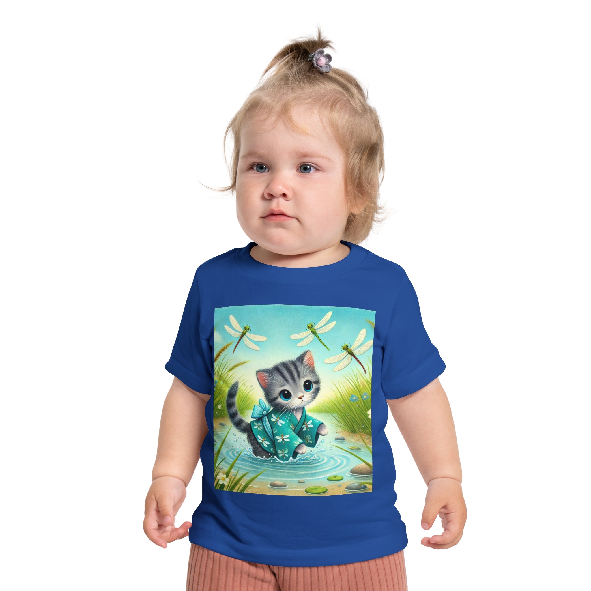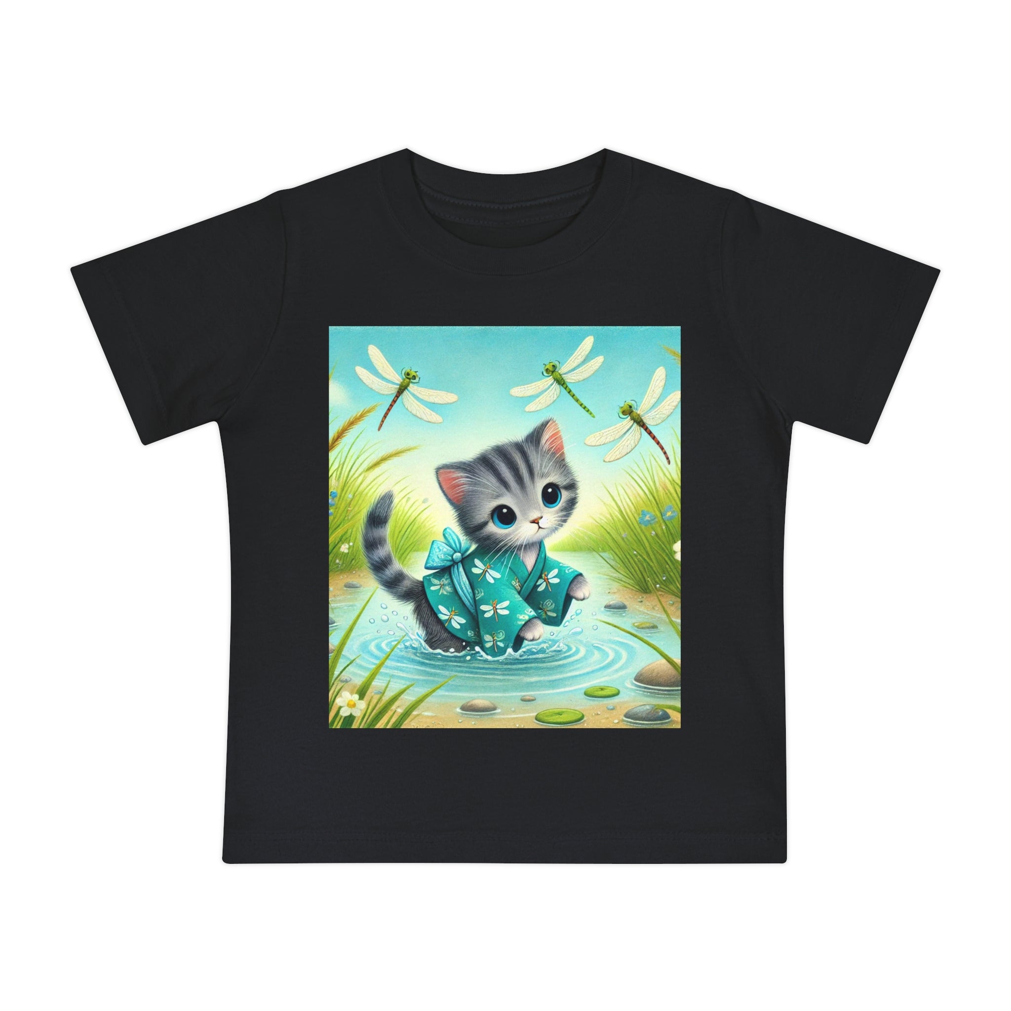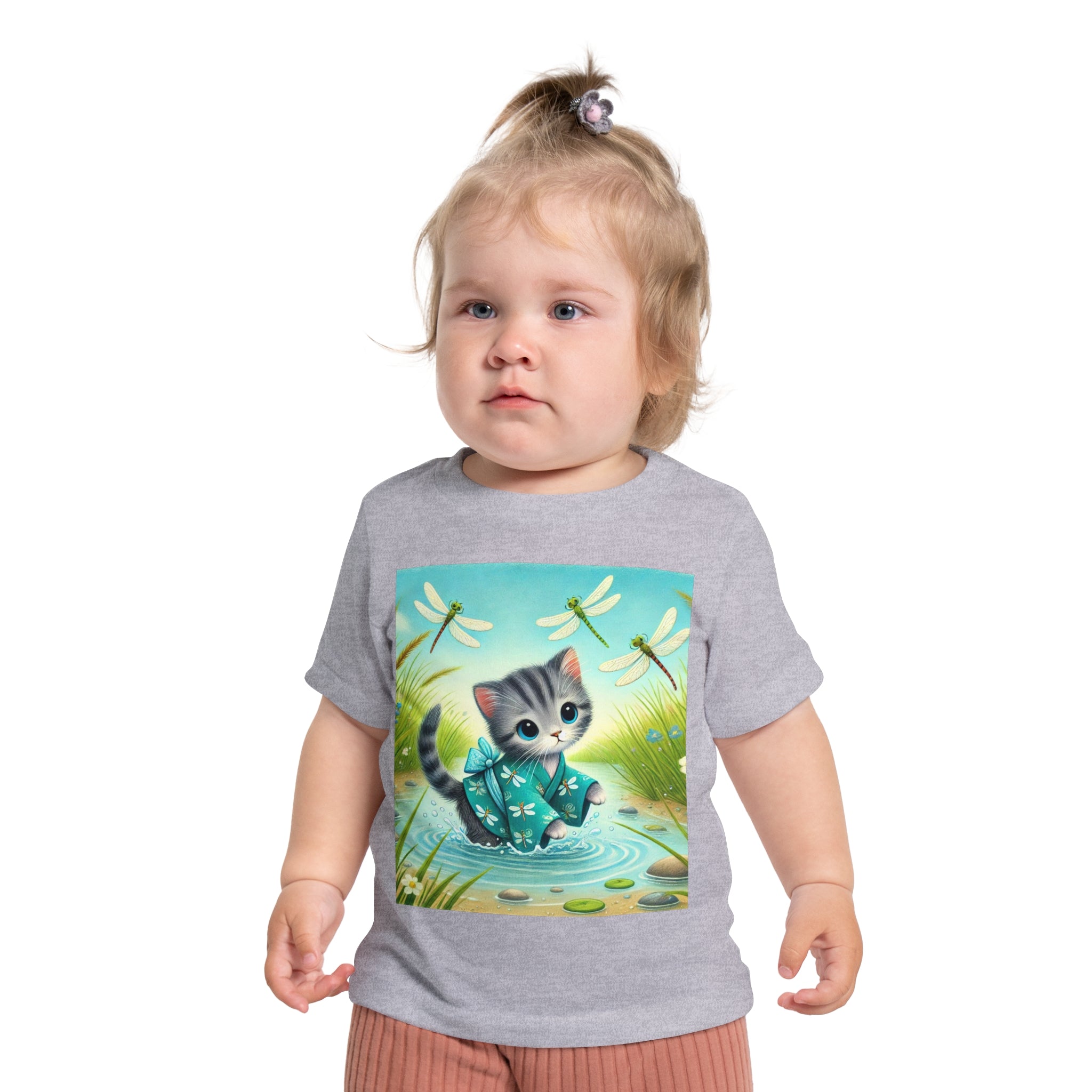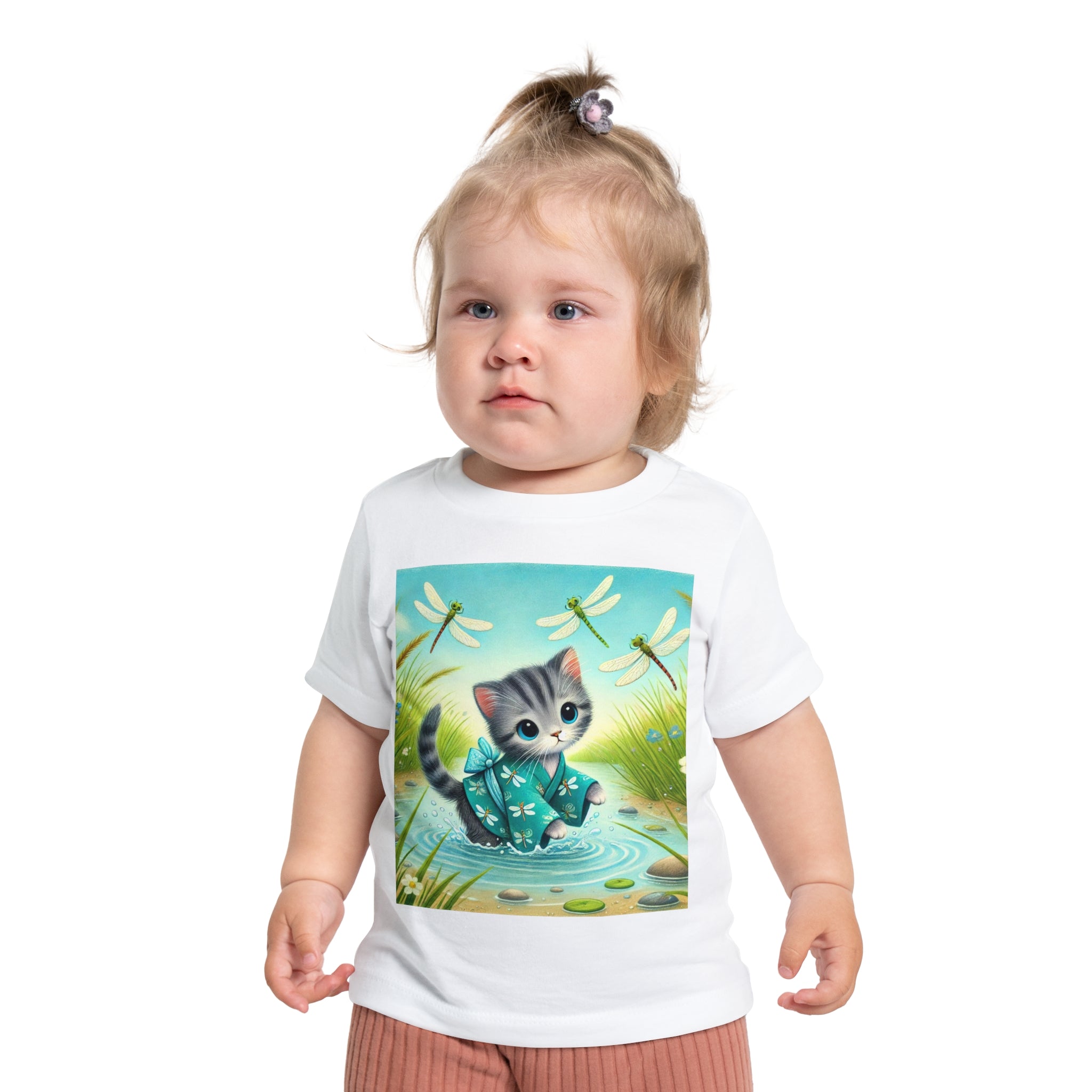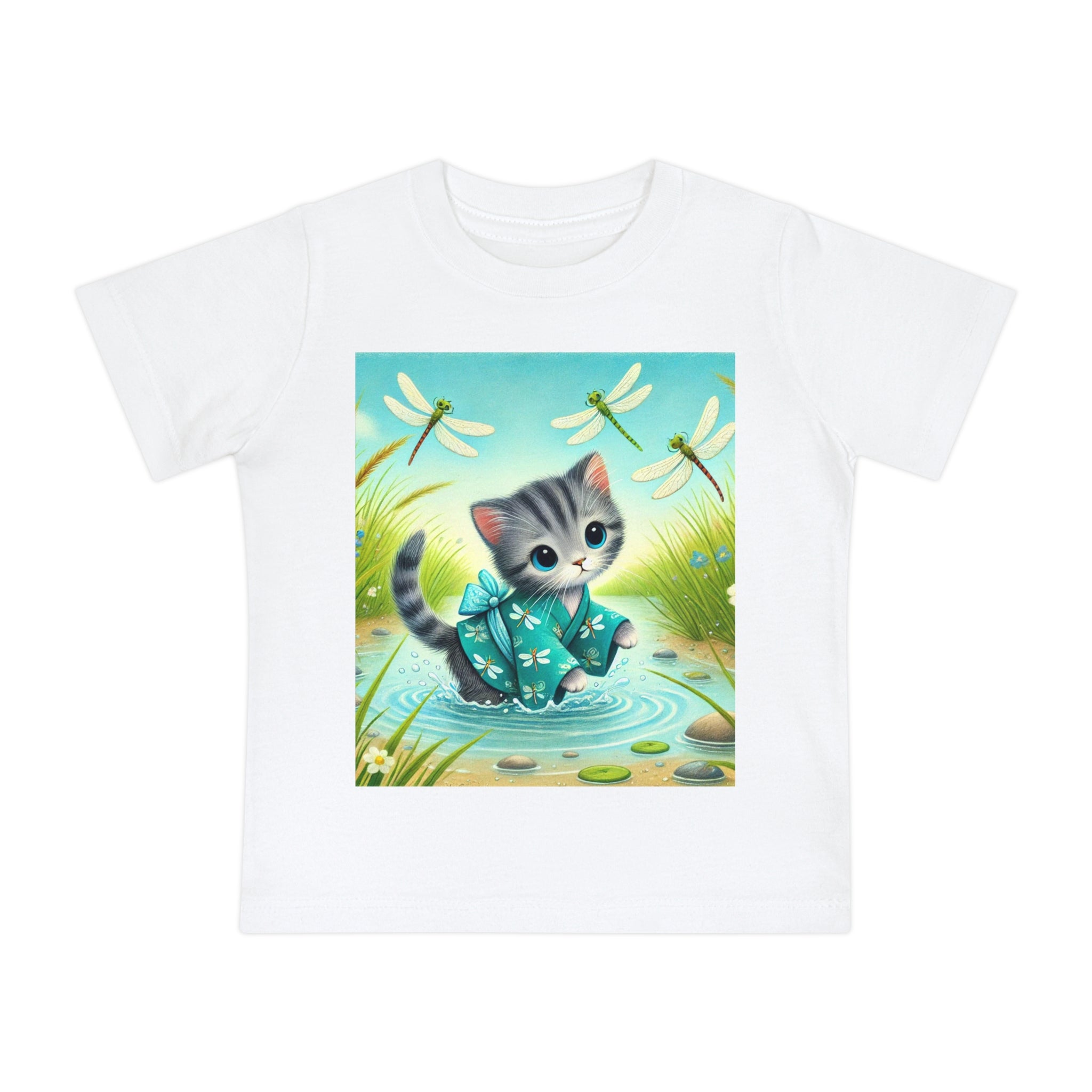 Kitten by the Still Waters captures a tender moment of curiosity and calm in a peaceful pond setting. A gentle gray tabby kitten wades carefully through still, rippling waters, dressed in a teal kimono patterned with delicate dragonflies. Around the kitten, real dragonflies hover gracefully, their iridescent wings catching the light as they dance in the warm daylight. Tall reeds, pebbles, and tiny wildflowers frame the scene, their reflections shimmering softly on the water’s surface. Rendered in flat, storybook-style colors with exquisite detail, this serene artwork blends playfulness and tranquility—celebrating the quiet beauty of nature and the wonder of exploration.