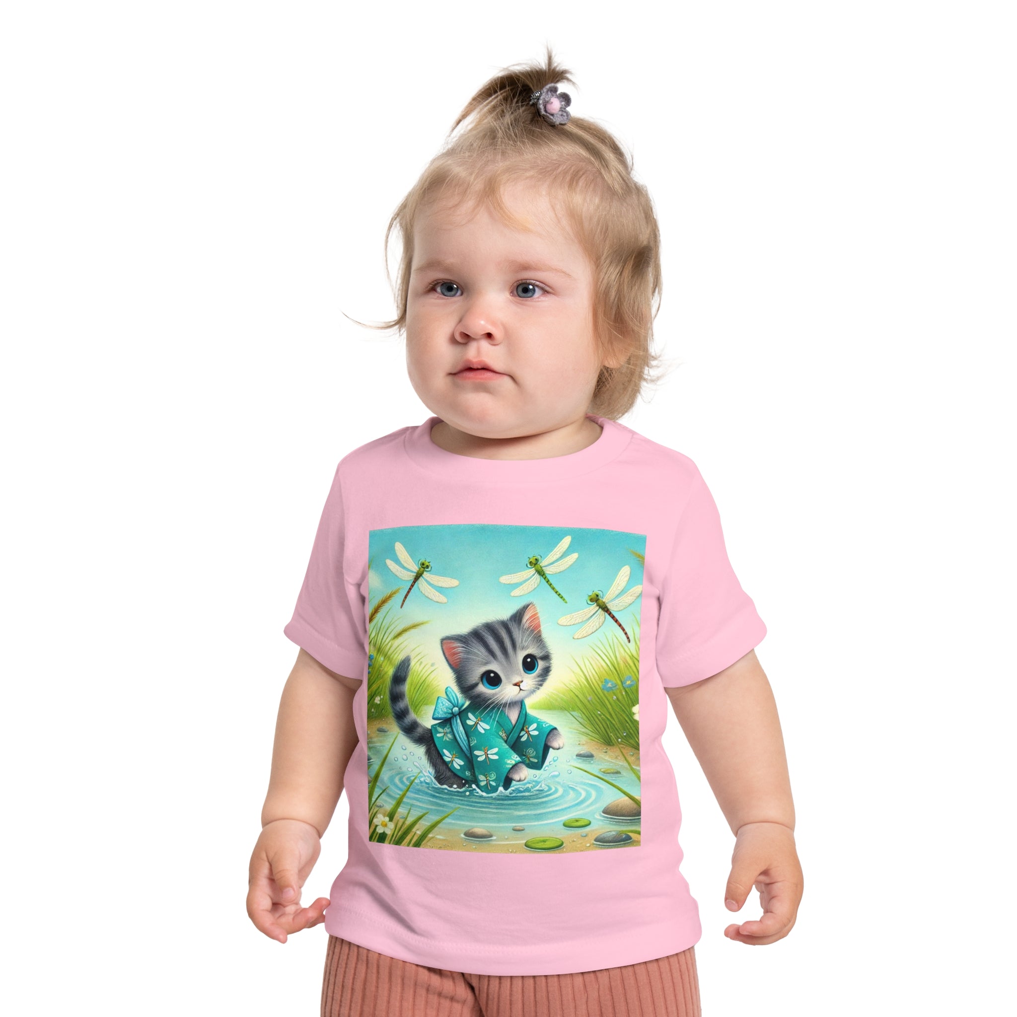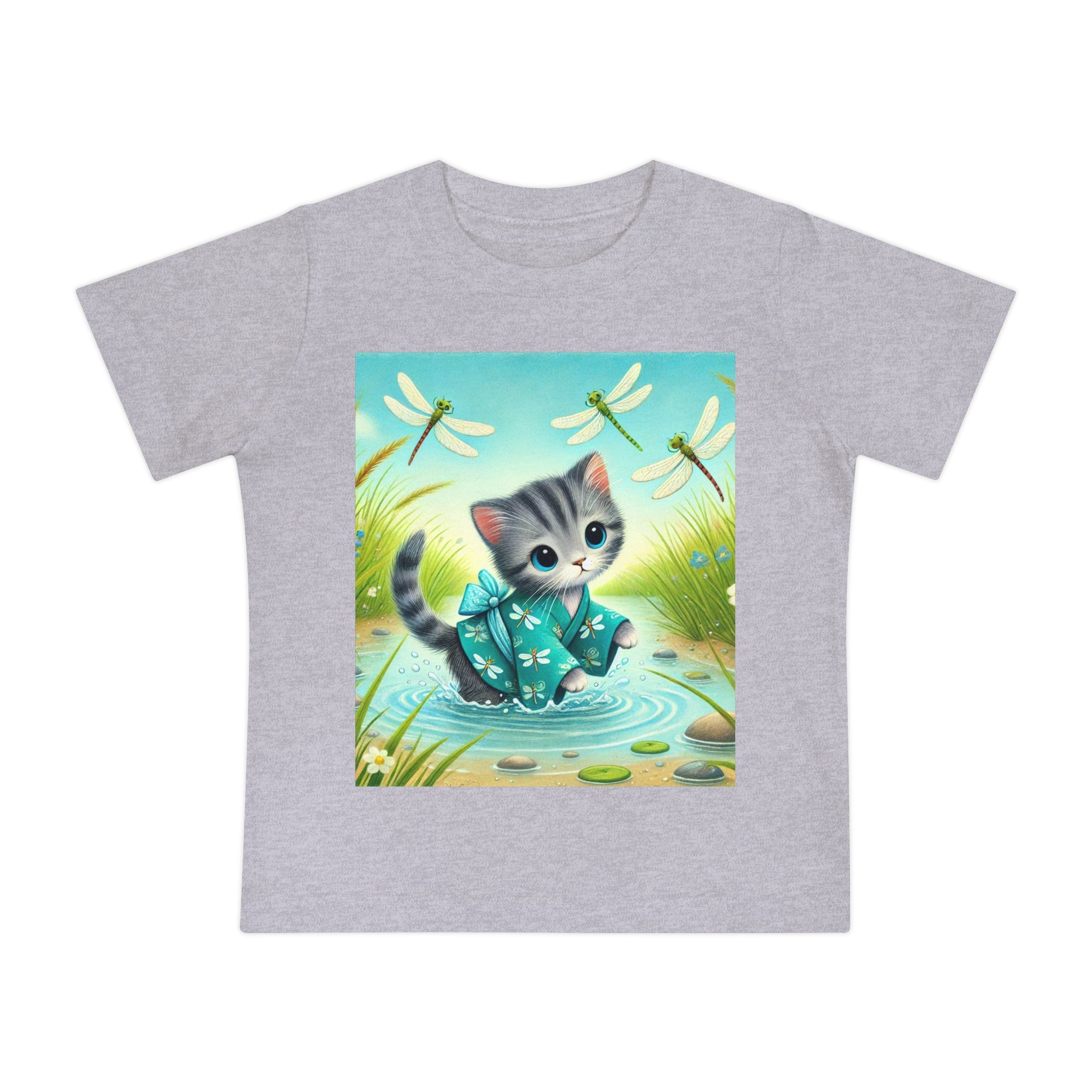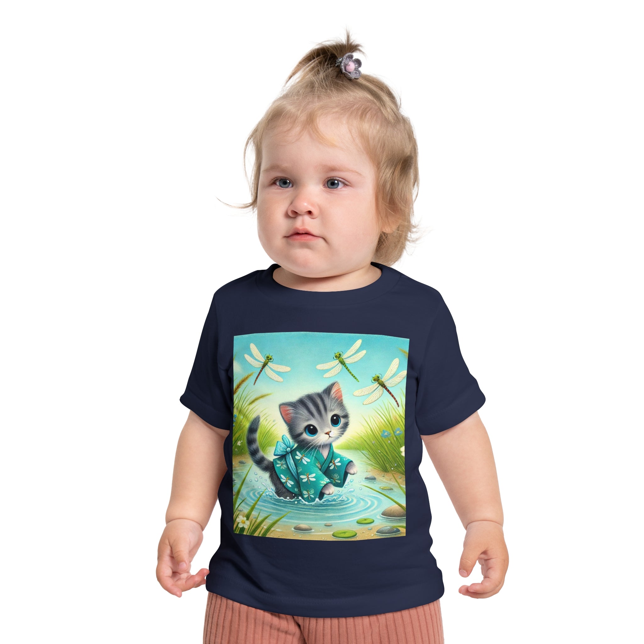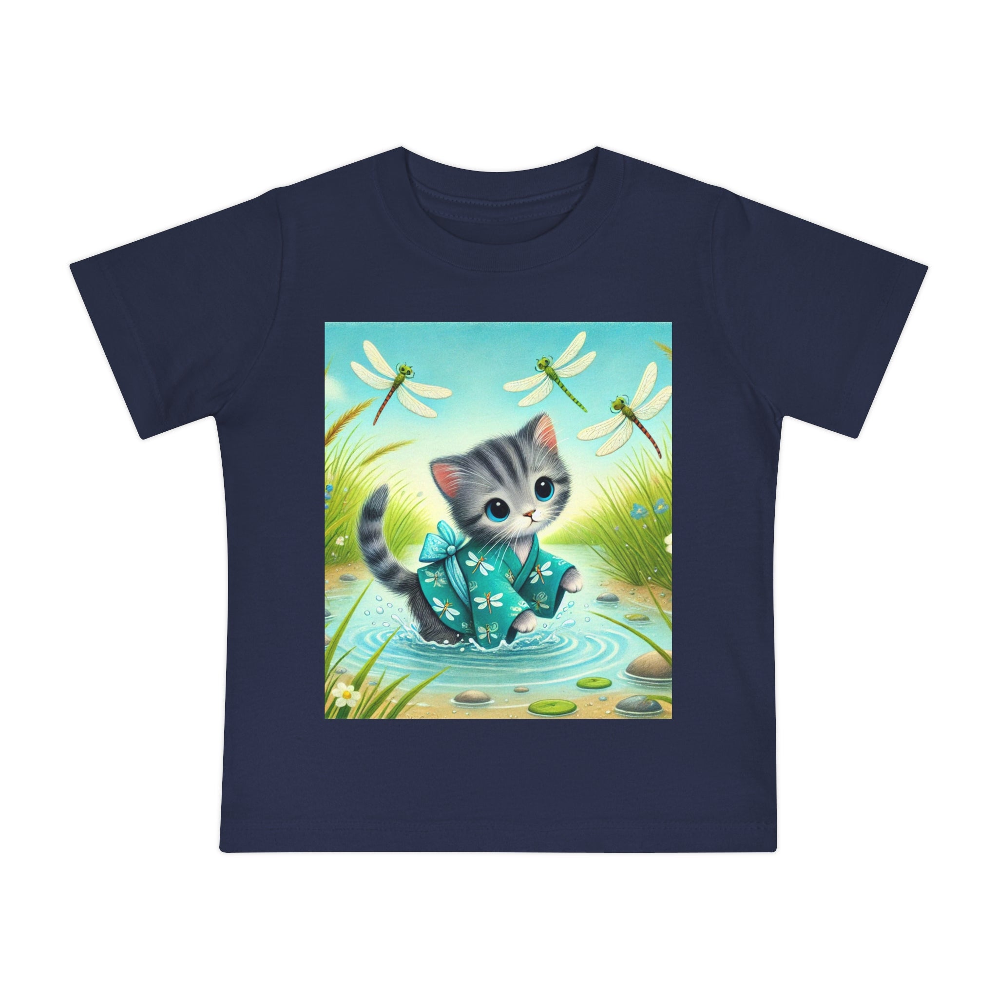 Kitten by the Still Waters captures a tender moment of curiosity and calm in a peaceful pond setting. A gentle gray tabby kitten wades carefully through still, rippling waters, dressed in a teal kimono patterned with delicate dragonflies. Around the kitten, real dragonflies hover gracefully, their iridescent wings catching the light as they dance in the warm daylight. Tall reeds, pebbles, and tiny wildflowers frame the scene, their reflections shimmering softly on the water’s surface. Rendered in flat, storybook-style colors with exquisite detail, this serene artwork blends playfulness and tranquility—celebrating the quiet beauty of nature and the wonder of exploration.